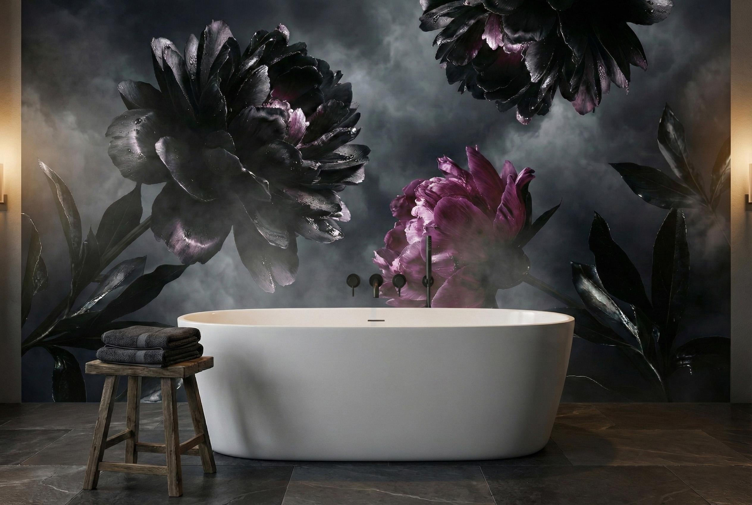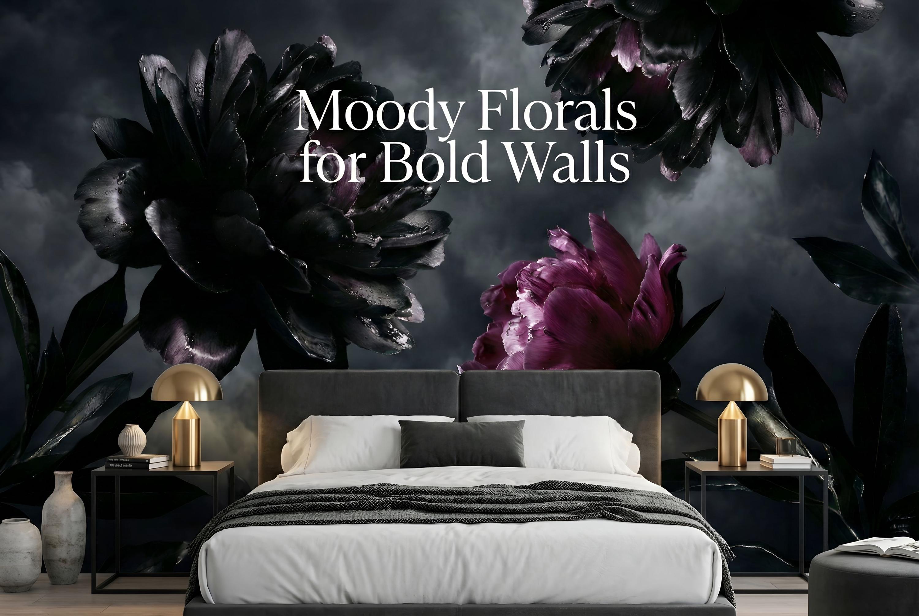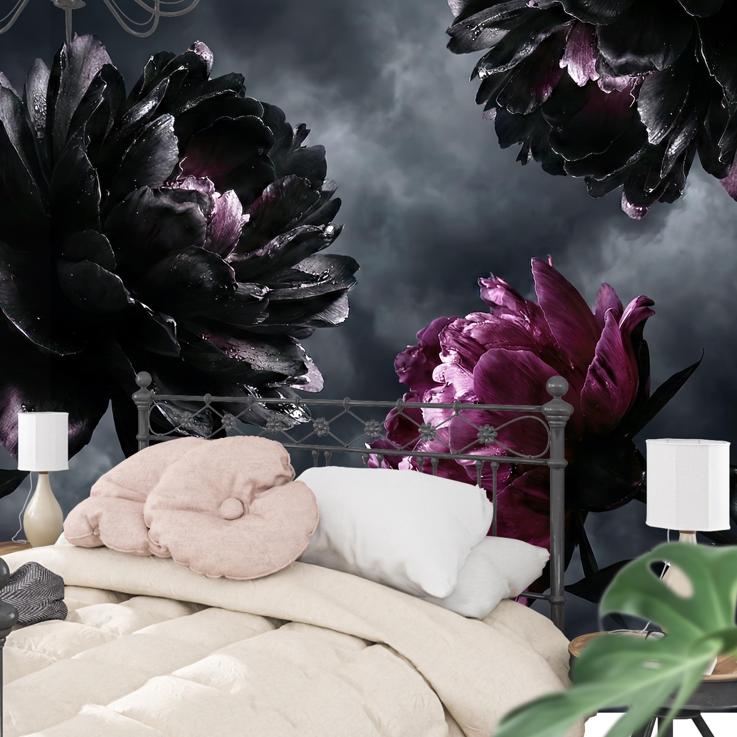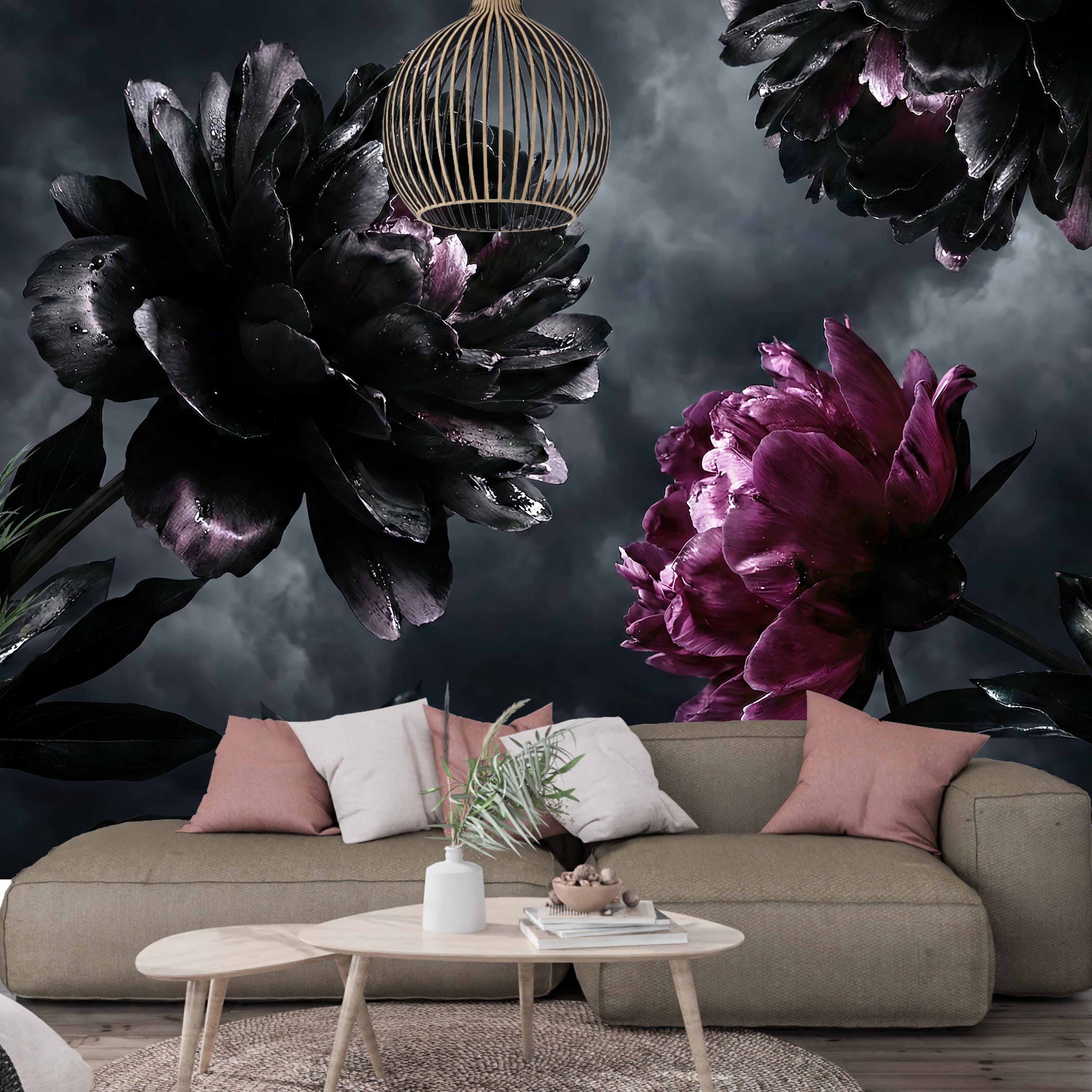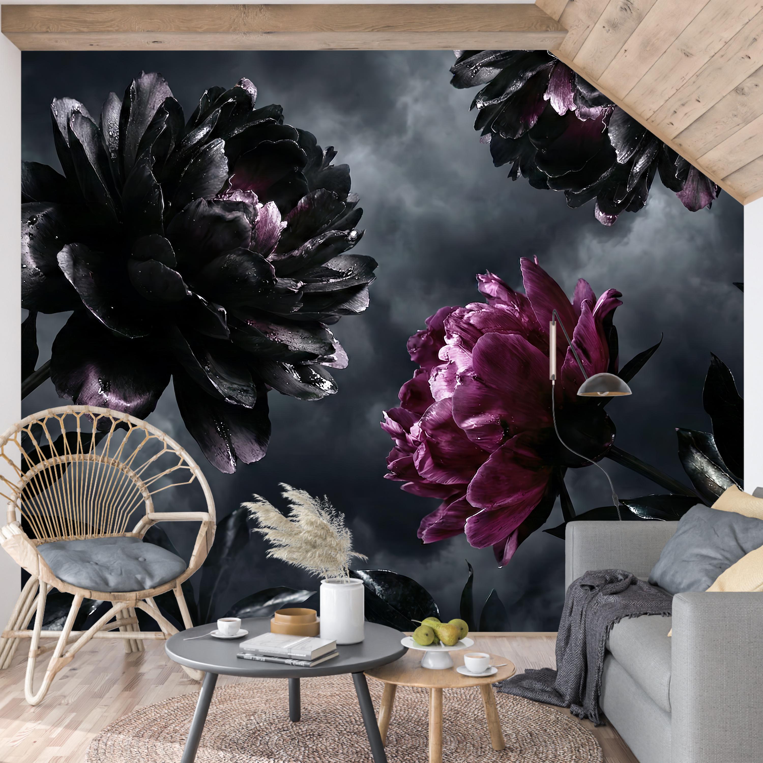 Embrace the beauty of the shadows with our breathtaking Gothic Home Decor wallpaper. This design is the ultimate statement piece for lovers of the Dark Academia aesthetic, featuring massive, photorealistic blooms set against a brooding, stormy sky.