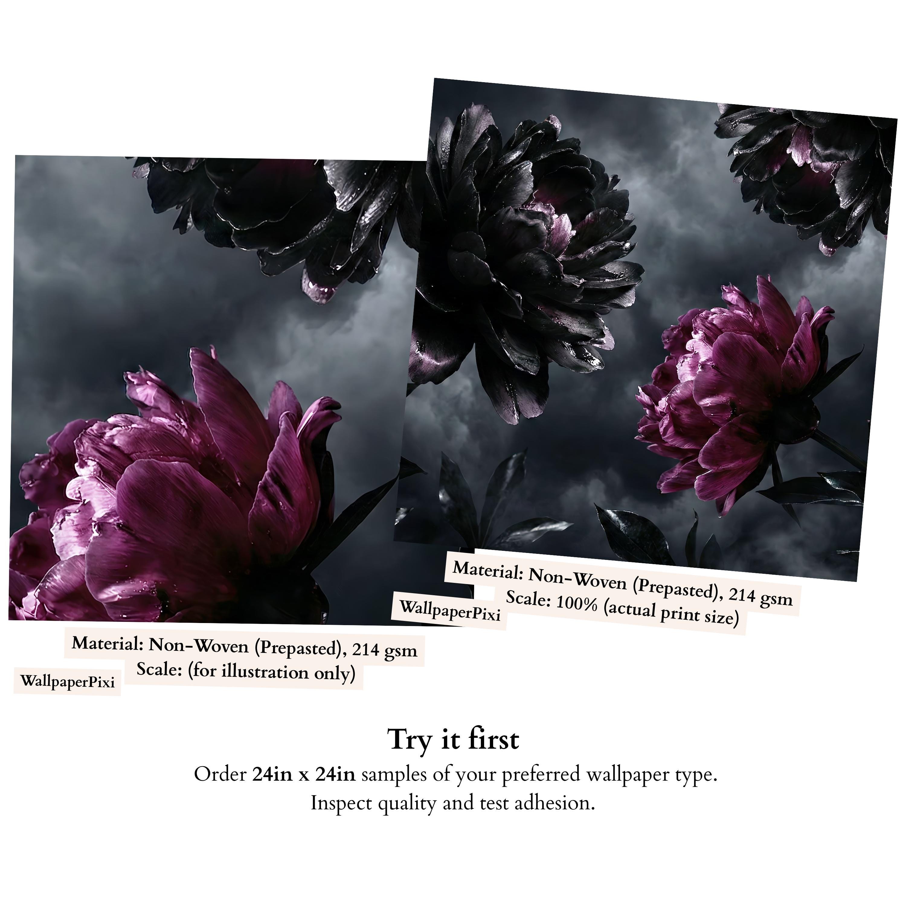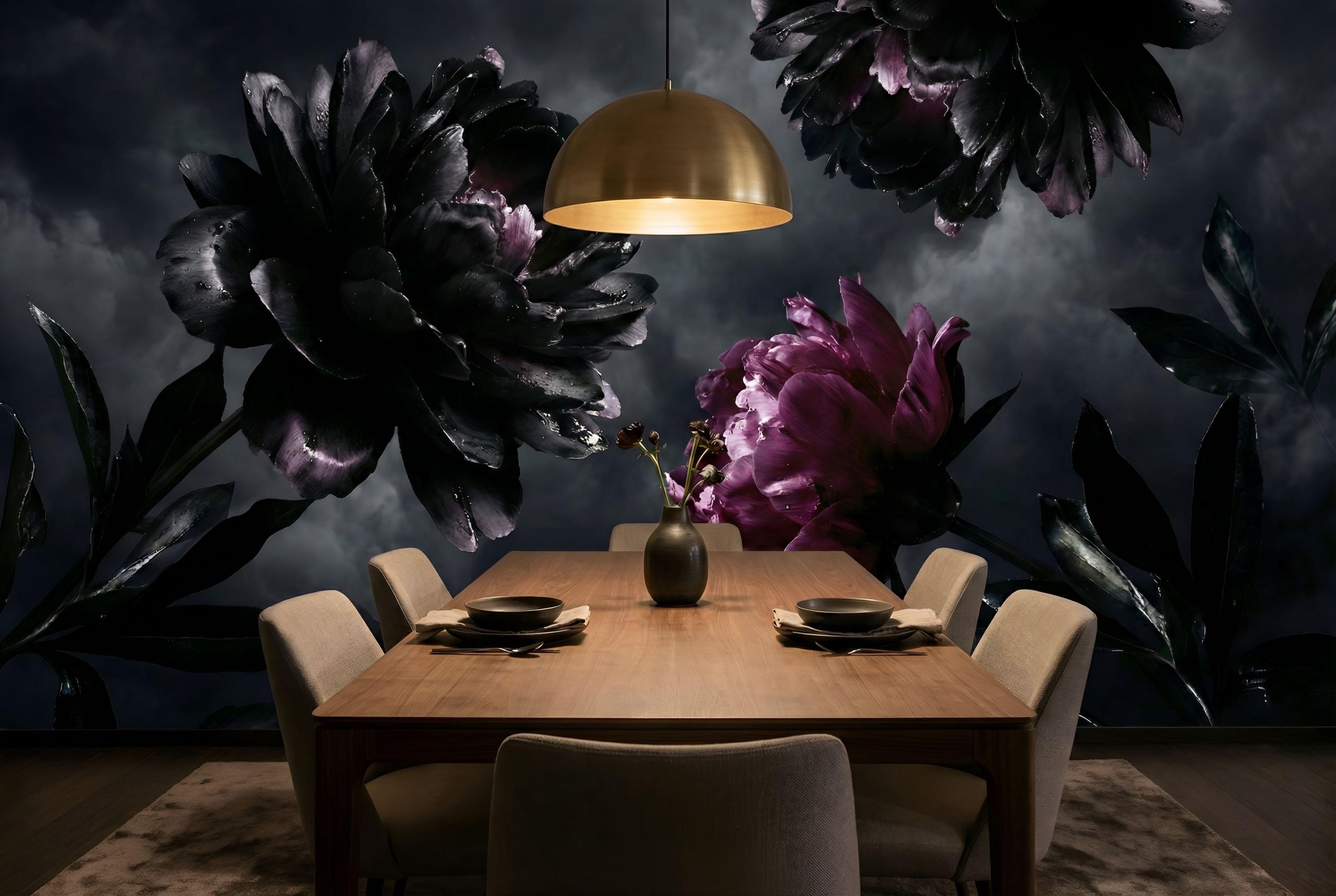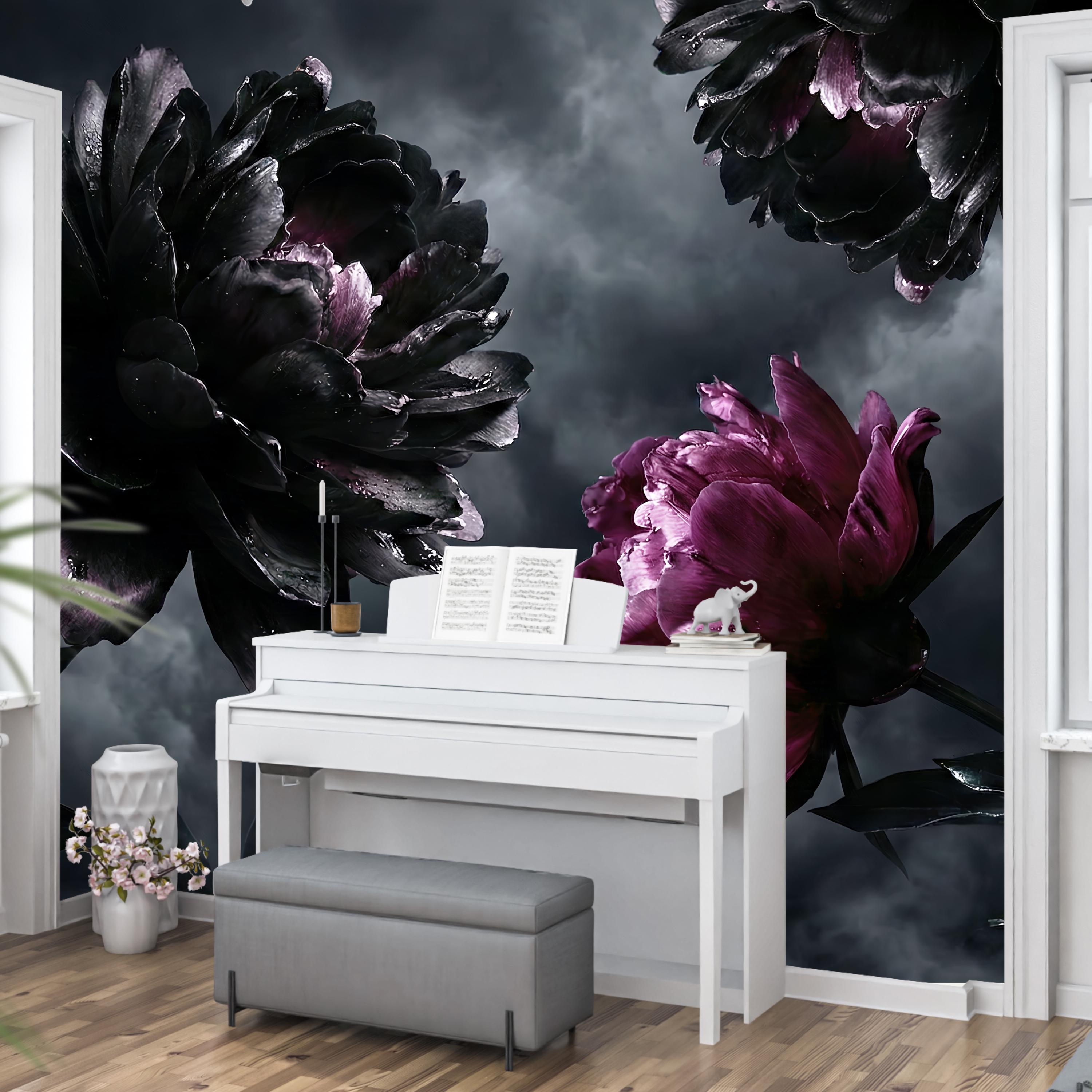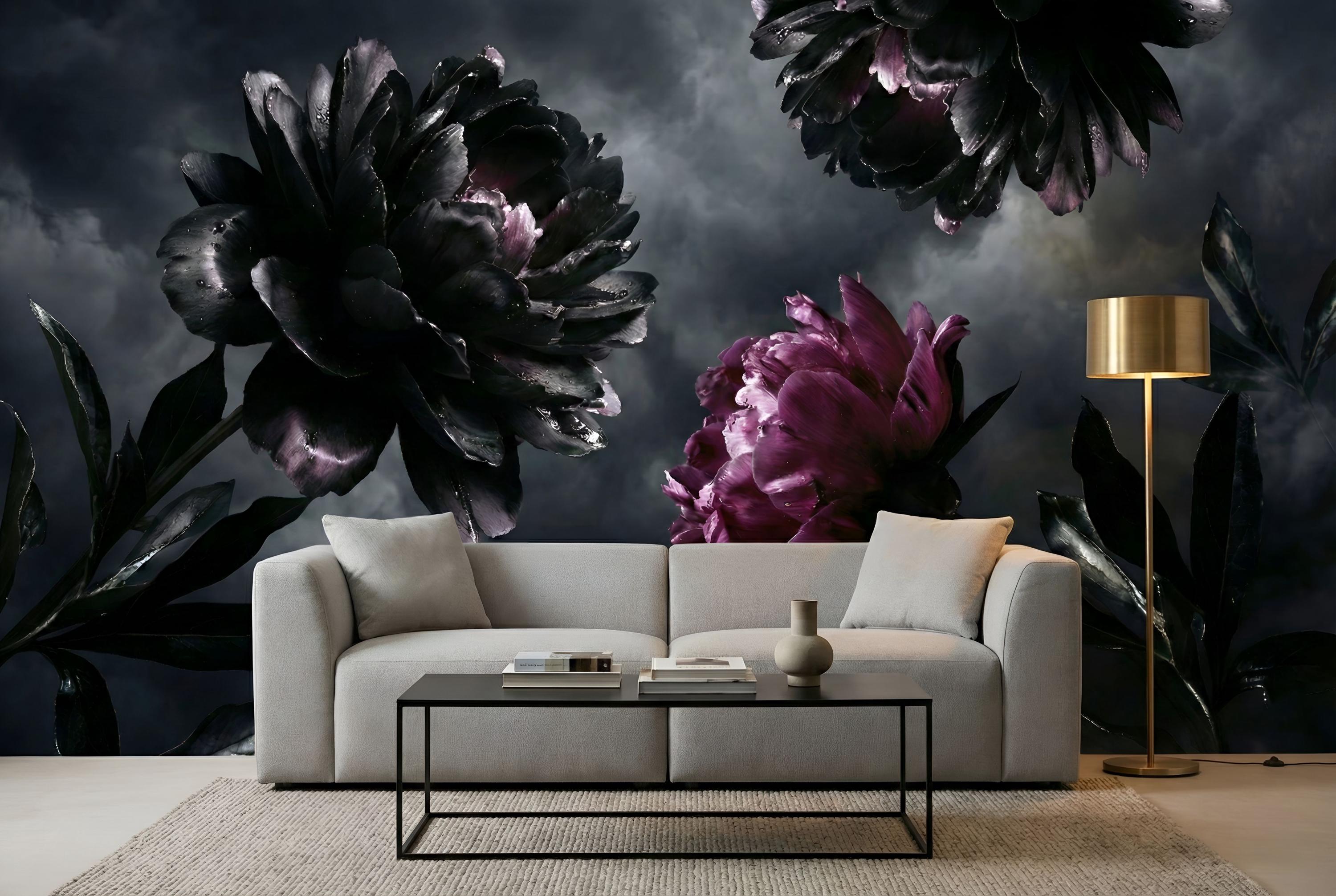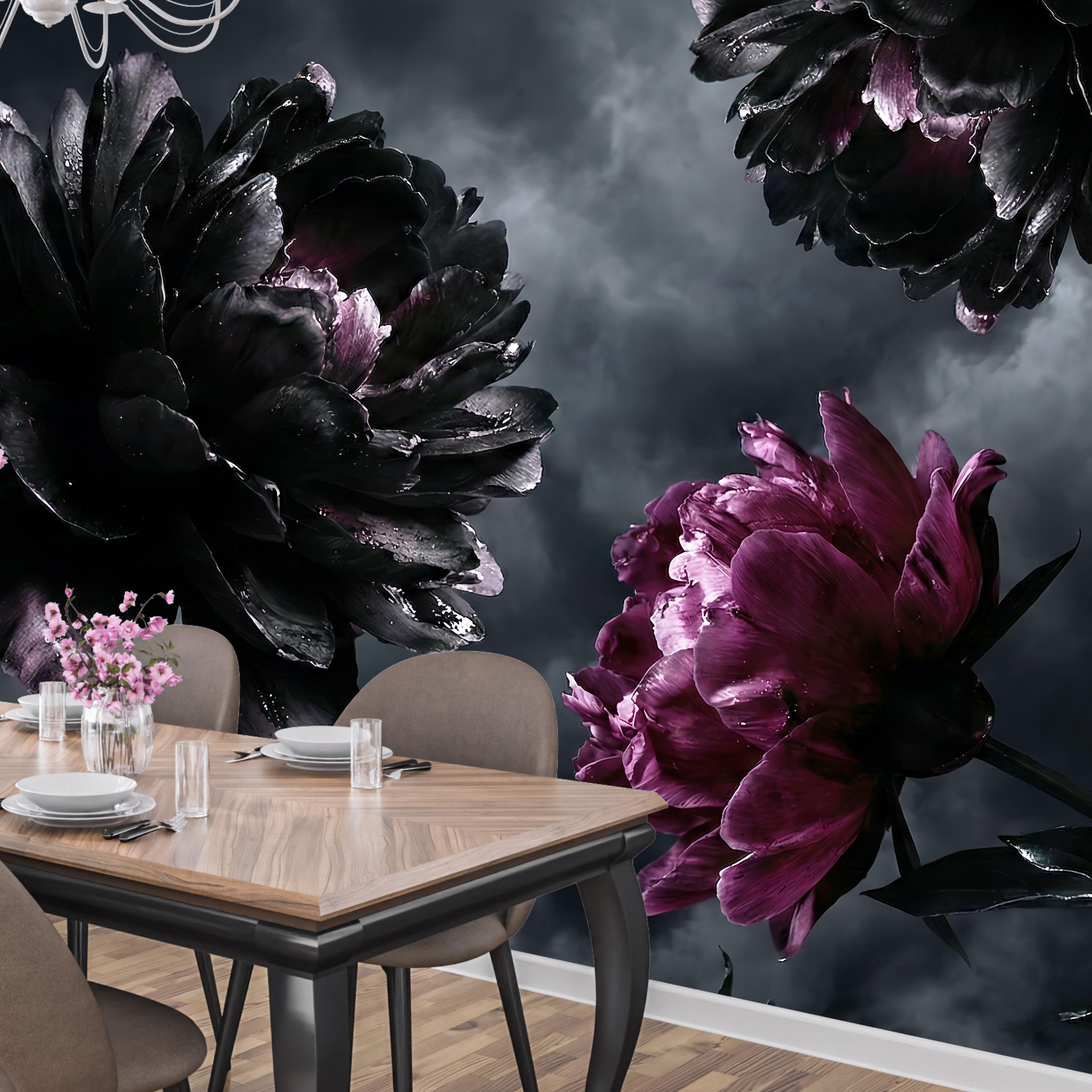 The artwork centers on exquisite Black Peony Art and Deep Purple Floral elements that create a sense of mystery and elegance. The high-definition Photo Wallpaper quality captures every raindrop and petal texture, making it perfect for creating a Romantic Goth atmosphere or a stunning Maximalist Wall in your home.