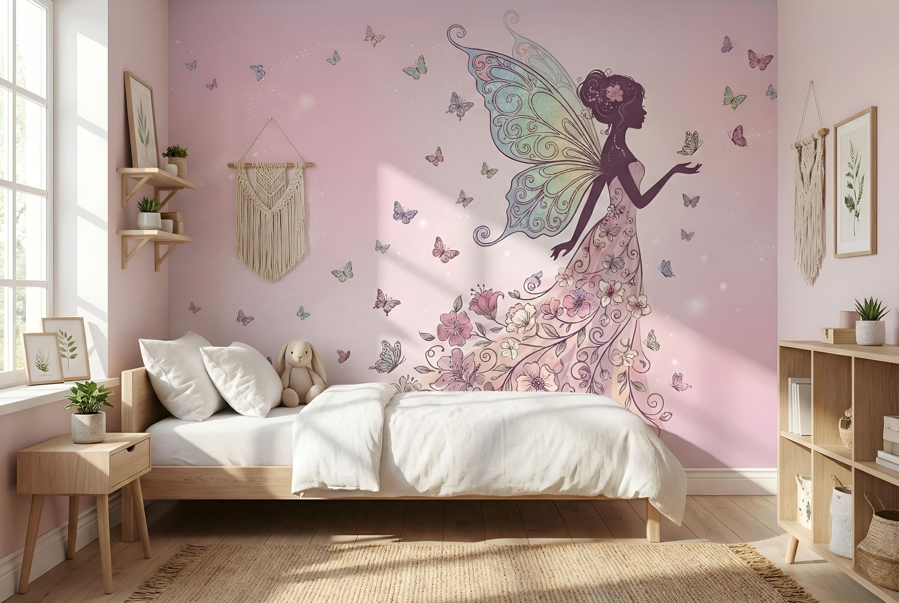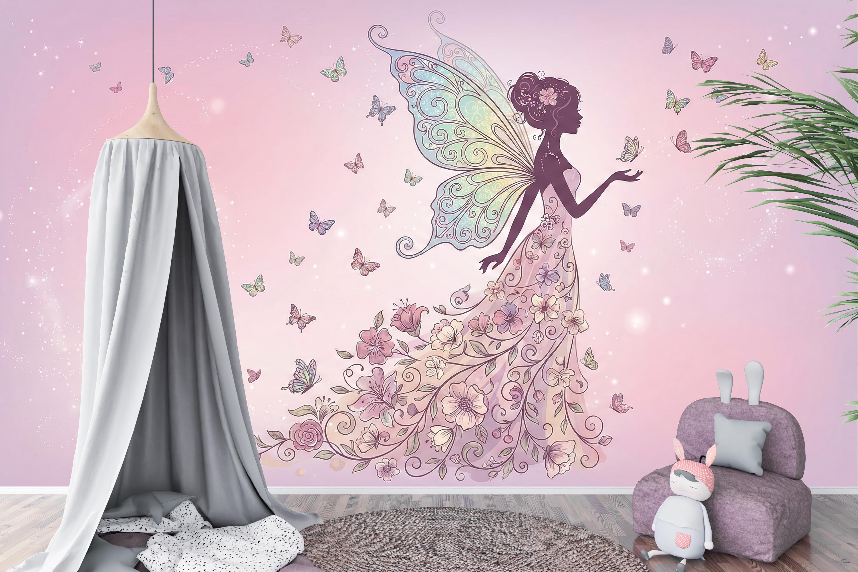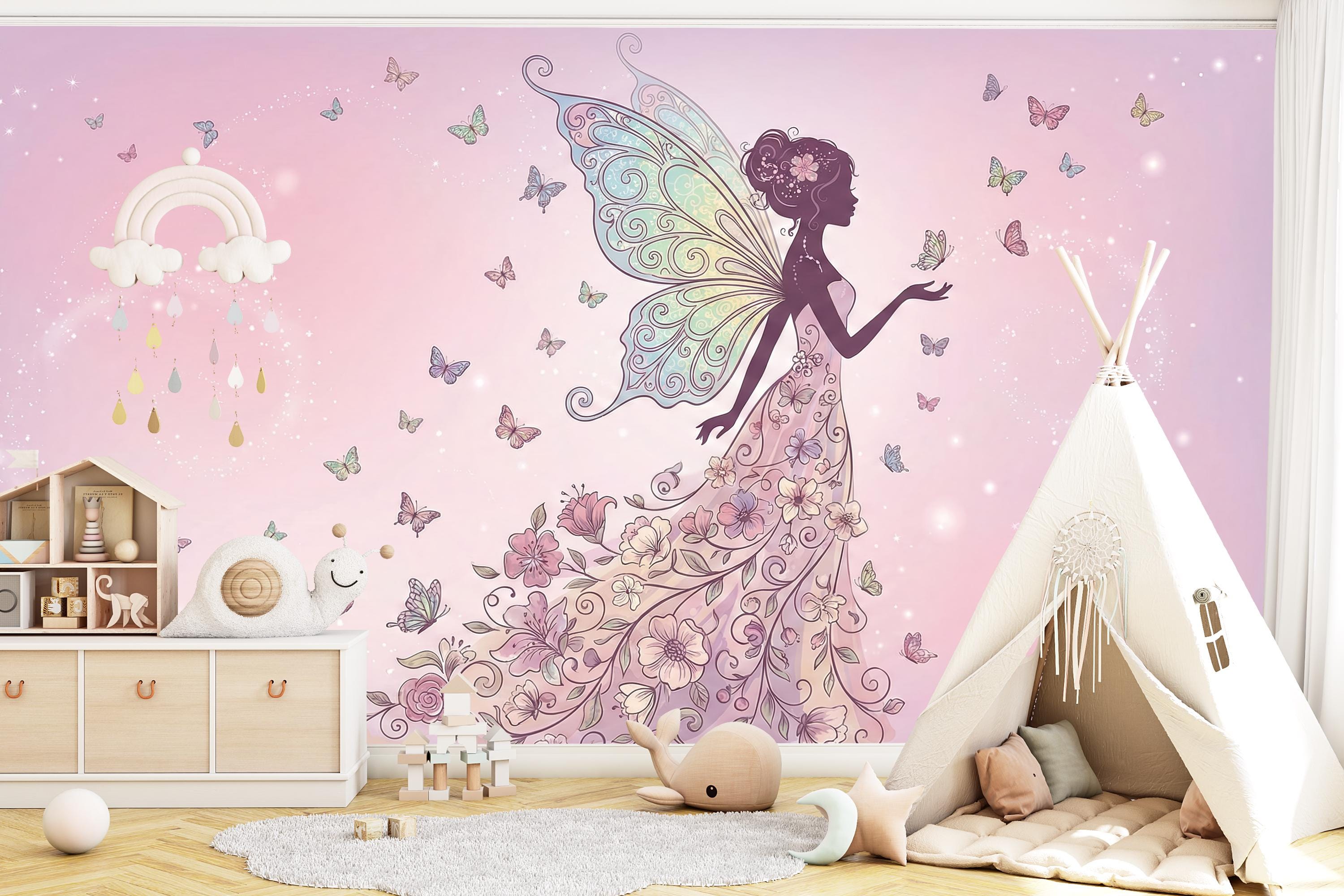 Step into your very own enchanted garden—a place where magical fairy art and fluttering butterflies dance across dreamy pink skies. This floral fairy wallpaper is more than just wall decor—it's a fantasy background for your child’s imagination to bloom.