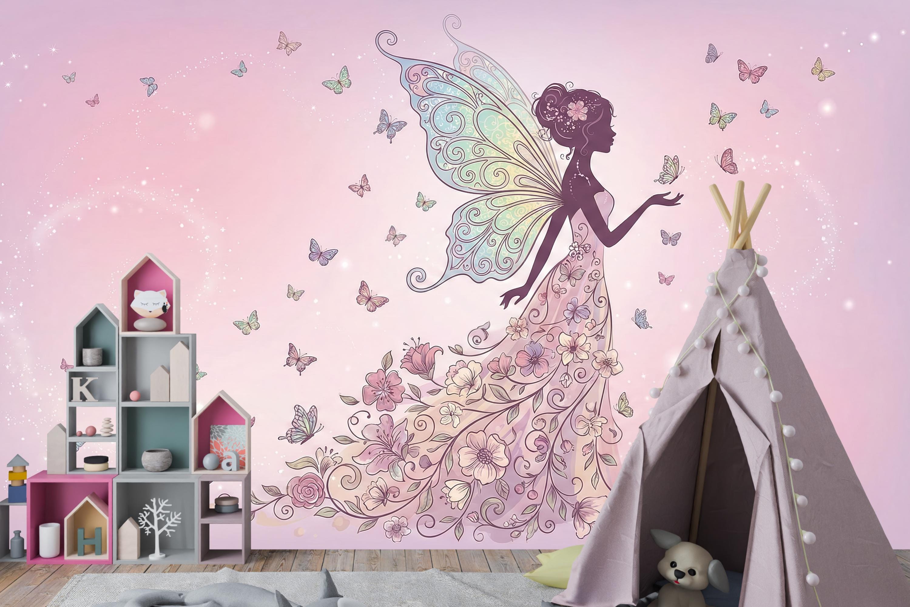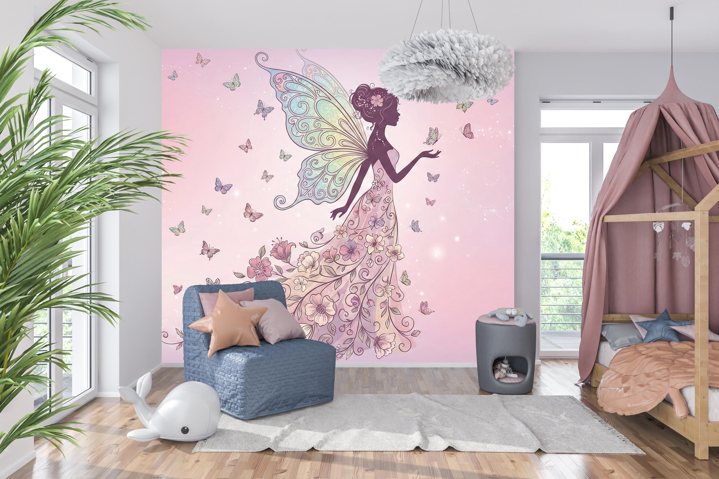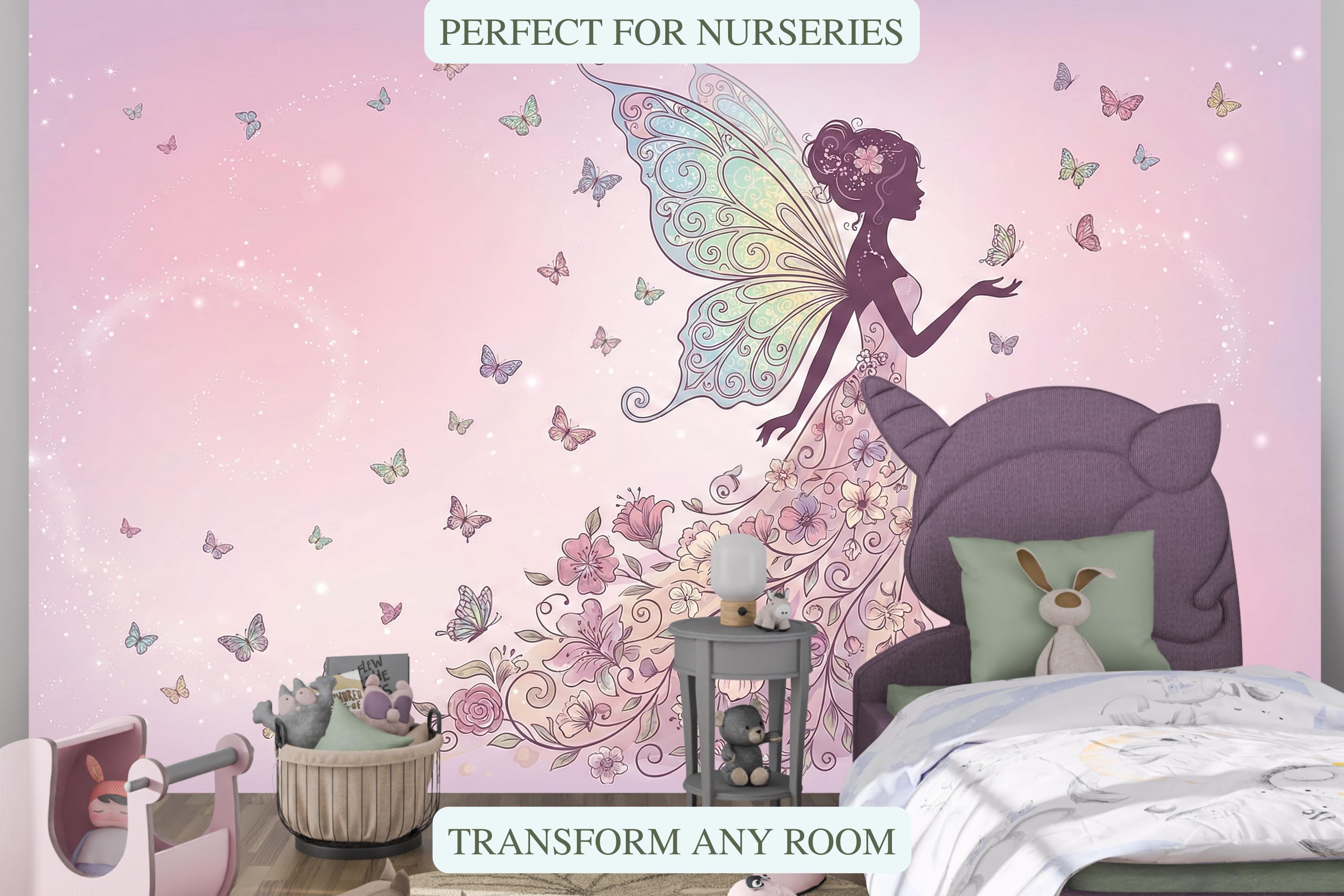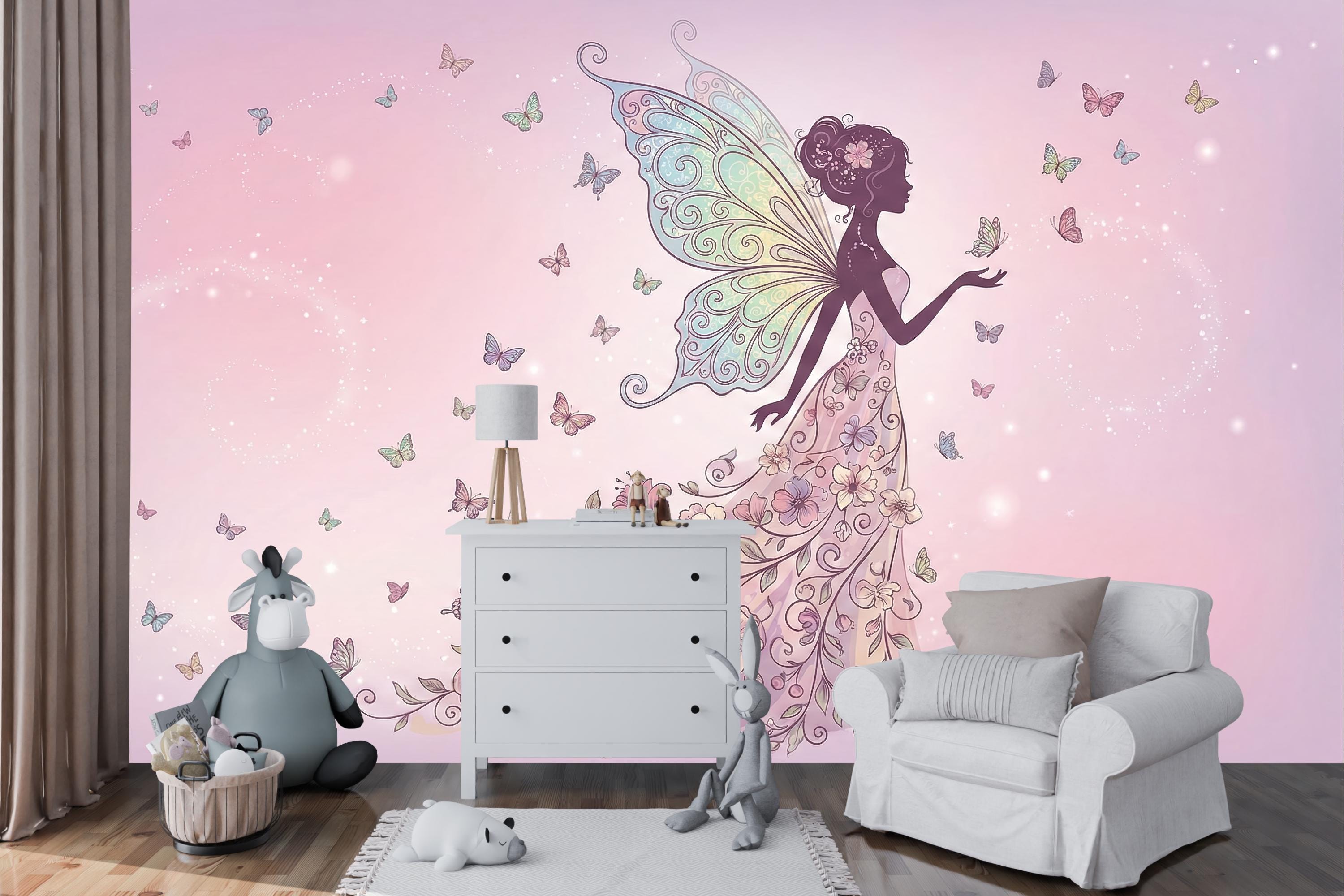Step into your very own enchanted garden—a place where magical fairy art and fluttering butterflies dance across dreamy pink skies. This floral fairy wallpaper is more than just wall decor—it's a fantasy background for your child’s imagination to bloom.