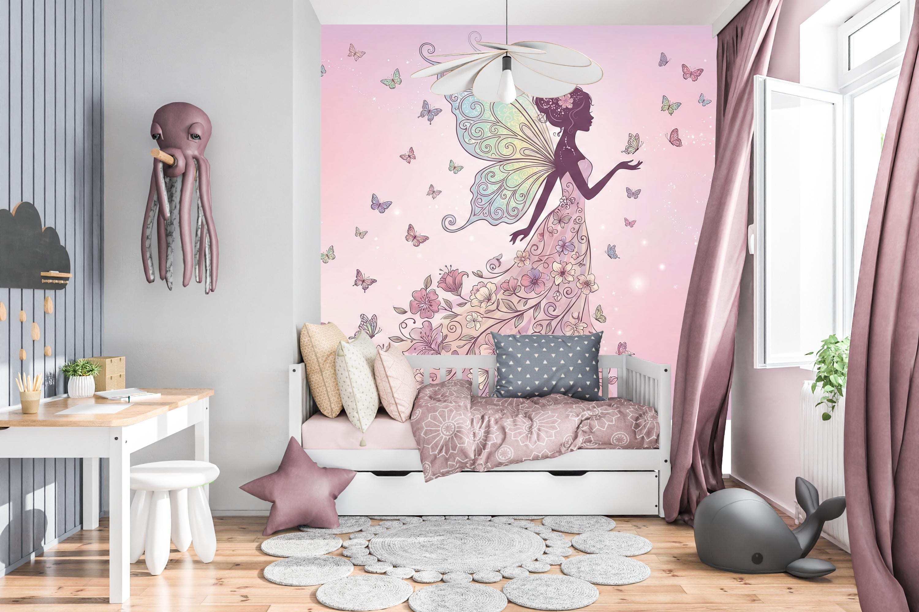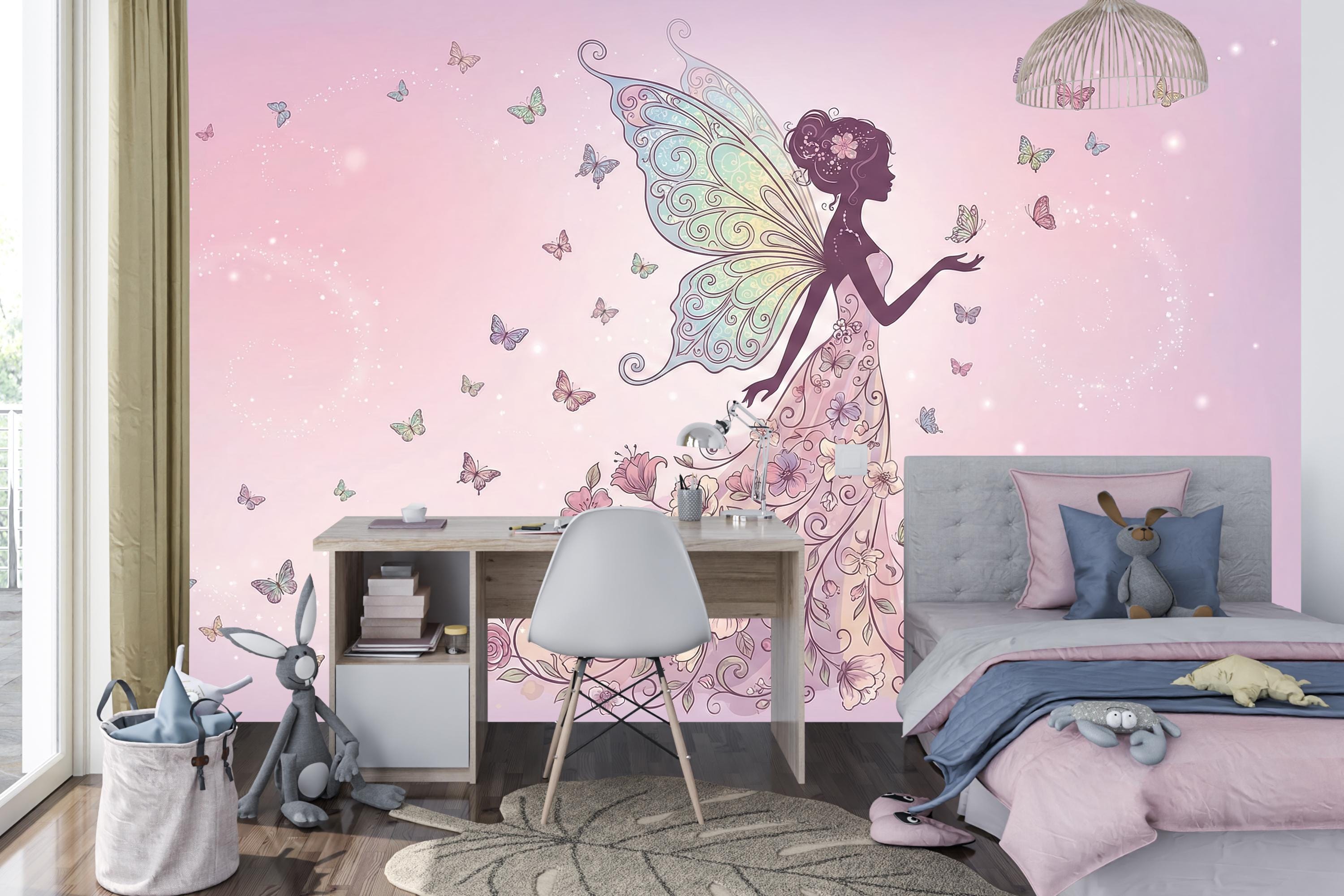 Designed to elevate your princess bedroom or cozy cute girl room, this mural blends whimsical decor with soothing pastels and fairy charm. Whether you’re creating a butterfly mural in a pink nursery or transforming a girls room wall into a fantasy retreat, this wallpaper sets the perfect storybook scene.