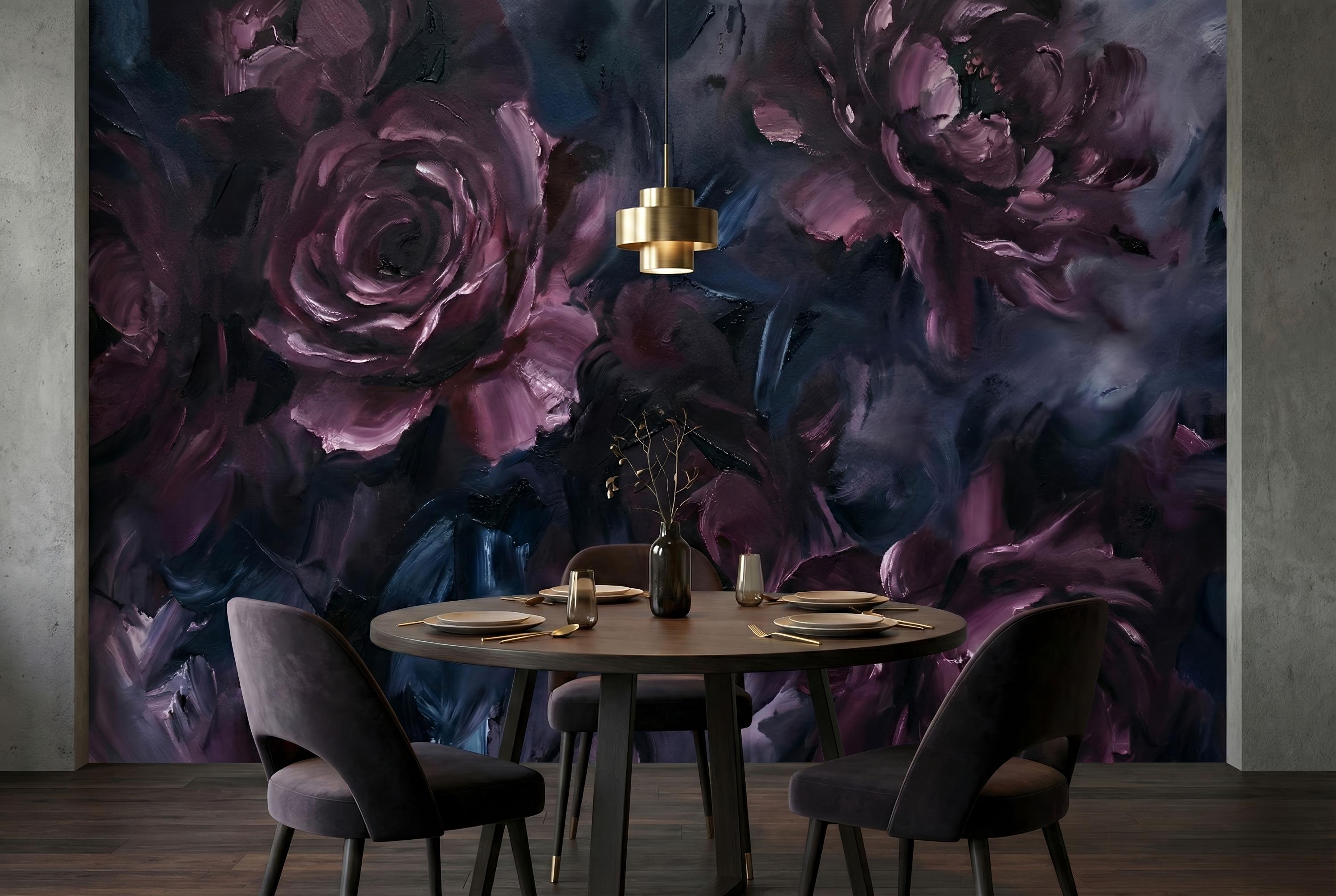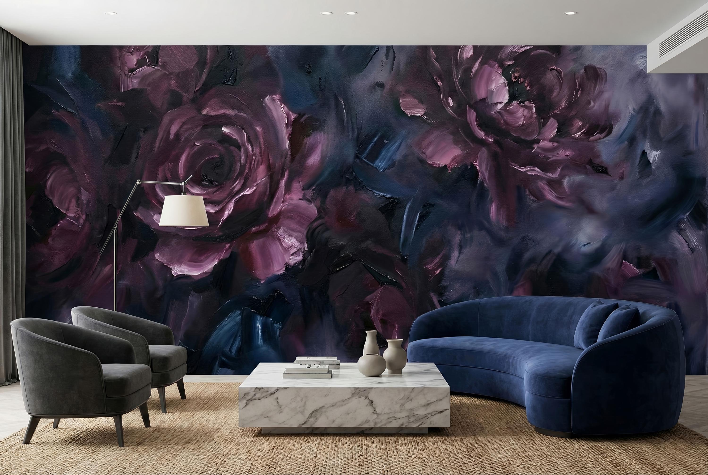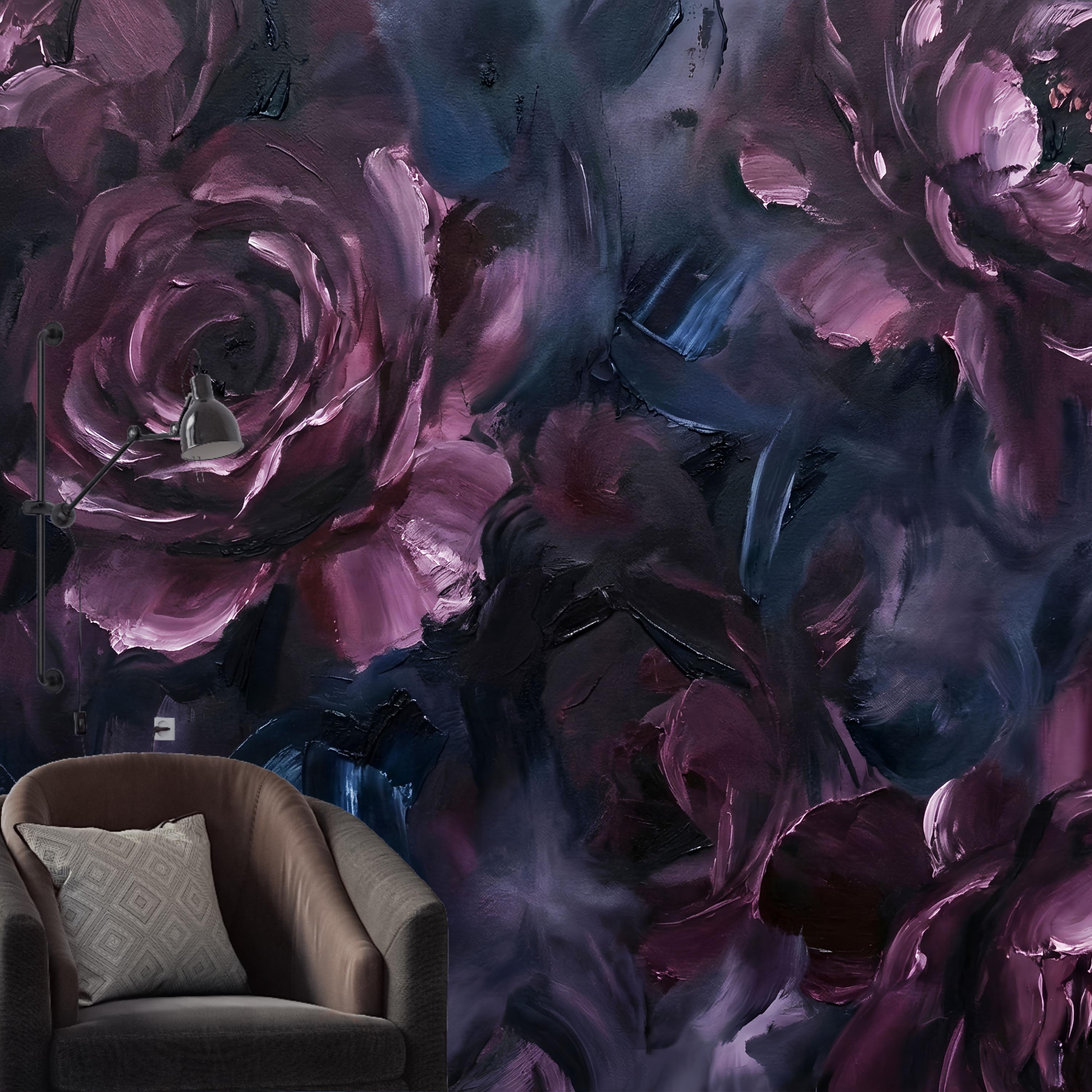This wallpaper is where art meets emotion. Featuring deep, painterly roses layered in rich plum, midnight blue, and smoky charcoal tones, this dark abstract floral wallpaper brings a bold, expressive presence to any interior. The textured brushstrokes feel like an oil painting brought to life on your walls.