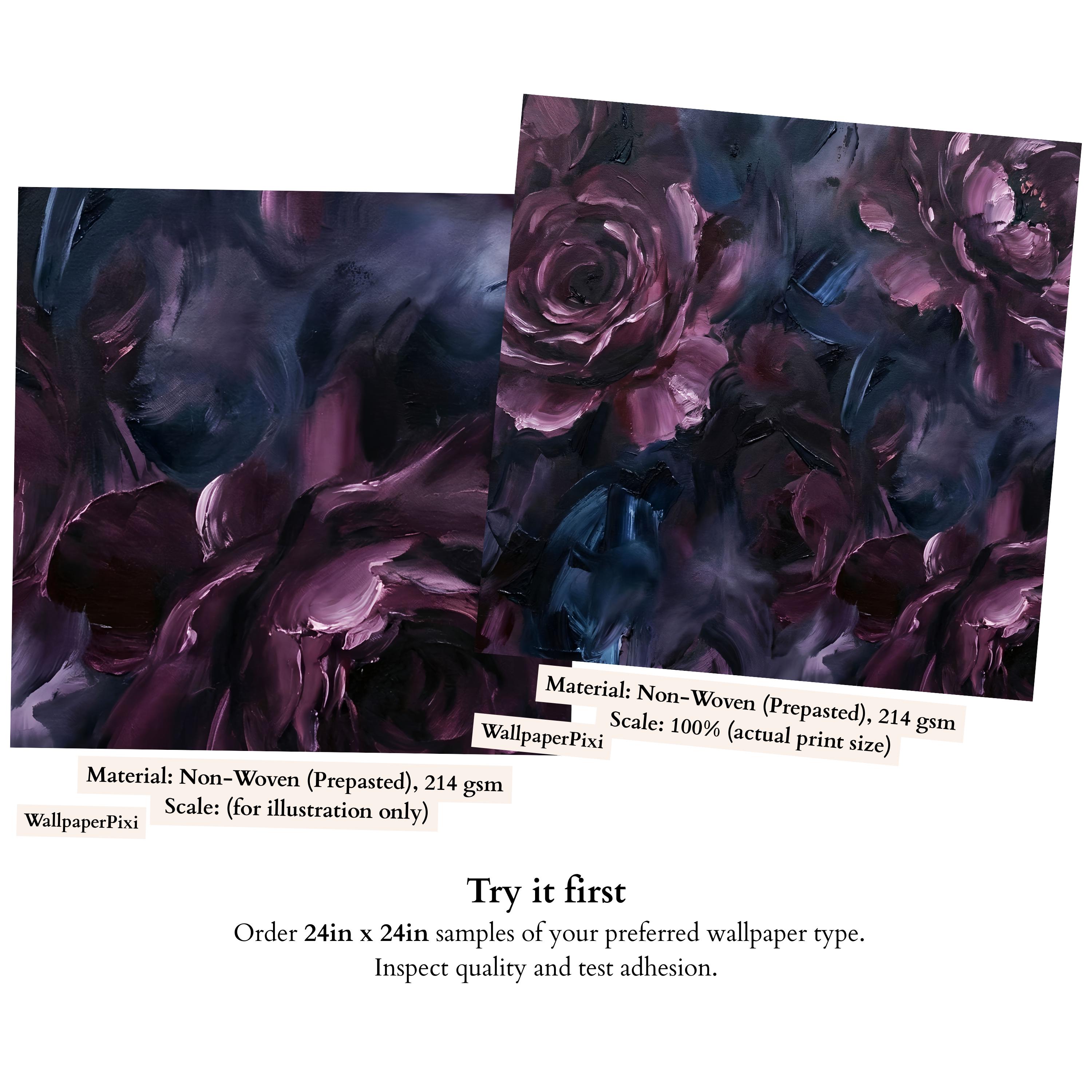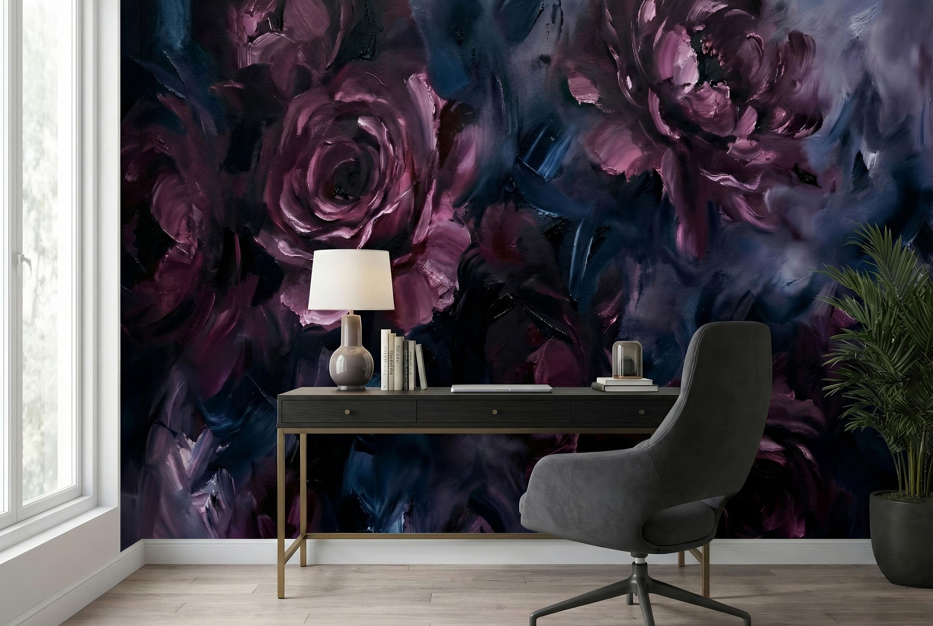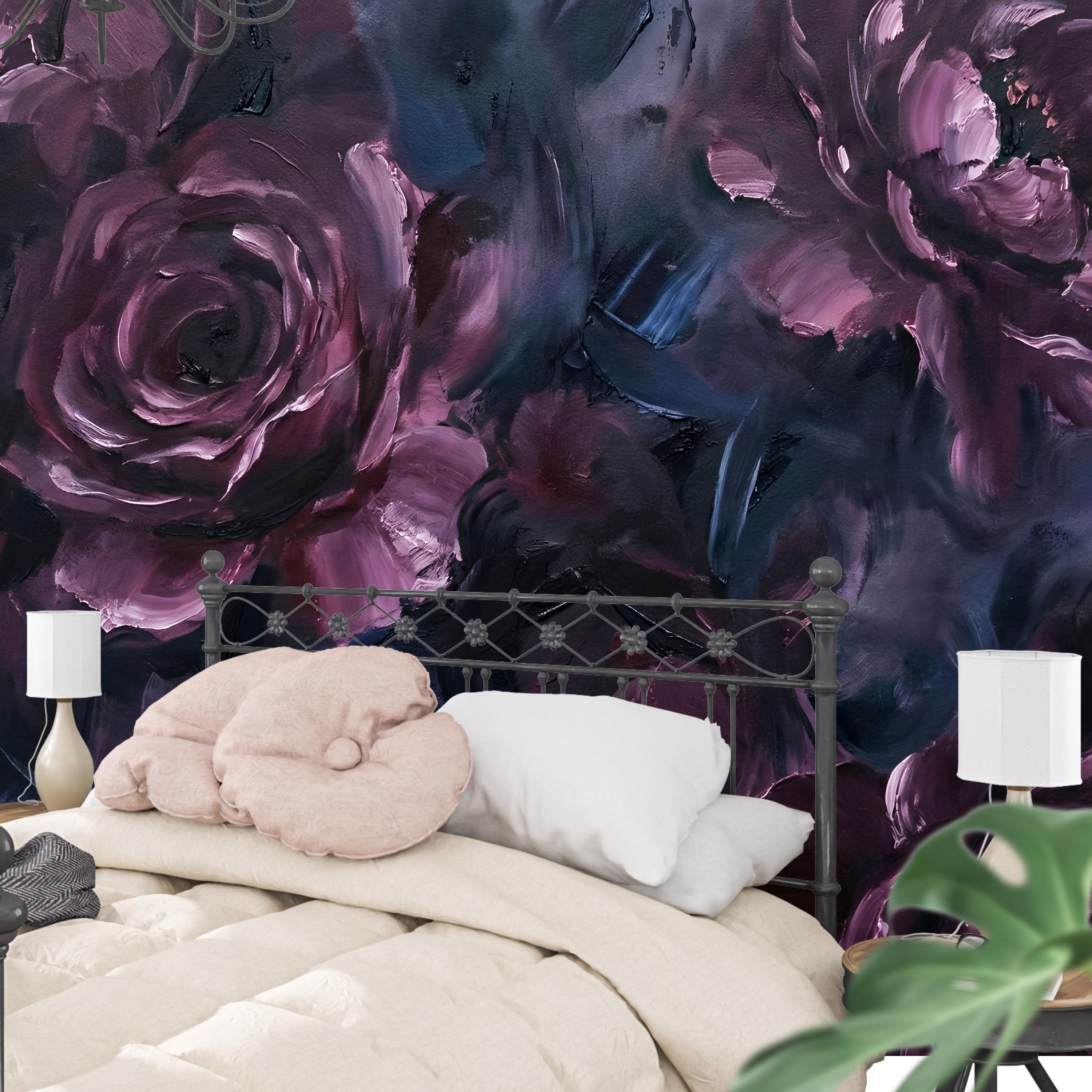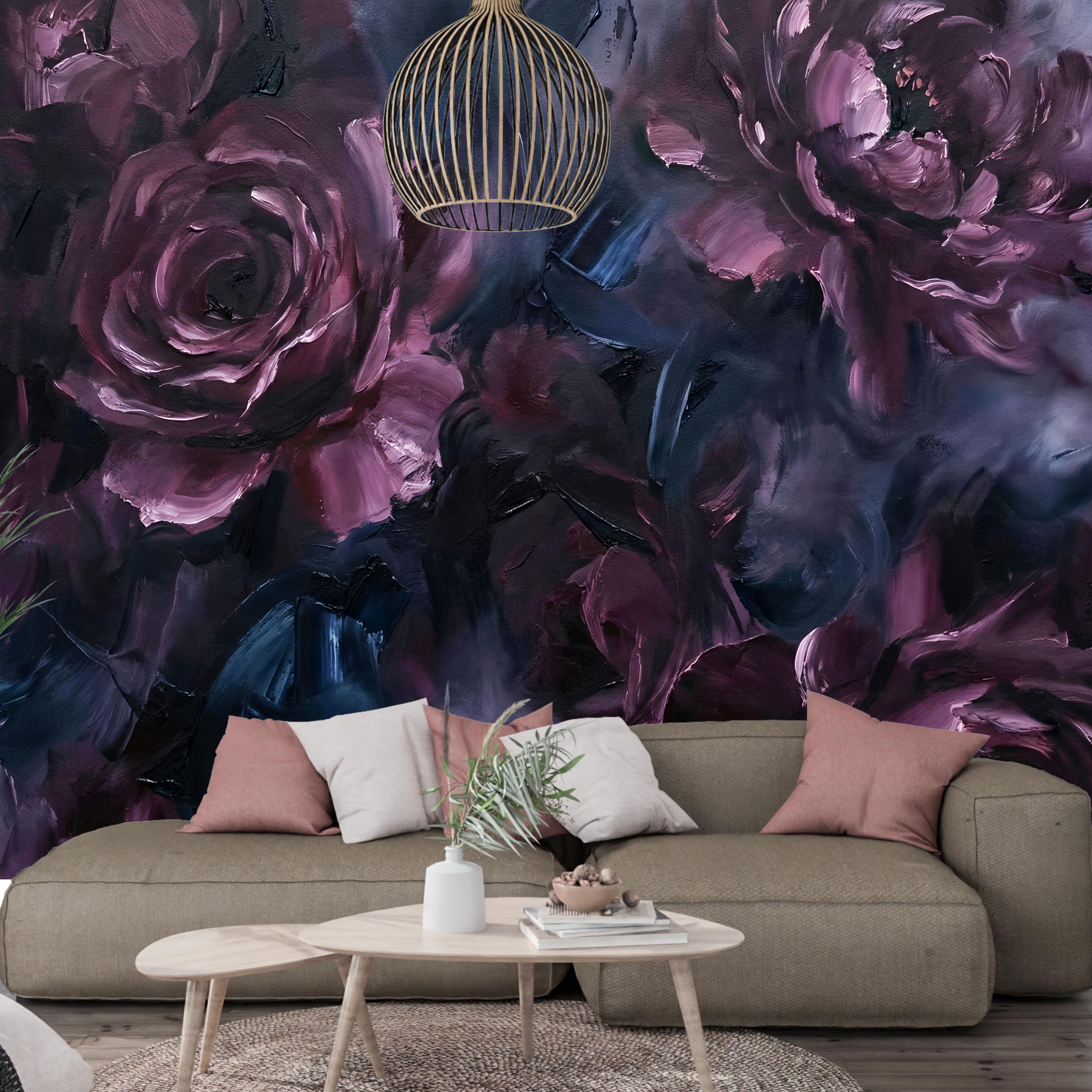 This wallpaper is where art meets emotion. Featuring deep, painterly roses layered in rich plum, midnight blue, and smoky charcoal tones, this dark abstract floral wallpaper brings a bold, expressive presence to any interior. The textured brushstrokes feel like an oil painting brought to life on your walls.