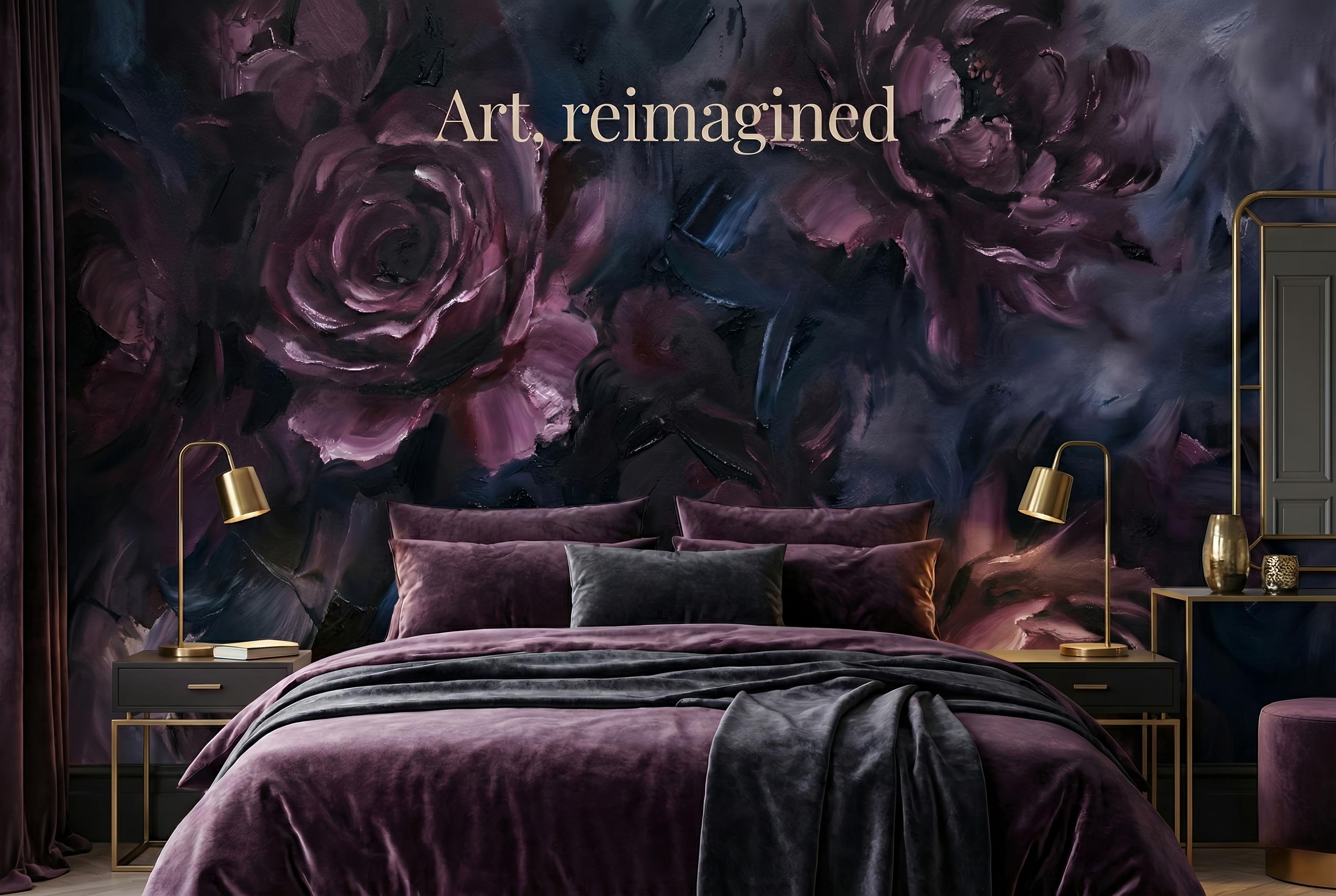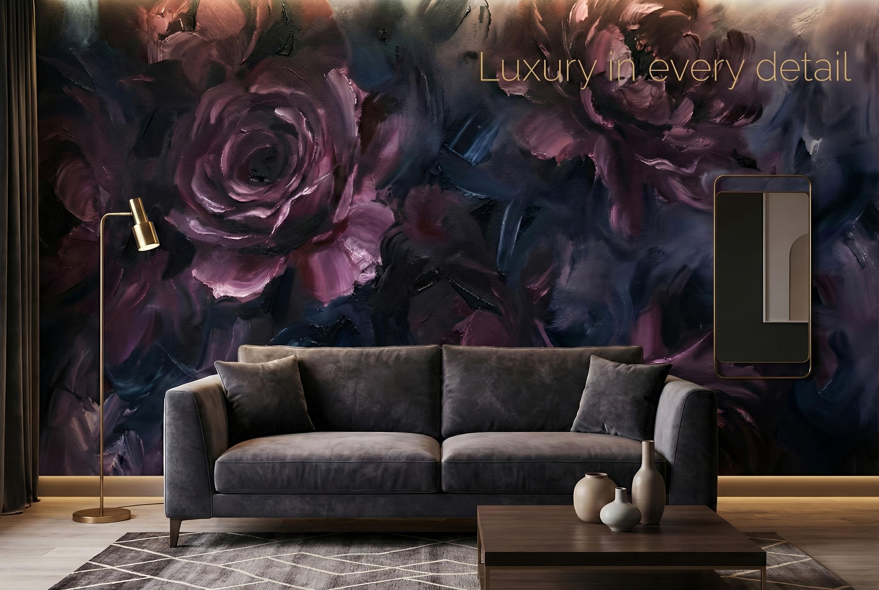 Elevate your space with this dark abstract floral wallpaper. Moody painted roses and rich brush textures create a dramatic, artistic statement wall.
