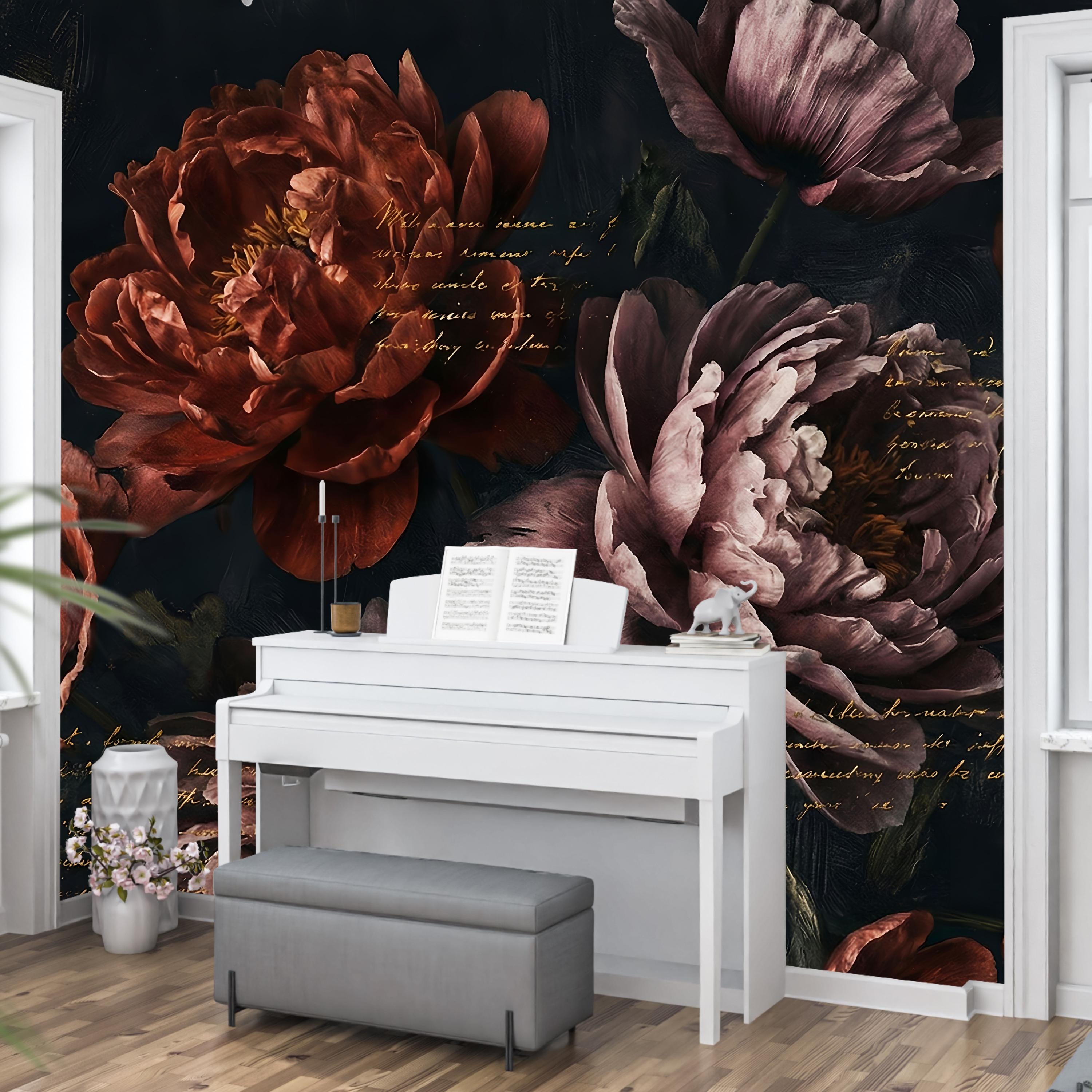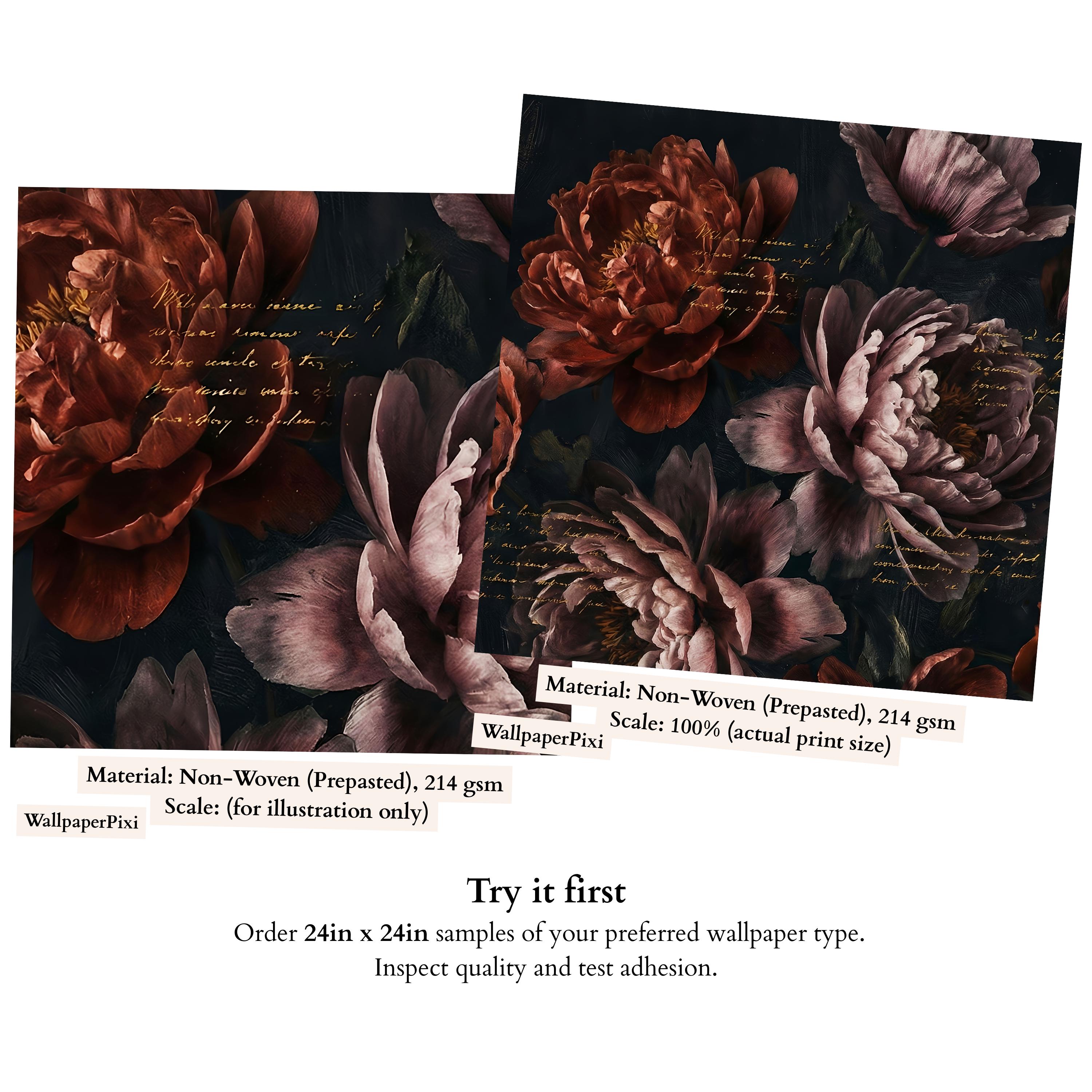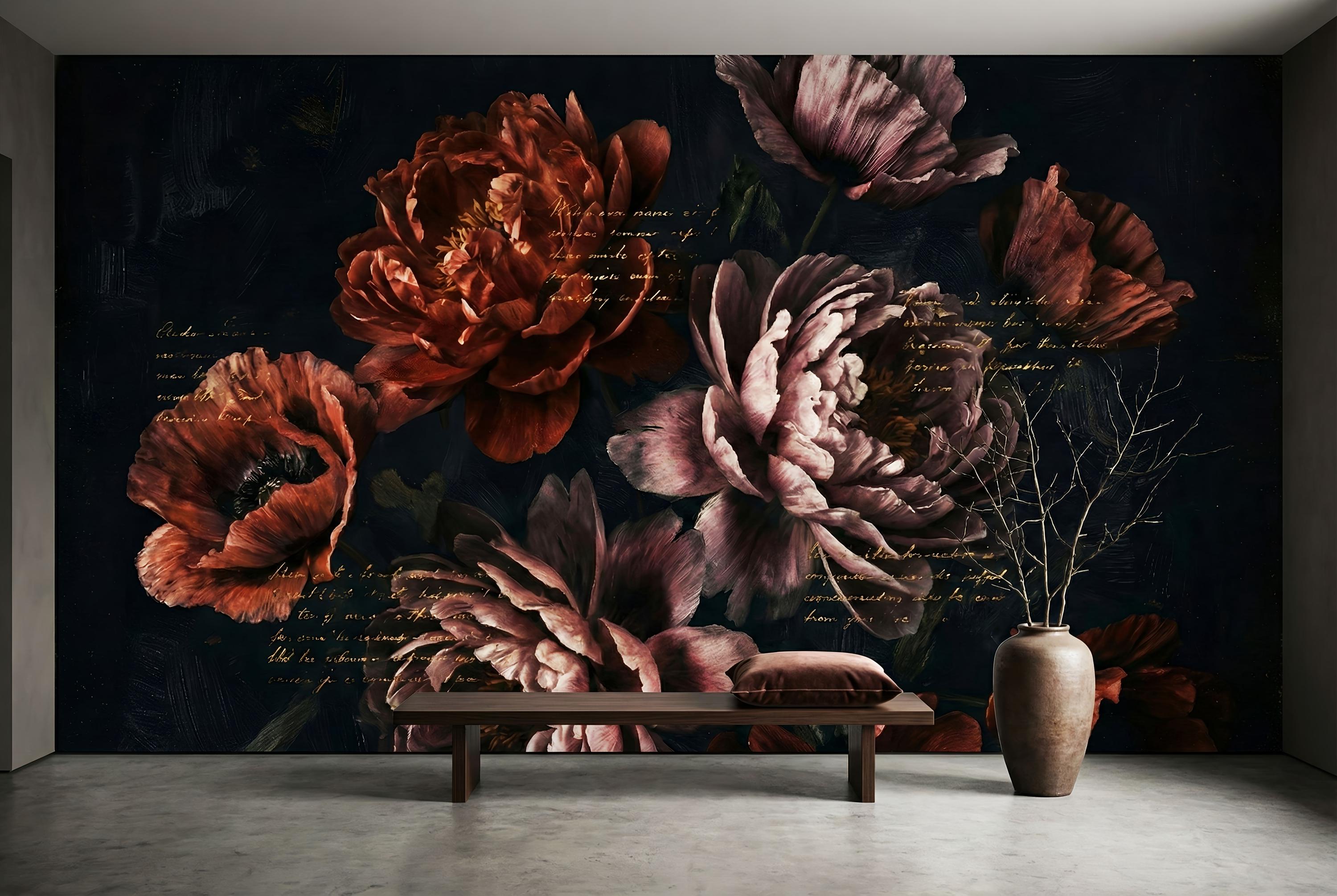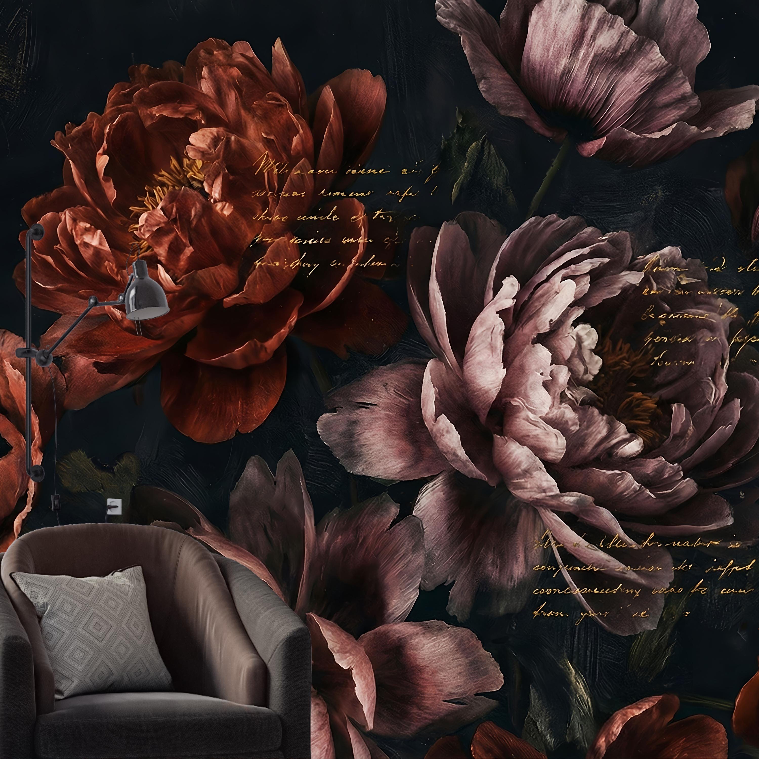 Inspired by antique manuscripts and old master floral paintings, this dark romantic floral wallpaper blends lush peonies with delicate handwritten script details layered across a deep, textured background. Rich burgundy, muted blush, and warm sepia tones create a dramatic yet refined atmosphere that feels intimate and timeless.
