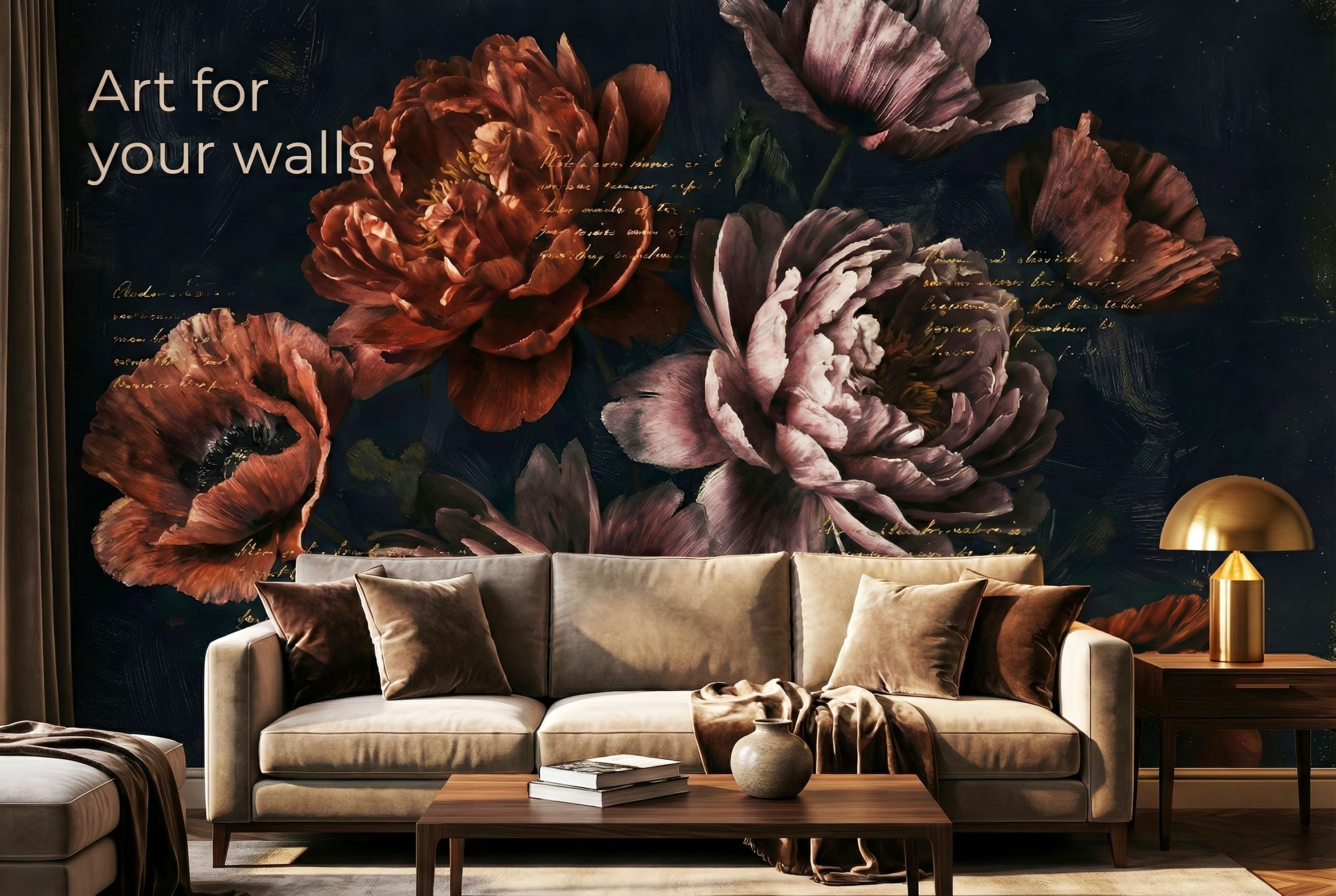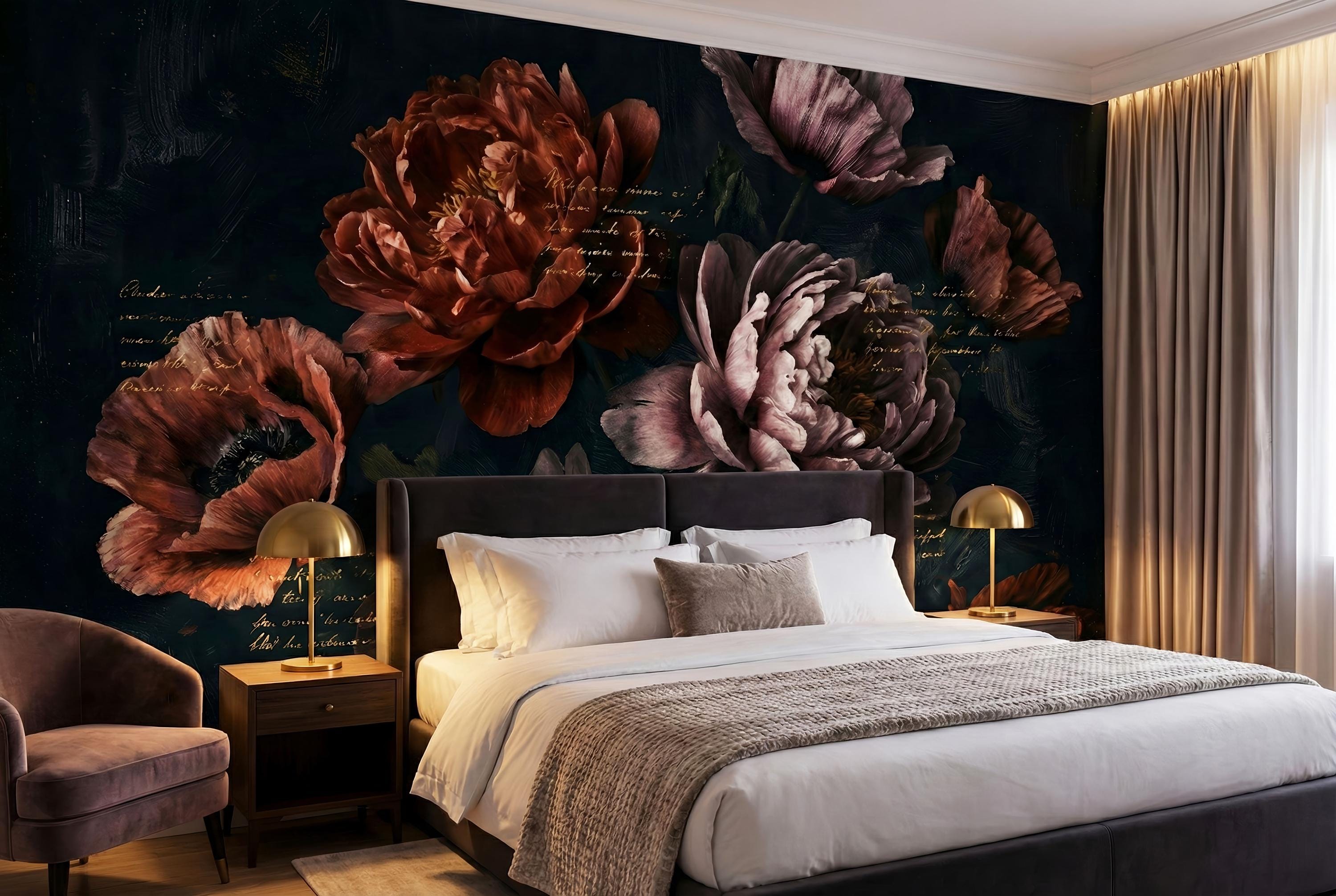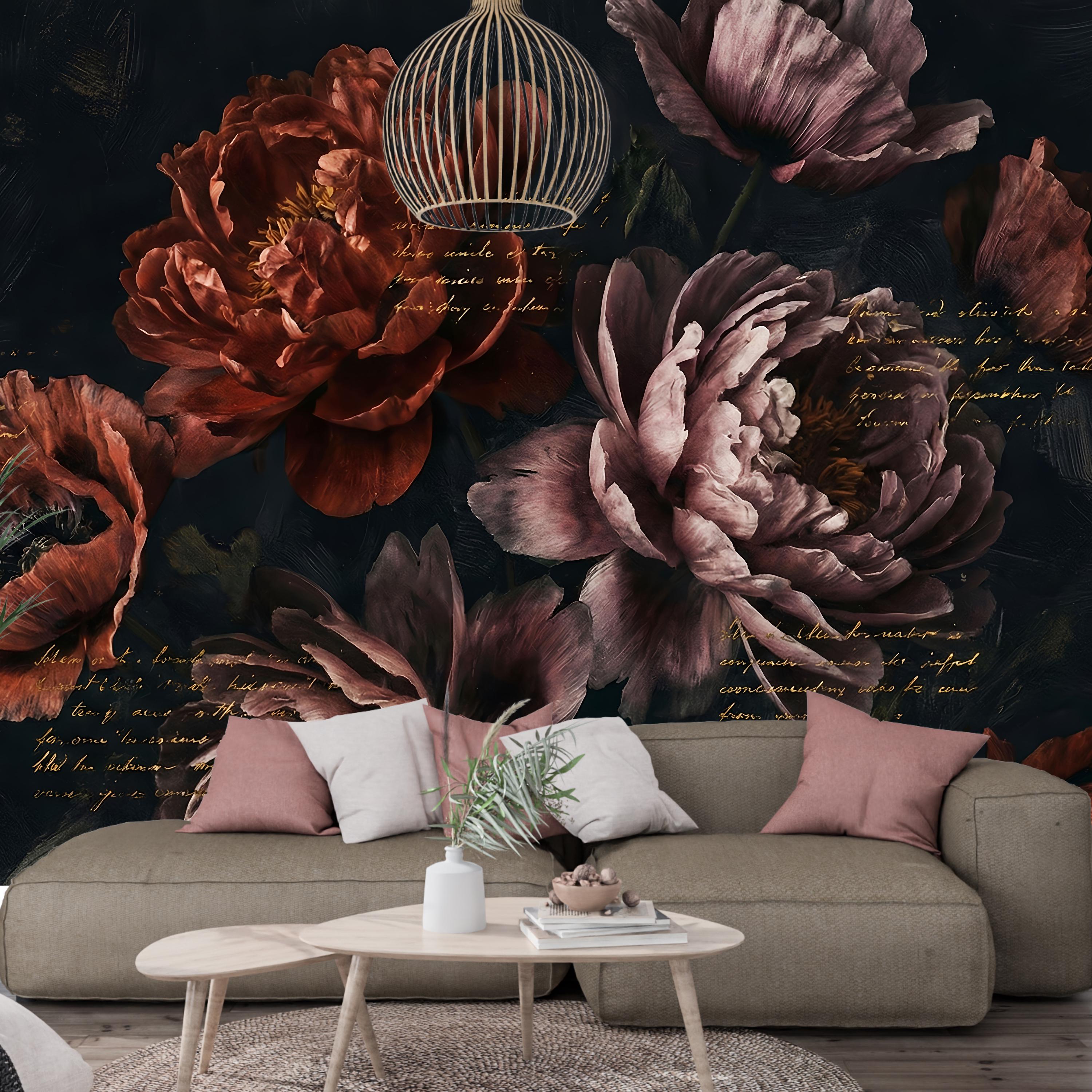 Inspired by antique manuscripts and old master floral paintings, this dark romantic floral wallpaper blends lush peonies with delicate handwritten script details layered across a deep, textured background. Rich burgundy, muted blush, and warm sepia tones create a dramatic yet refined atmosphere that feels intimate and timeless.