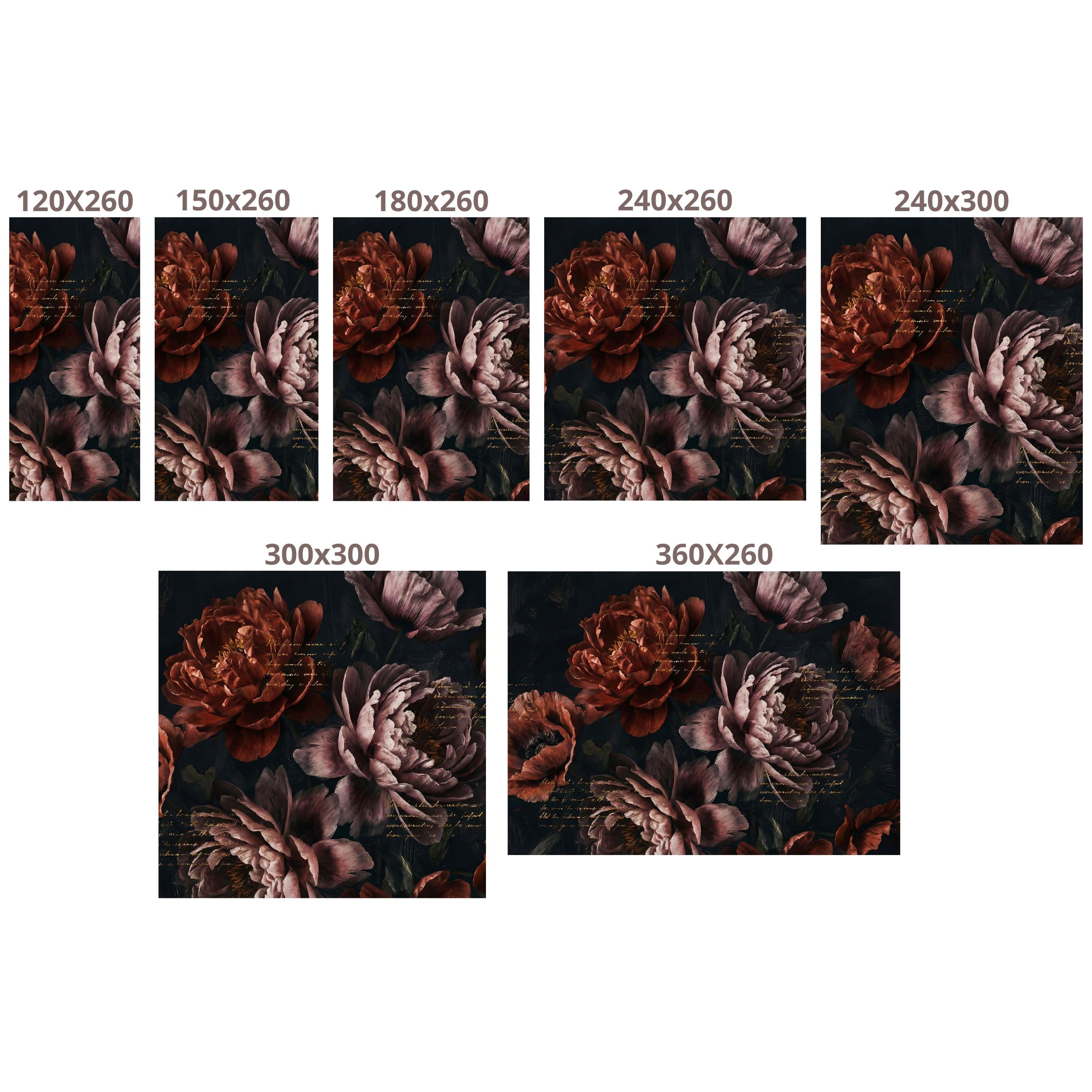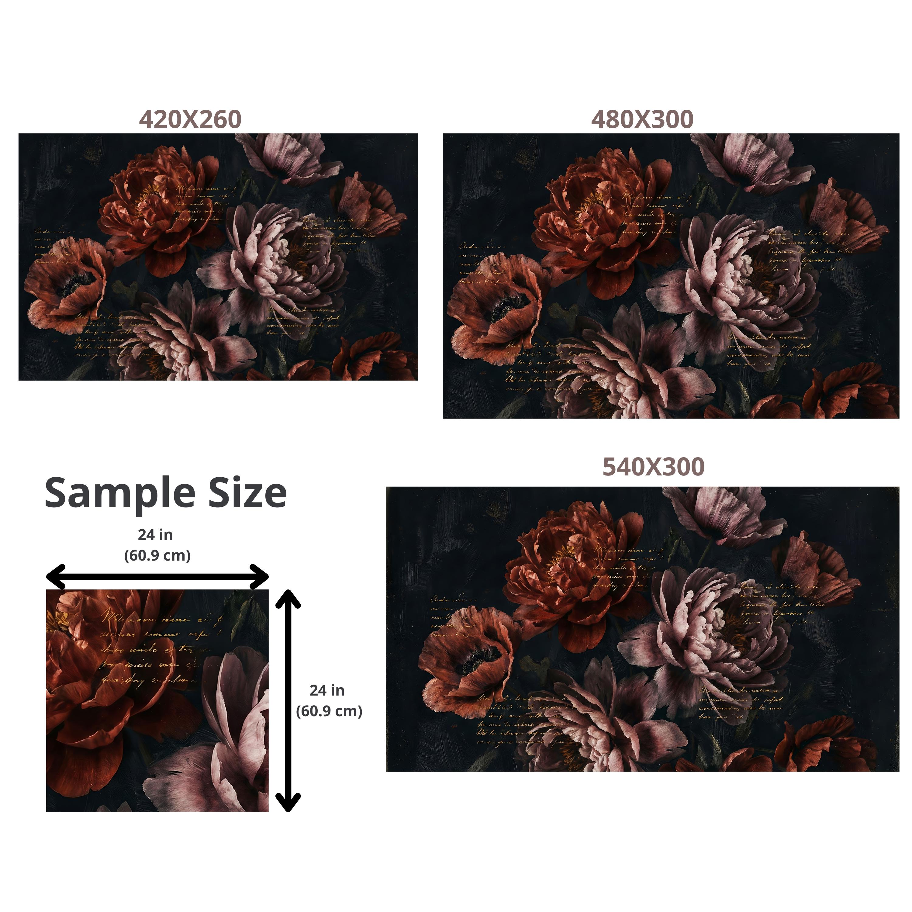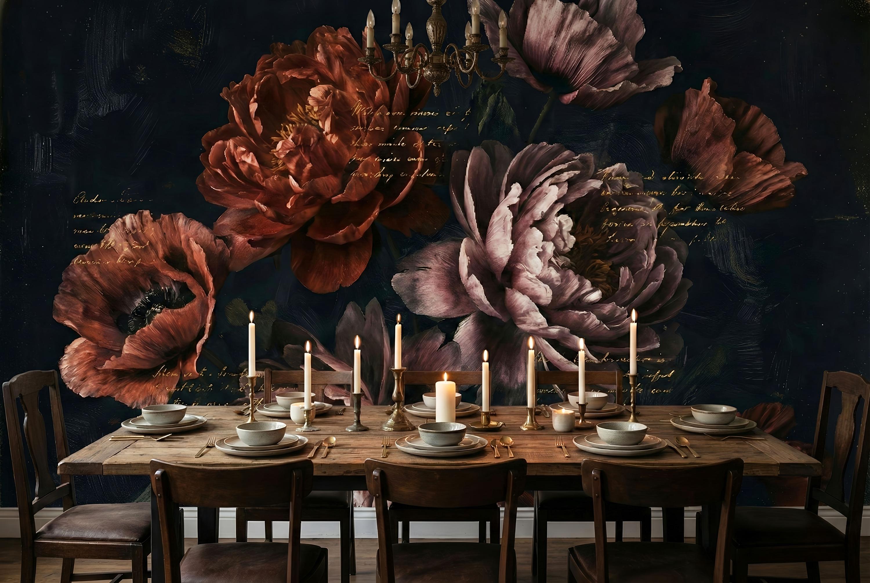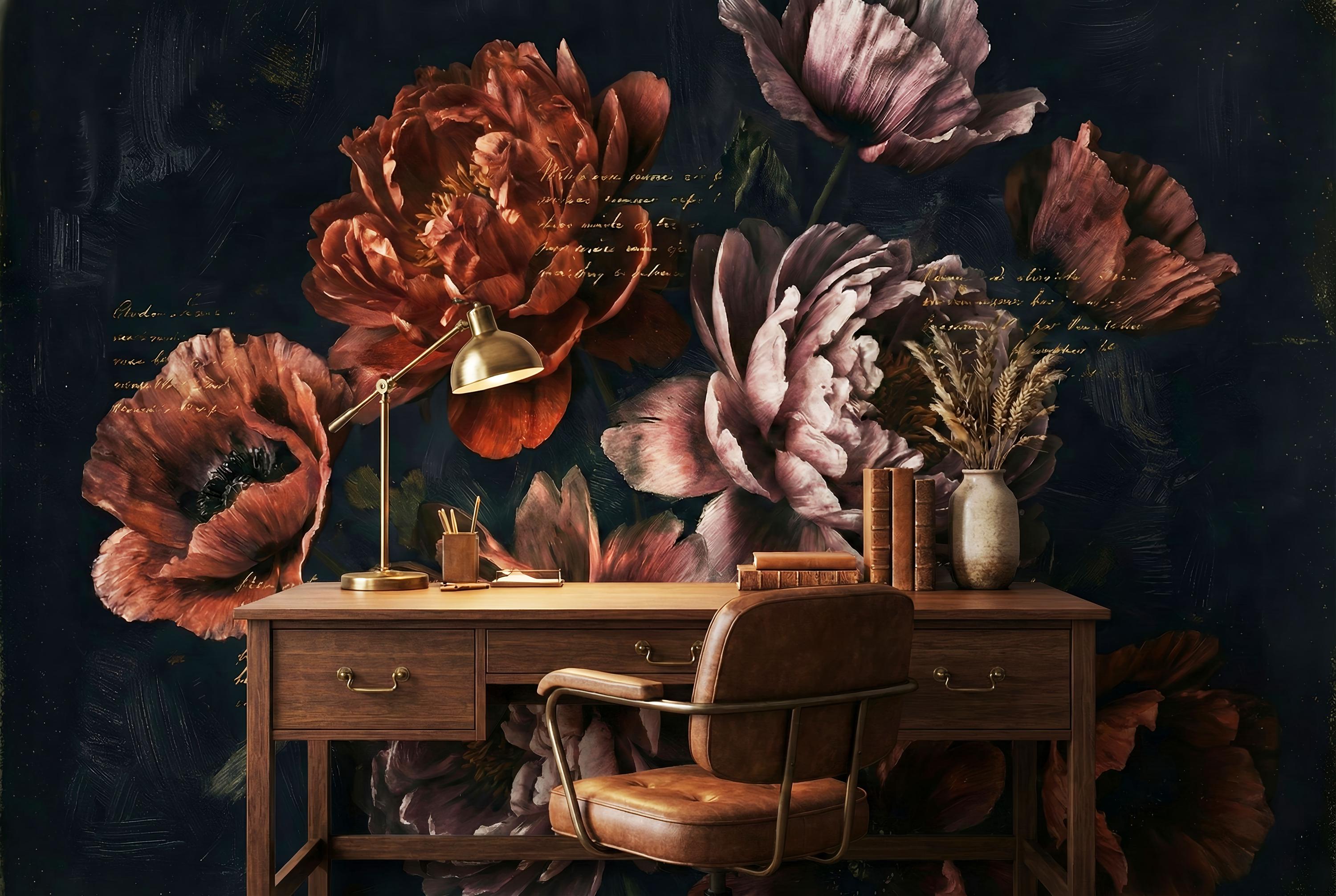 Inspired by antique manuscripts and old master floral paintings, this dark romantic floral wallpaper blends lush peonies with delicate handwritten script details layered across a deep, textured background. Rich burgundy, muted blush, and warm sepia tones create a dramatic yet refined atmosphere that feels intimate and timeless.