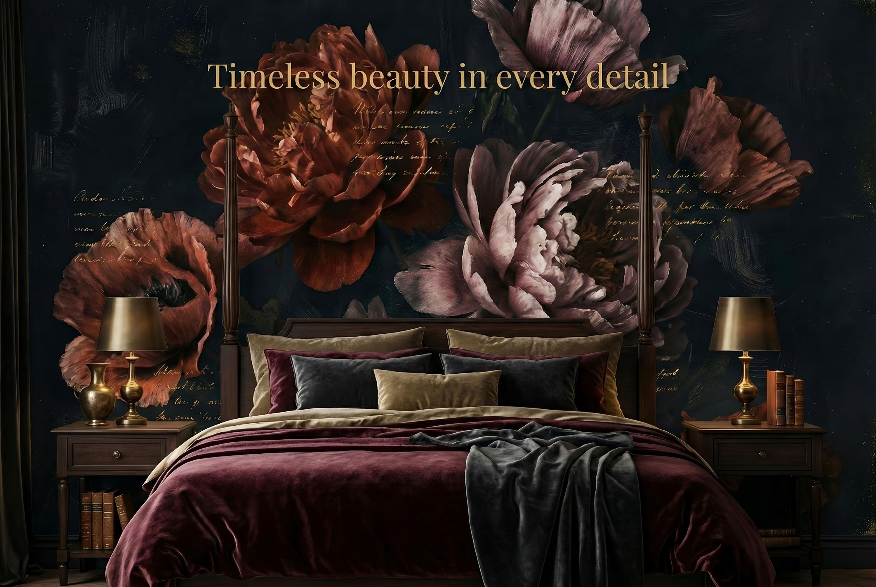 This wallpaper transforms your space into a quiet, romantic sanctuary. The layered florals and faded script create a sense of history and emotion, making your walls feel deeply personal and artful. Ideal for dark romantic bedrooms, vintage-inspired interiors, and anyone drawn to moody, poetic design.