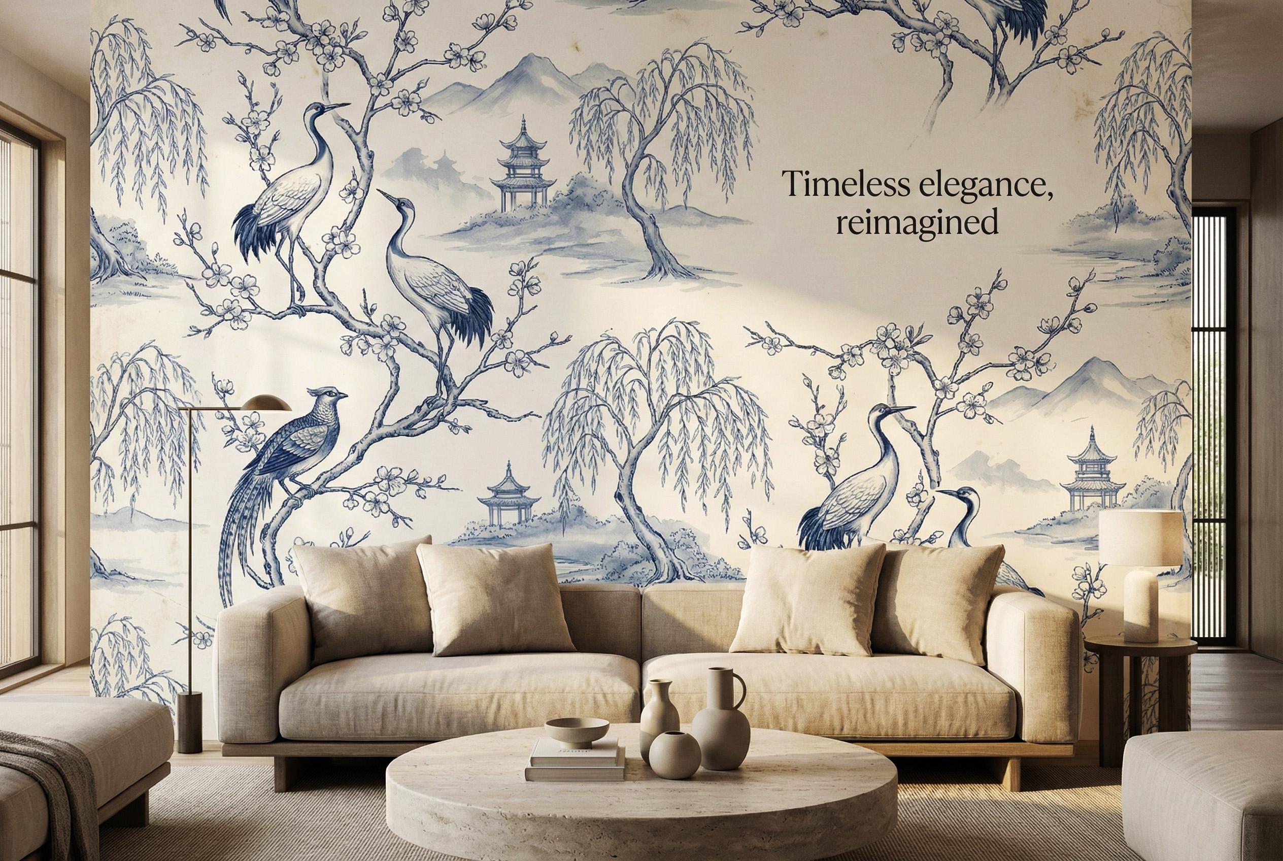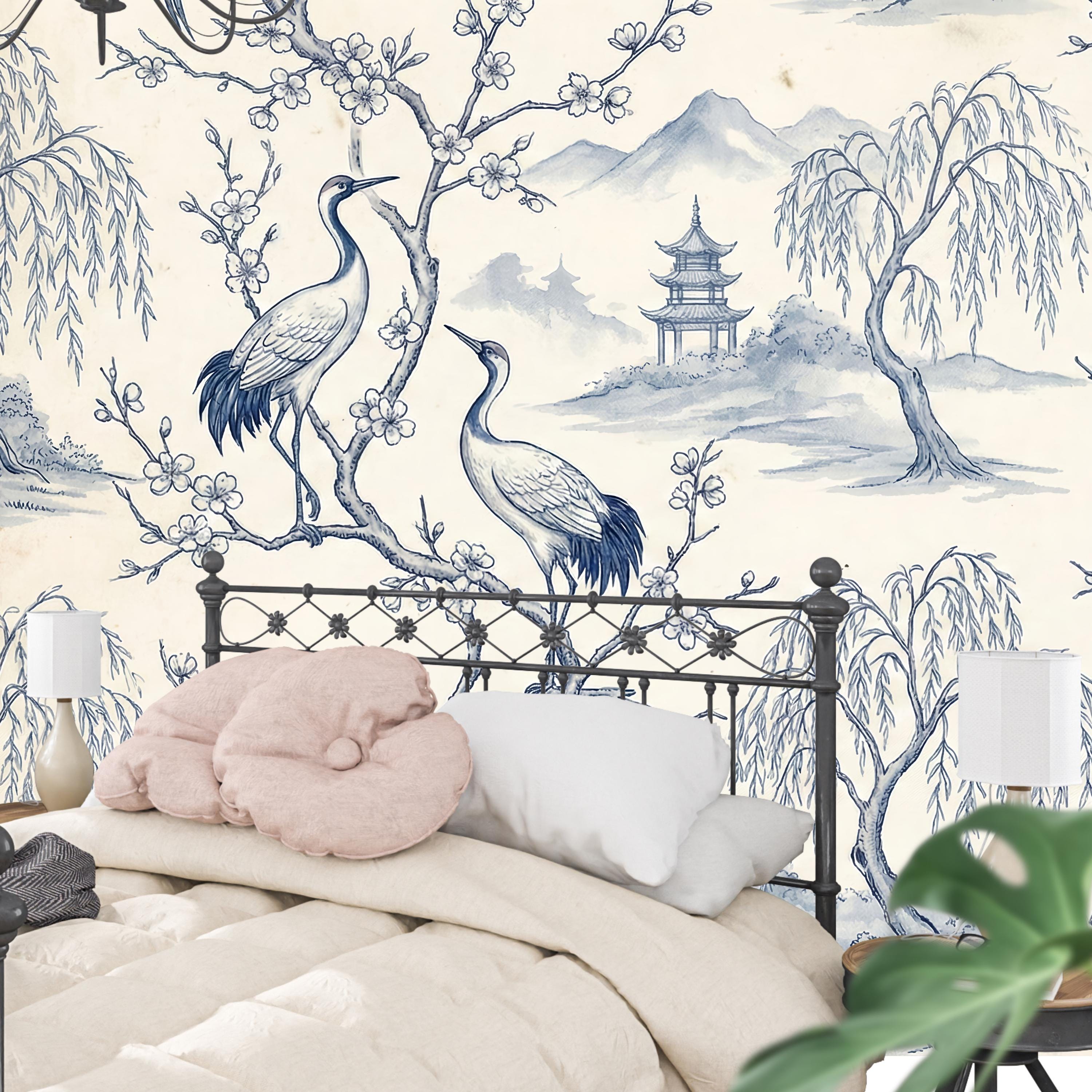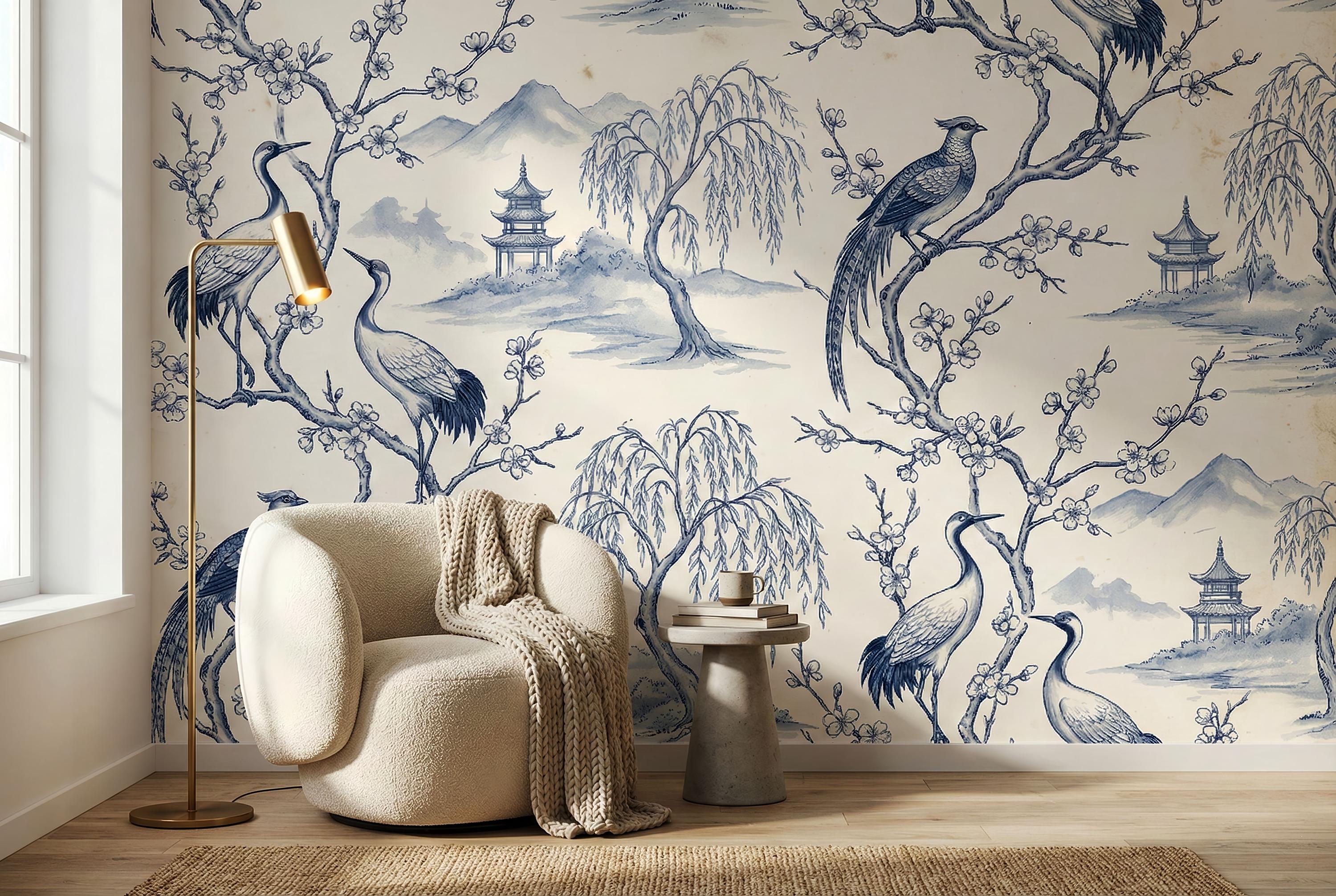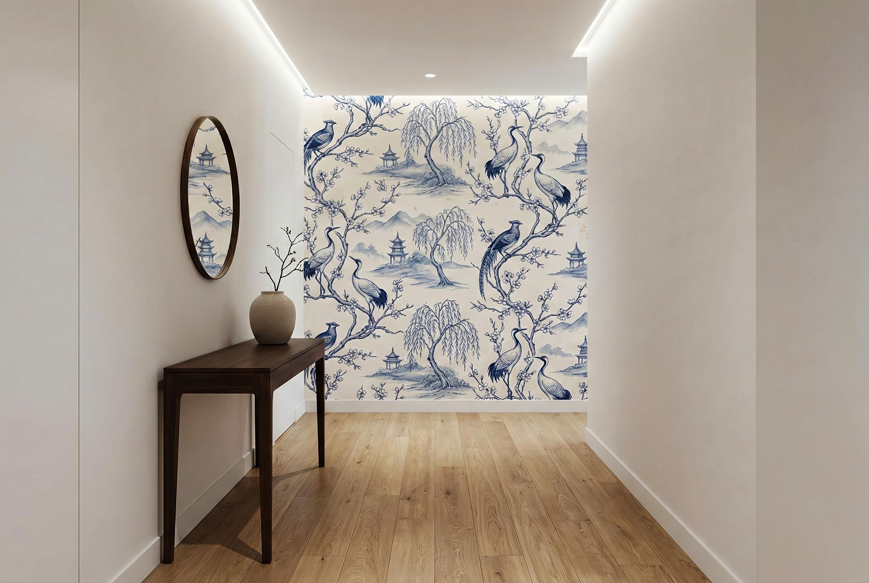 Transform your home into a peaceful retreat with this Chinoiserie-inspired crane wallpaper. Rendered in soothing shades of blue and white, this oriental-style mural features majestic cranes surrounded by delicate foliage — a classic nod to Asian aesthetics and nature’s quiet beauty.