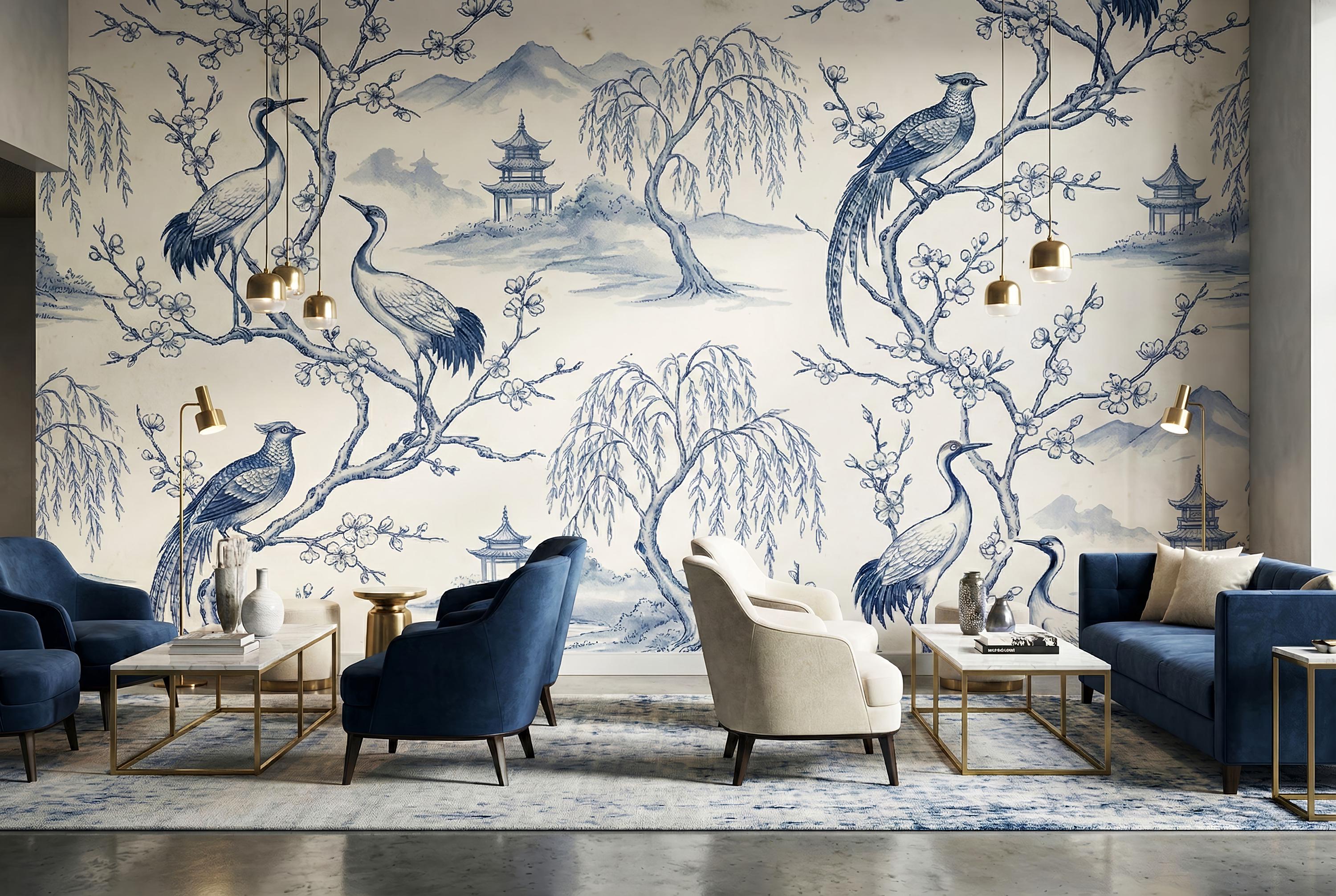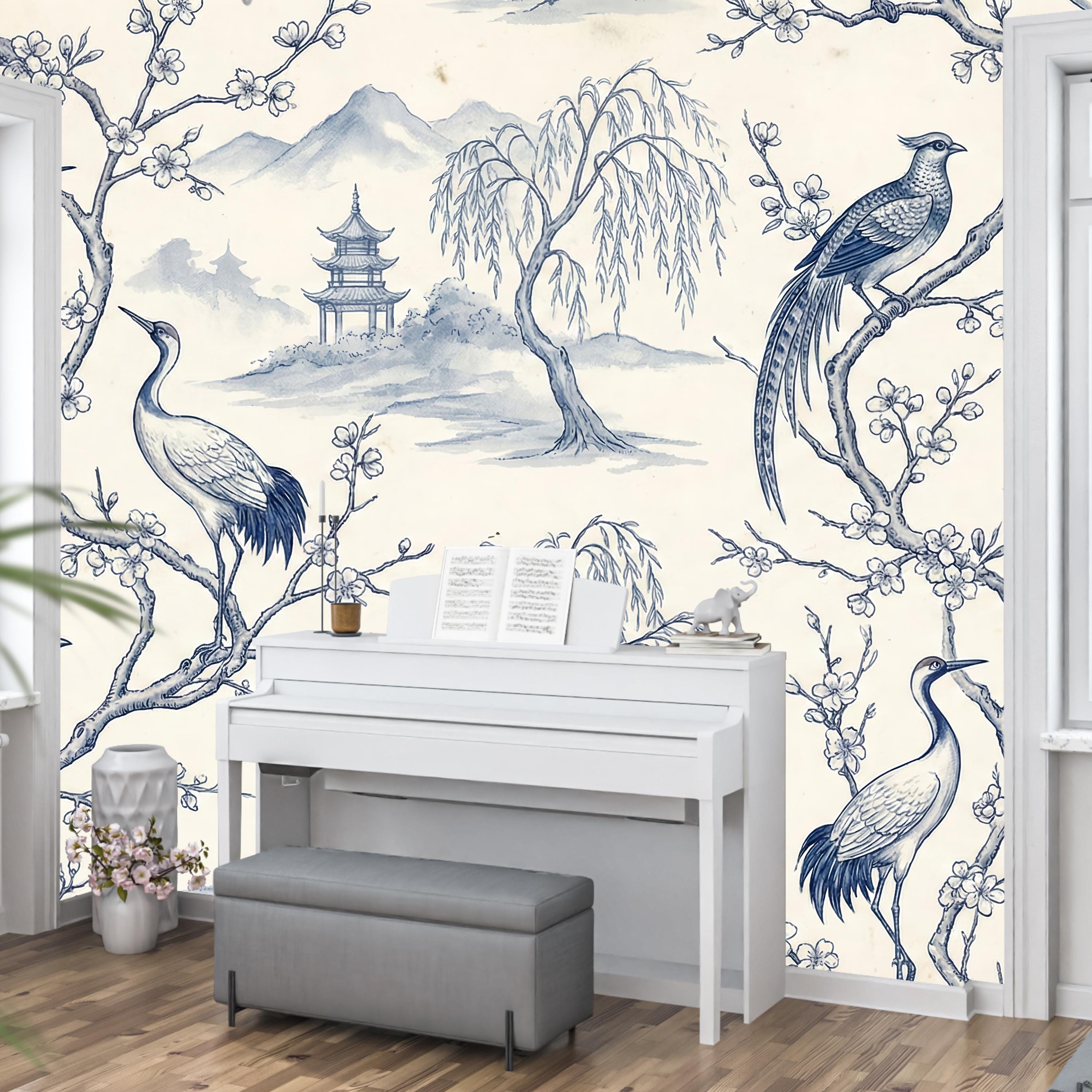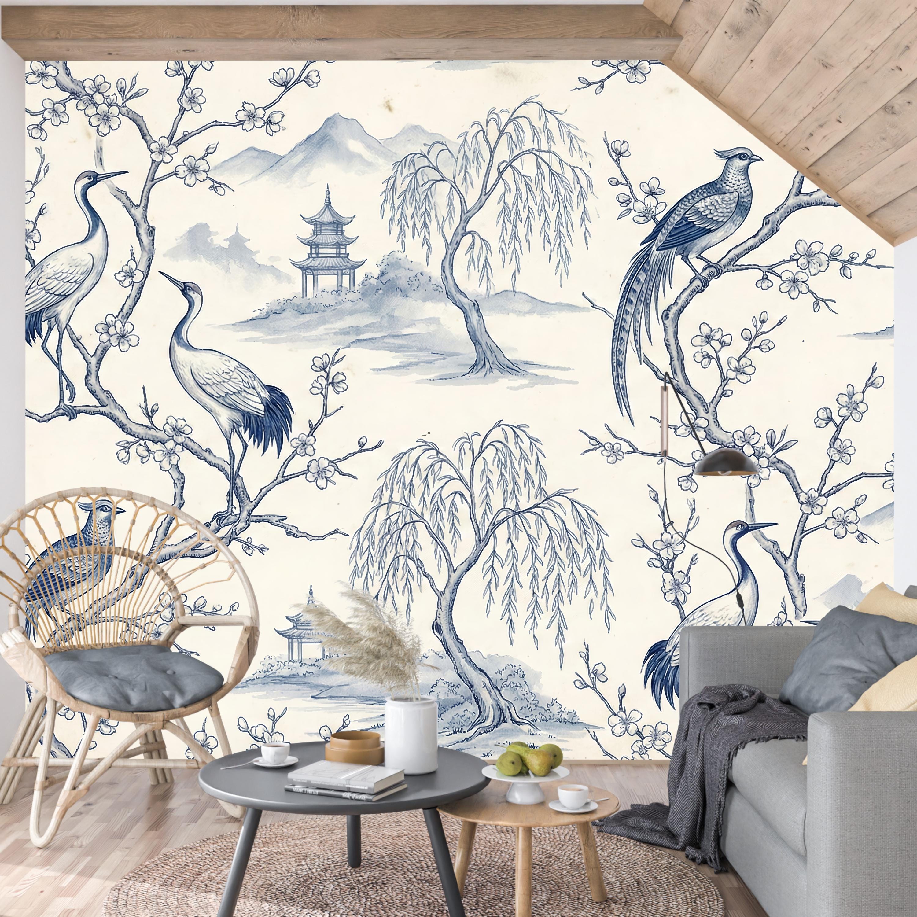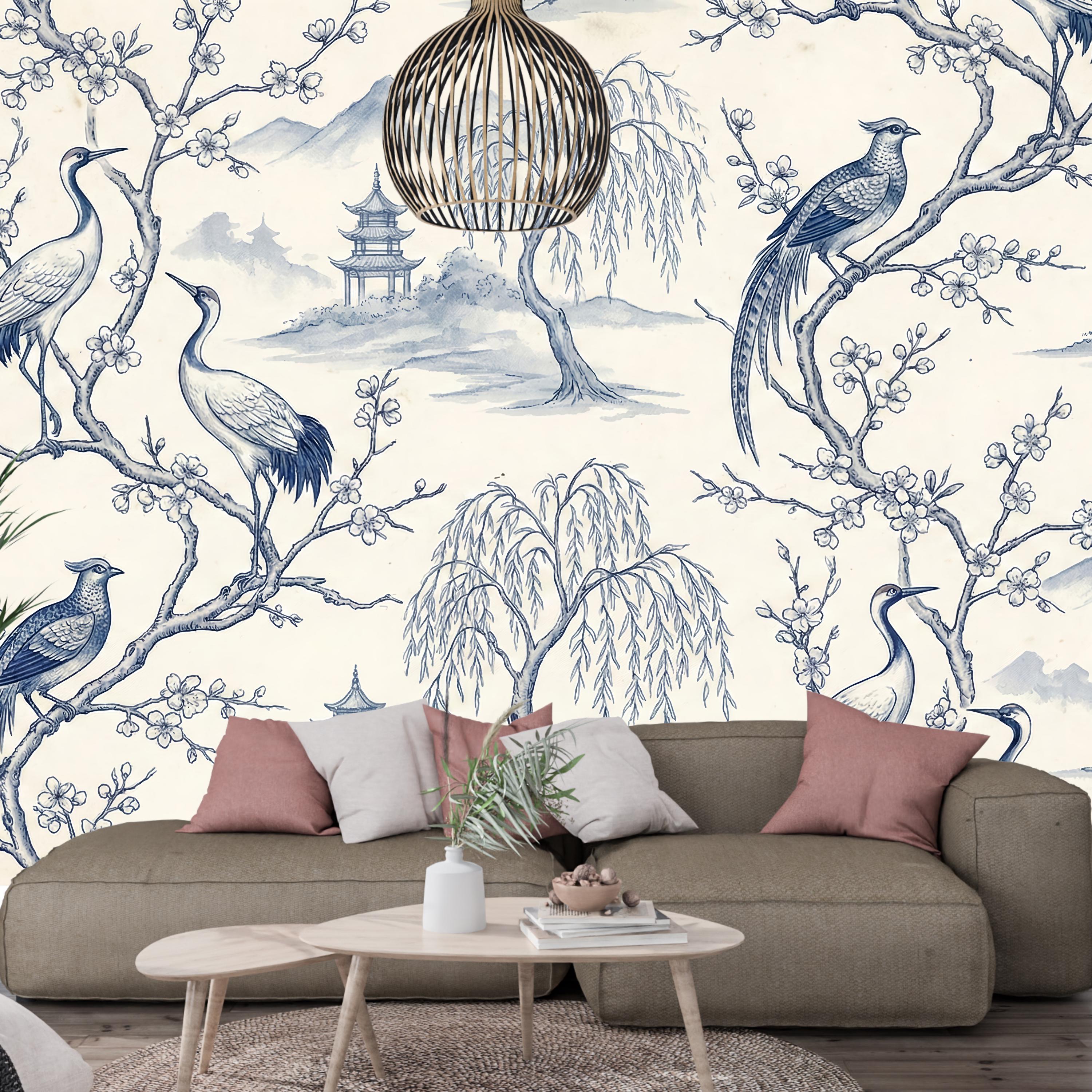 Transform your home into a peaceful retreat with this Chinoiserie-inspired crane wallpaper. Rendered in soothing shades of blue and white, this oriental-style mural features majestic cranes surrounded by delicate foliage — a classic nod to Asian aesthetics and nature’s quiet beauty.