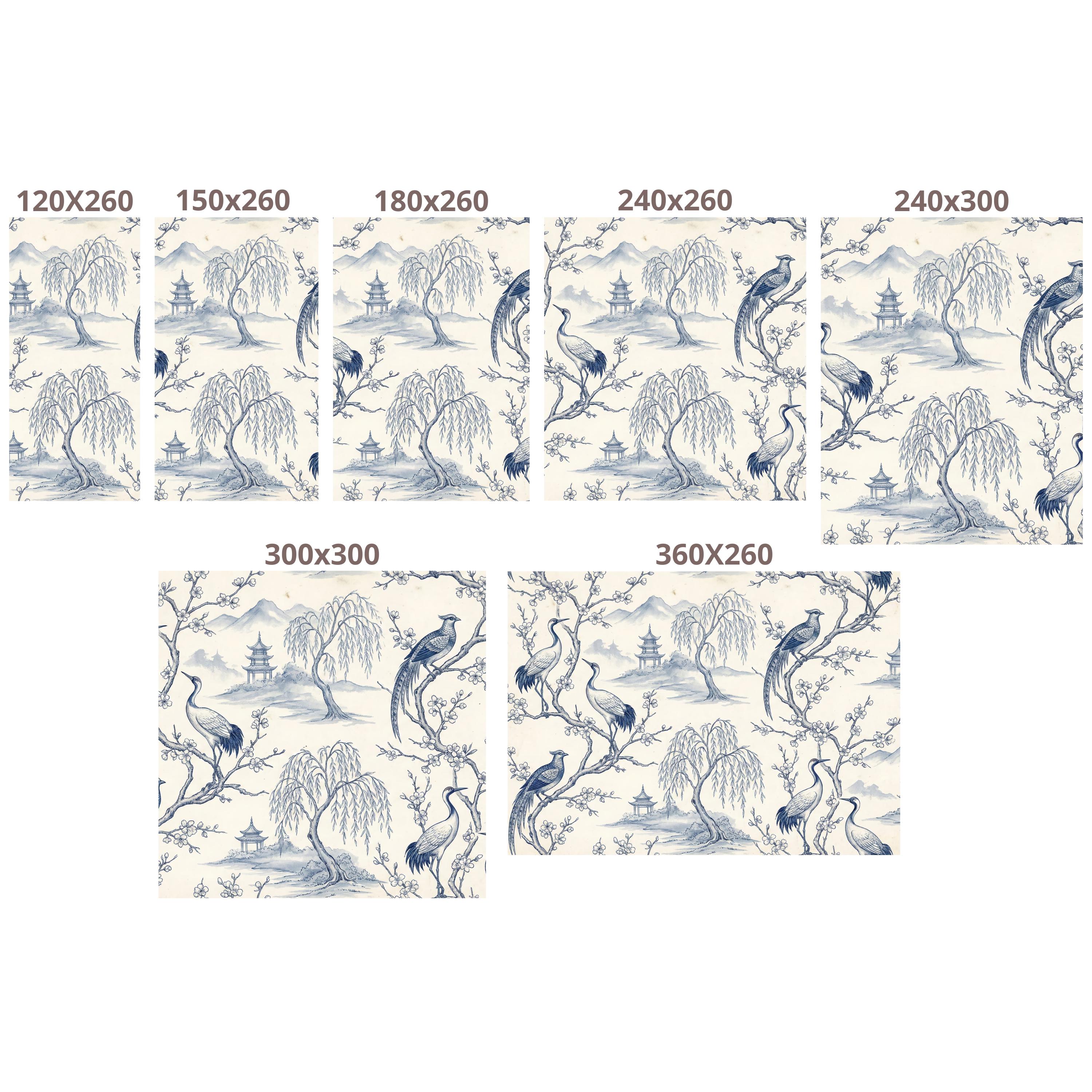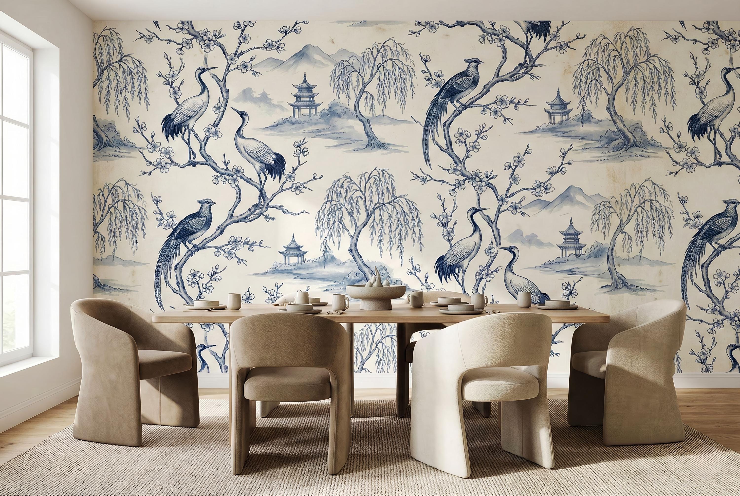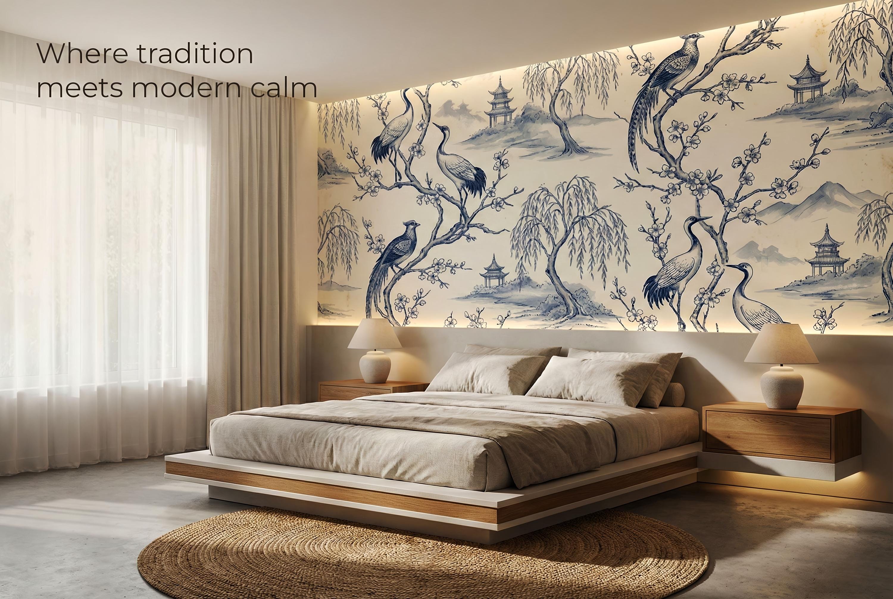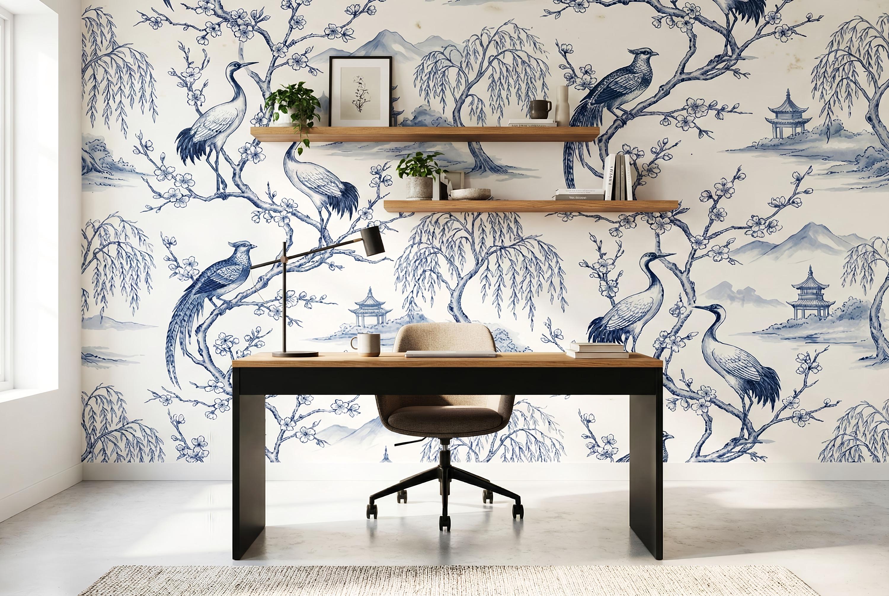 Transform your home into a peaceful retreat with this Chinoiserie-inspired crane wallpaper. Rendered in soothing shades of blue and white, this oriental-style mural features majestic cranes surrounded by delicate foliage — a classic nod to Asian aesthetics and nature’s quiet beauty.