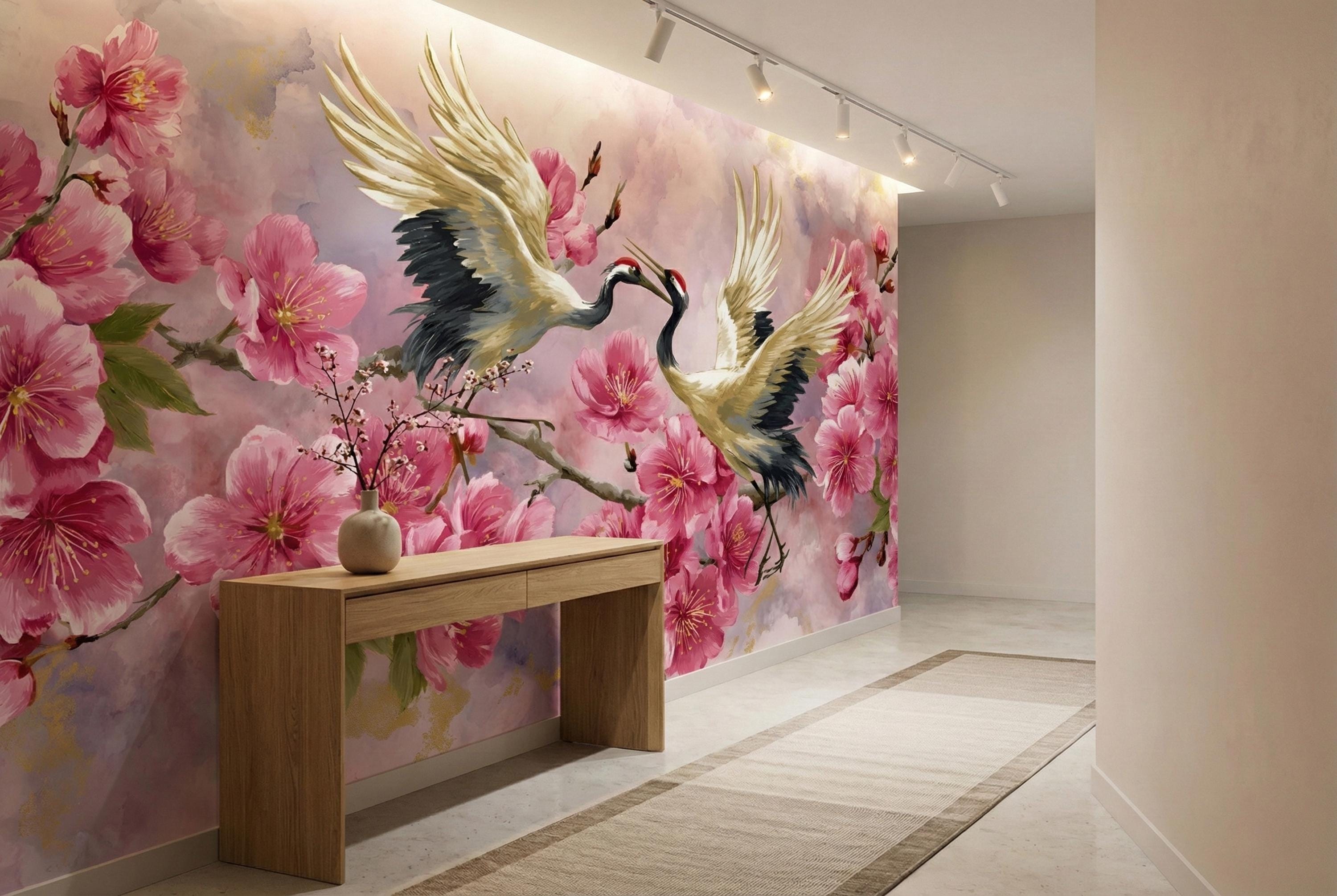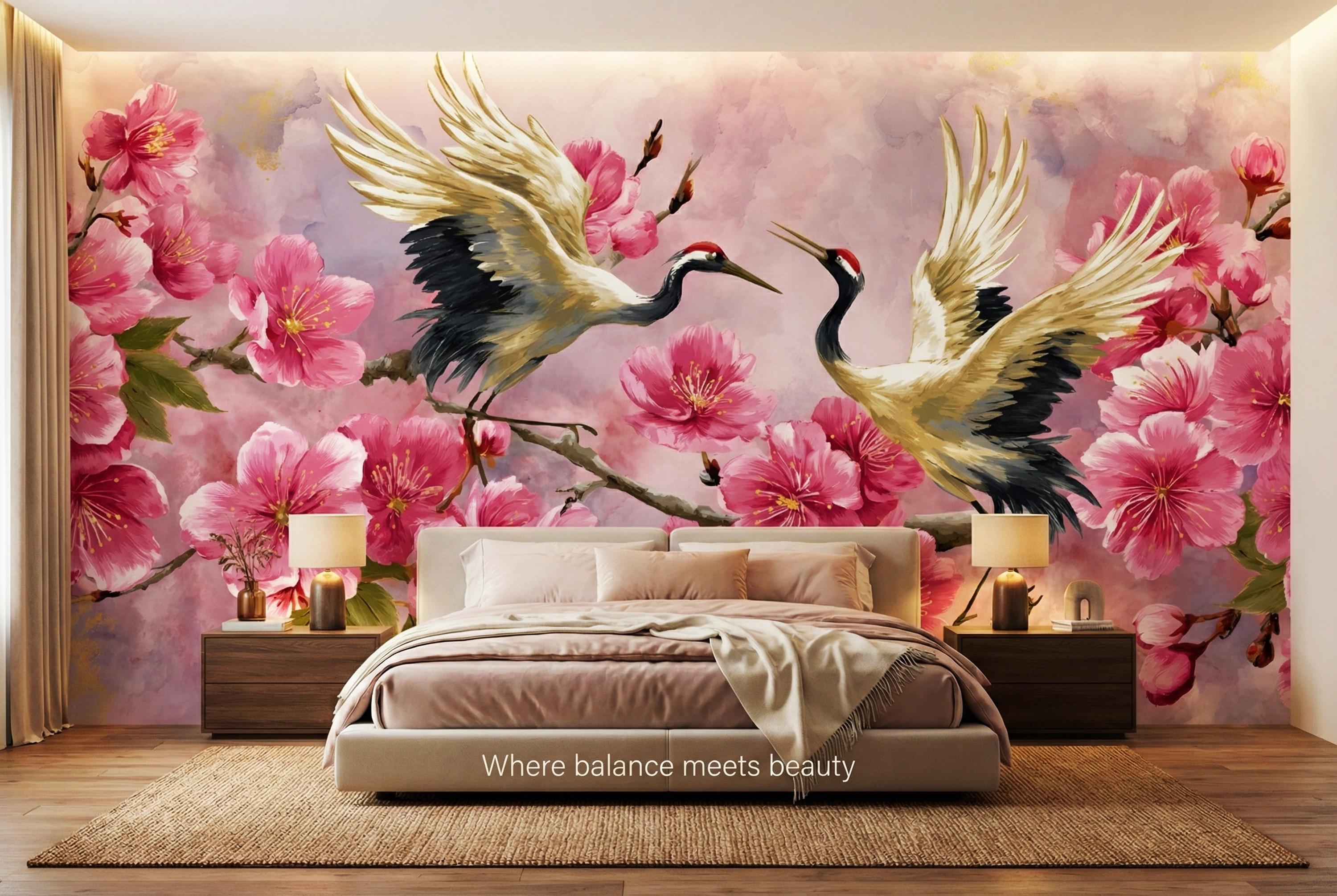 Graceful Japanese cranes meet soft cherry blossoms in a mural that feels balanced, elegant, and timeless. The composition is inspired by traditional Asian art, where every element has space to breathe and nothing feels rushed or overwhelming.