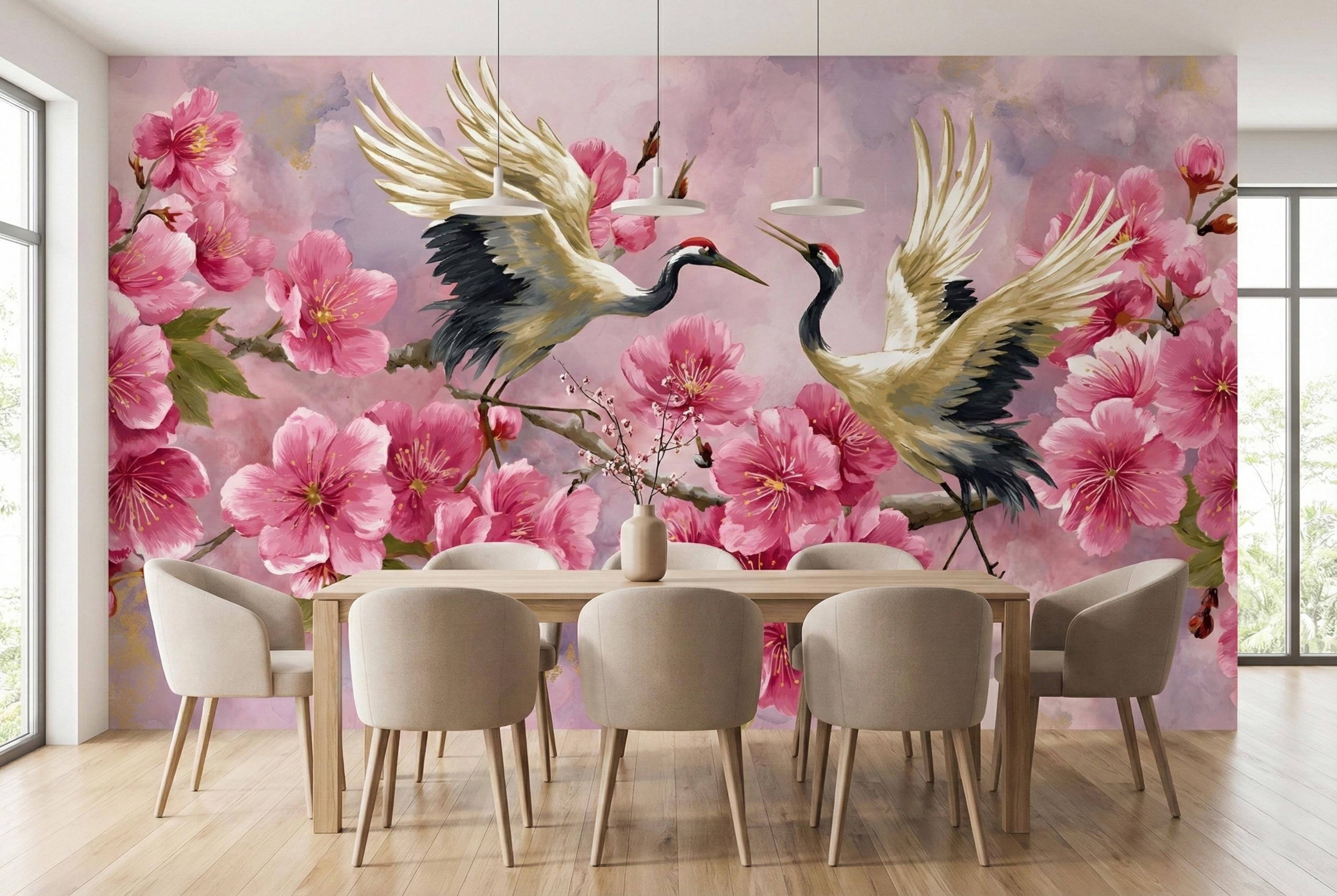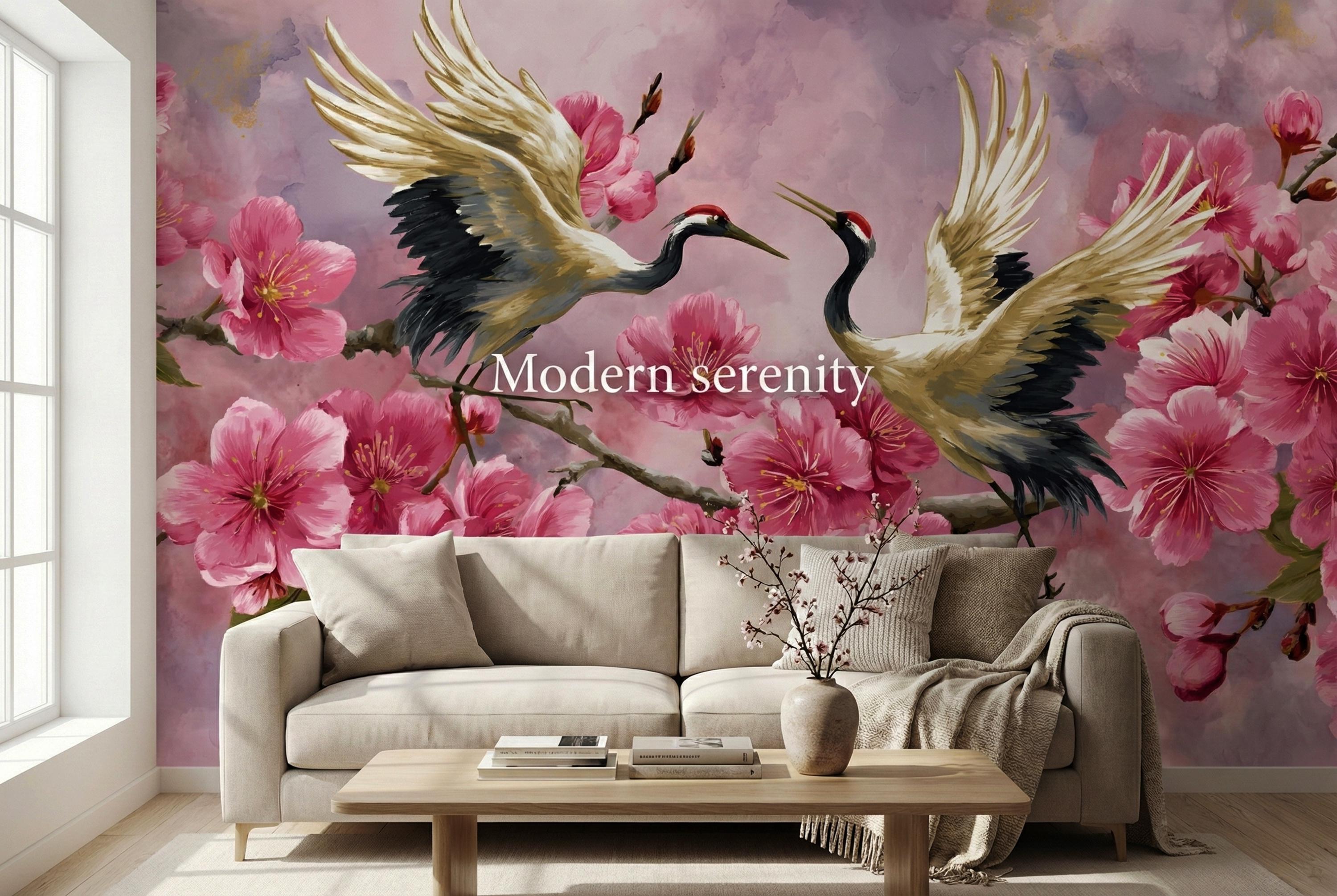 The cranes symbolize harmony and longevity, while the cherry blossoms add a gentle softness that instantly warms the room. The painterly details and subtle color transitions give this wallpaper a hand-painted look, creating an atmosphere that feels peaceful rather than decorative.