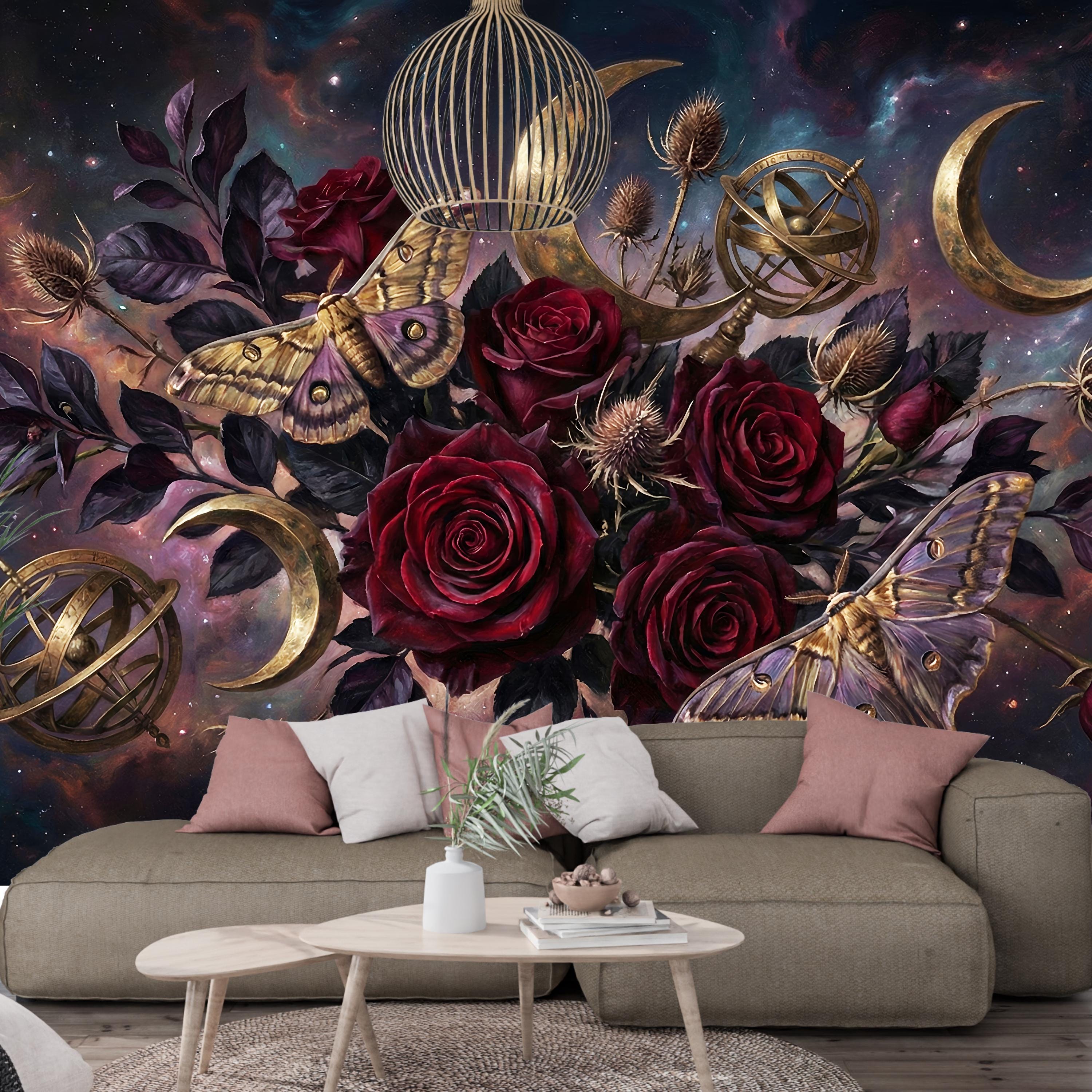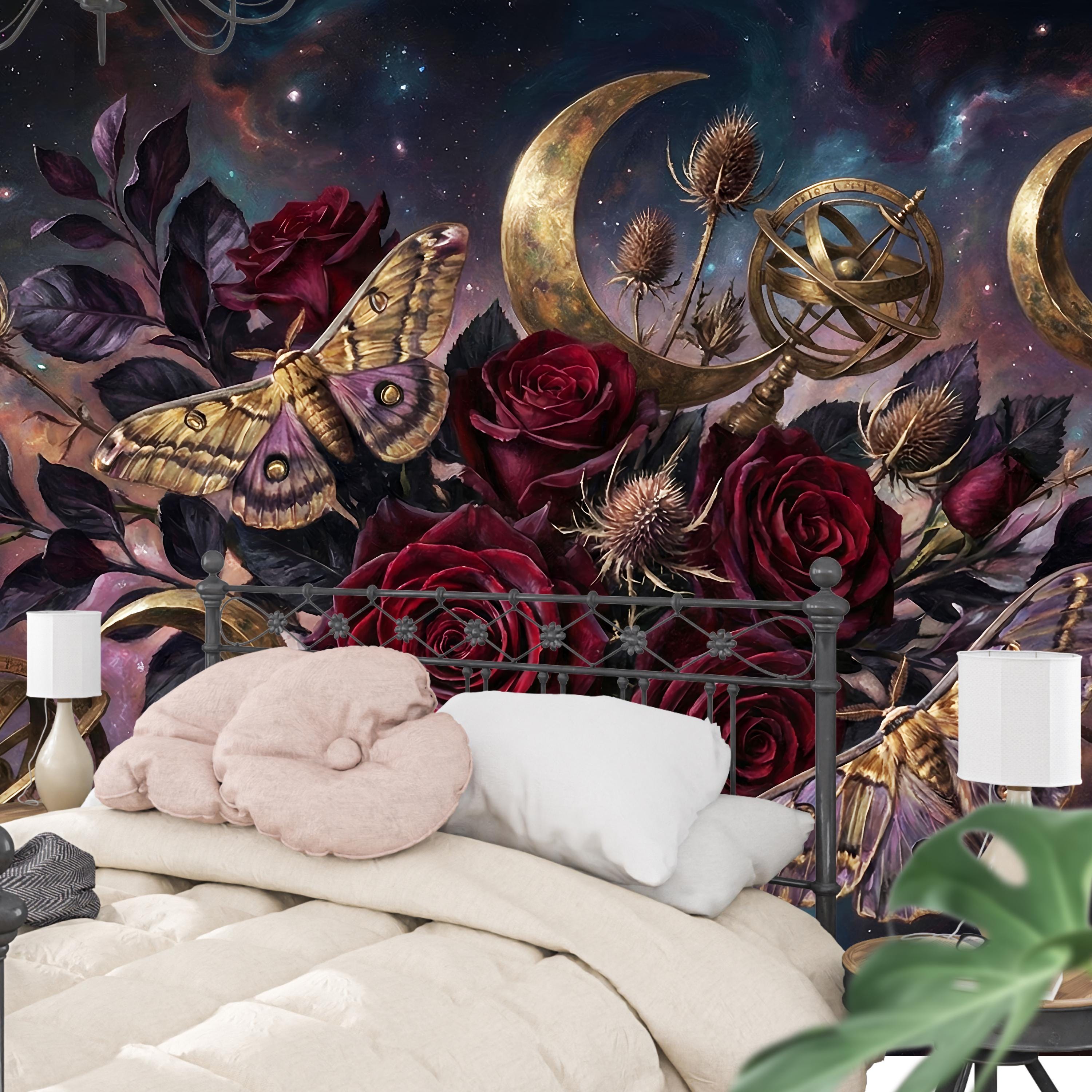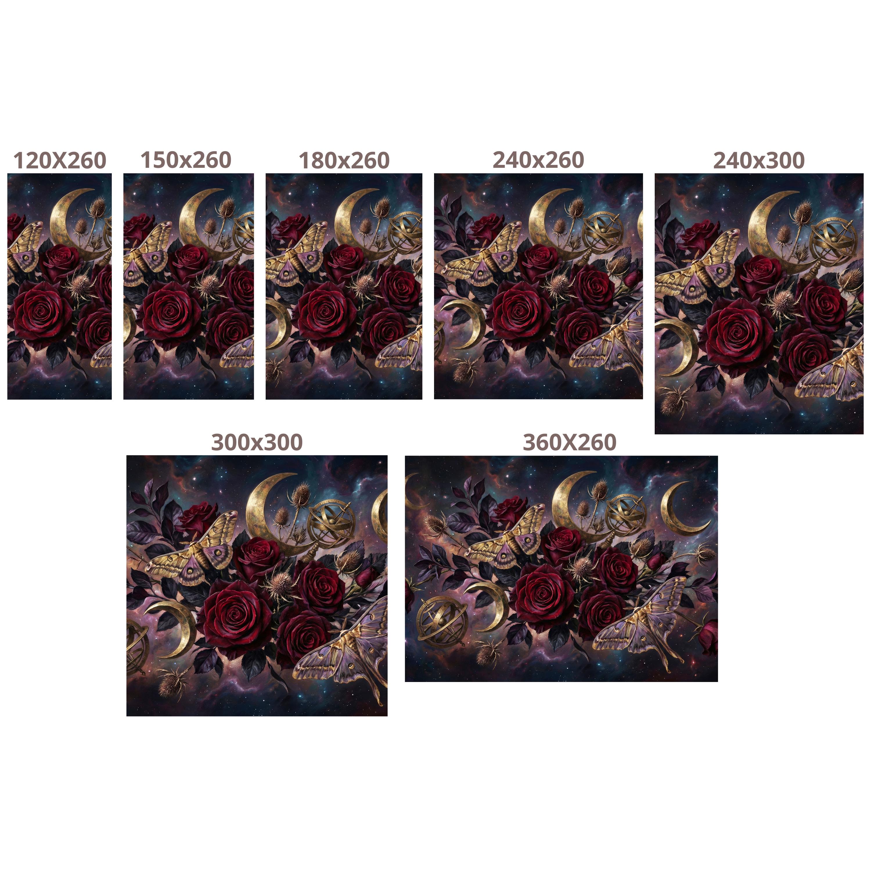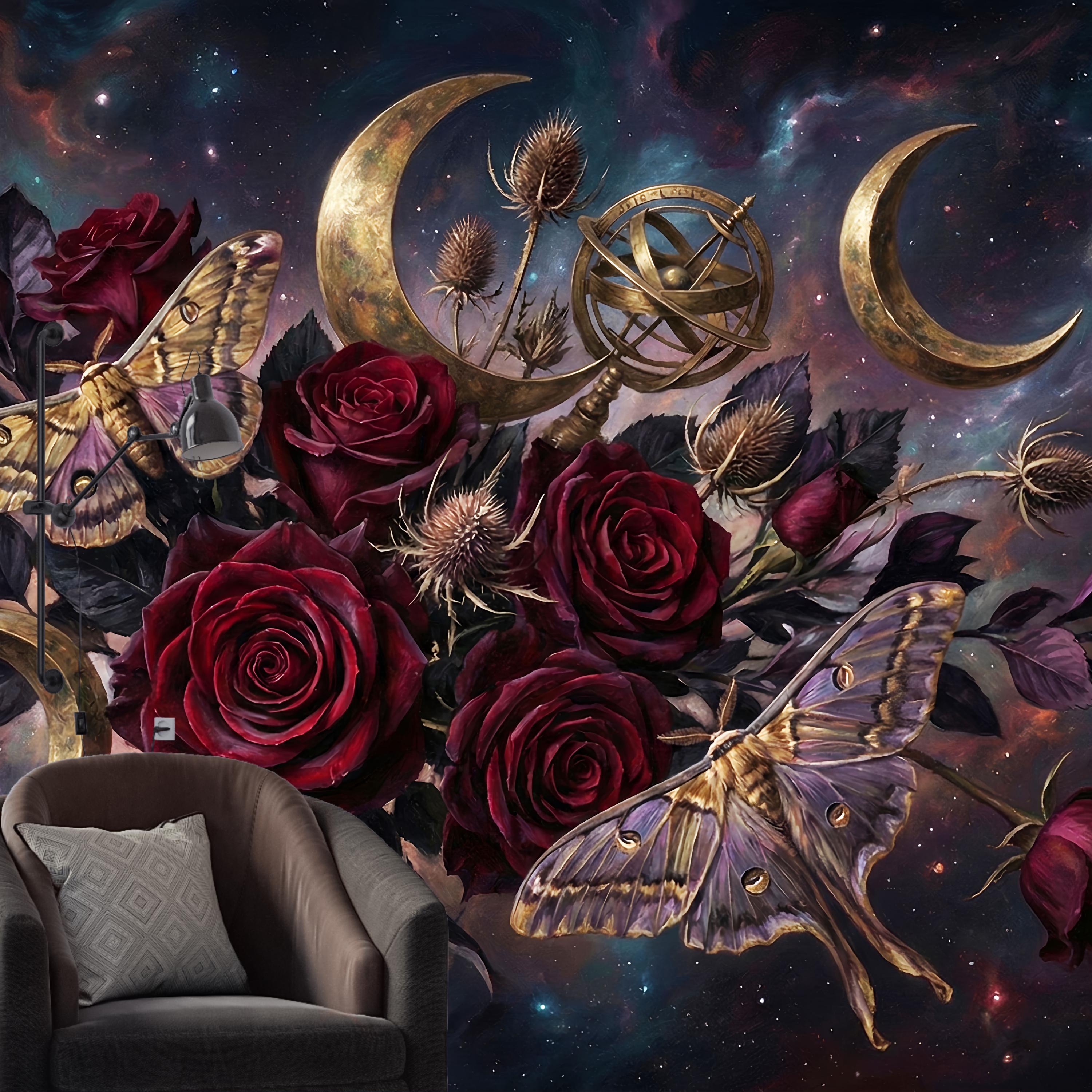 Deep burgundy roses, golden moths and crescent moons layered on a cosmic night sky create instant depth and emotional impact.
