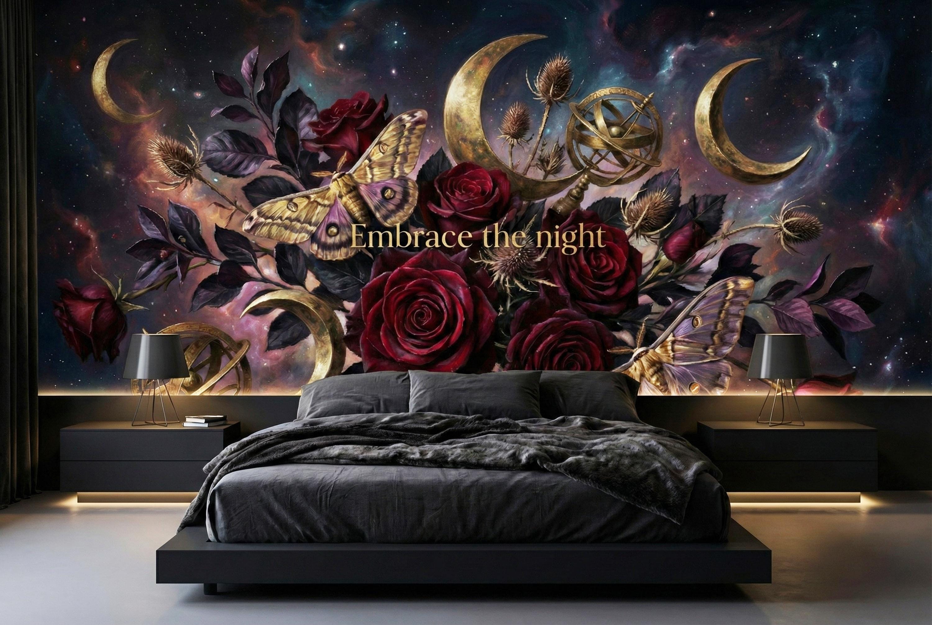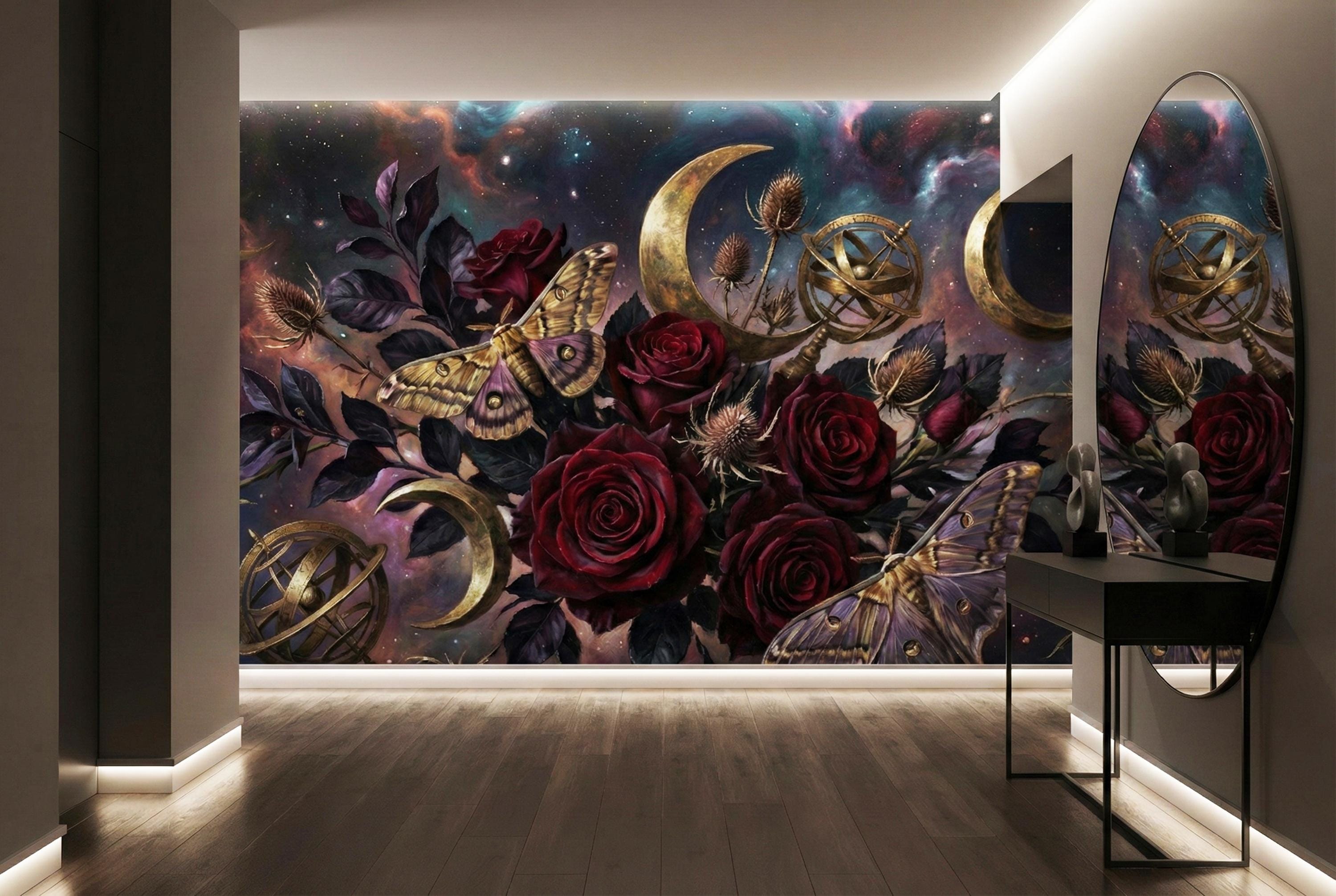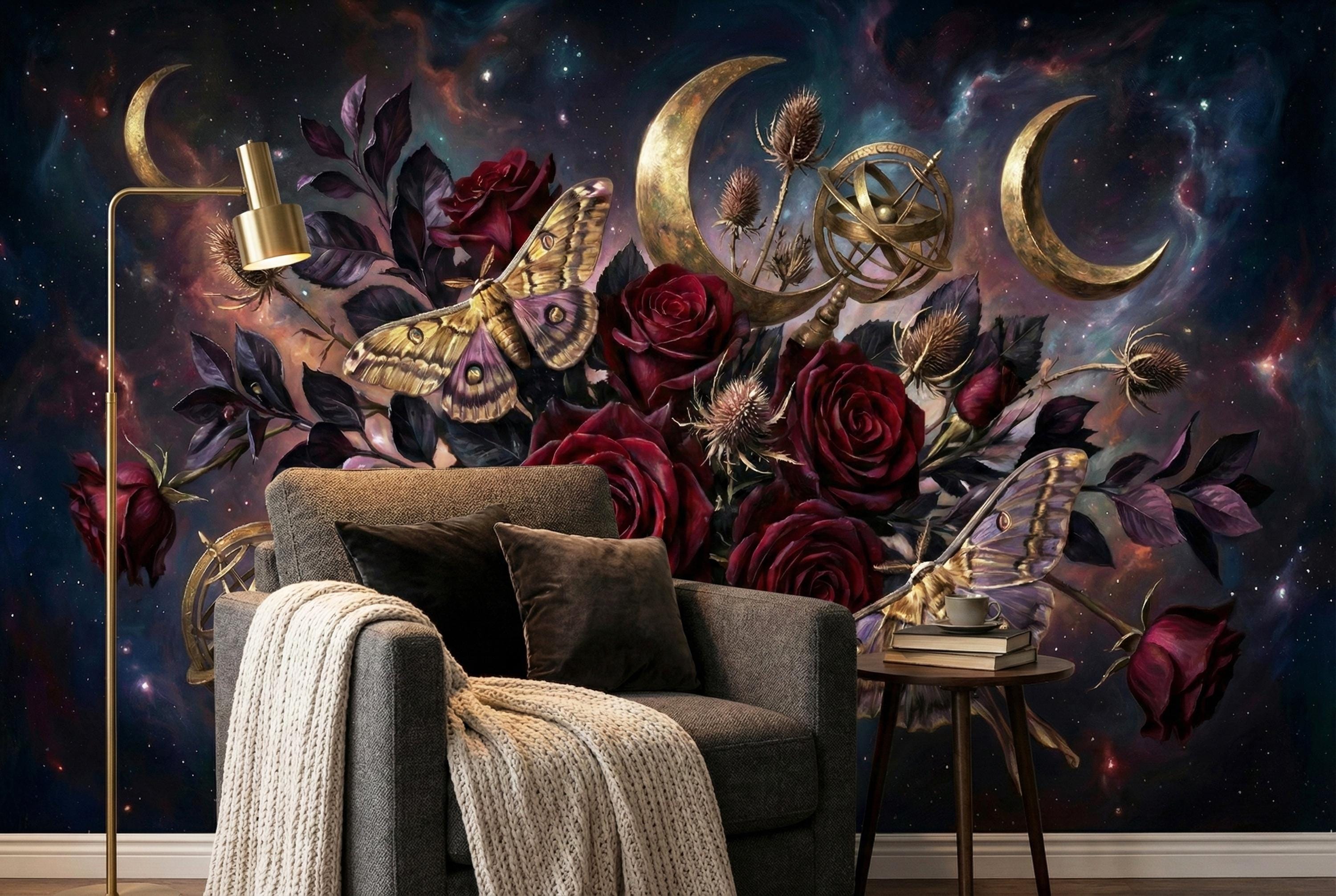 Deep burgundy roses, golden moths and crescent moons layered on a cosmic night sky create instant depth and emotional impact.