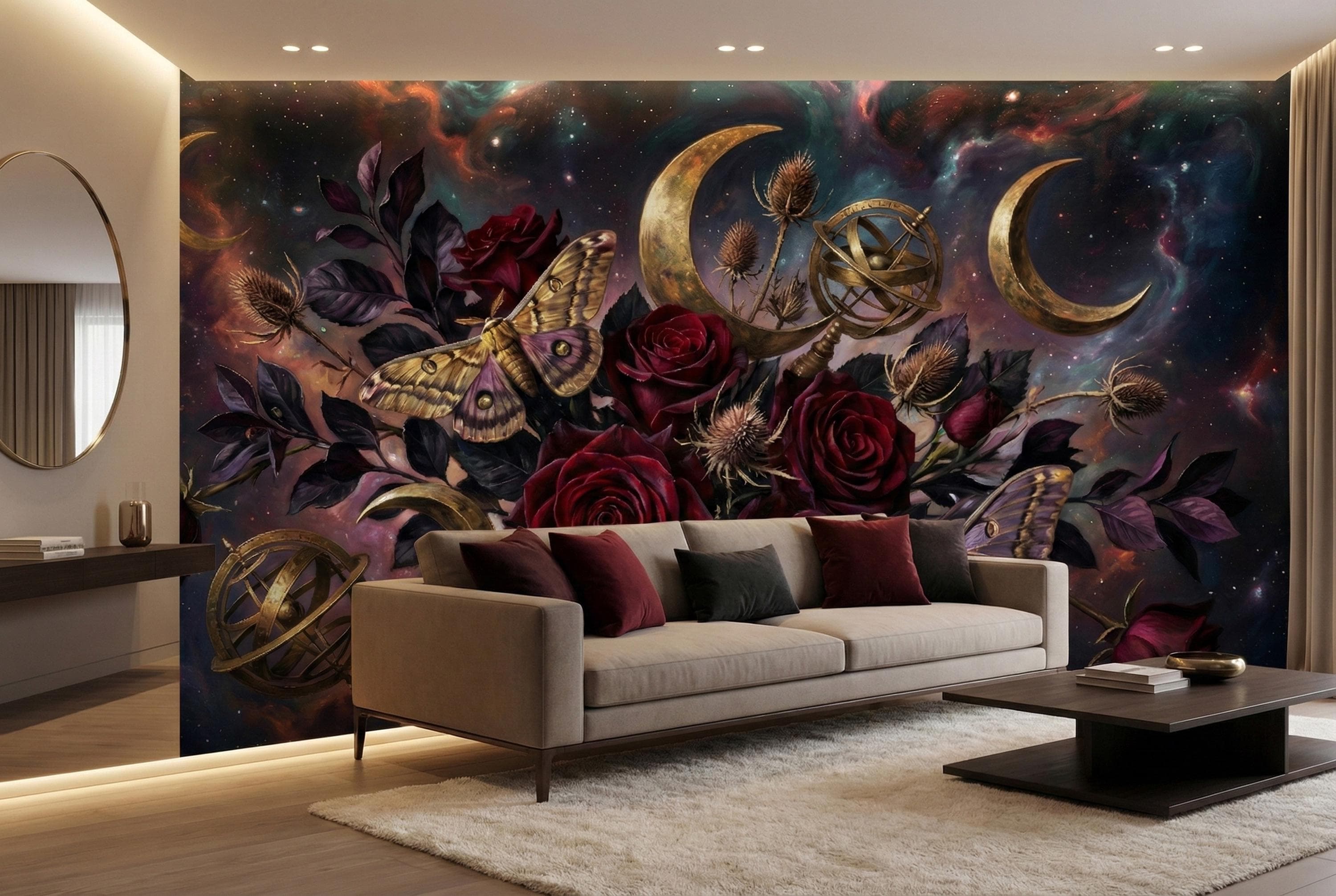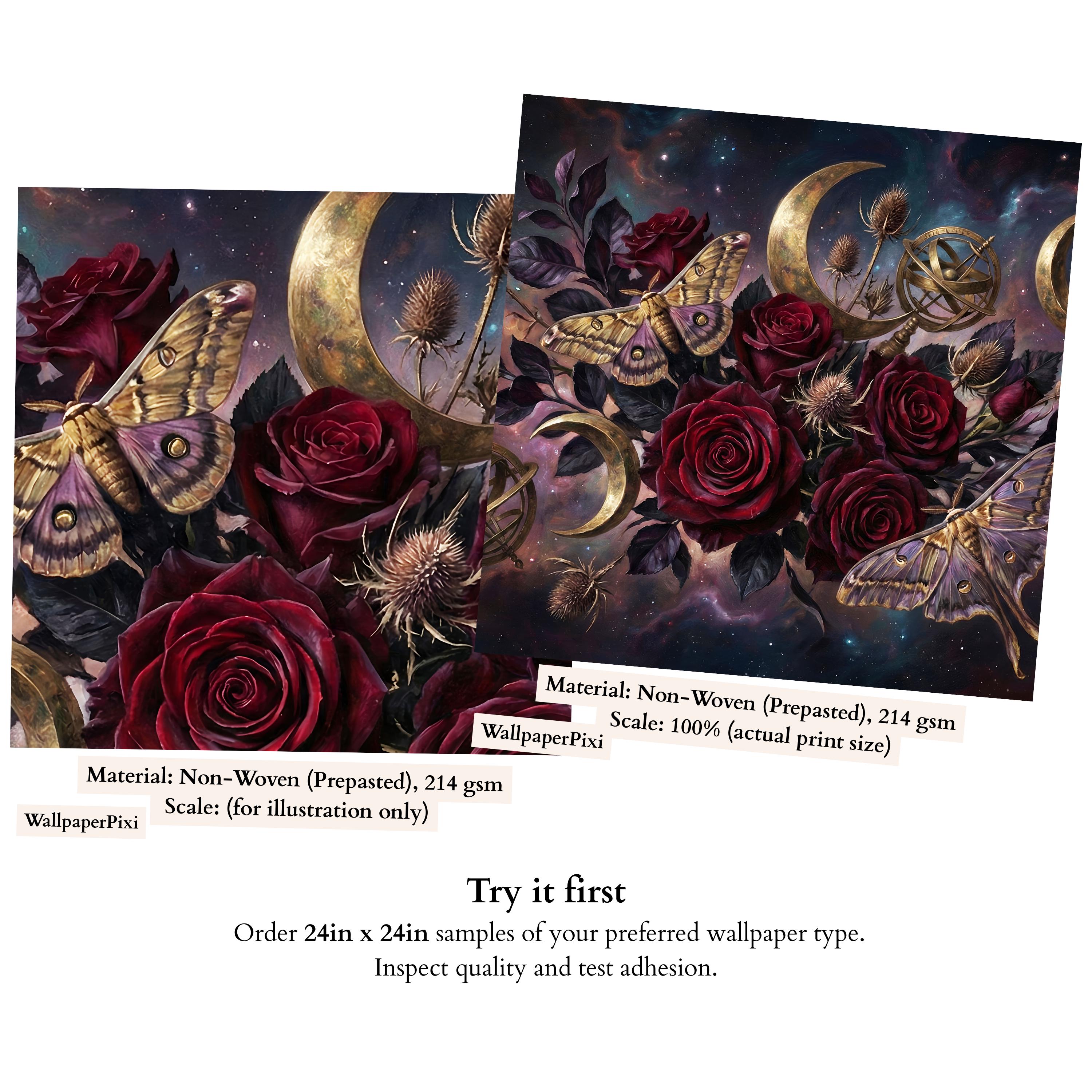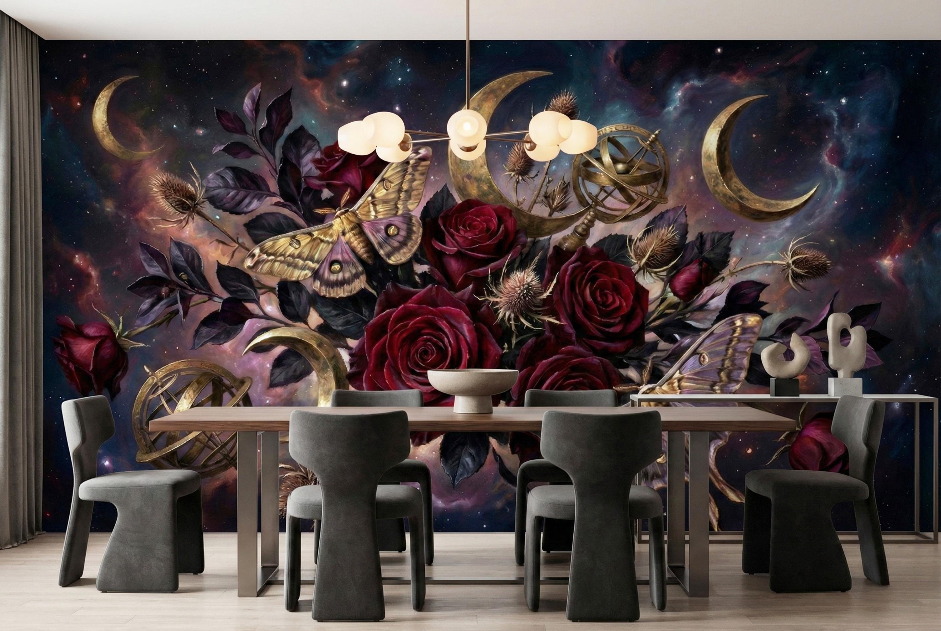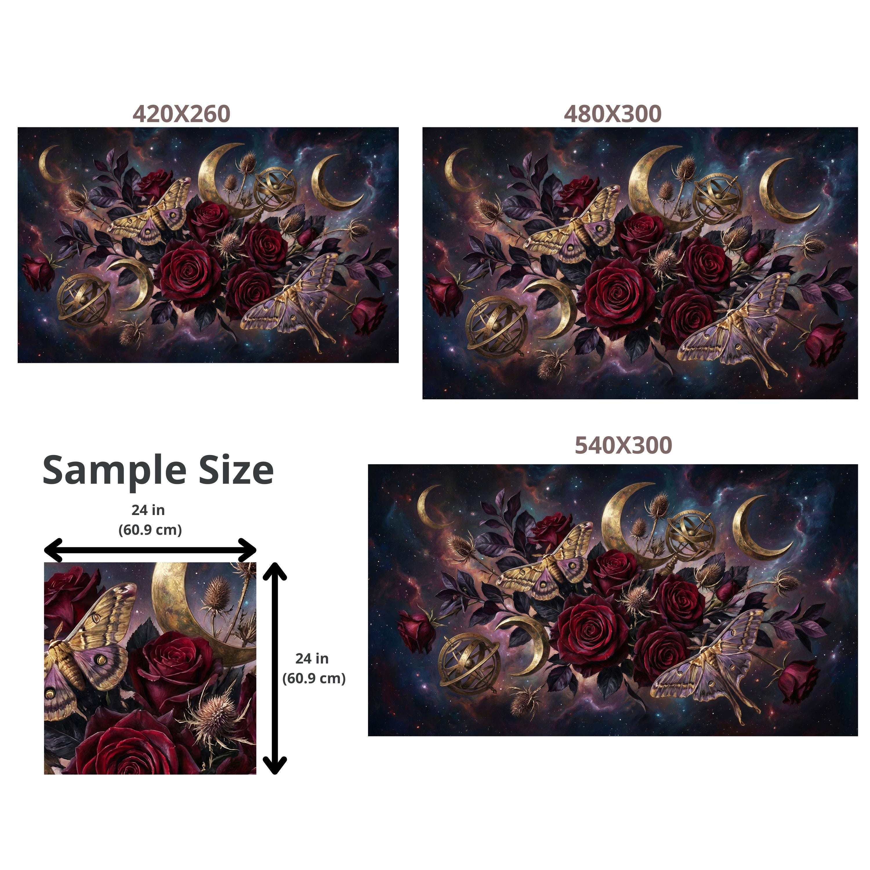 Deep burgundy roses, golden moths and crescent moons layered on a cosmic night sky create instant depth and emotional impact.