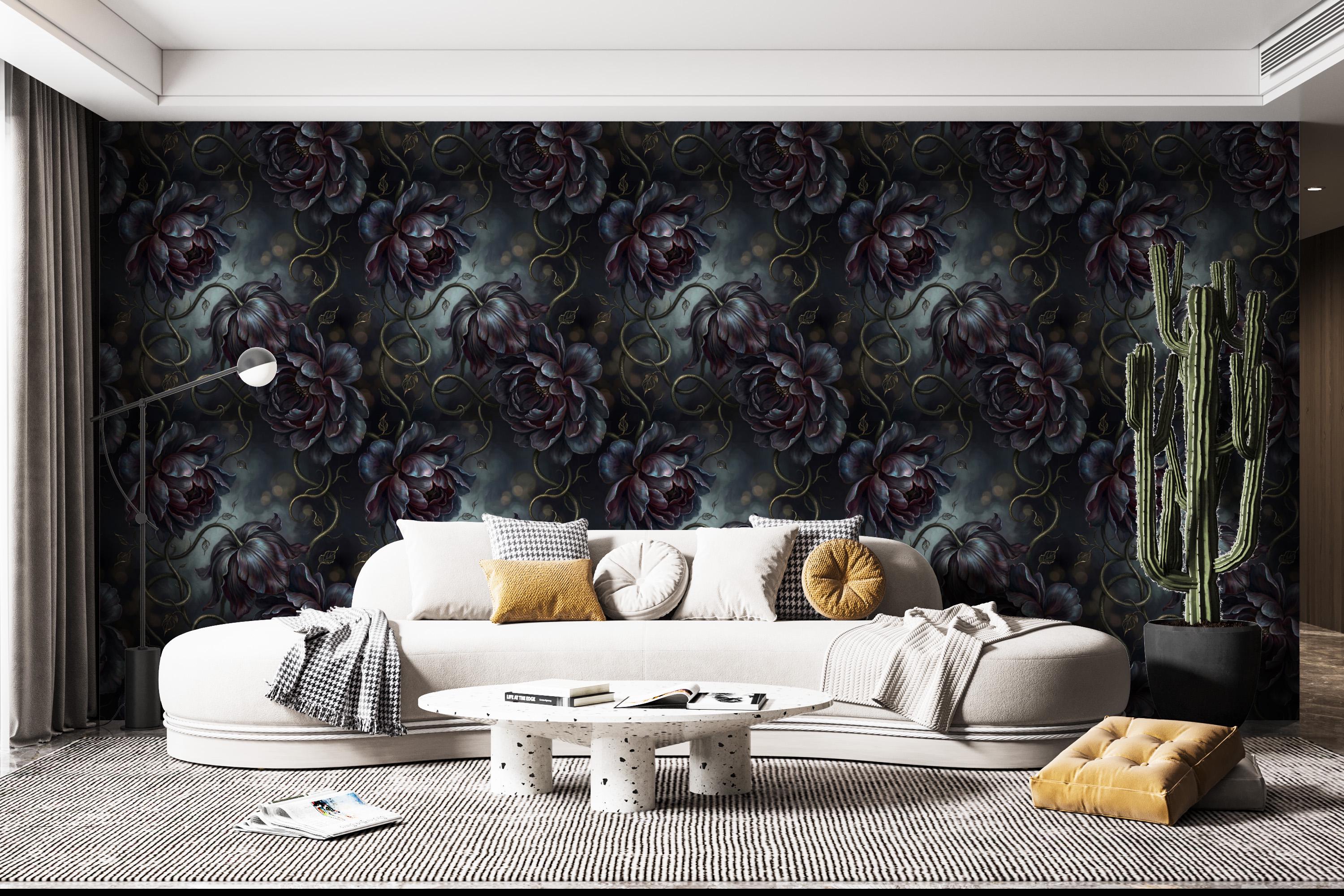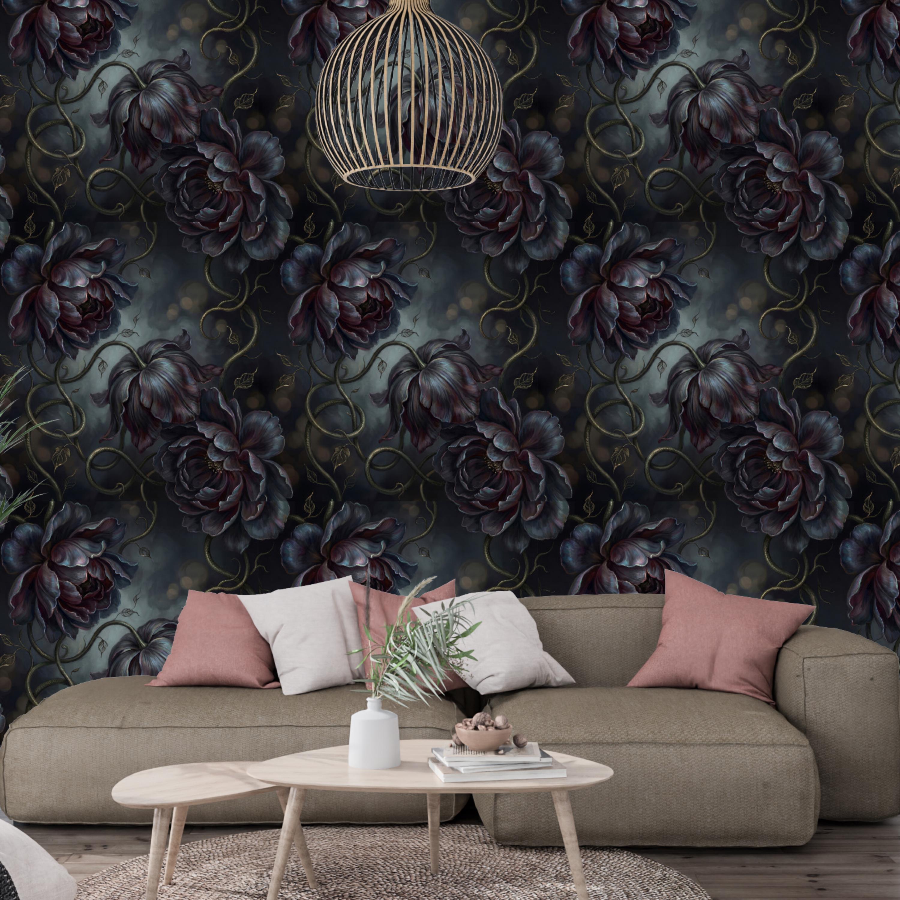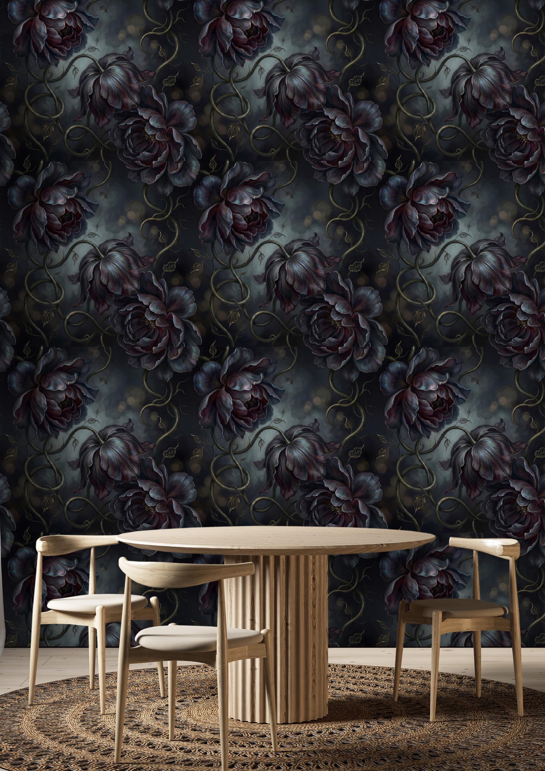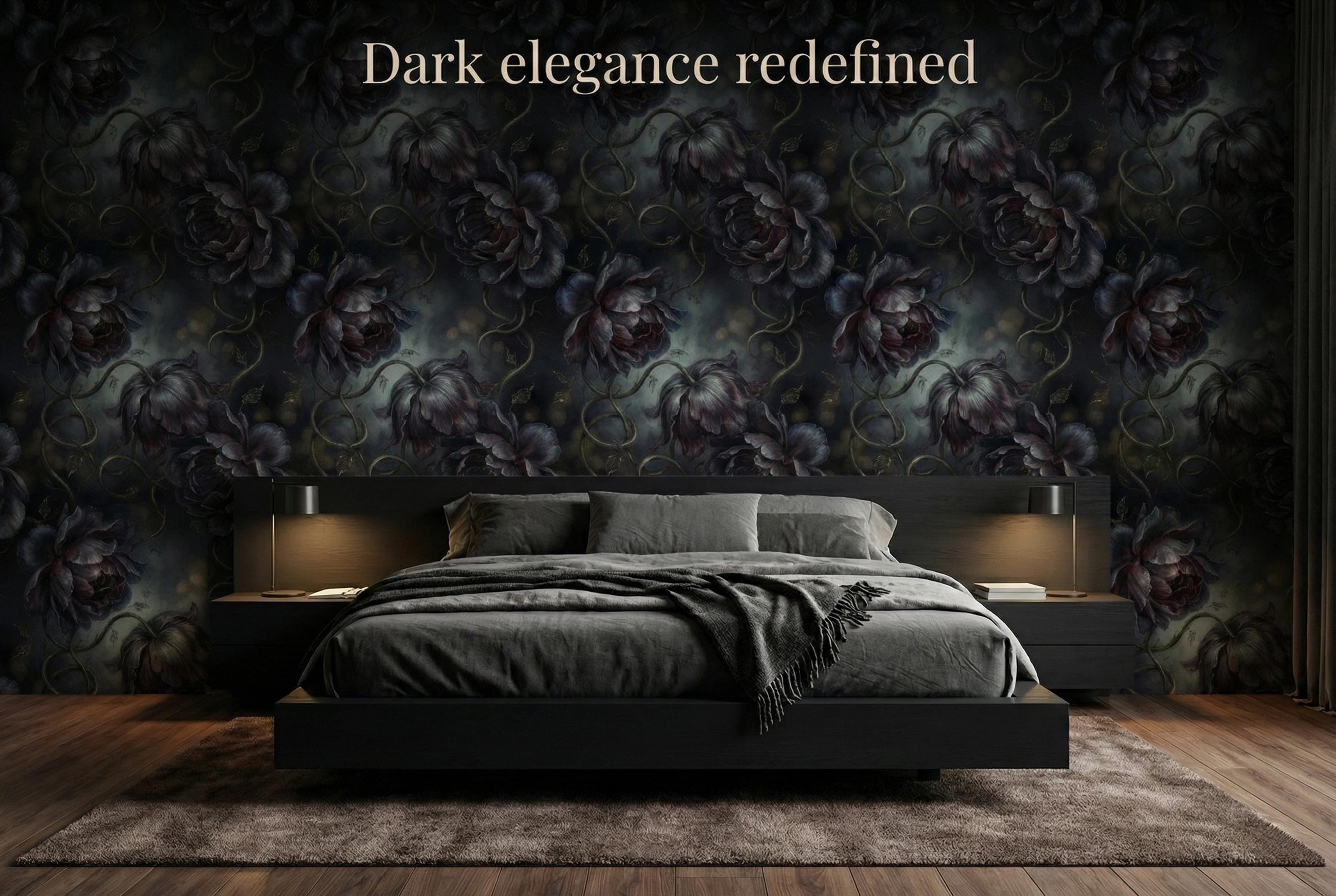 This dark floral wallpaper captures the haunting beauty of twilight gardens—lush blossoms unfolding against a shadowed backdrop, entwined with flowing stems and subtle metallic accents. Rich charcoal tones, deep plum petals, and muted highlights create a design that feels both romantic and powerful.