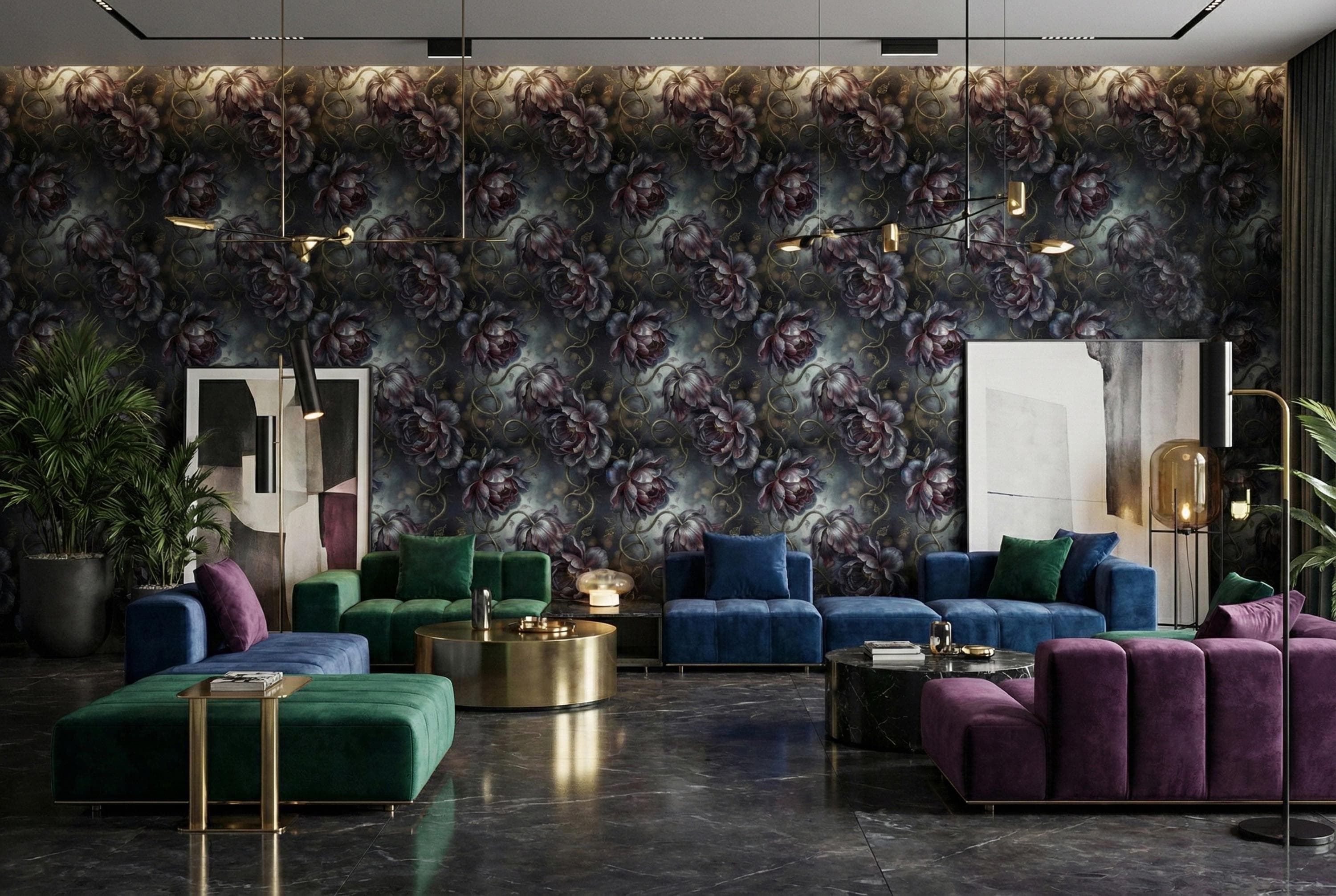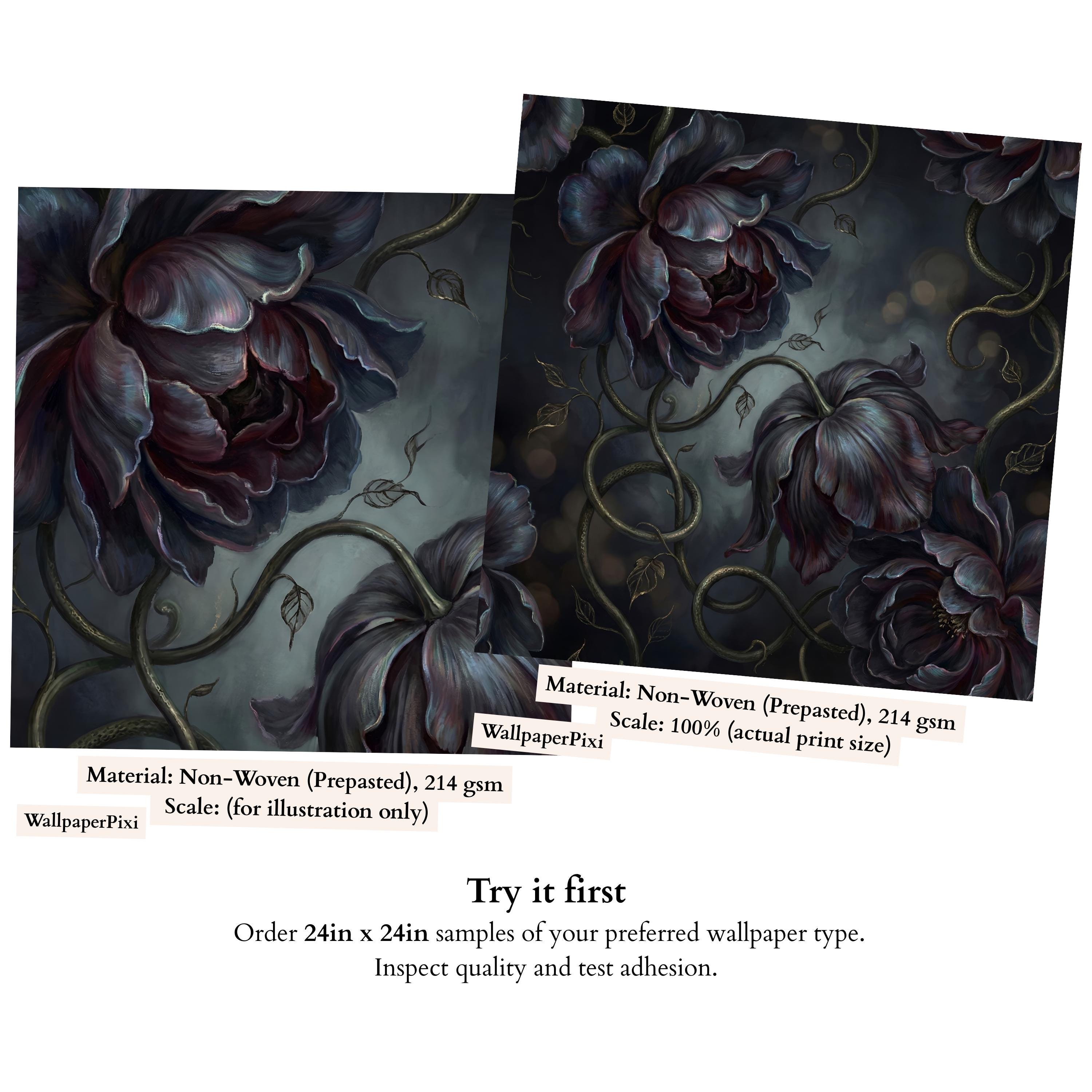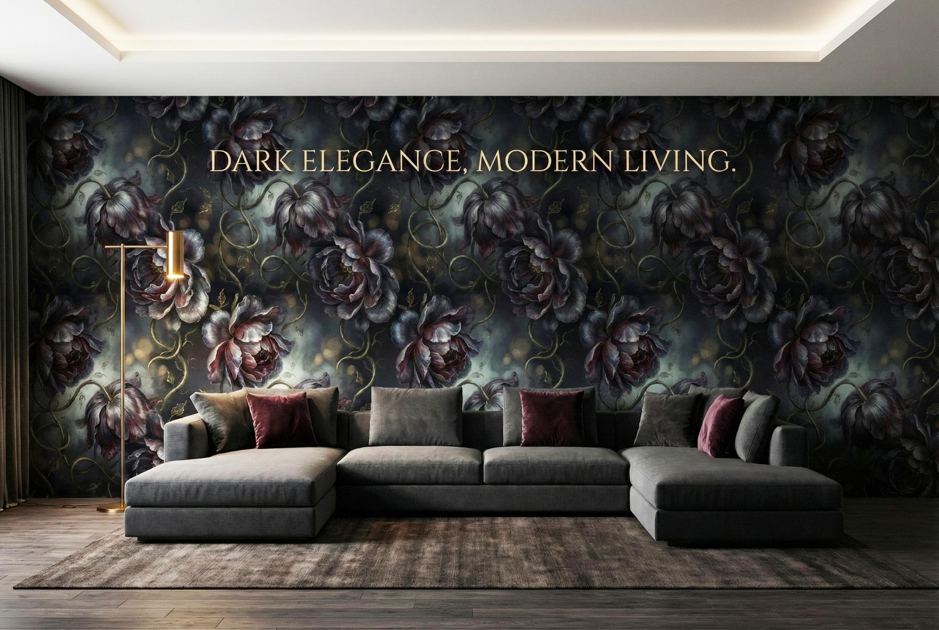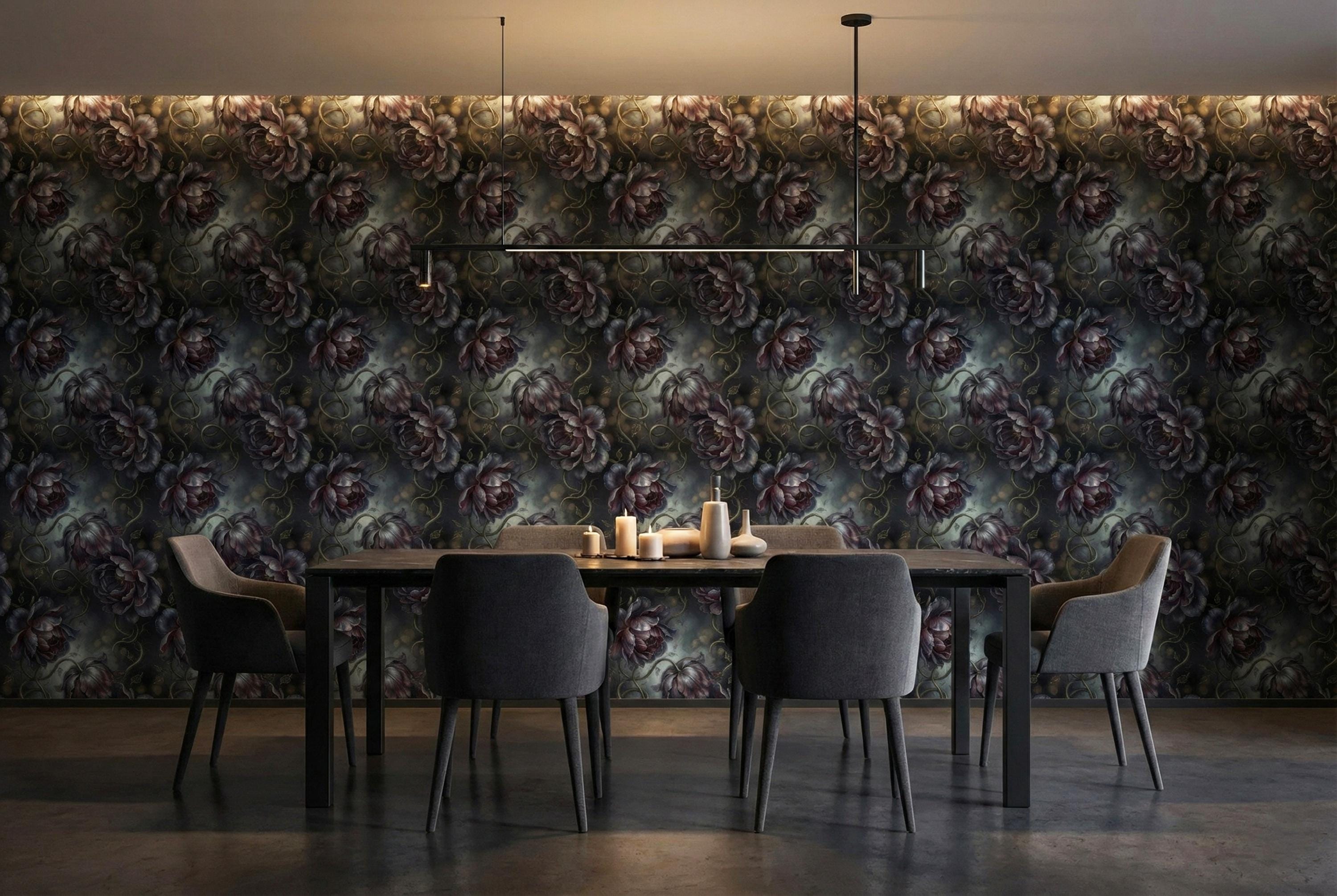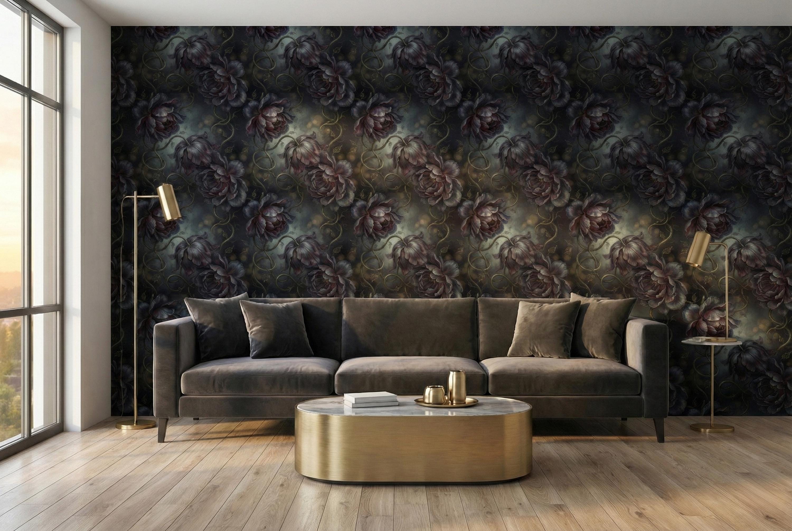 This dark floral wallpaper captures the haunting beauty of twilight gardens—lush blossoms unfolding against a shadowed backdrop, entwined with flowing stems and subtle metallic accents. Rich charcoal tones, deep plum petals, and muted highlights create a design that feels both romantic and powerful.