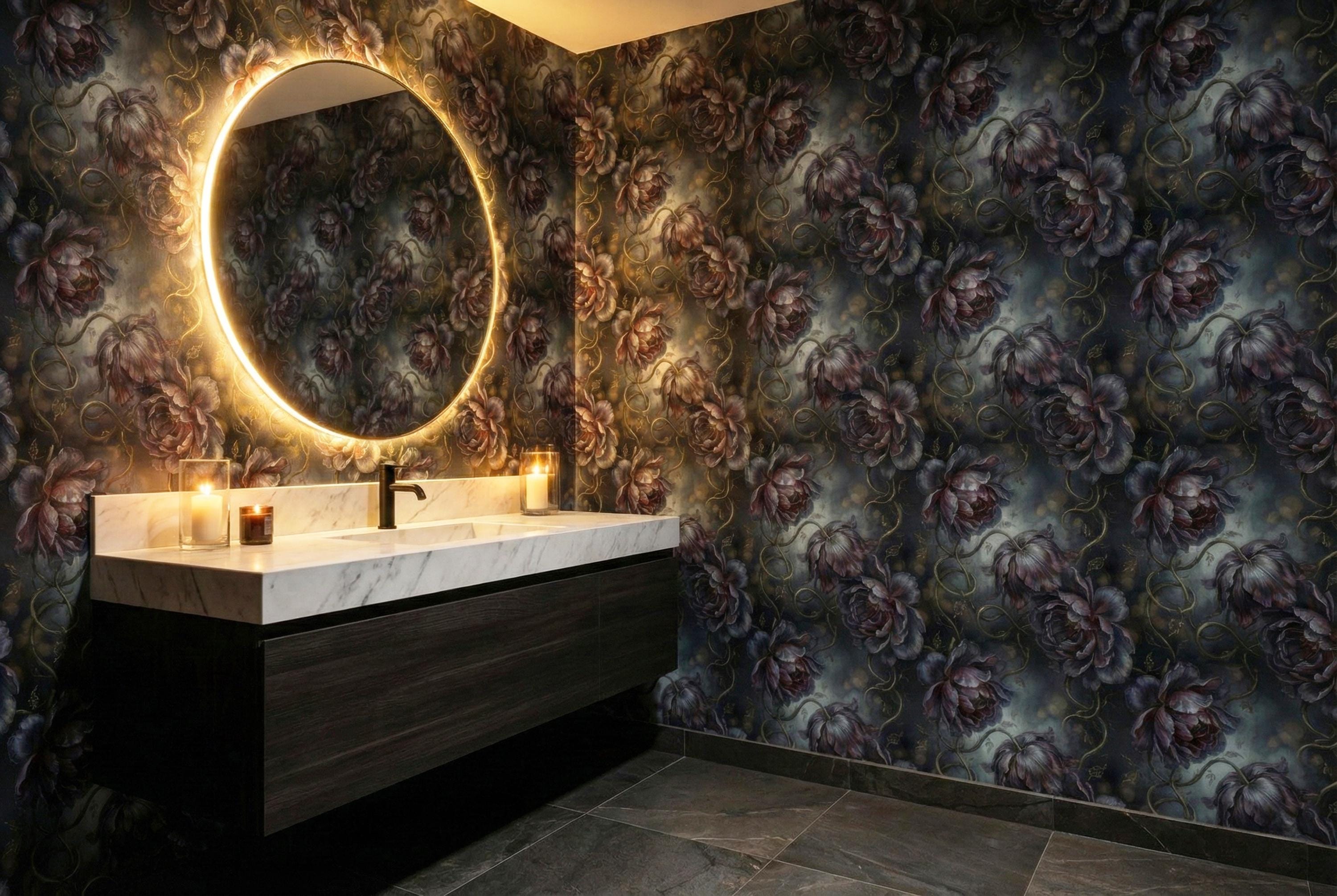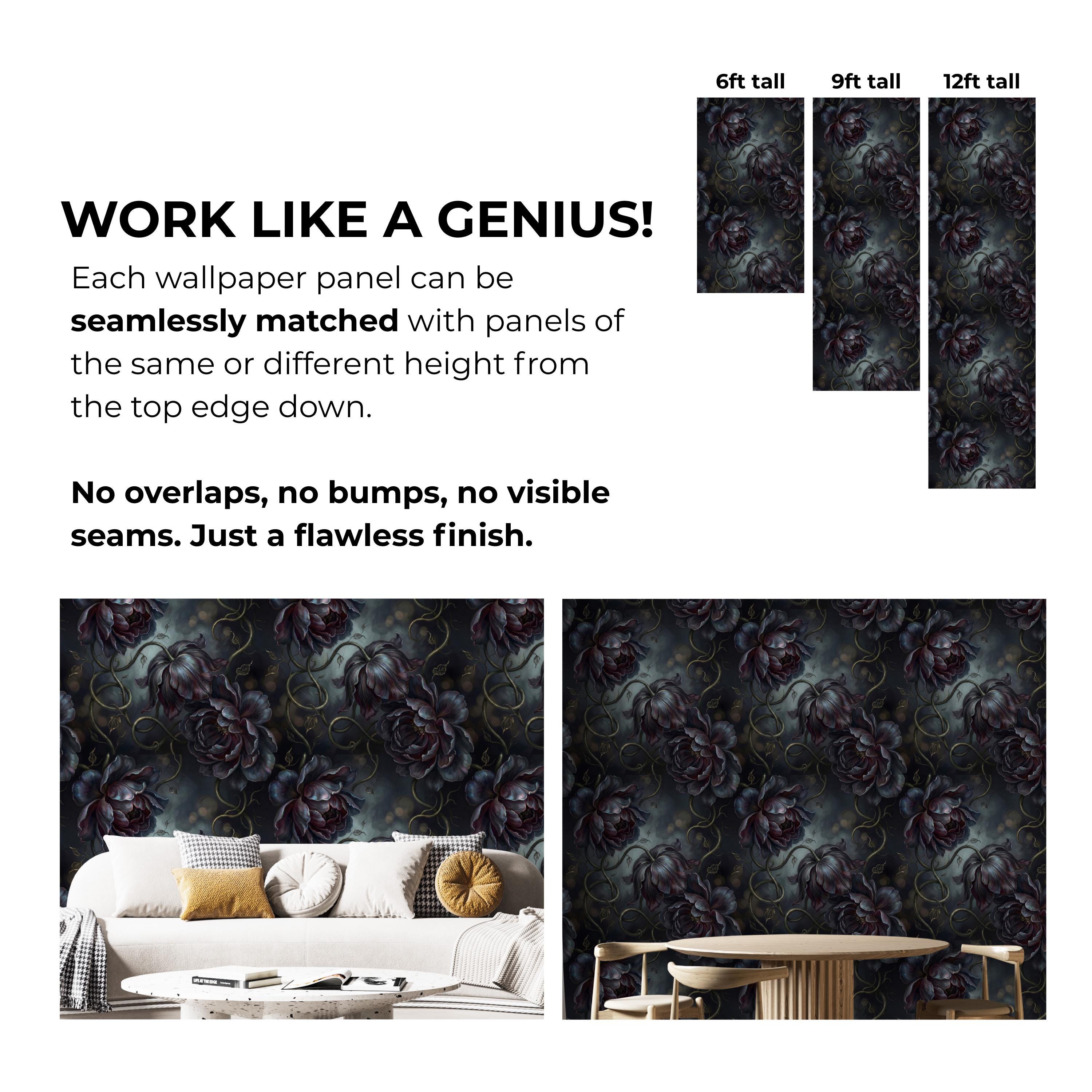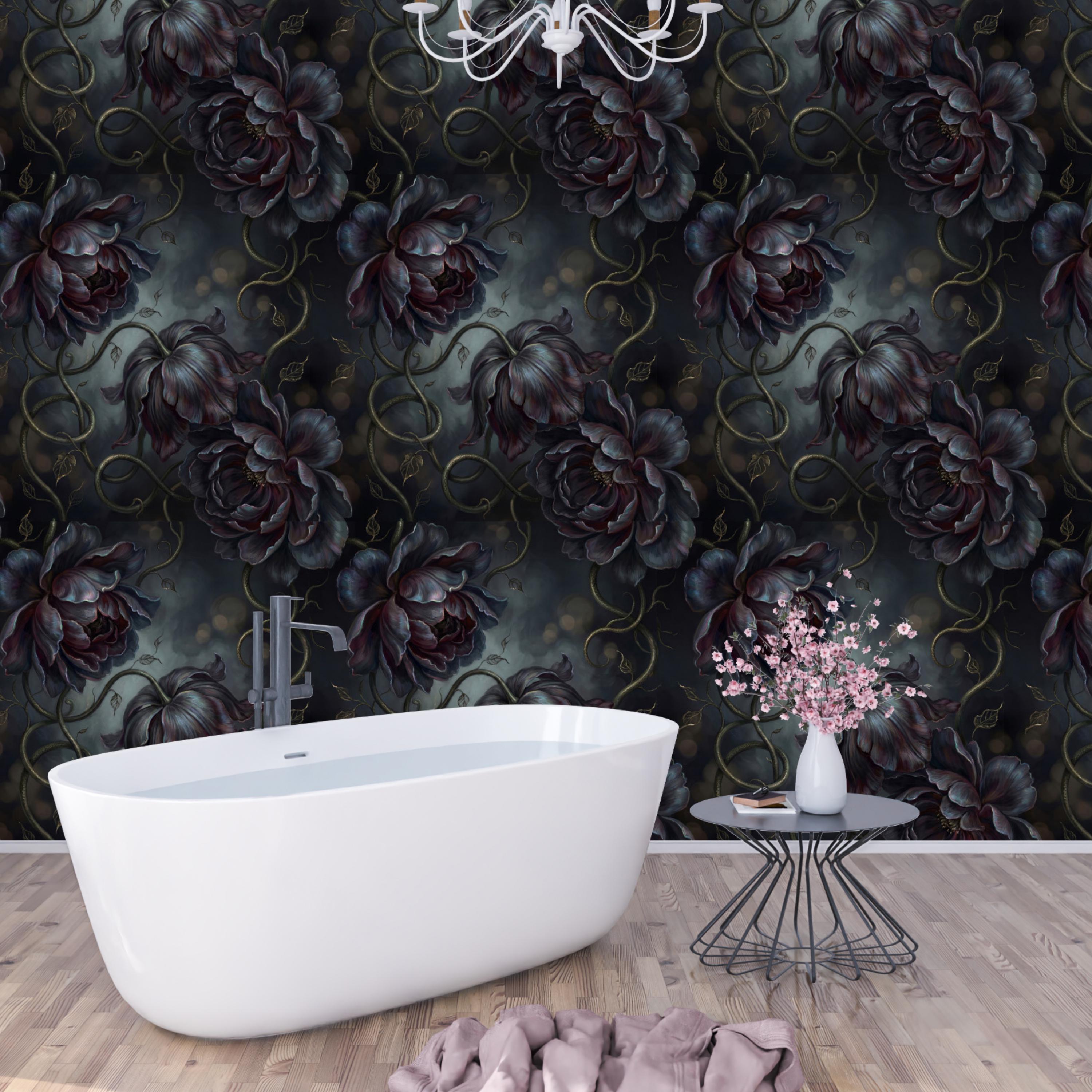 This wallpaper is ideal for those who love dark floral décor, gothic elegance, and statement wall design. A striking choice for refined homes, creative spaces, or anyone drawn to dramatic beauty.