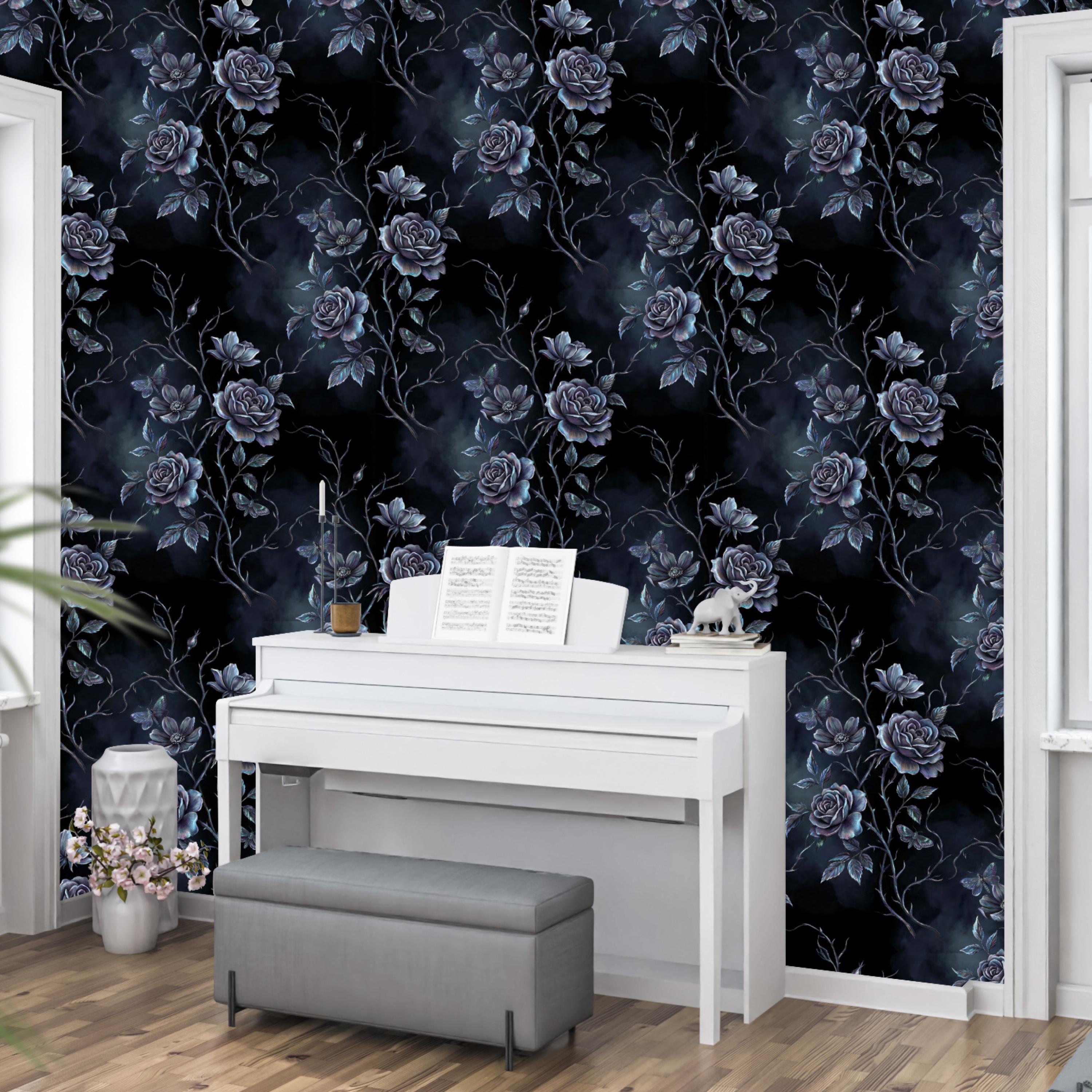 Ideal for those who appreciate dark romantic decor, gothic botanical elements, and expressive interiors, this wallpaper adds depth and character without overpowering the space. The floral composition feels timeless and dramatic, making it suitable for rooms designed to feel intimate, creative, and visually rich.