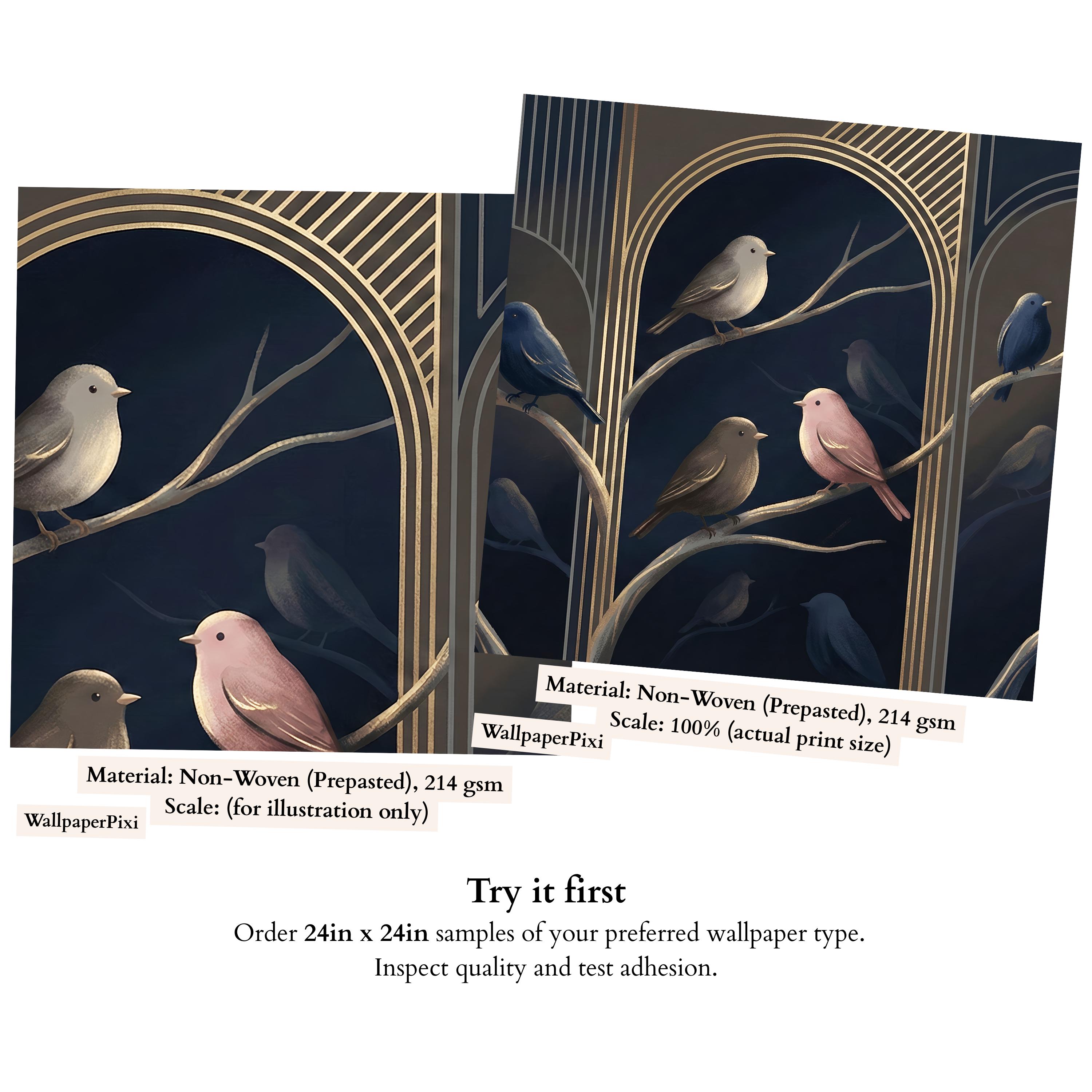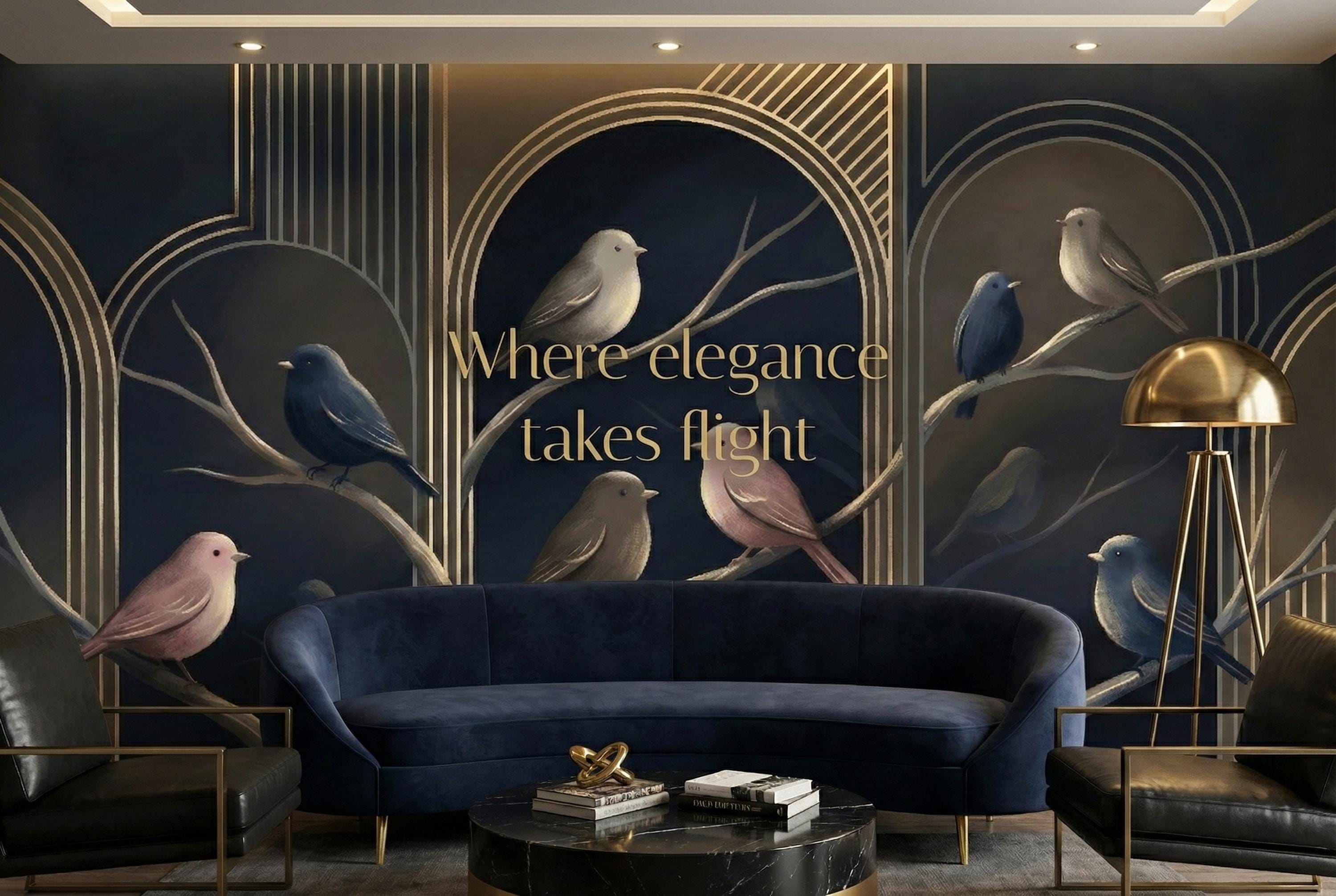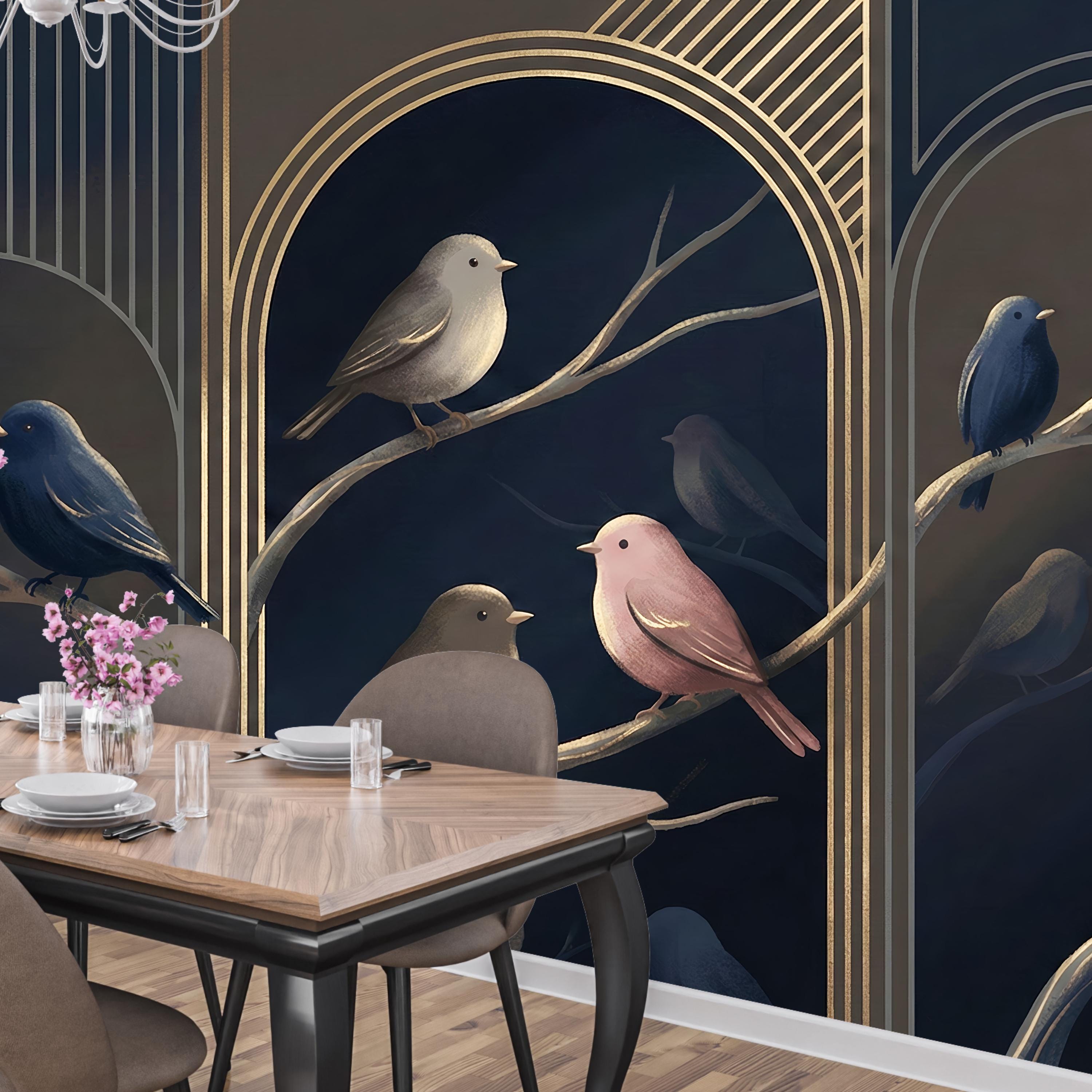 Bring the elegance of a moonlit forest into your home with our Midnight Birds Art Deco Wallpaper Mural. Set against a deep navy blue background and adorned with golden arches, this design captures the serene beauty of perched birds in soft blush, taupe, and sapphire tones. Perfect for lovers of moody interiors and sophisticated details, this wallpaper creates a striking focal point while adding a sense of calm and refinement 🐦🌙