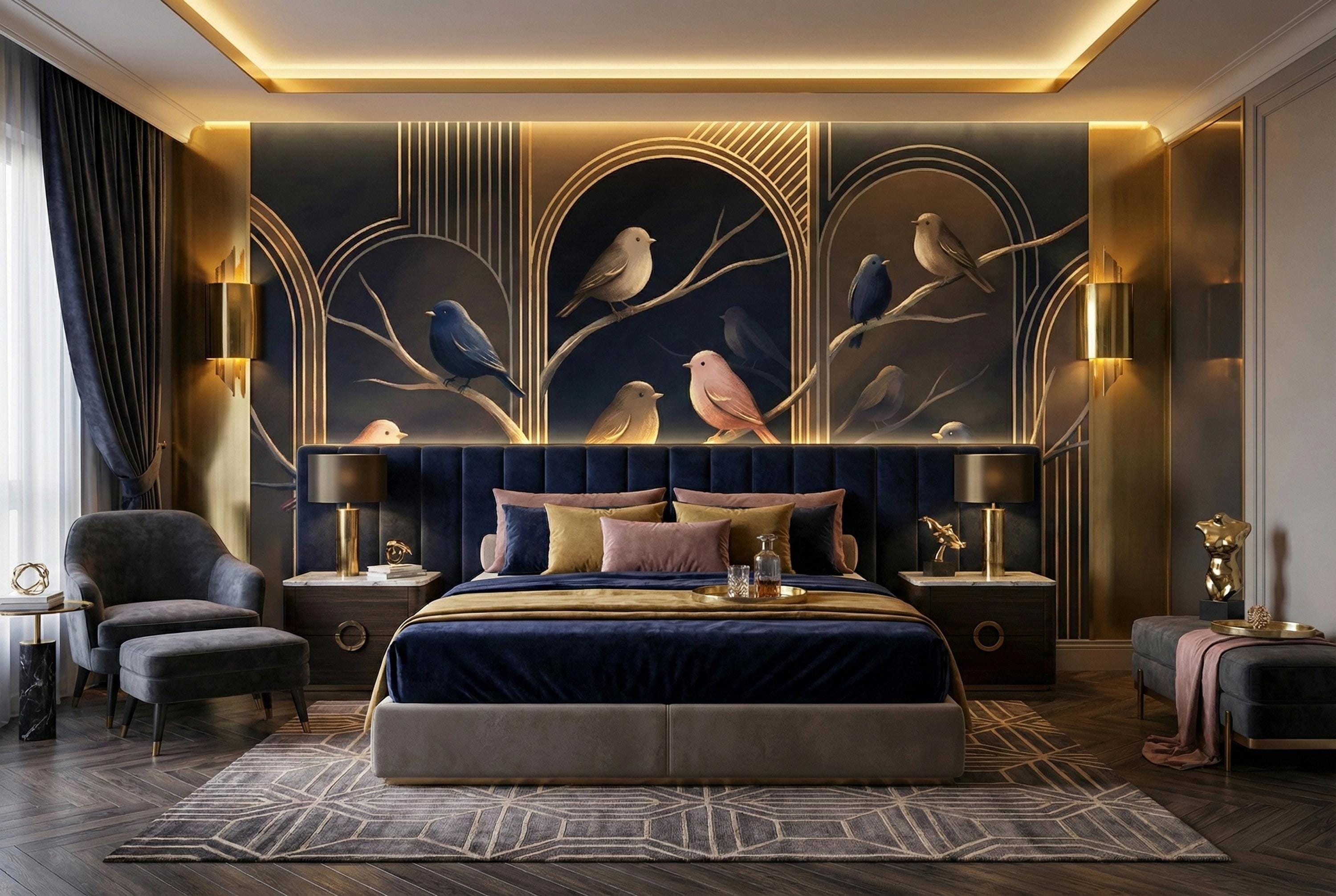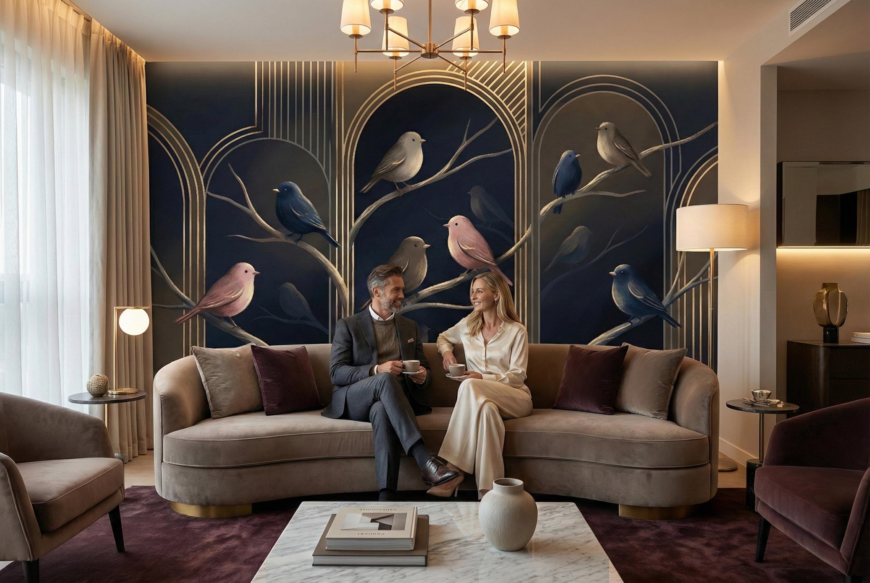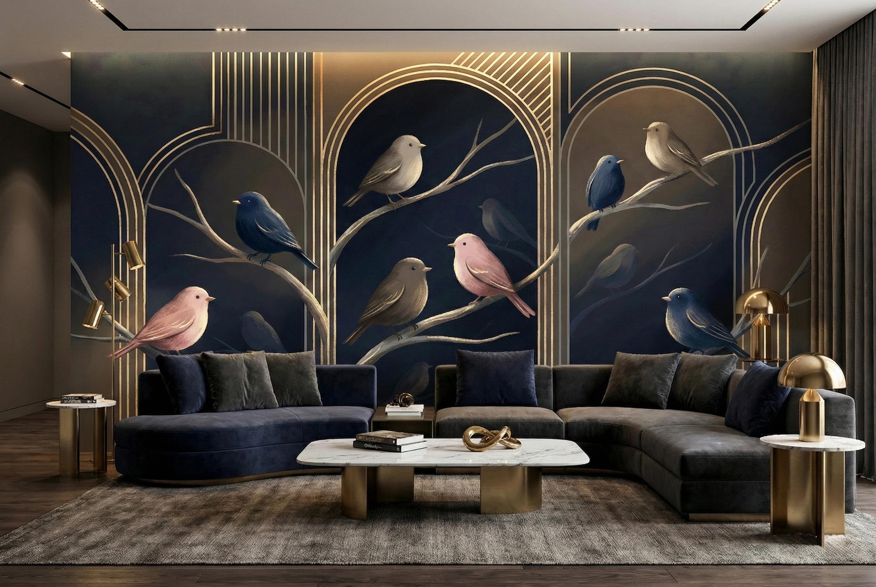 Bring the elegance of a moonlit forest into your home with our Midnight Birds Art Deco Wallpaper Mural. Set against a deep navy blue background and adorned with golden arches, this design captures the serene beauty of perched birds in soft blush, taupe, and sapphire tones. Perfect for lovers of moody interiors and sophisticated details, this wallpaper creates a striking focal point while adding a sense of calm and refinement 🐦🌙