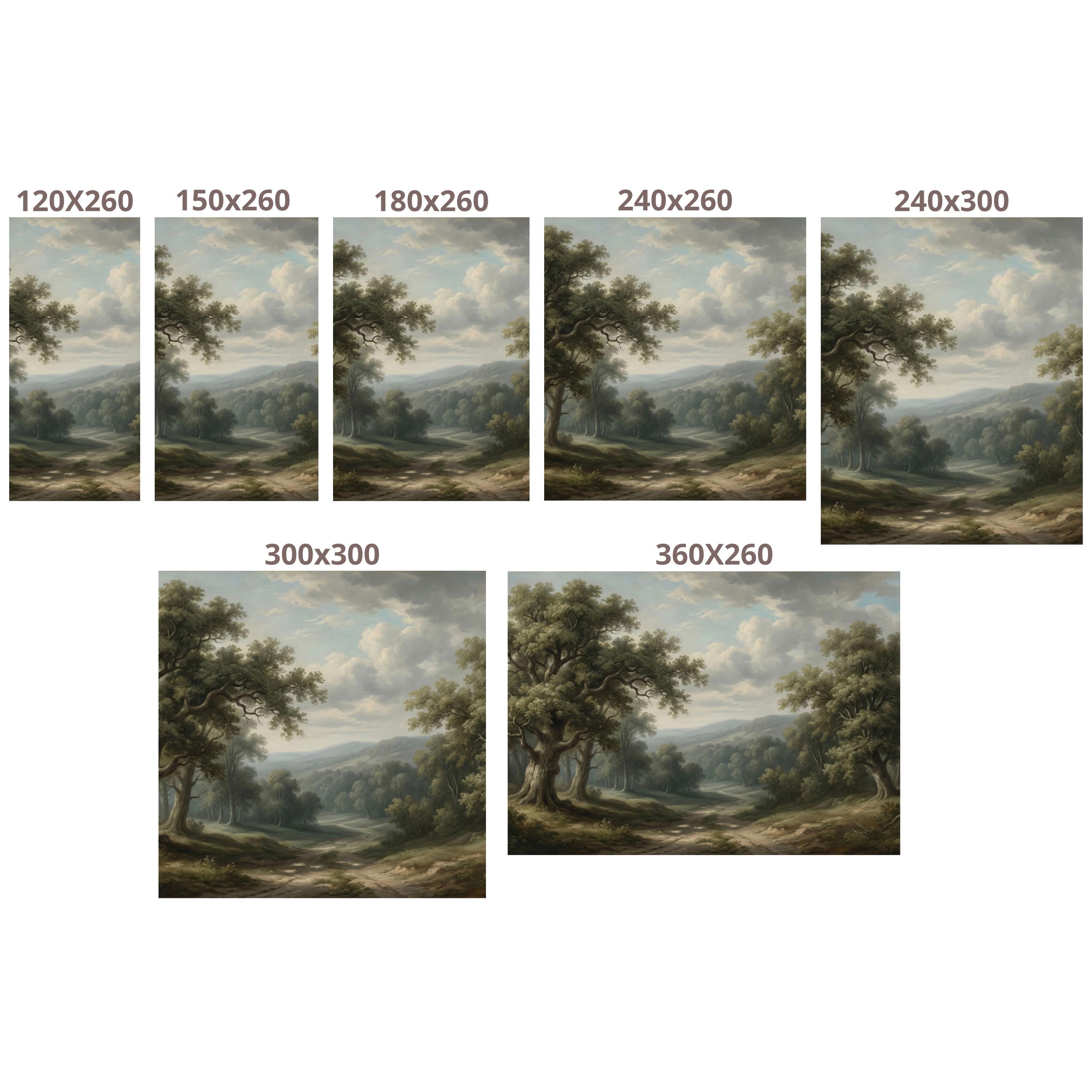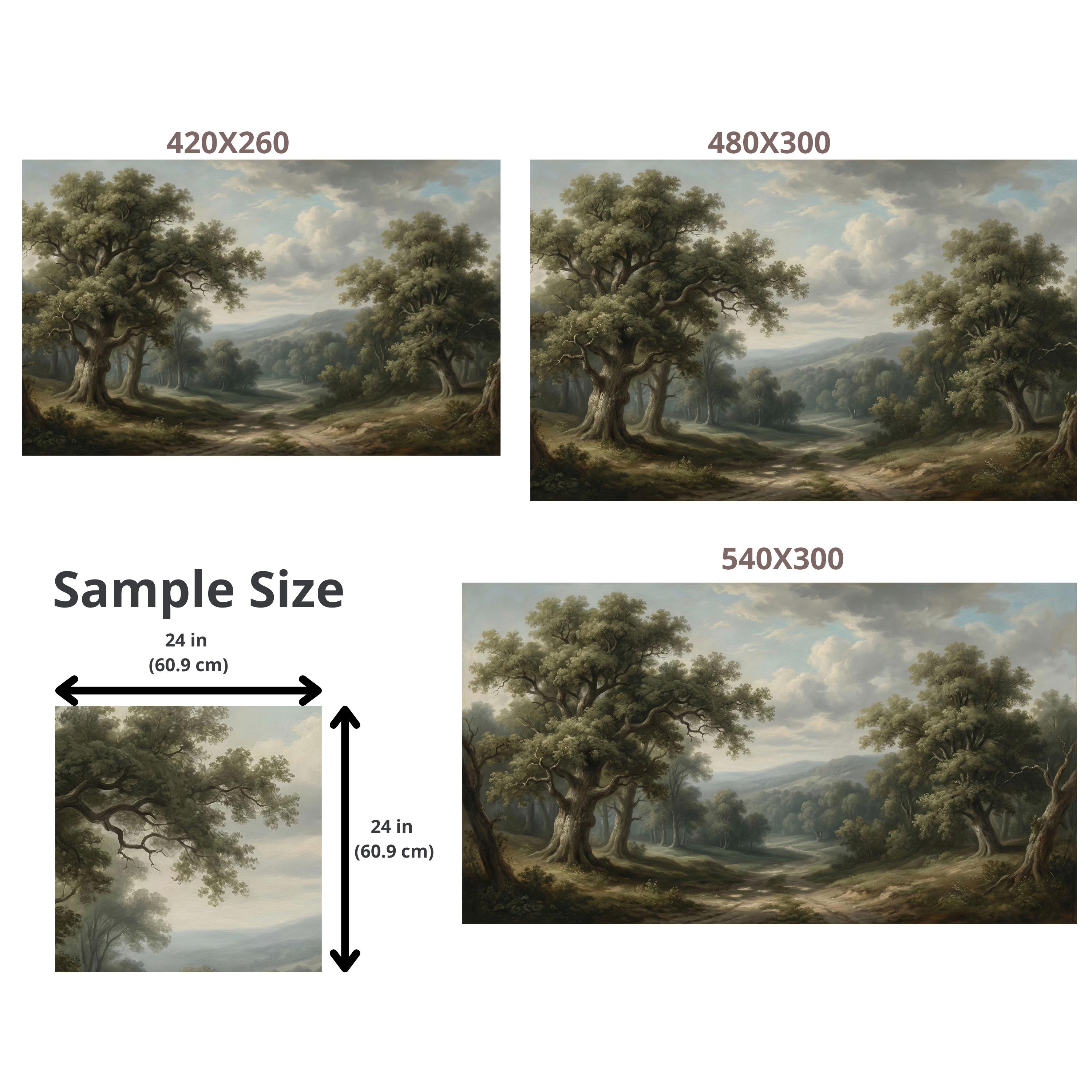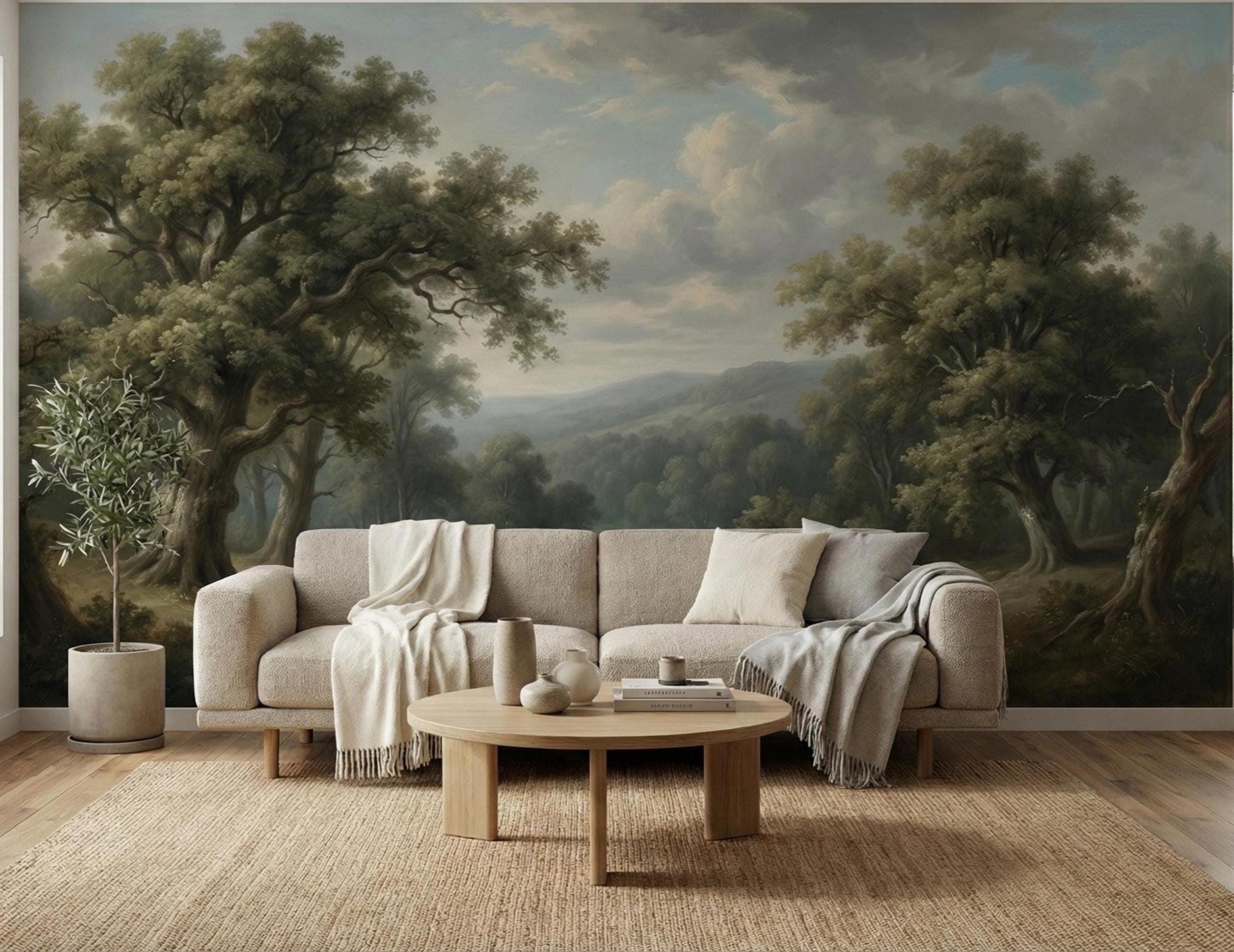 ๐ผ๏ธ Timeless Forest Scene โ Featuring aged oak trees, soft clouds, and rolling hills in earthy tones of green, taupe, and muted blue. Feels like walking through a storybook.