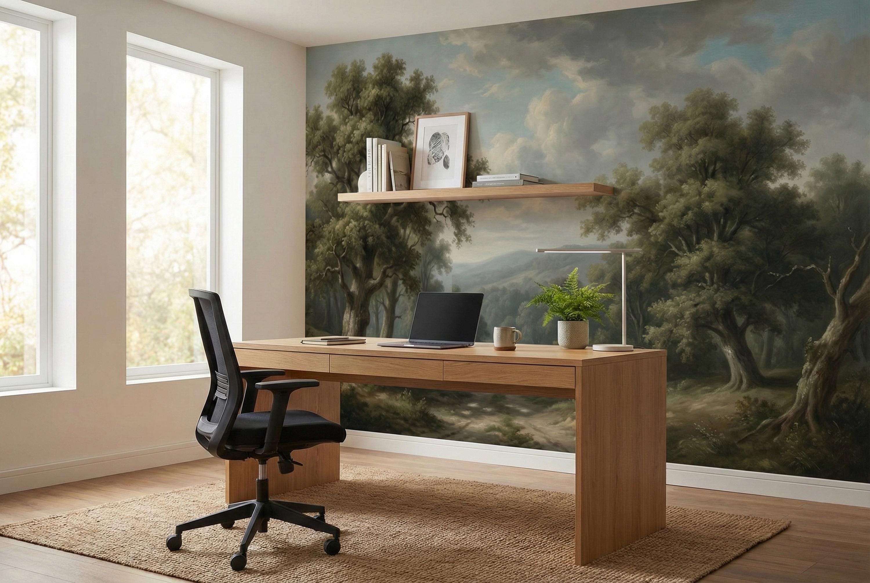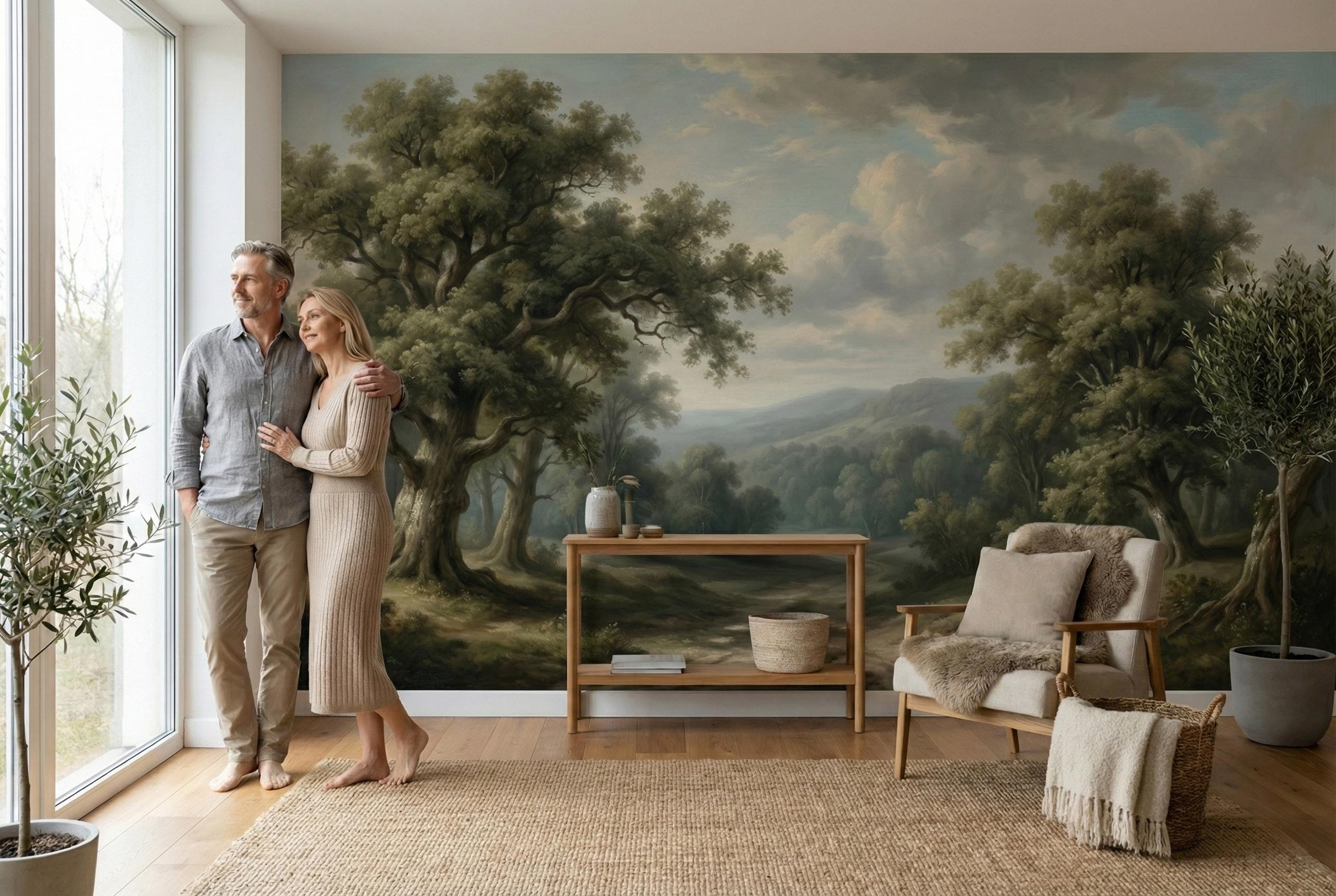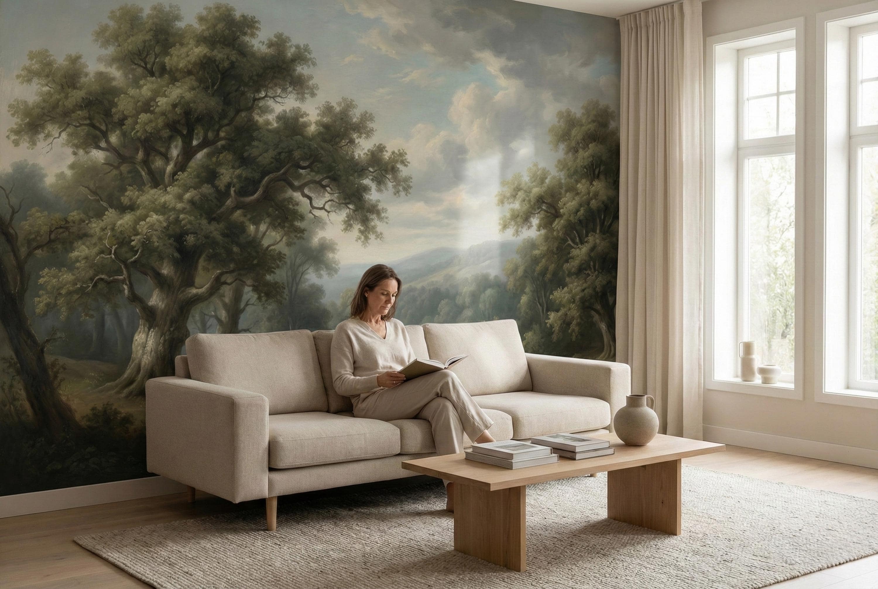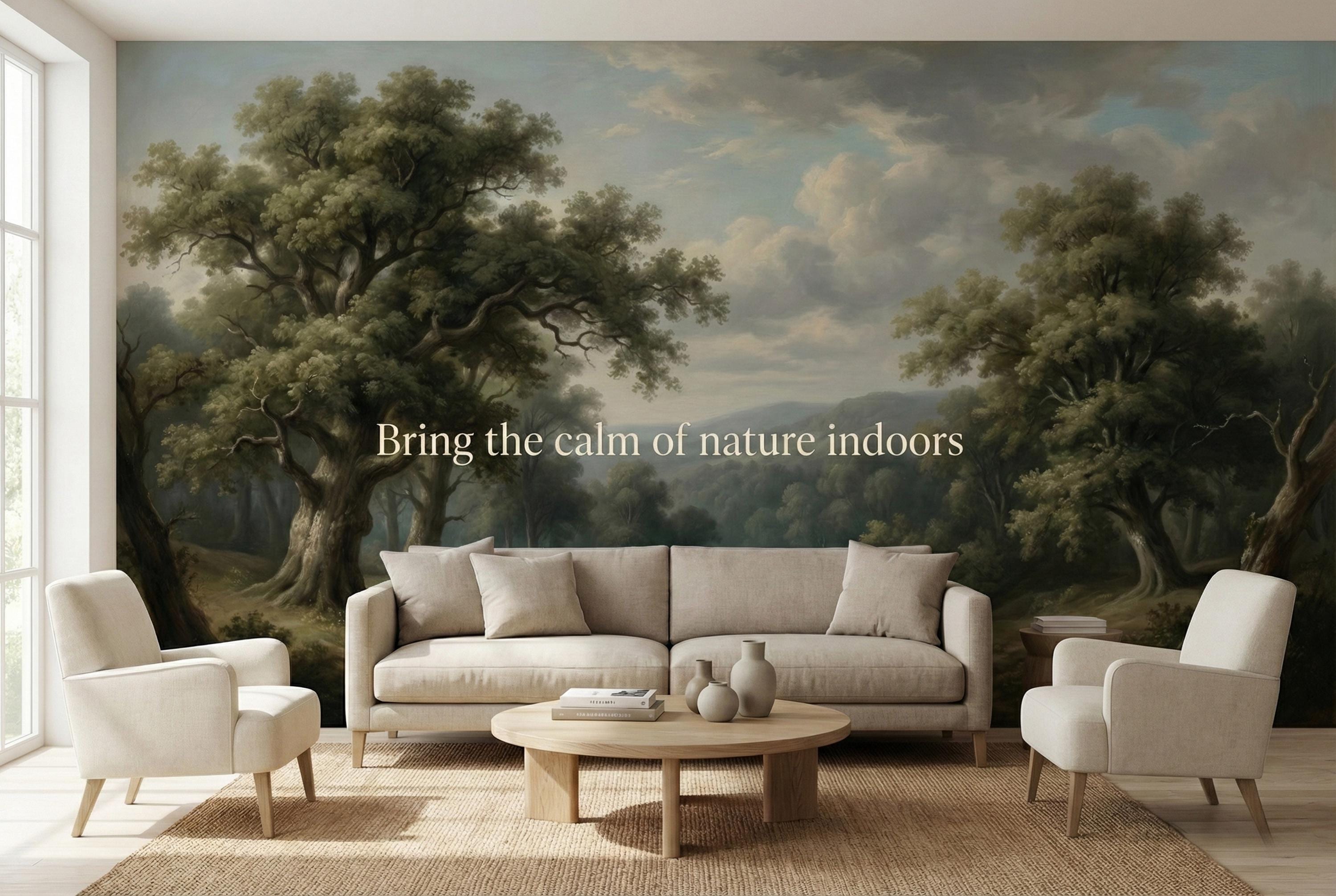 ๐ผ๏ธ Timeless Forest Scene โ Featuring aged oak trees, soft clouds, and rolling hills in earthy tones of green, taupe, and muted blue. Feels like walking through a storybook.