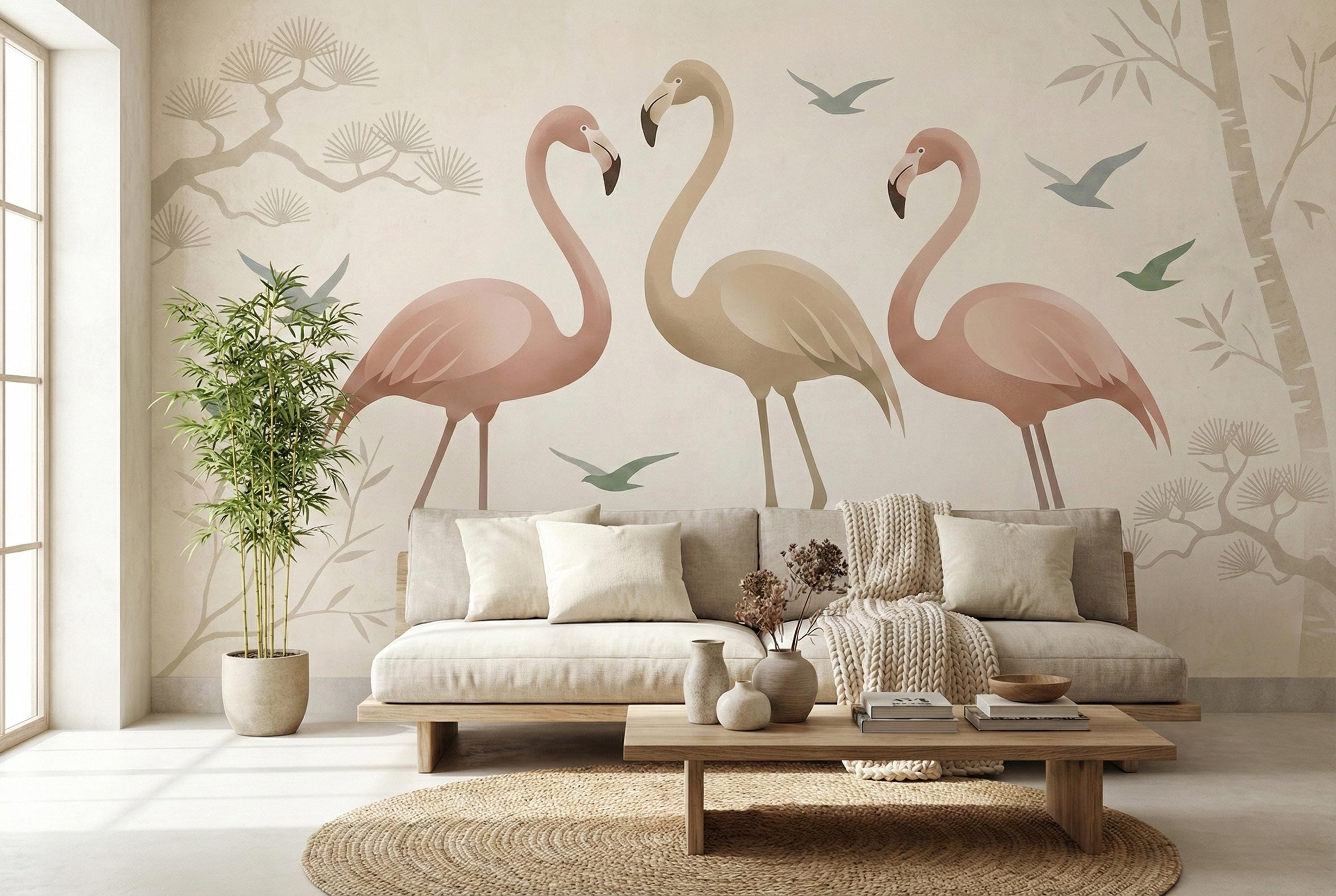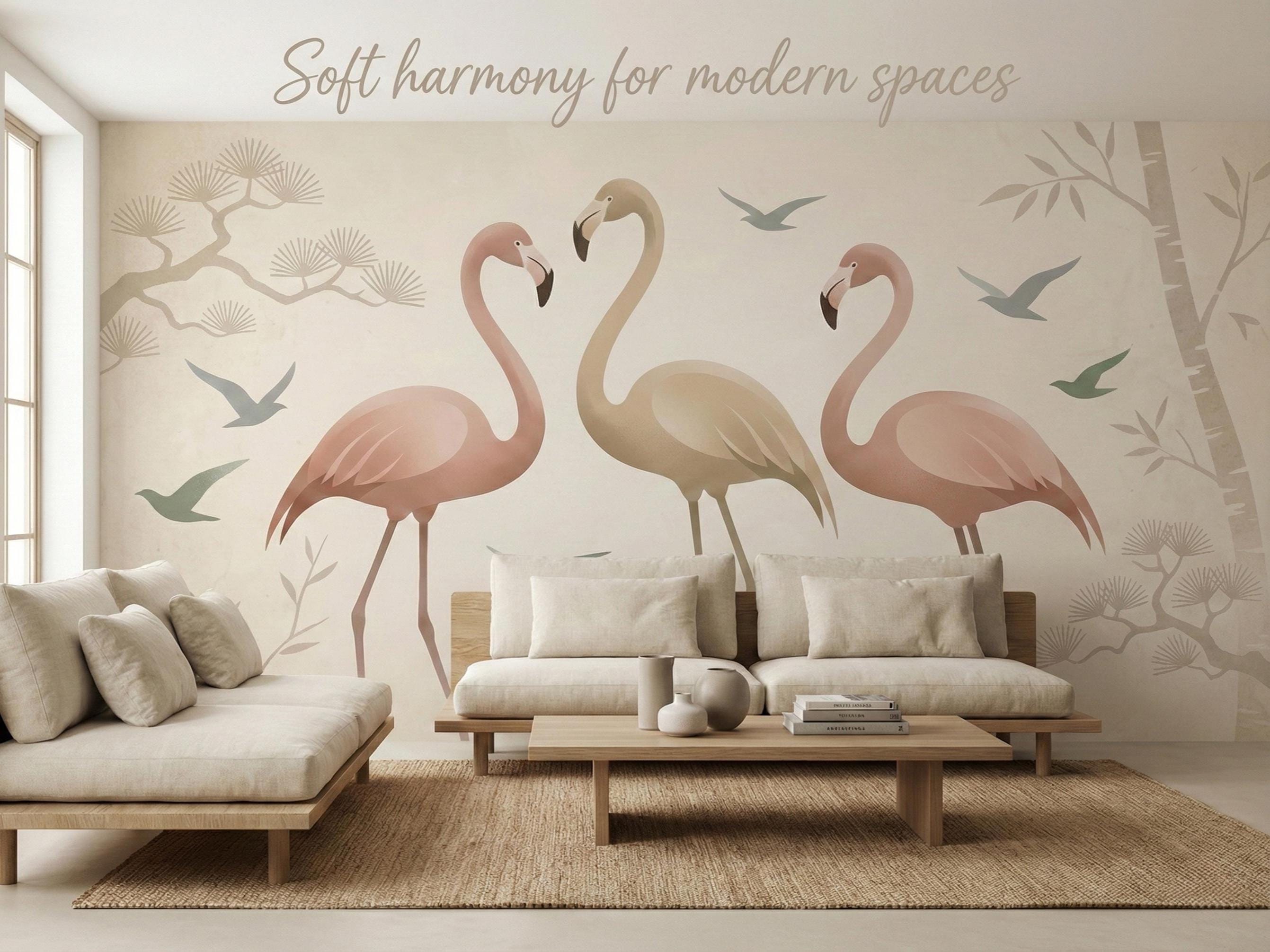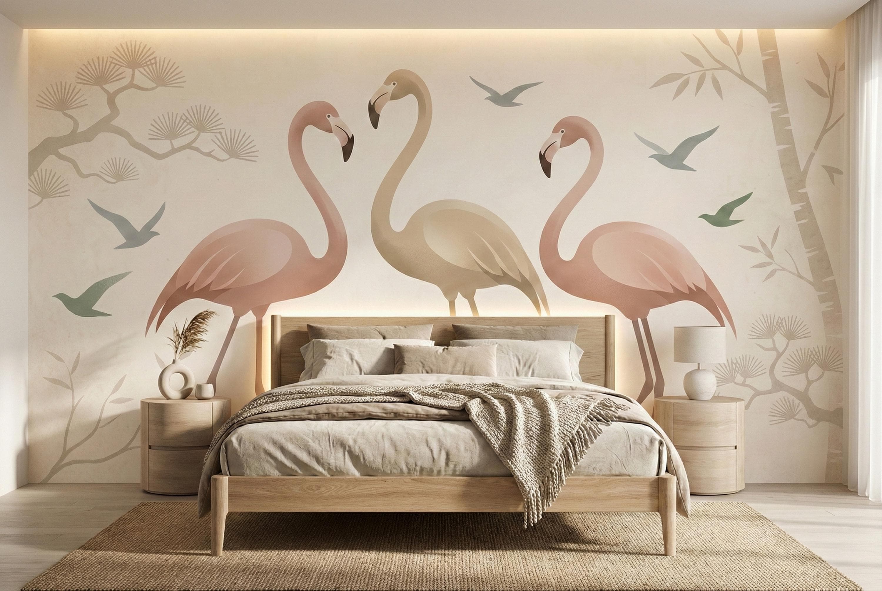 Bring balance, warmth, and subtle elegance into your space with this Japandi Flamingo Wallpaper Mural 🦩🌿 Featuring three graceful flamingos surrounded by softly illustrated flying birds and delicate botanical elements, this mural blends minimalist Japanese aesthetics with Scandinavian calm. The earthy pink, beige, and green tones add natural harmony to your bedroom or living room — ideal for peaceful, modern interiors with a focus on organic design.