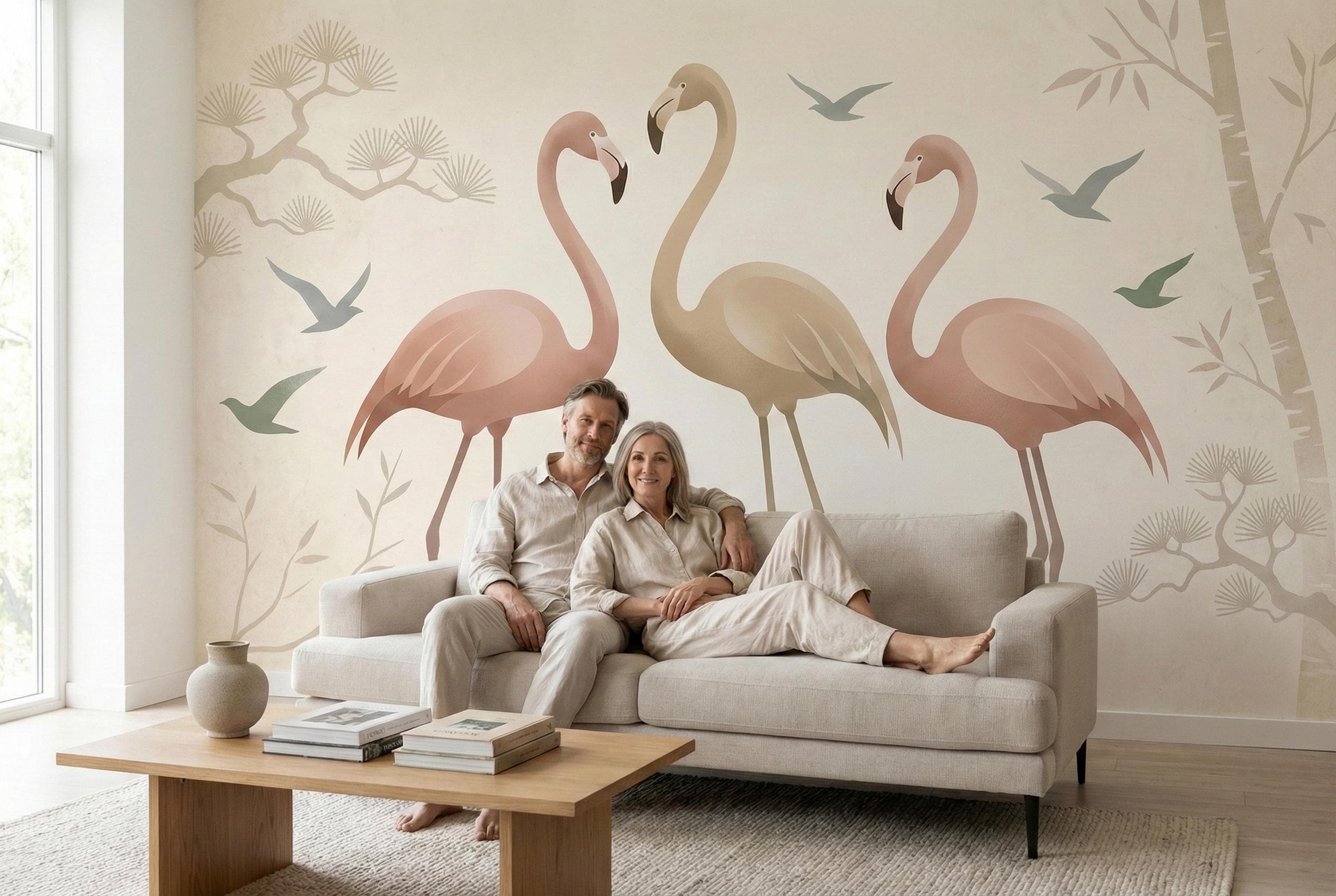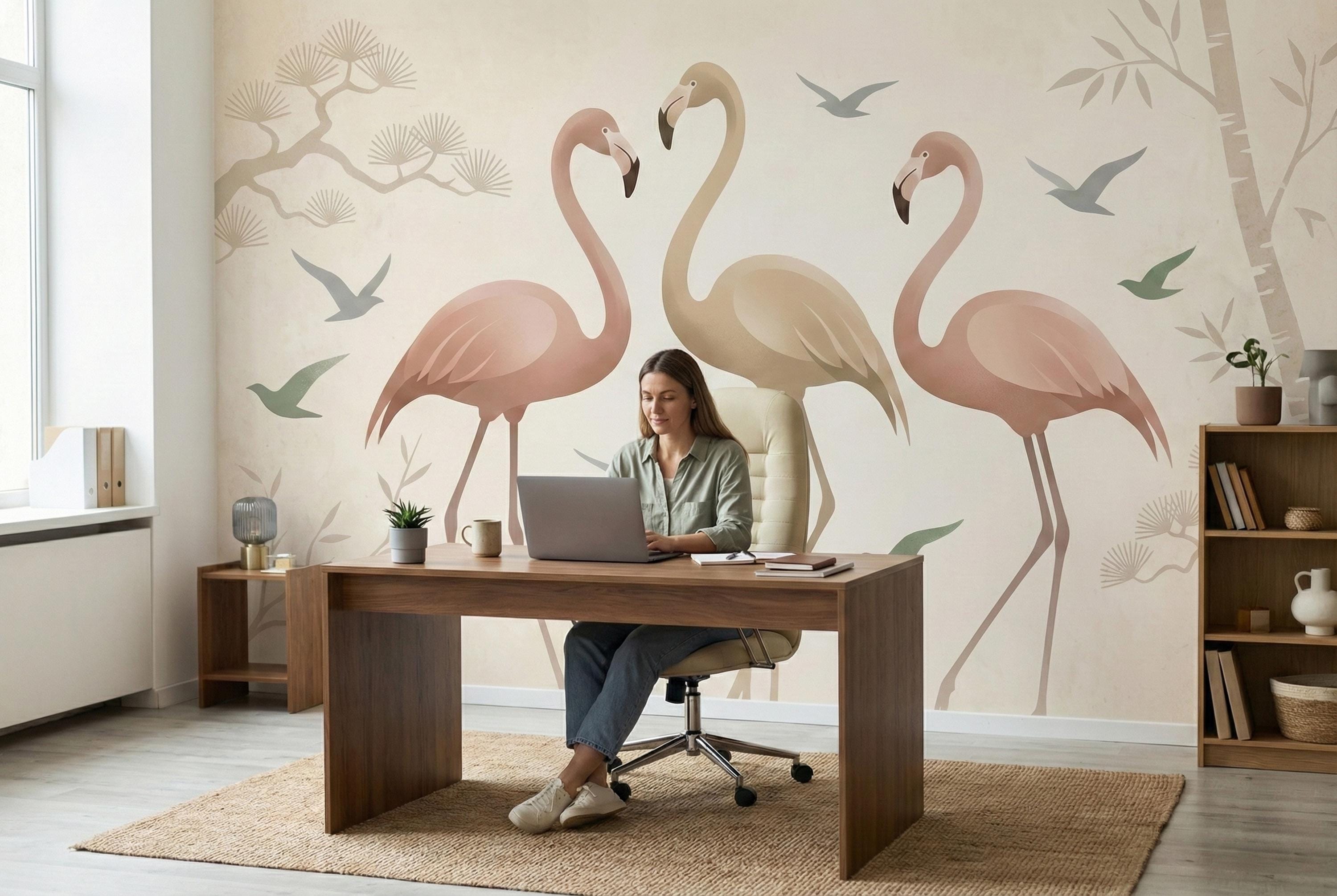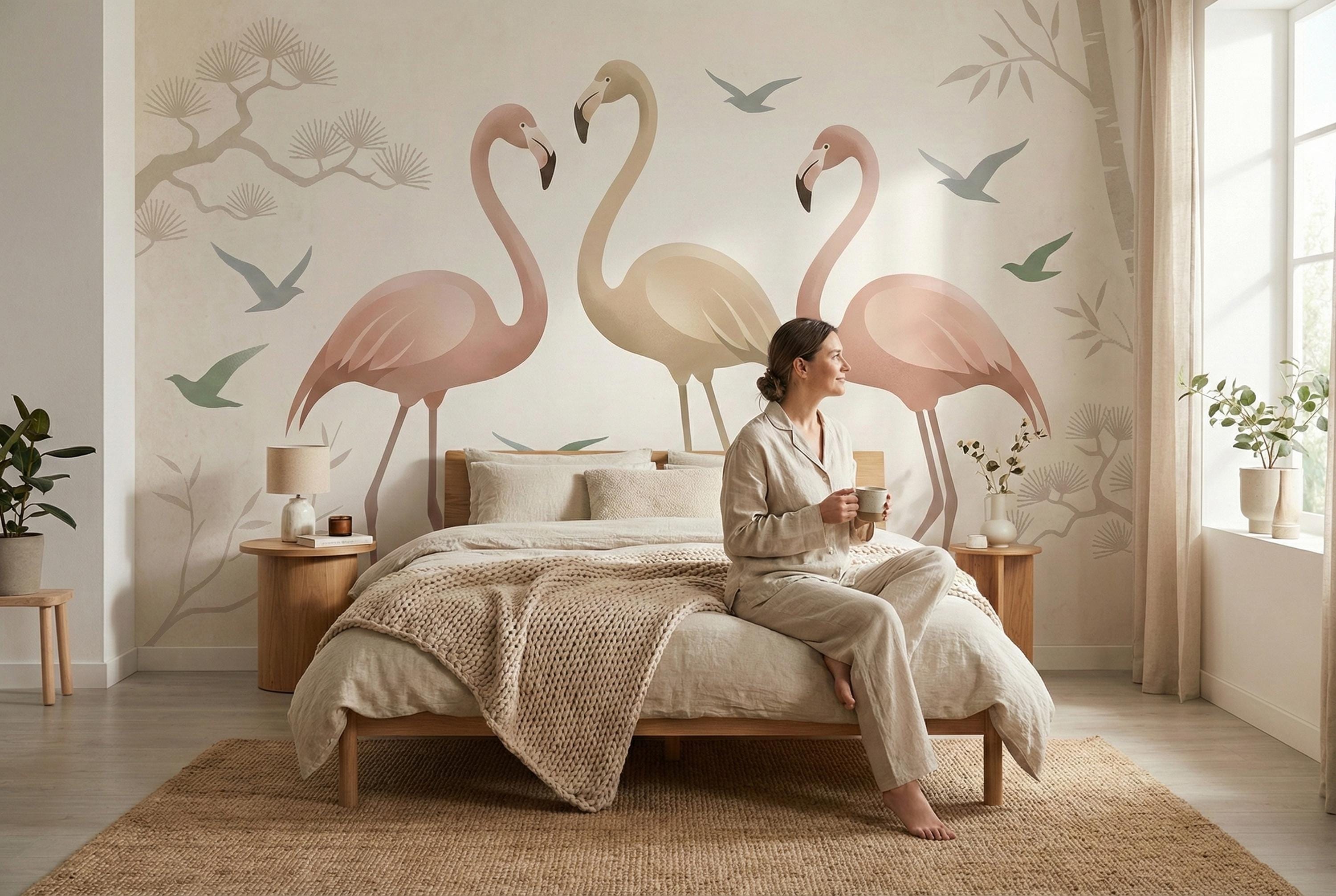Bring balance, warmth, and subtle elegance into your space with this Japandi Flamingo Wallpaper Mural 🦩🌿 Featuring three graceful flamingos surrounded by softly illustrated flying birds and delicate botanical elements, this mural blends minimalist Japanese aesthetics with Scandinavian calm. The earthy pink, beige, and green tones add natural harmony to your bedroom or living room — ideal for peaceful, modern interiors with a focus on organic design.