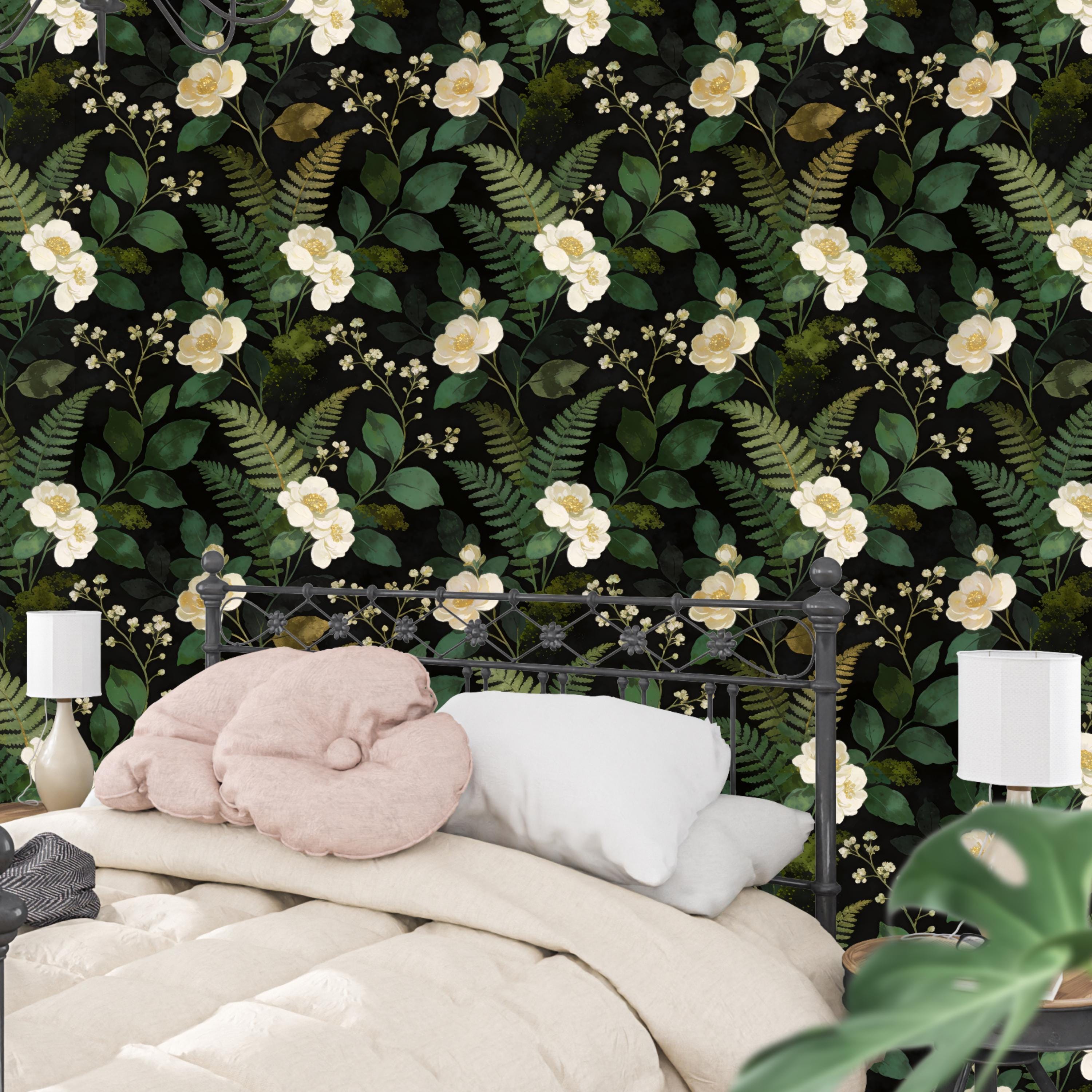 This dark floral wallpaper features elegant cream flowers, deep green leaves, and delicate fern details set against a rich black background. Designed to bring timeless botanical beauty and refined contrast into your interior, this wallpaper creates a calm yet dramatic atmosphere perfect for sophisticated living rooms and bedrooms 🌿✨