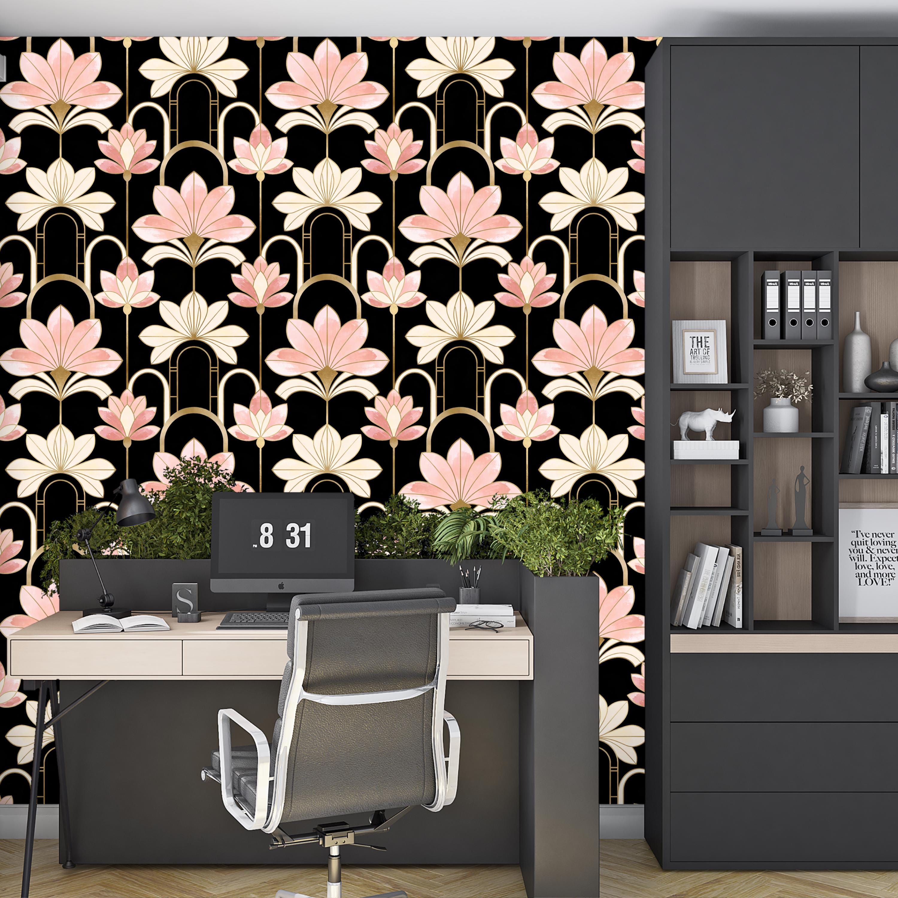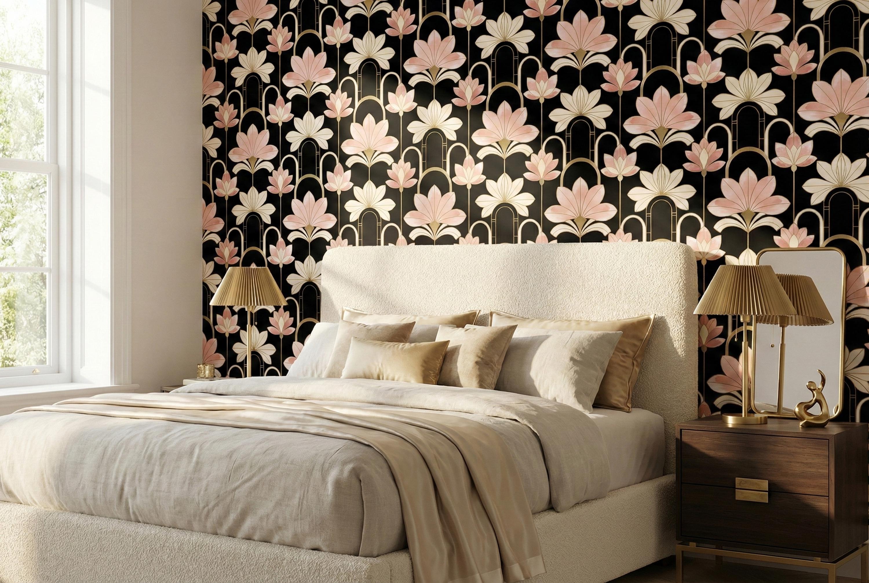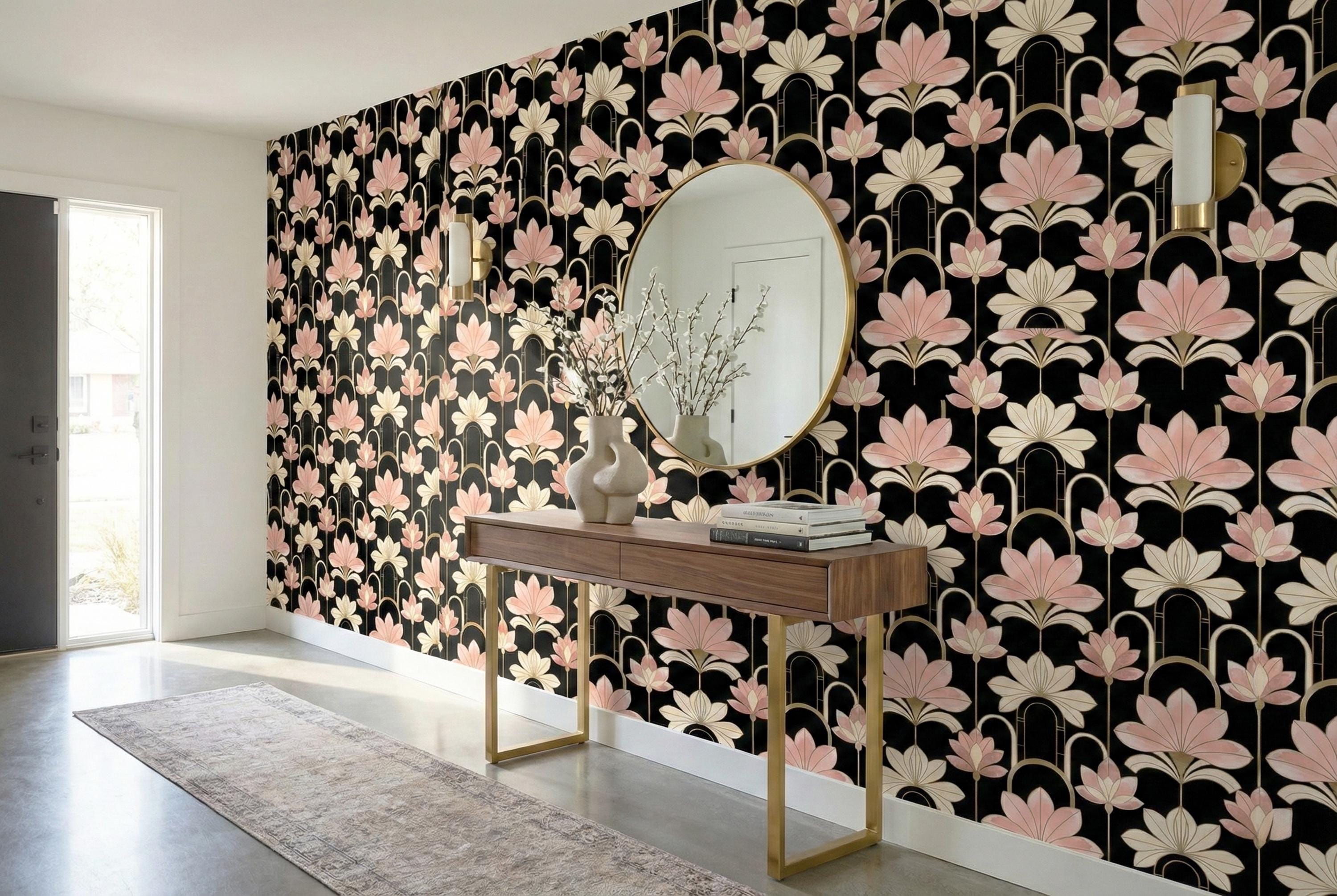 Inspired by glamorous Art Deco architecture and stylized lotus florals, this black, gold, and blush wallpaper brings refined drama into any interior. Soft watercolor petals meet precise geometric lines, creating a perfect balance between elegance and bold design.