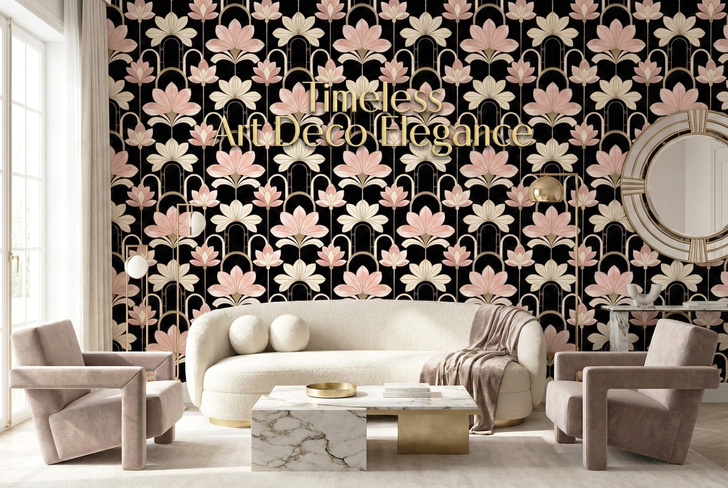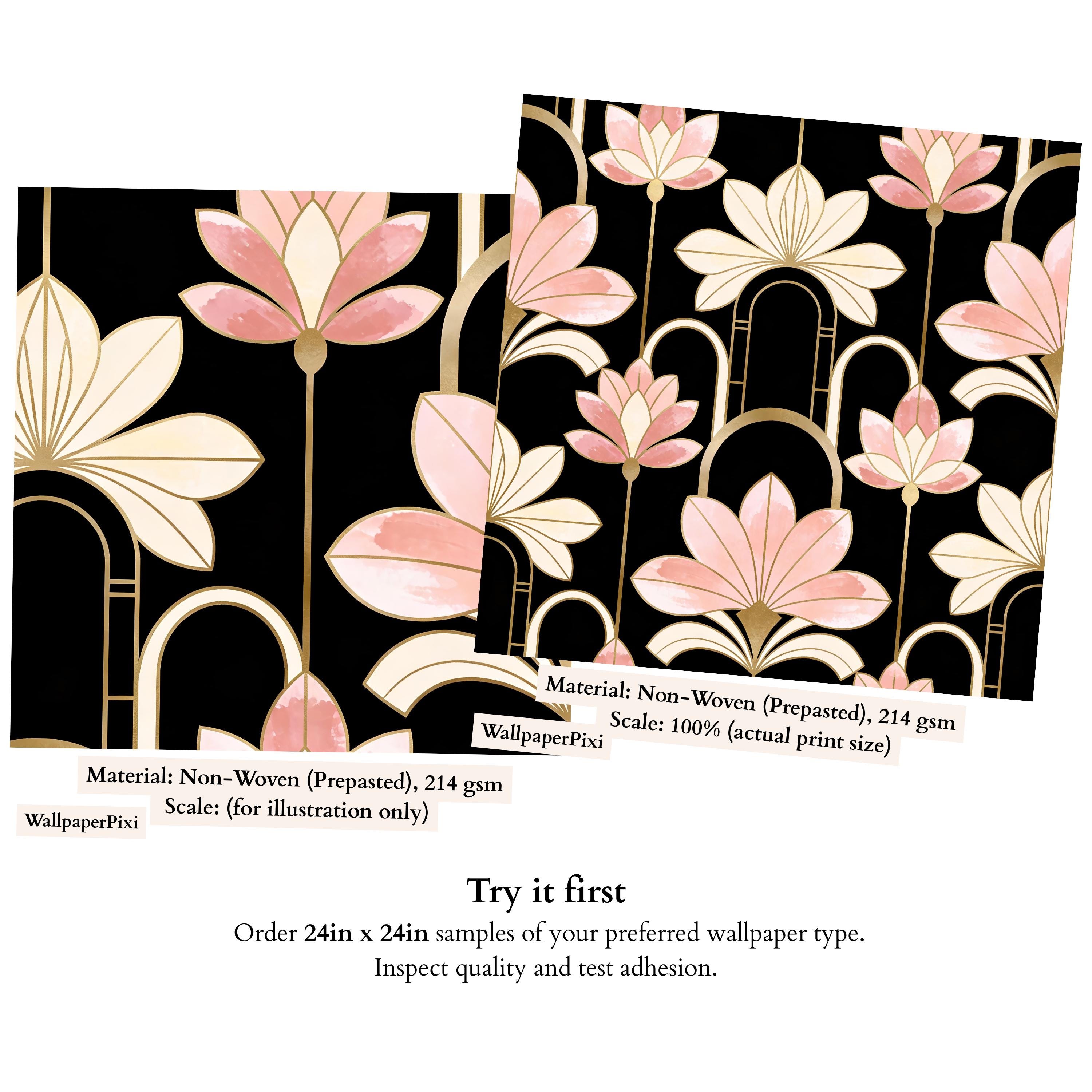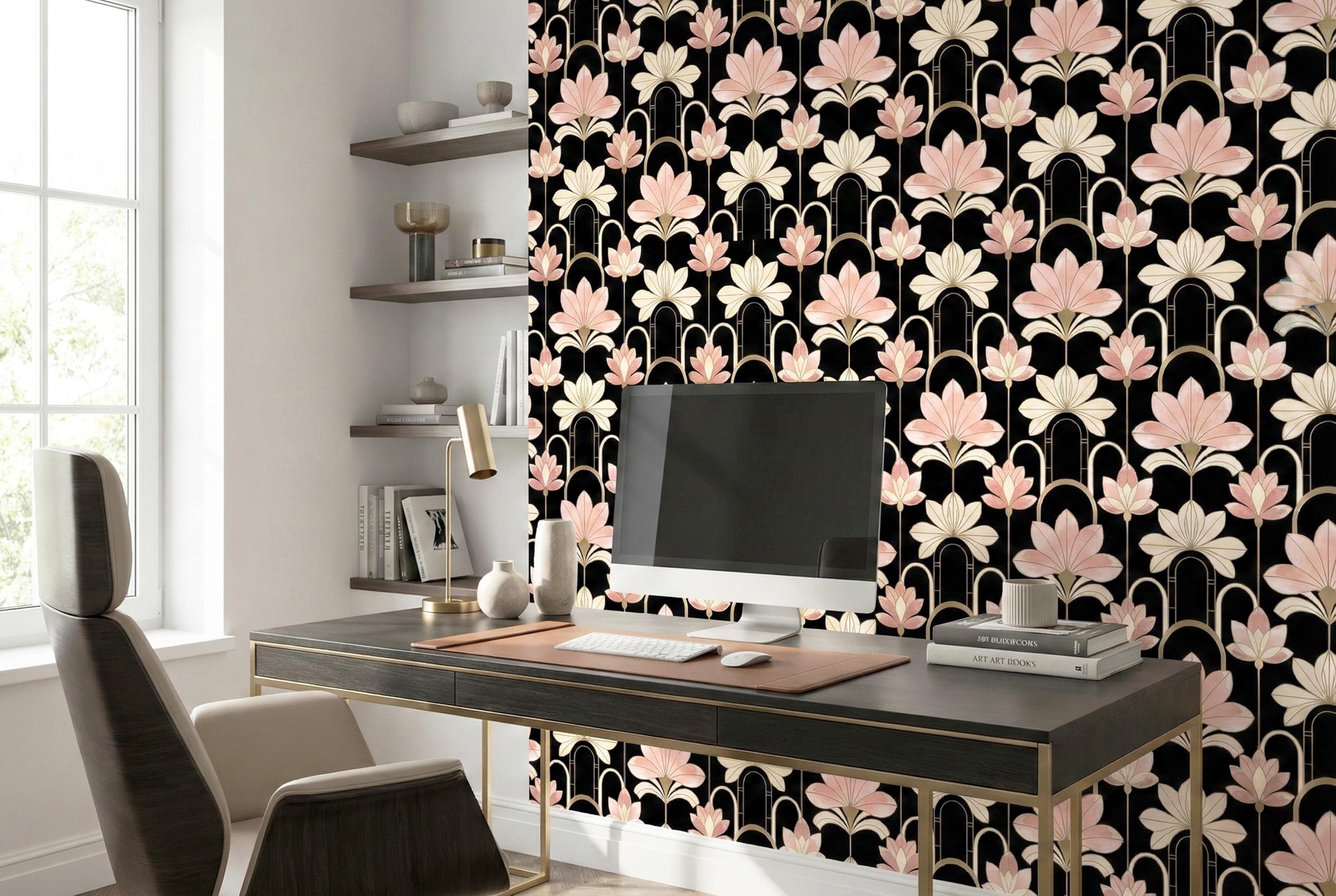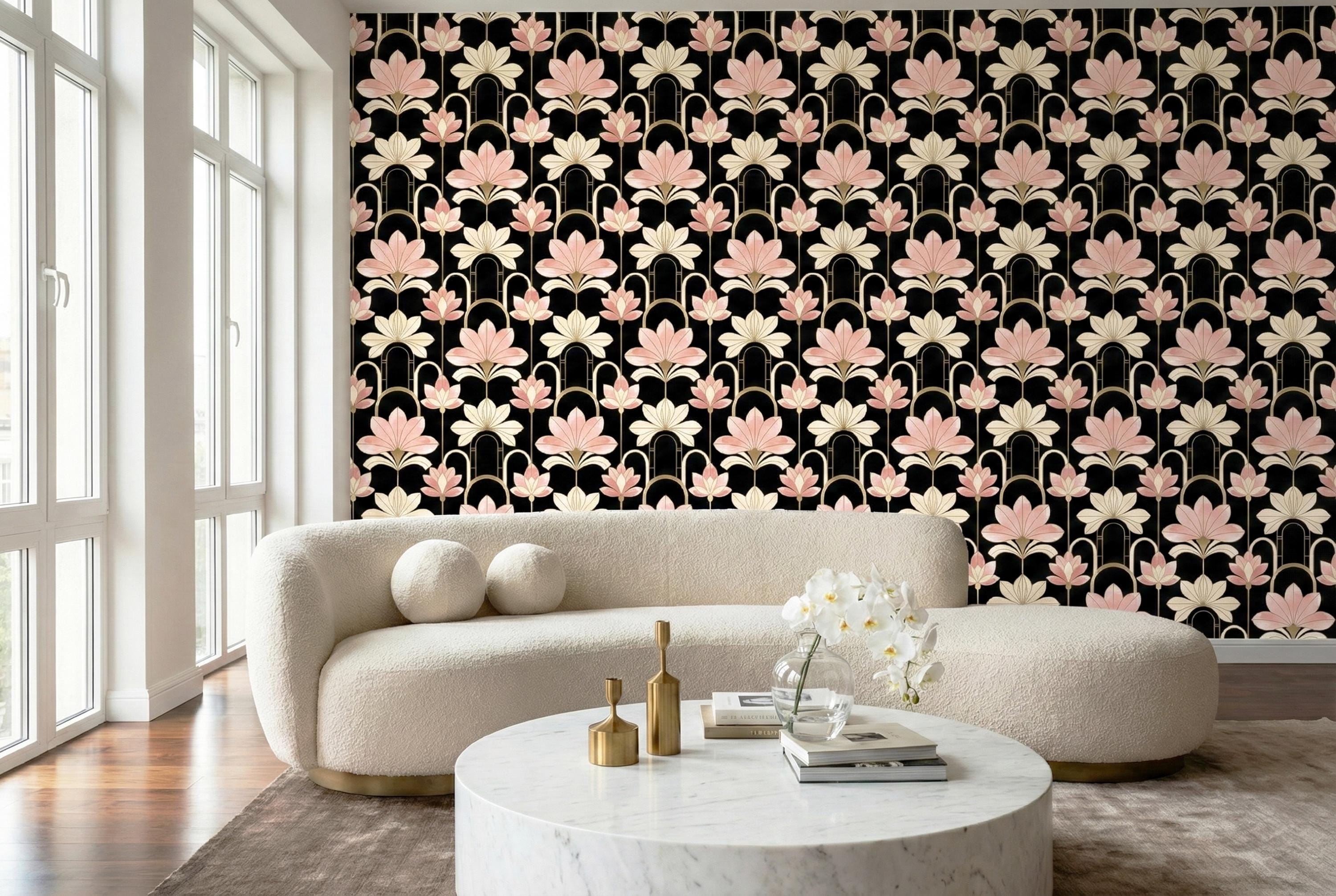 Inspired by glamorous Art Deco architecture and stylized lotus florals, this black, gold, and blush wallpaper brings refined drama into any interior. Soft watercolor petals meet precise geometric lines, creating a perfect balance between elegance and bold design.