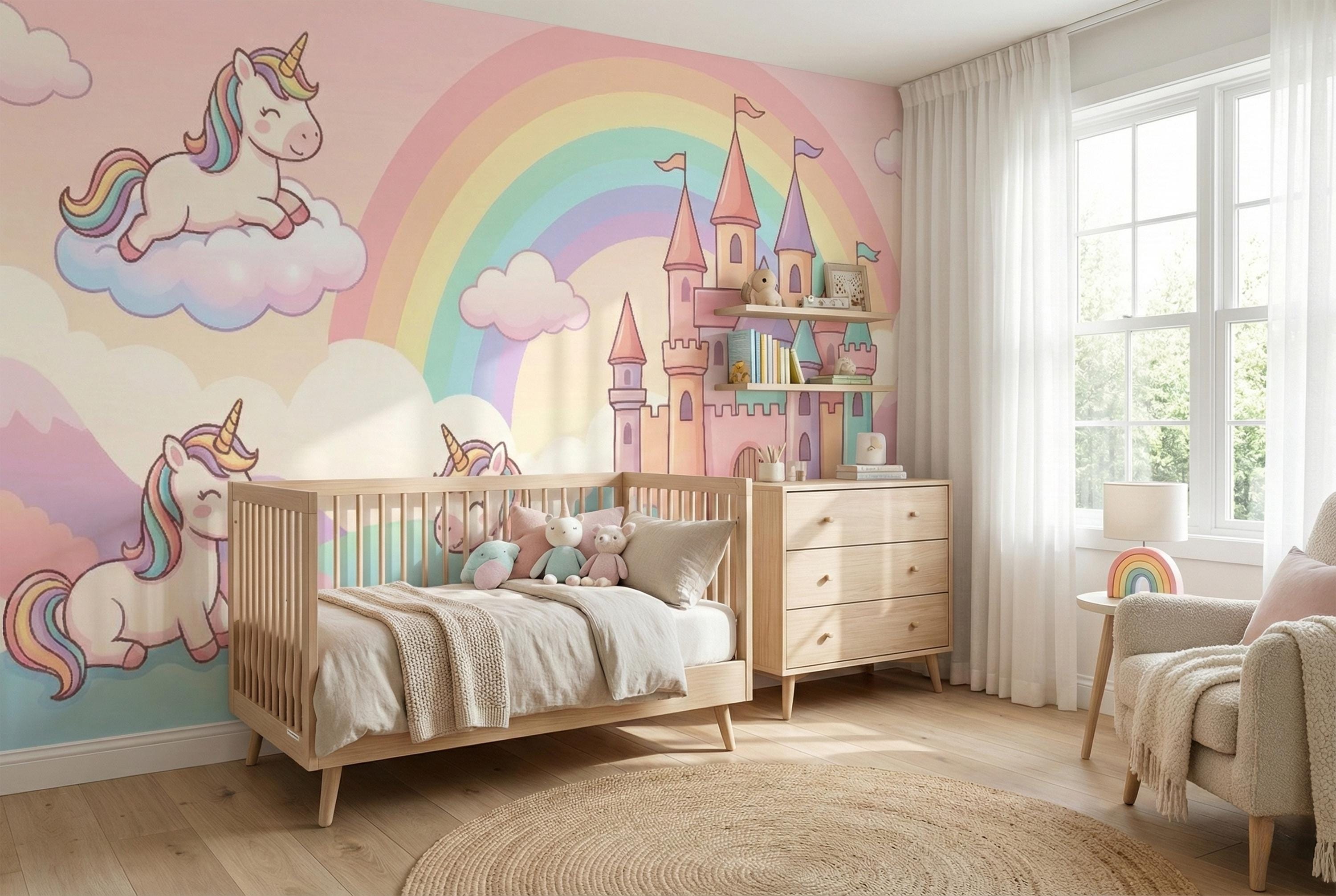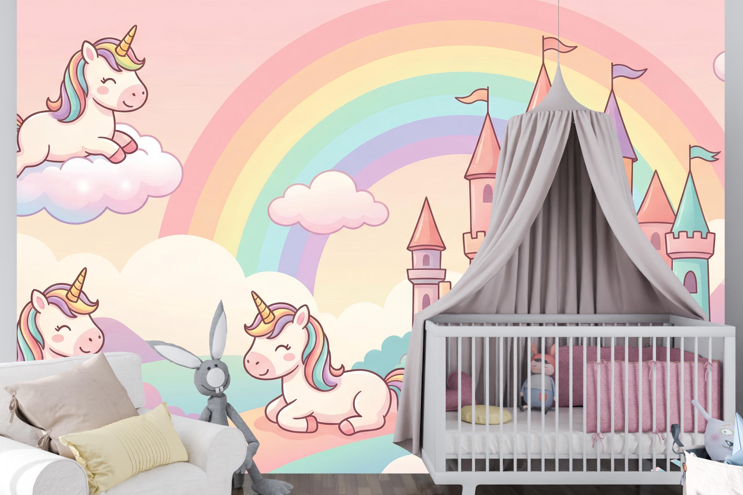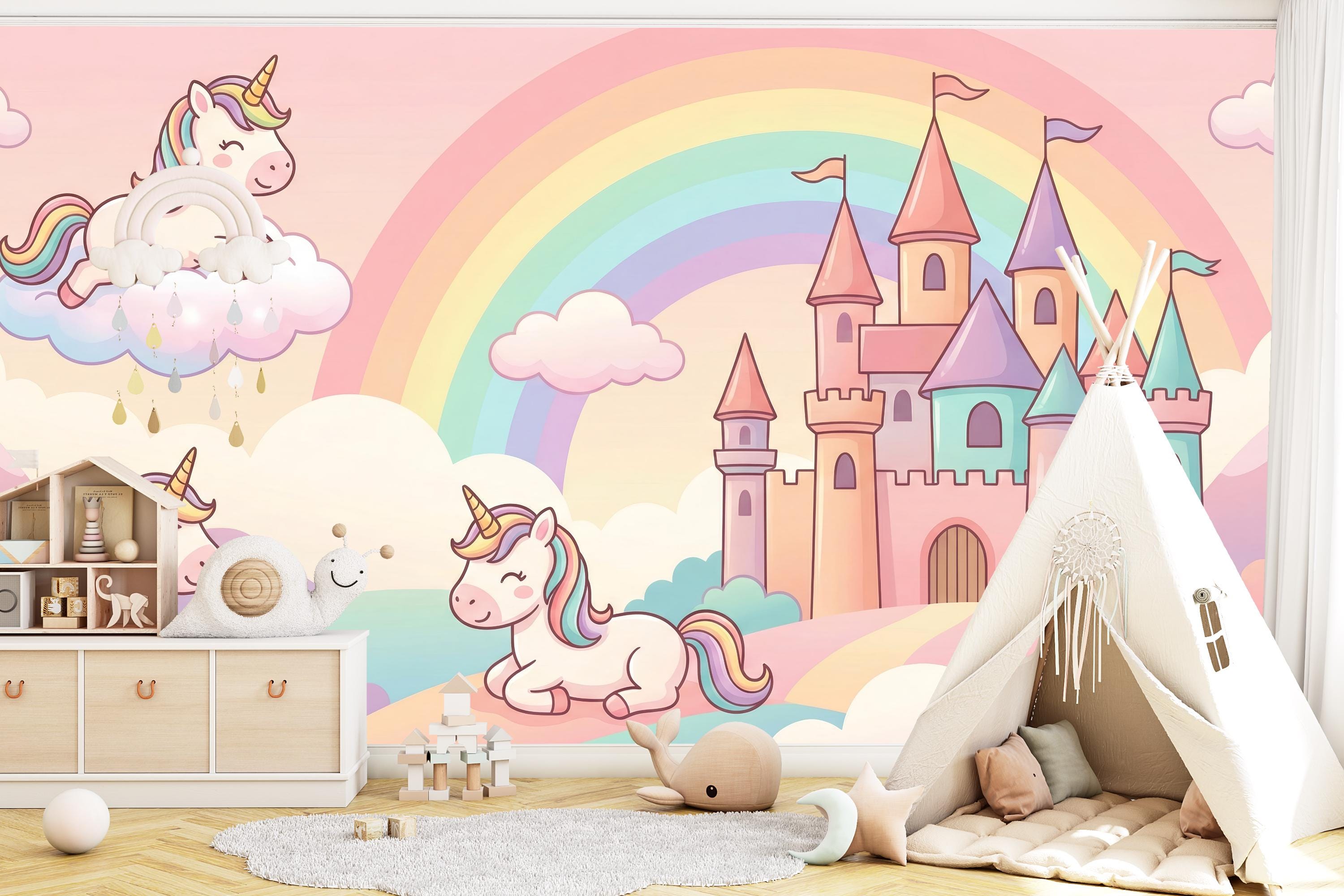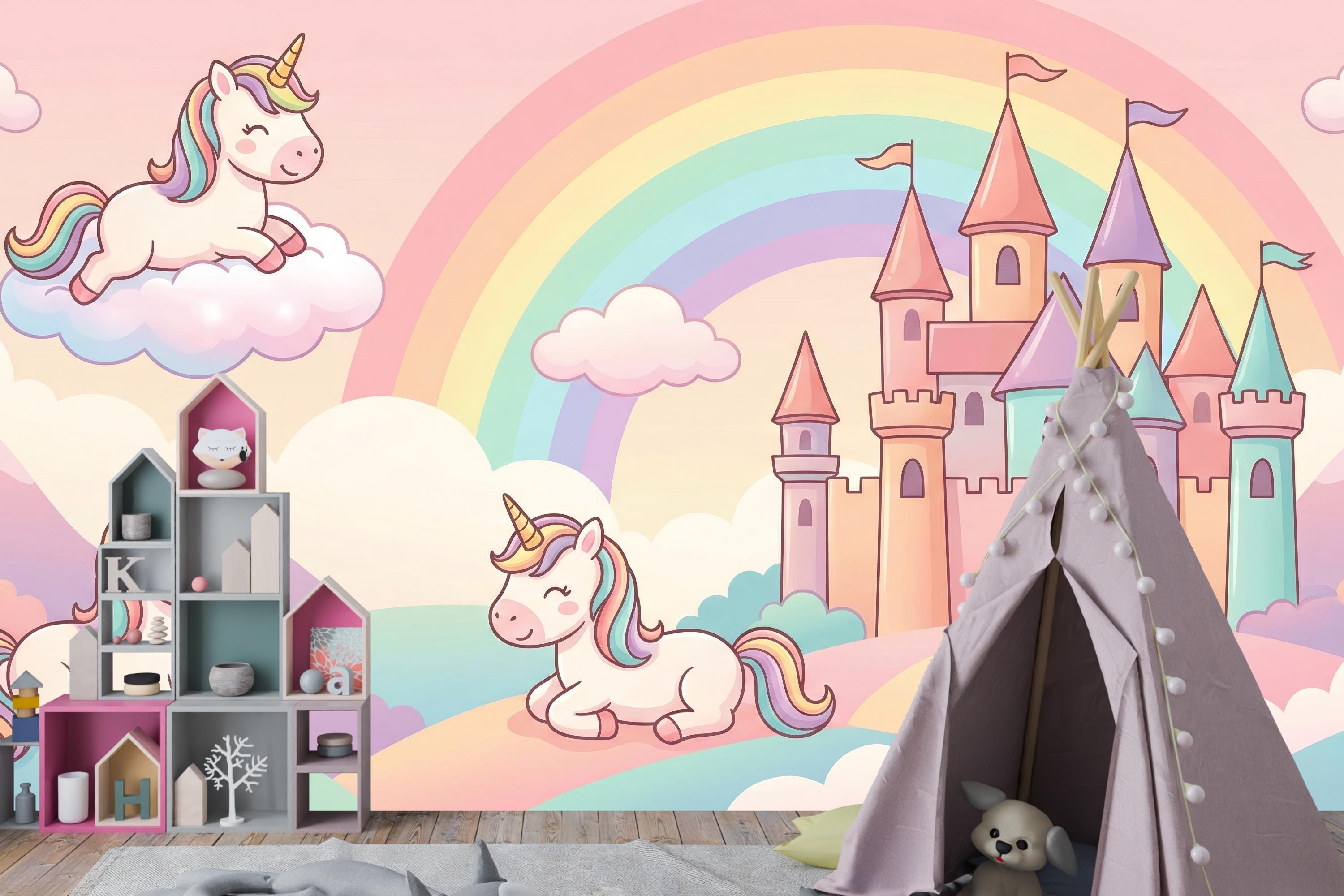 This pastel unicorn wallpaper turns any child’s room into a gentle fairytale world filled with rainbows, castles, and smiling unicorns. Soft colors, rounded shapes, and a calm fantasy atmosphere create a space where imagination feels safe, joyful, and magical.