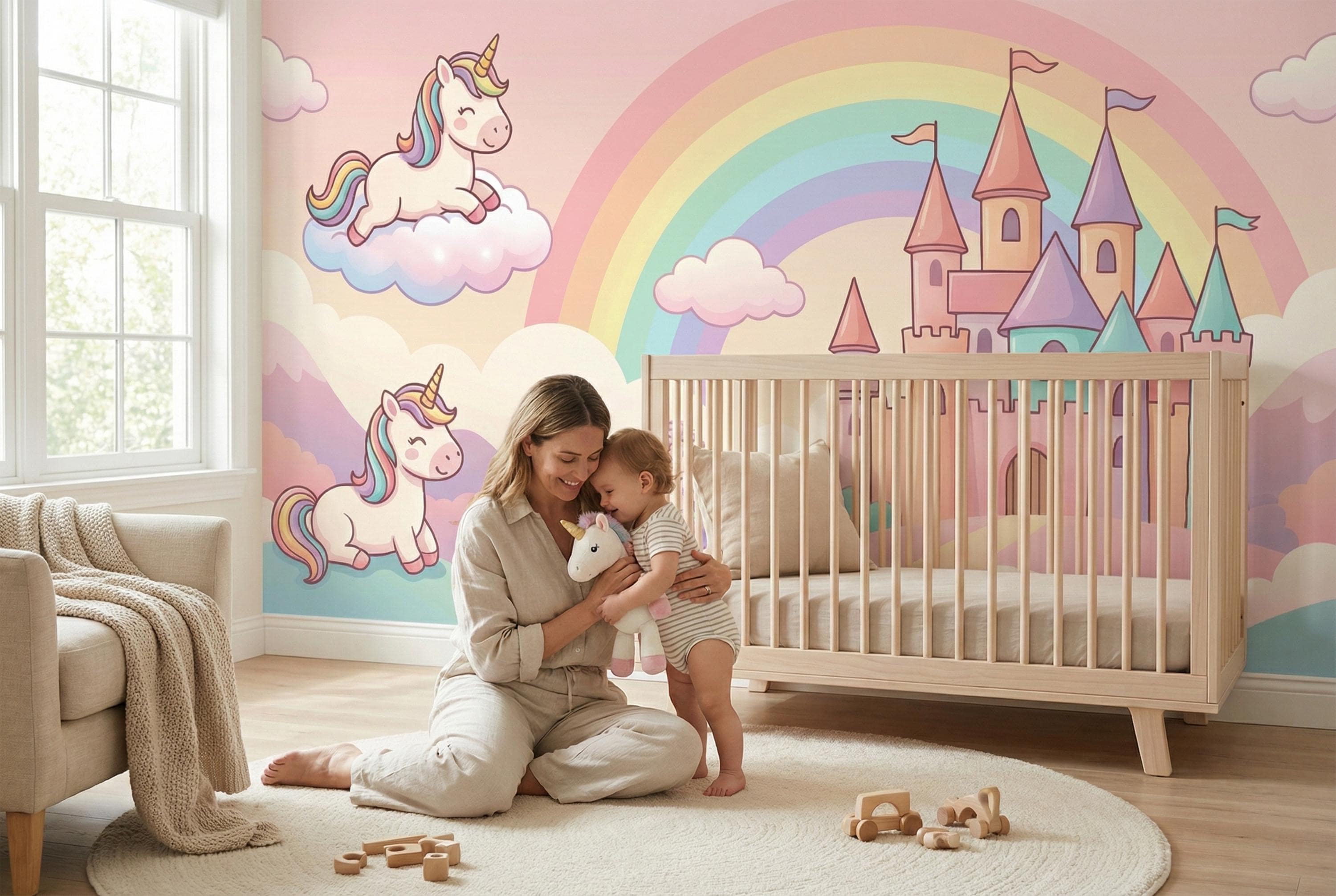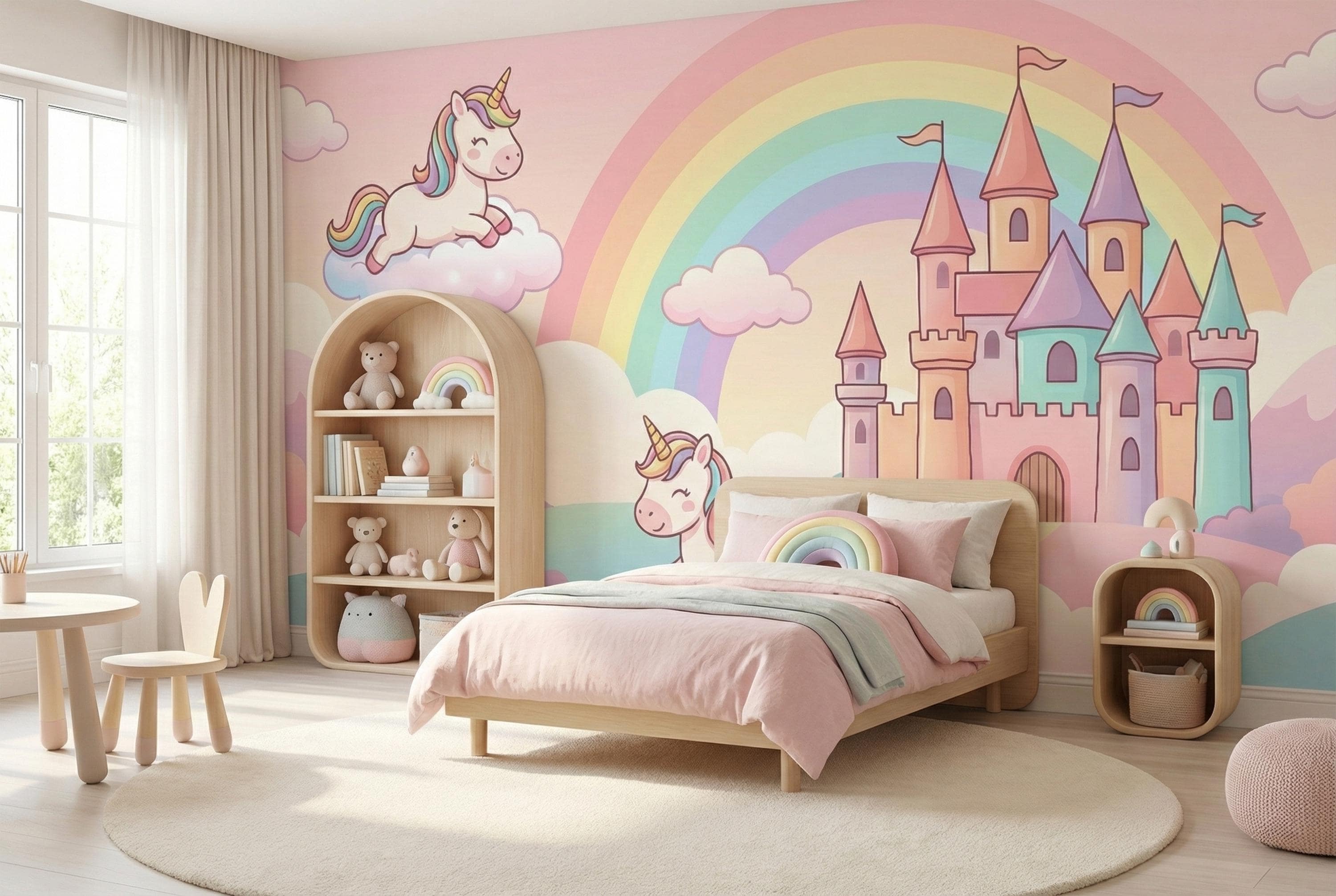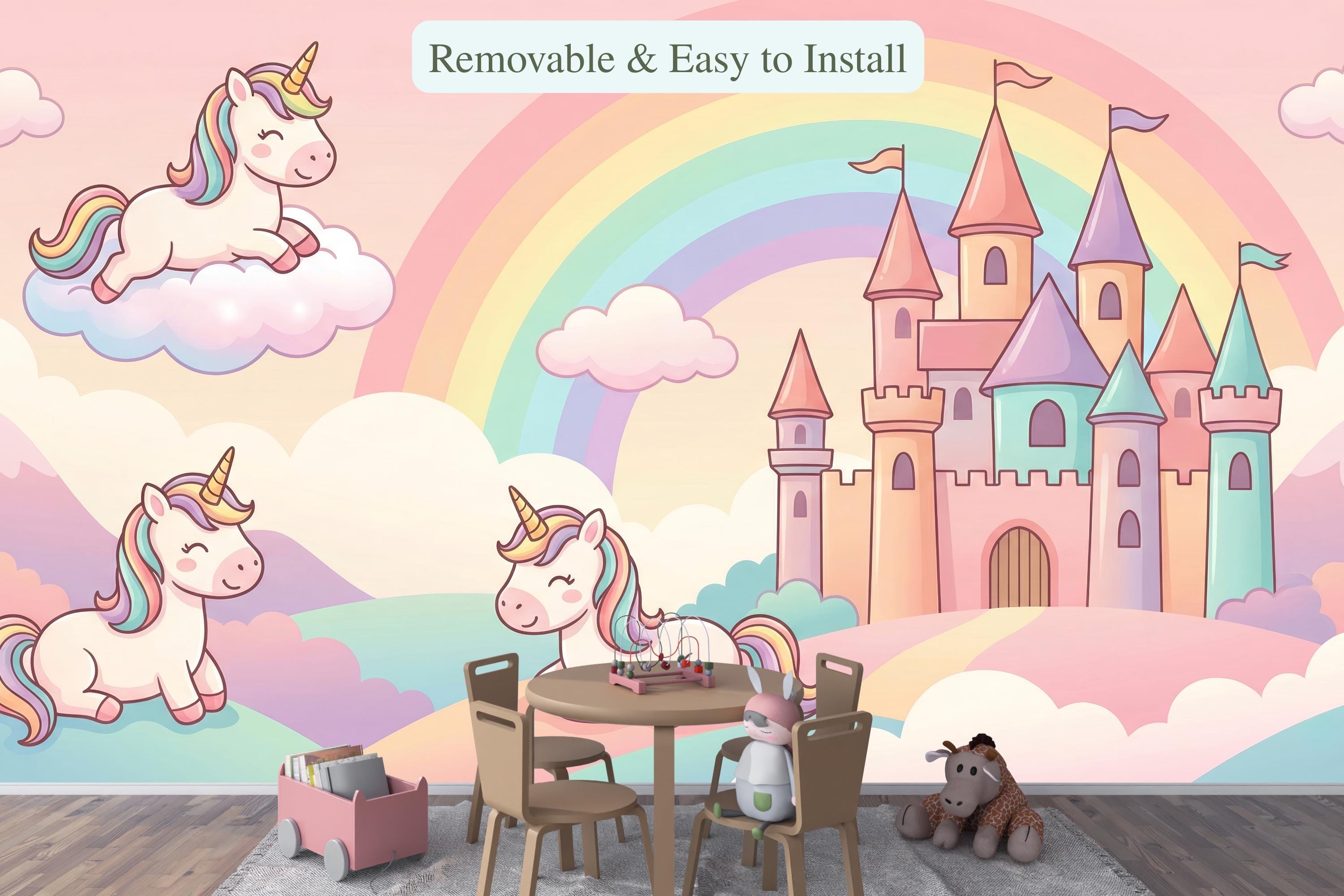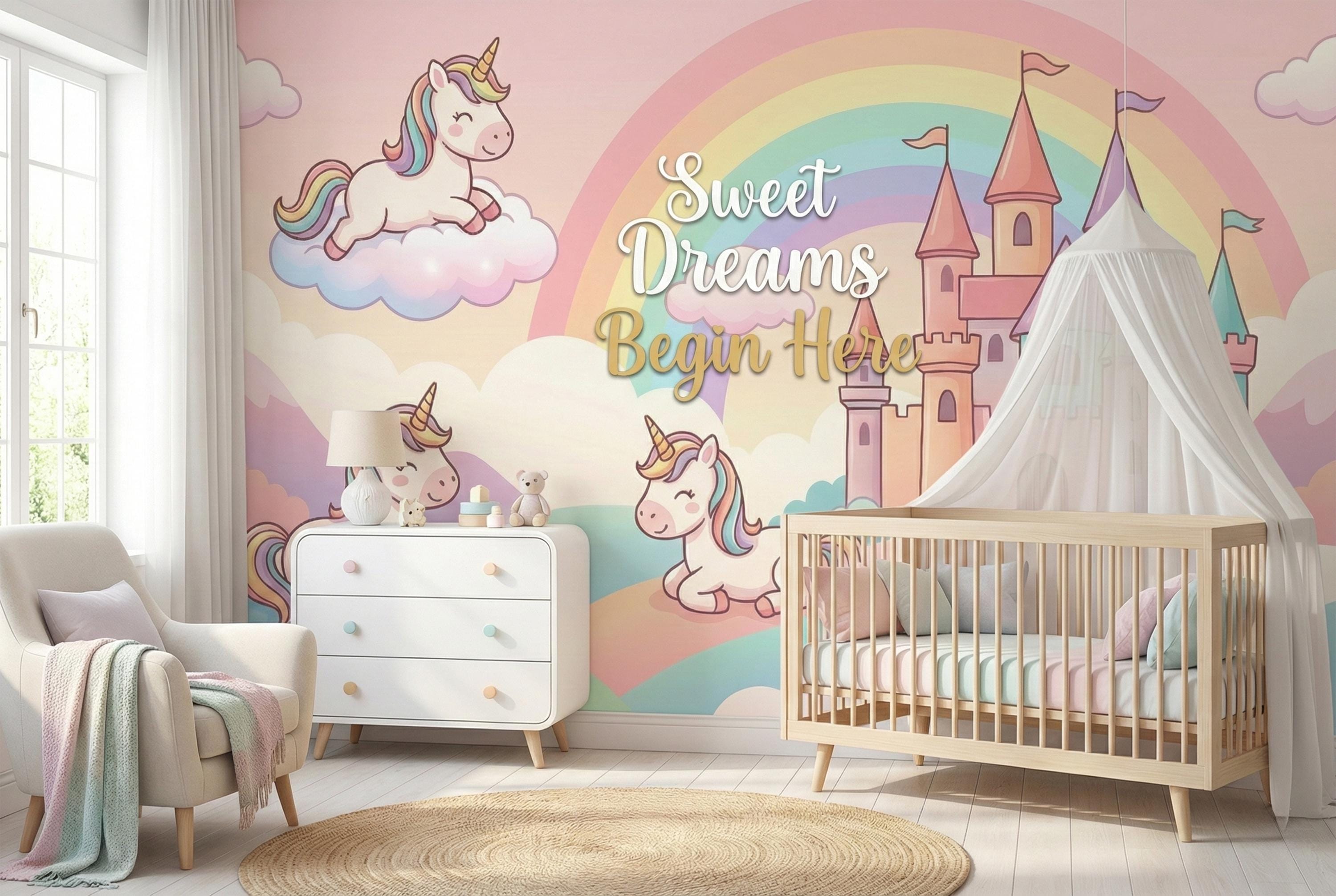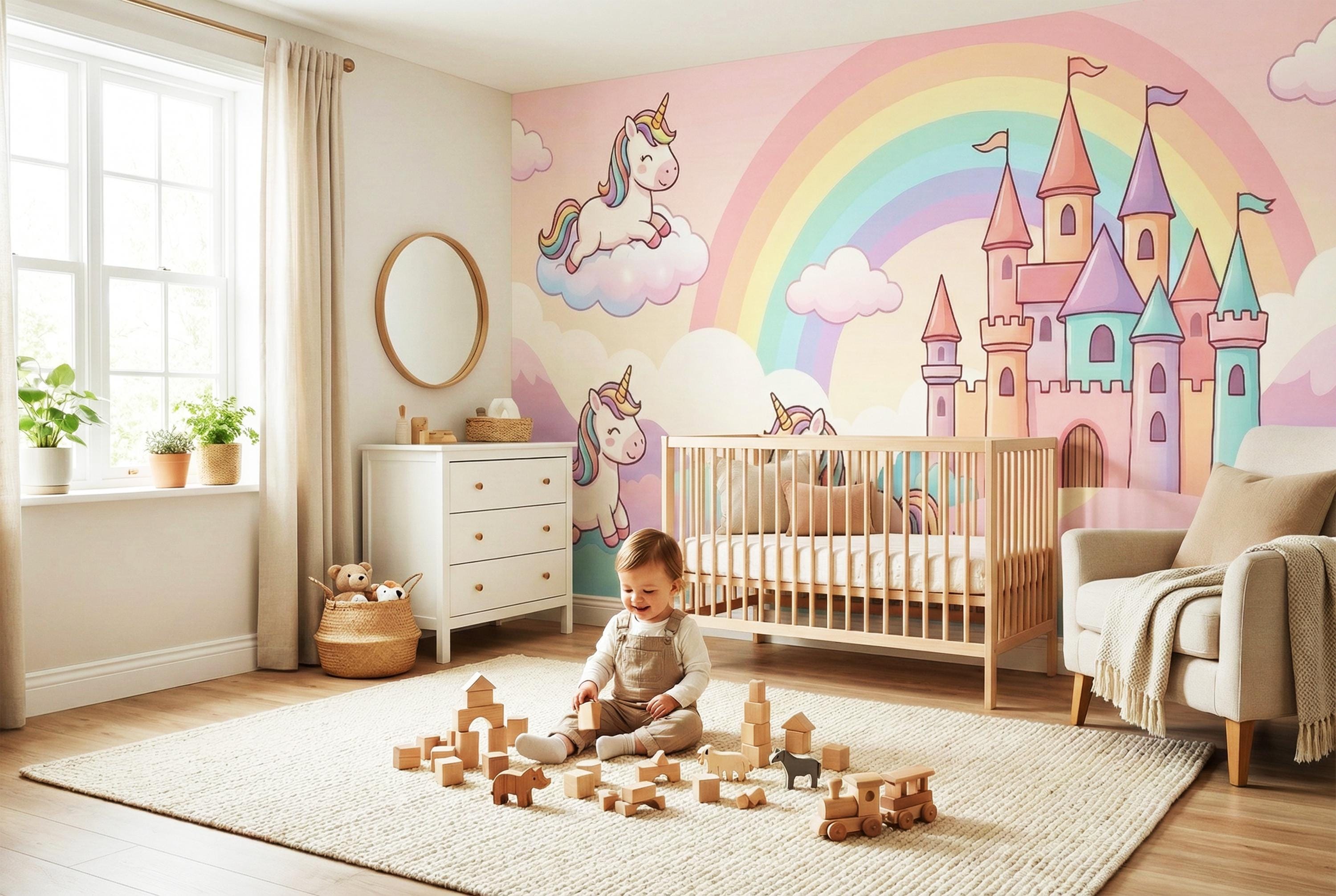 This pastel unicorn wallpaper turns any child’s room into a gentle fairytale world filled with rainbows, castles, and smiling unicorns. Soft colors, rounded shapes, and a calm fantasy atmosphere create a space where imagination feels safe, joyful, and magical.