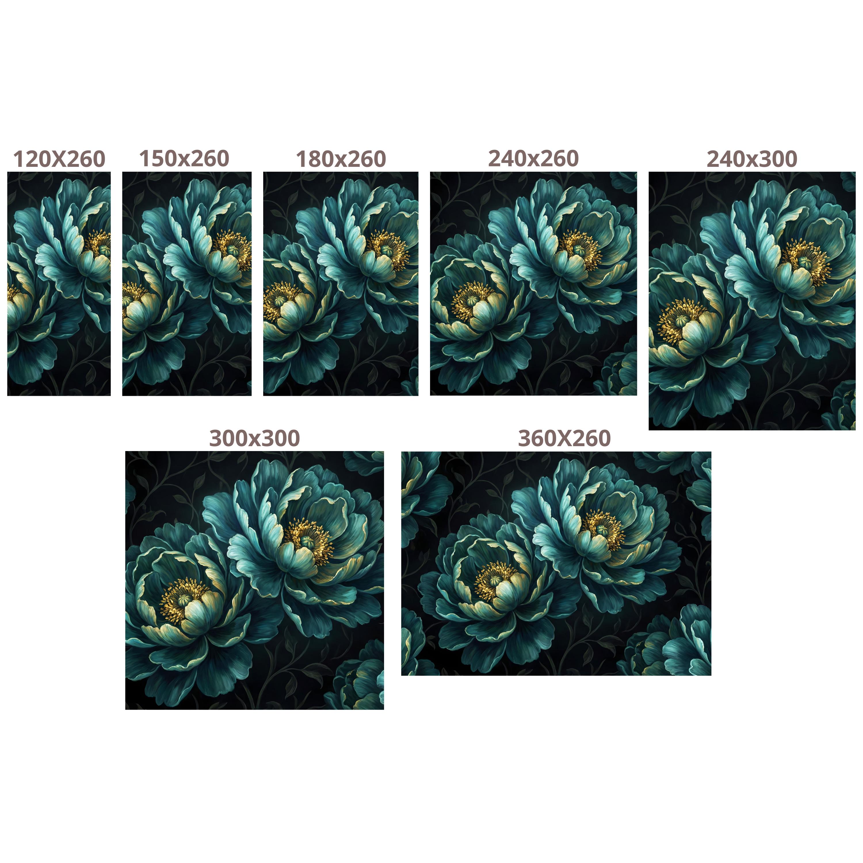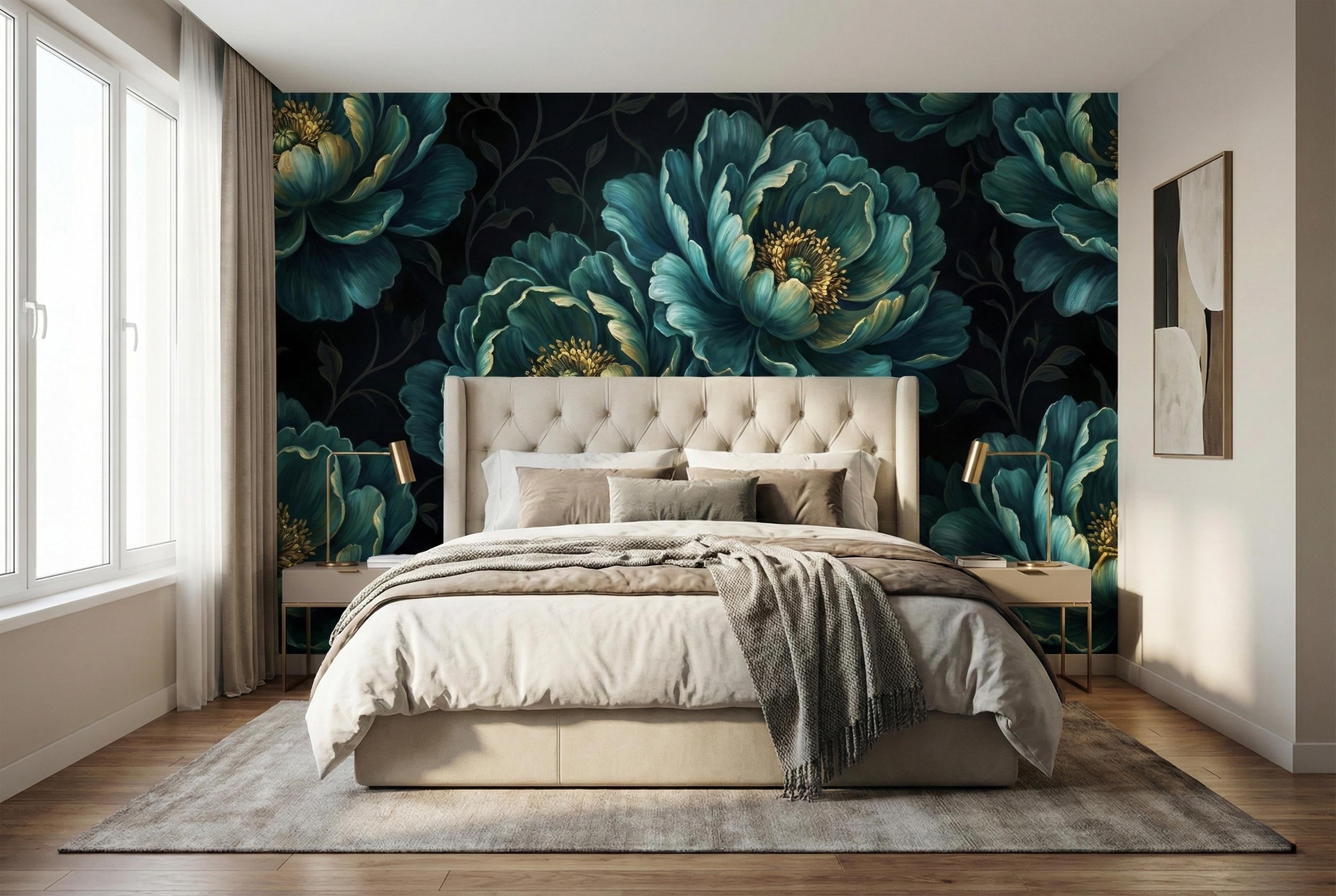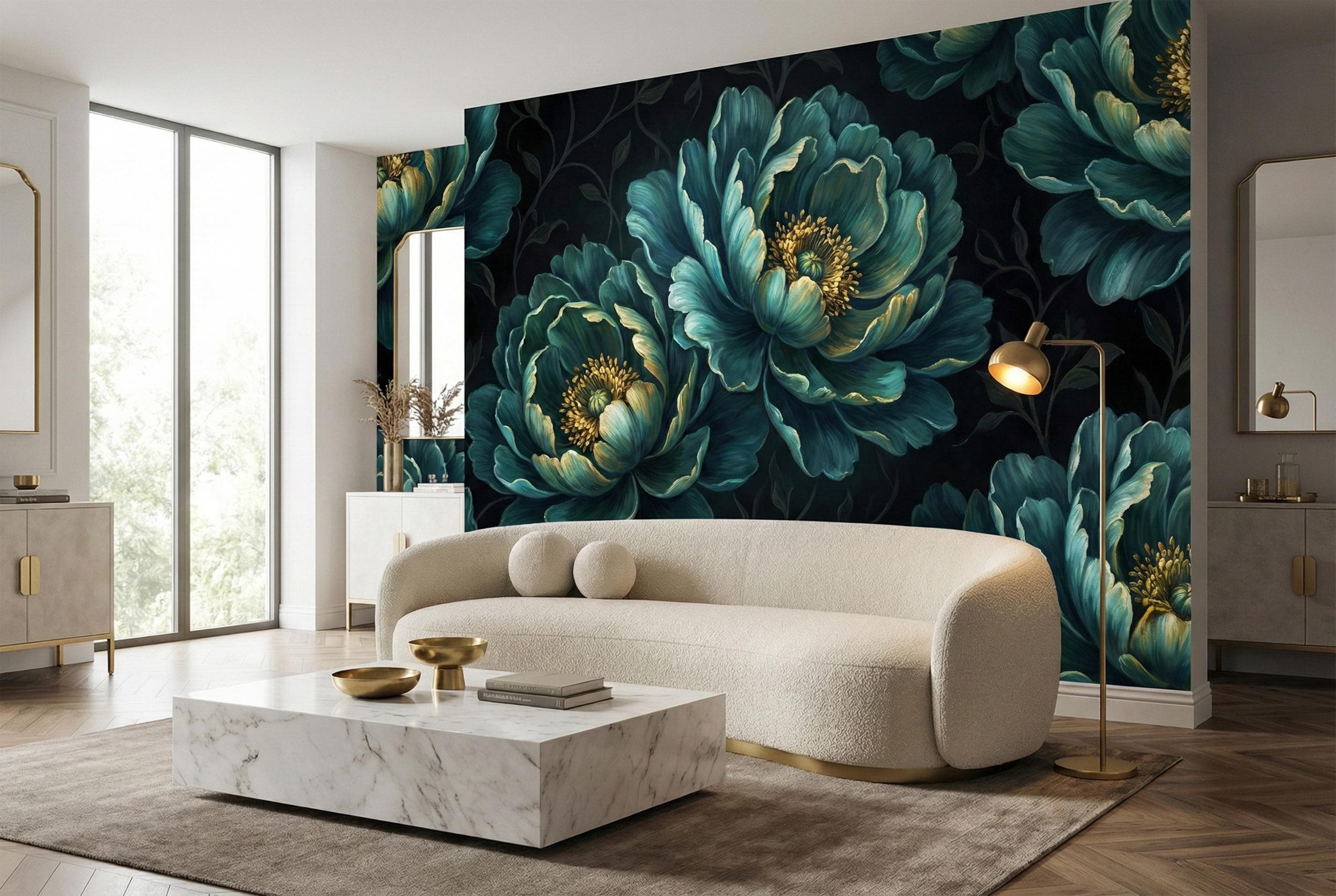 Deep teal peonies bloom against a dramatic black background, touched with soft golden highlights that catch the light like fine art. The result is bold, emotional, and undeniably luxurious. This is a statement wall designed for interiors that embrace depth, contrast, and quiet confidence.