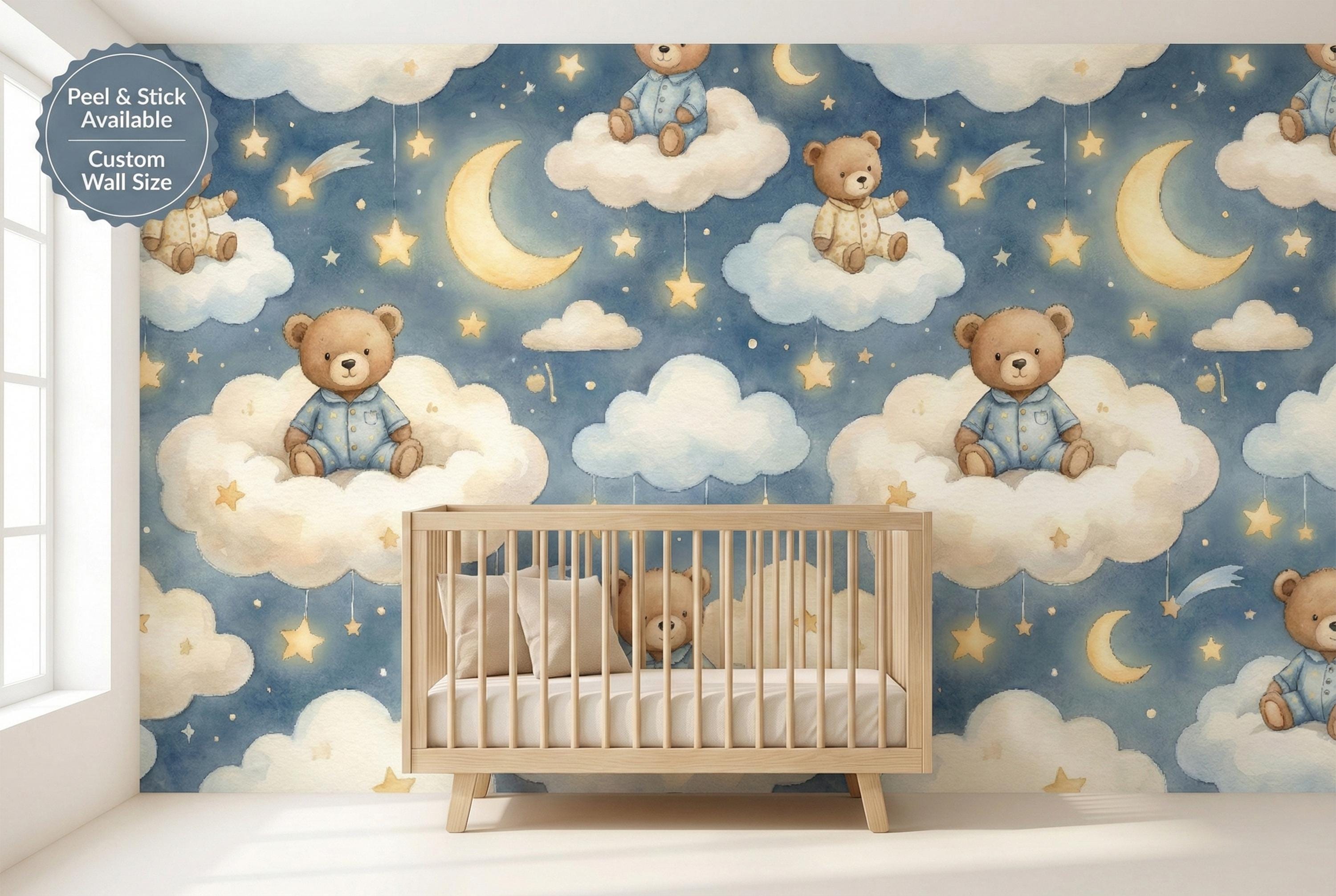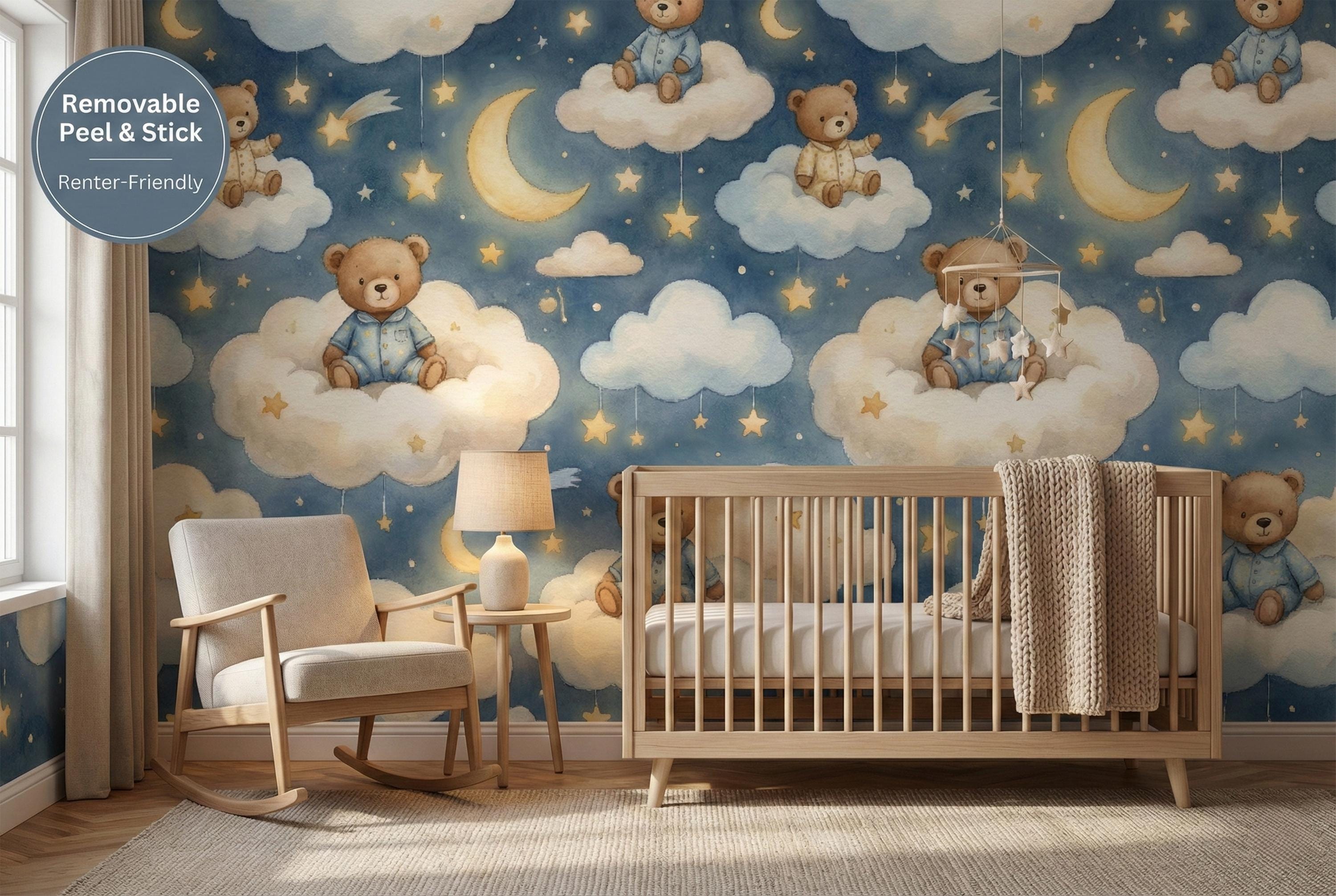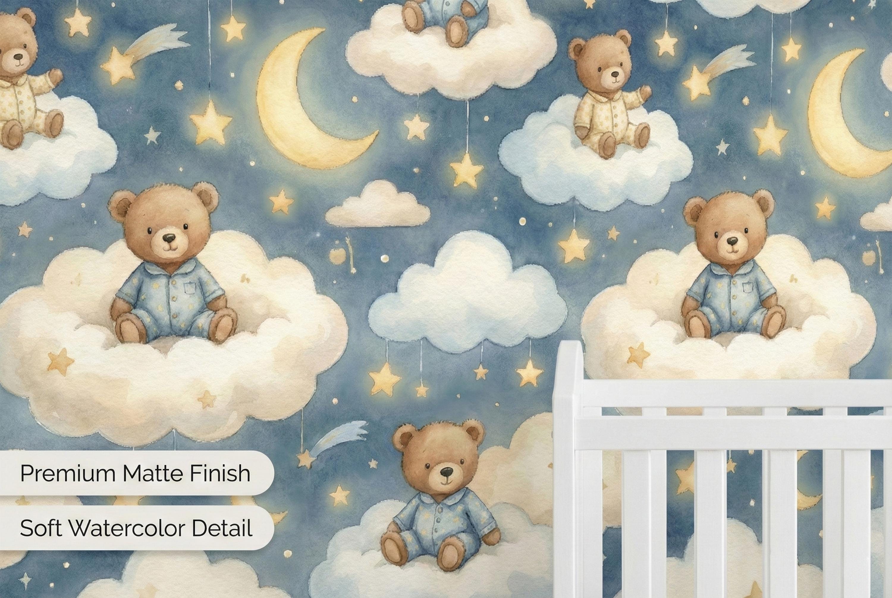 Soft navy tones, watercolor clouds, moons, and teddy bears create a cozy, calming bedtime atmosphere your little one will love.