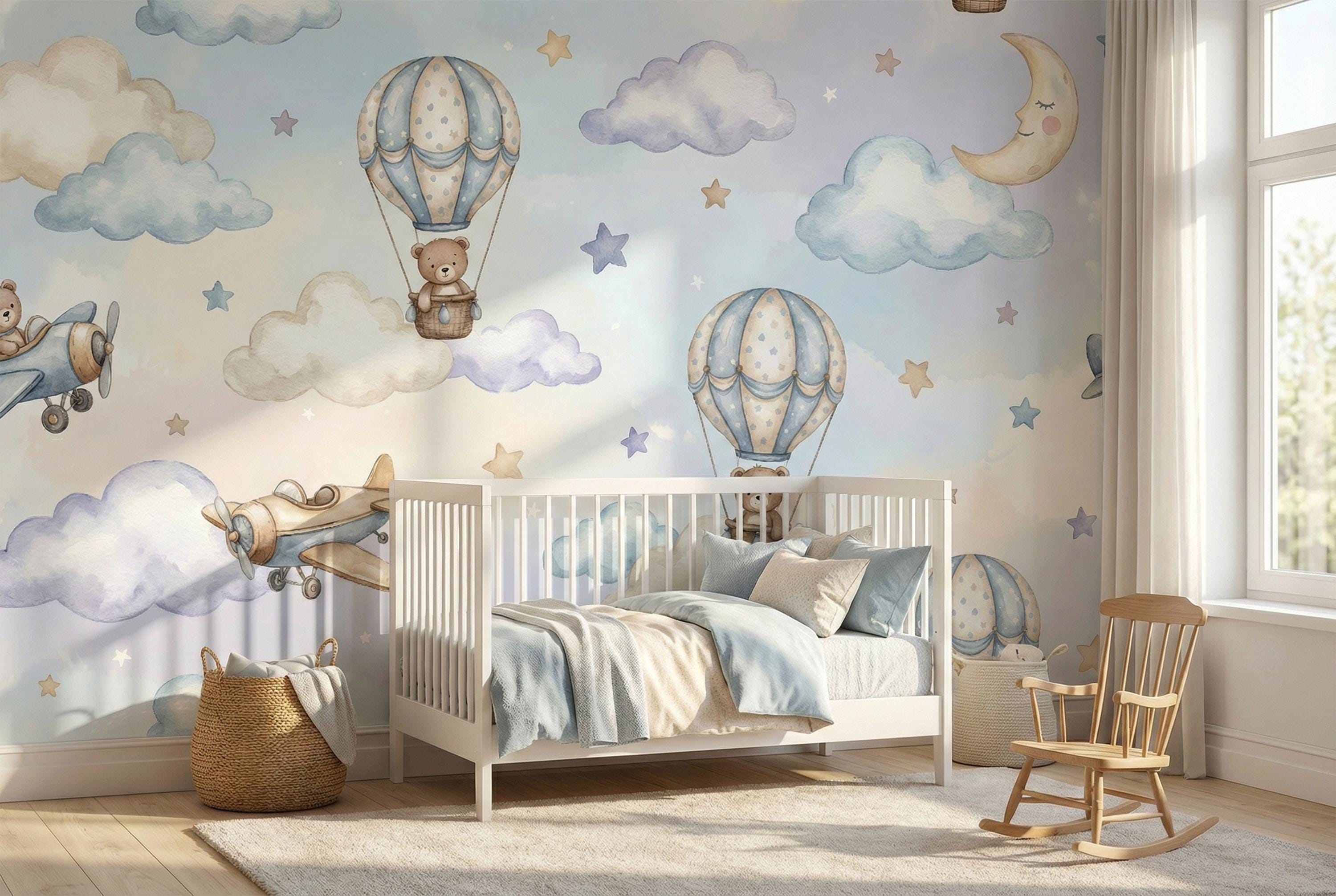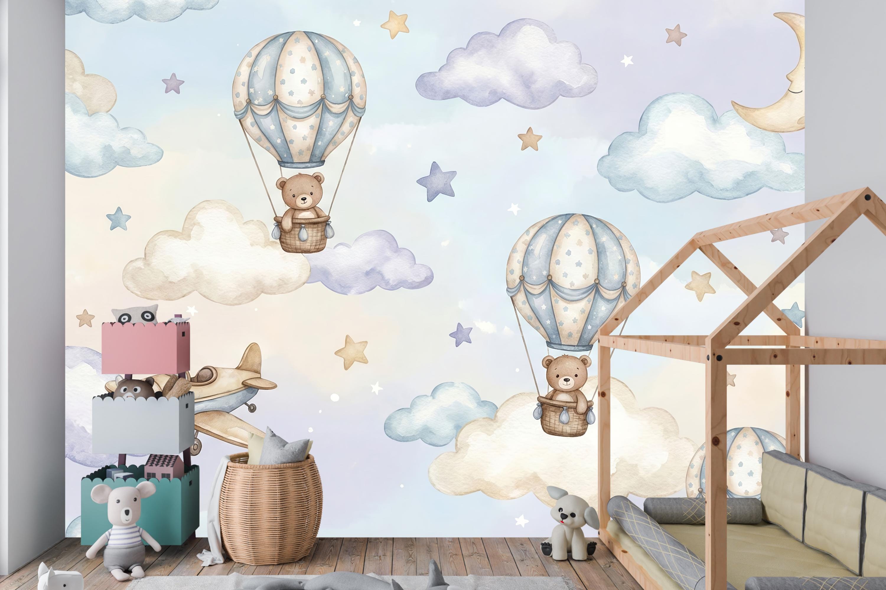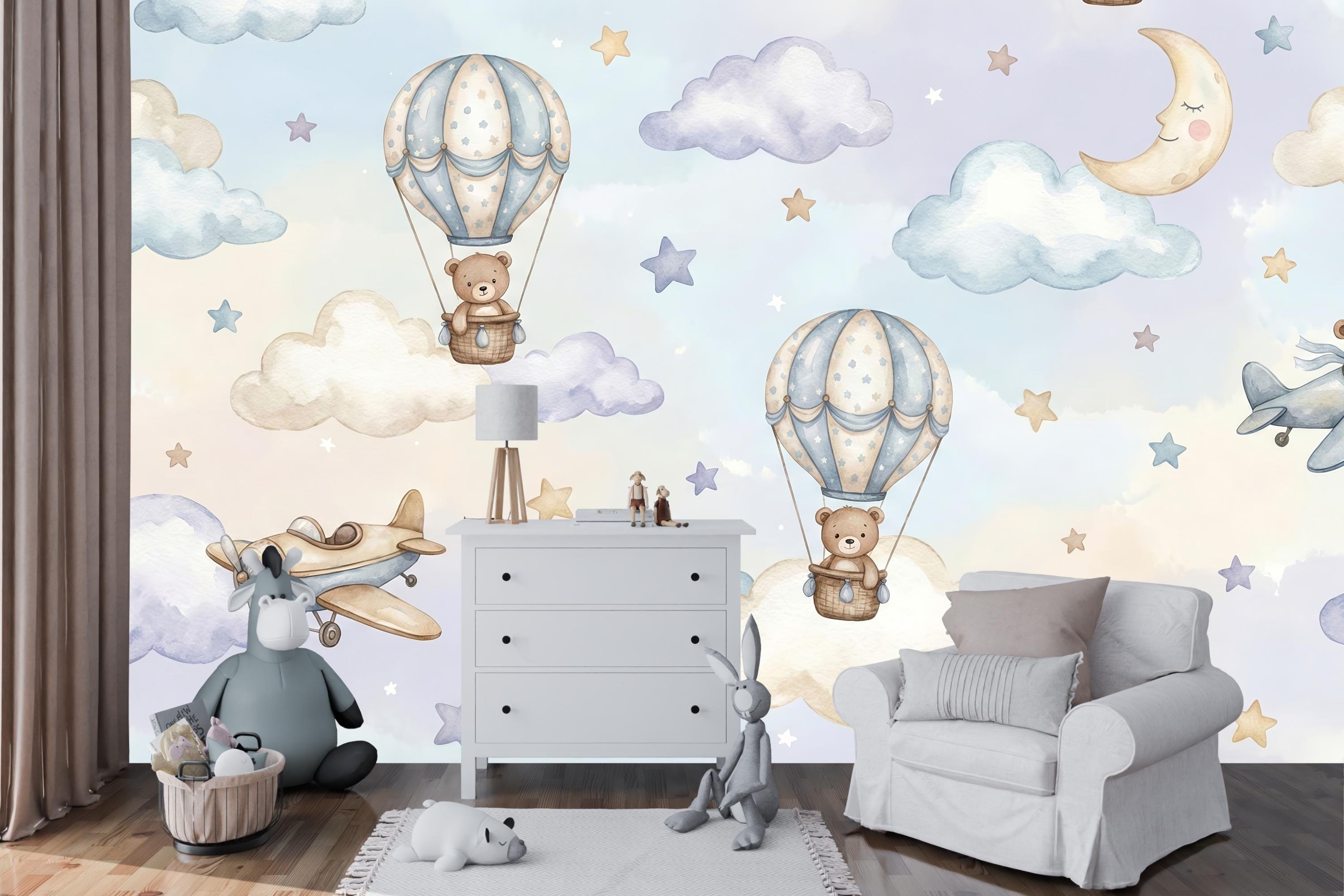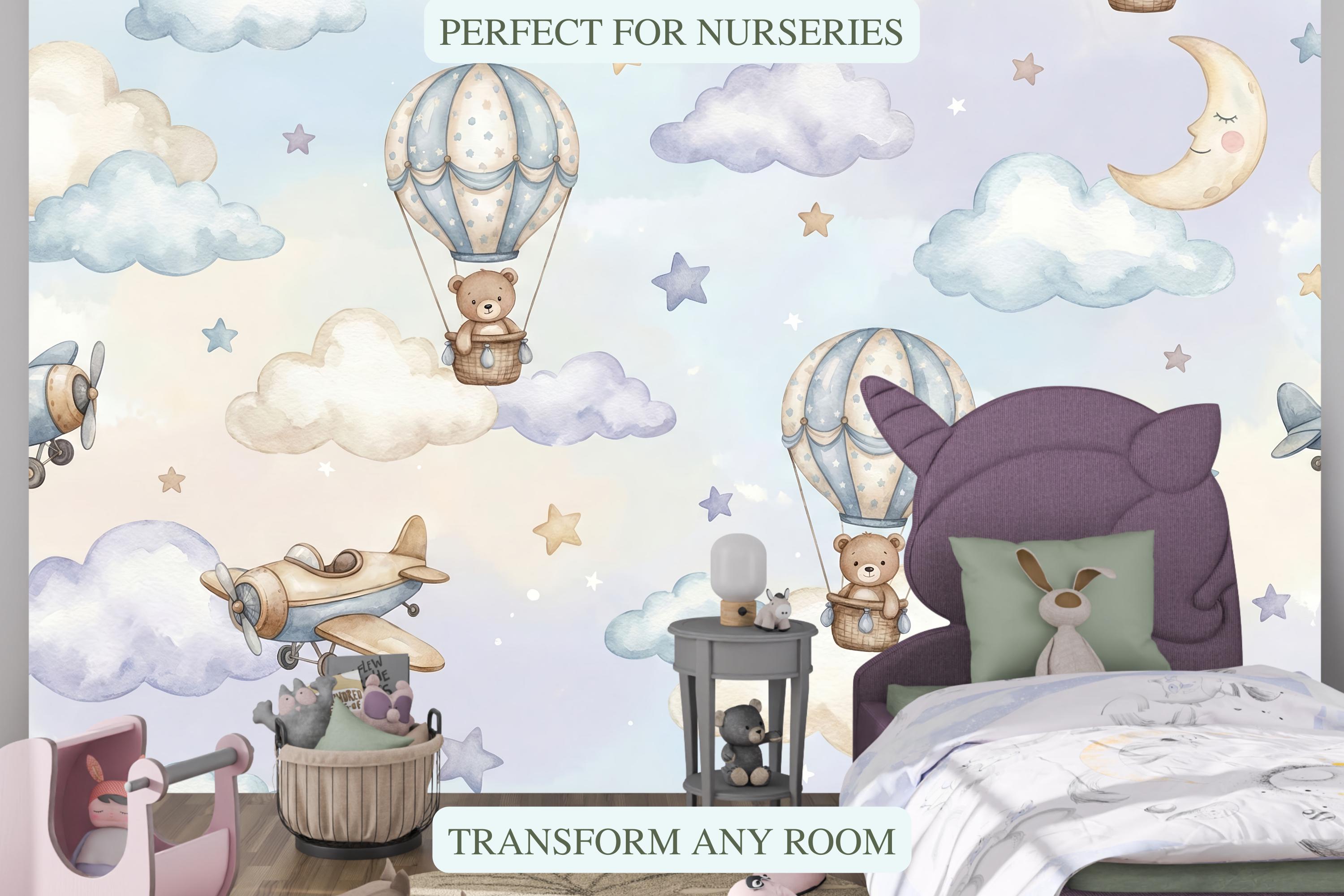 Transform your baby's room into a whimsical sky full of wonder with this enchanting watercolor nursery wallpaper. Imagine your little one drifting off to sleep beneath a gentle parade of brave teddy bear pilots, soaring in vintage airplanes and drifting in cozy hot air balloons.