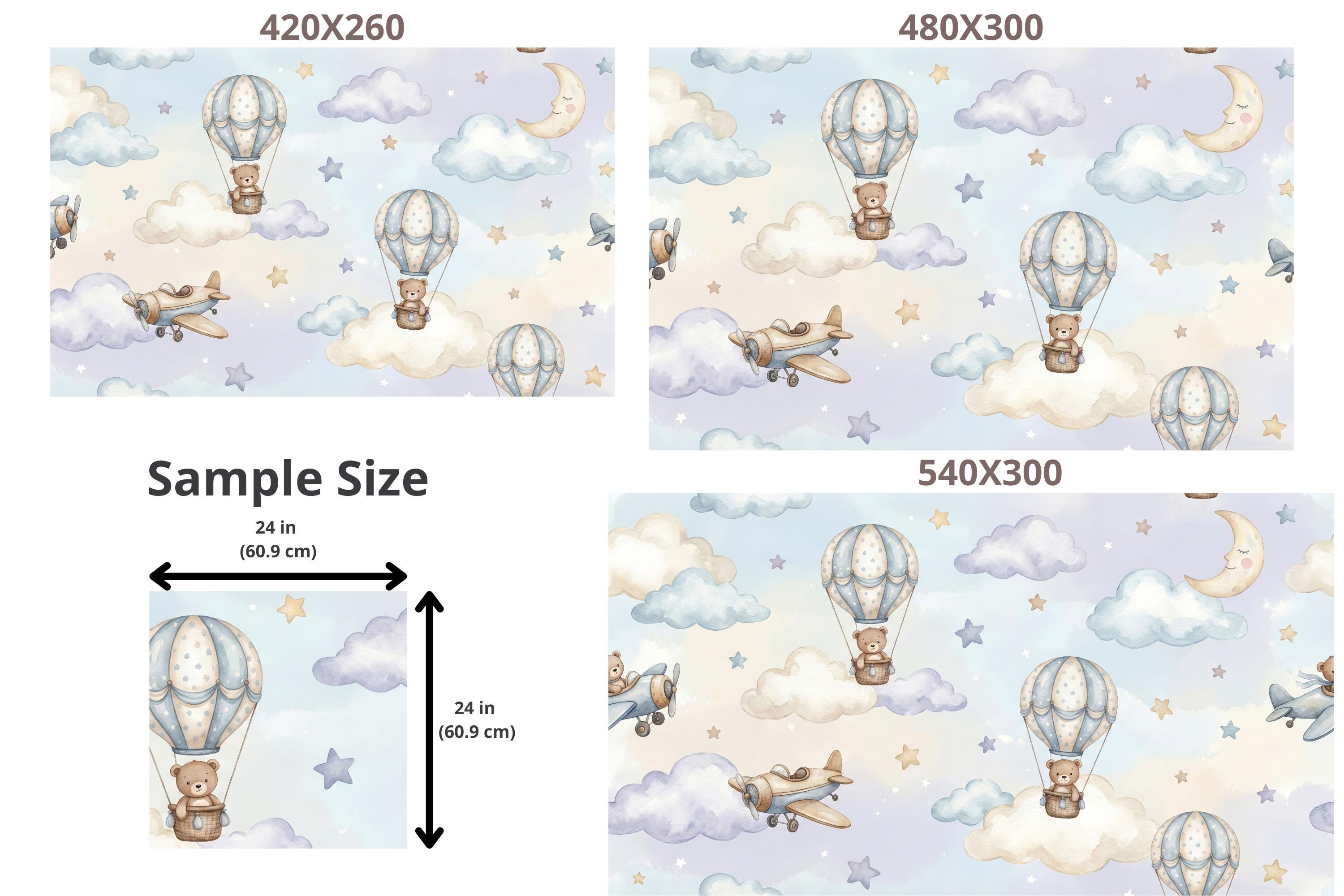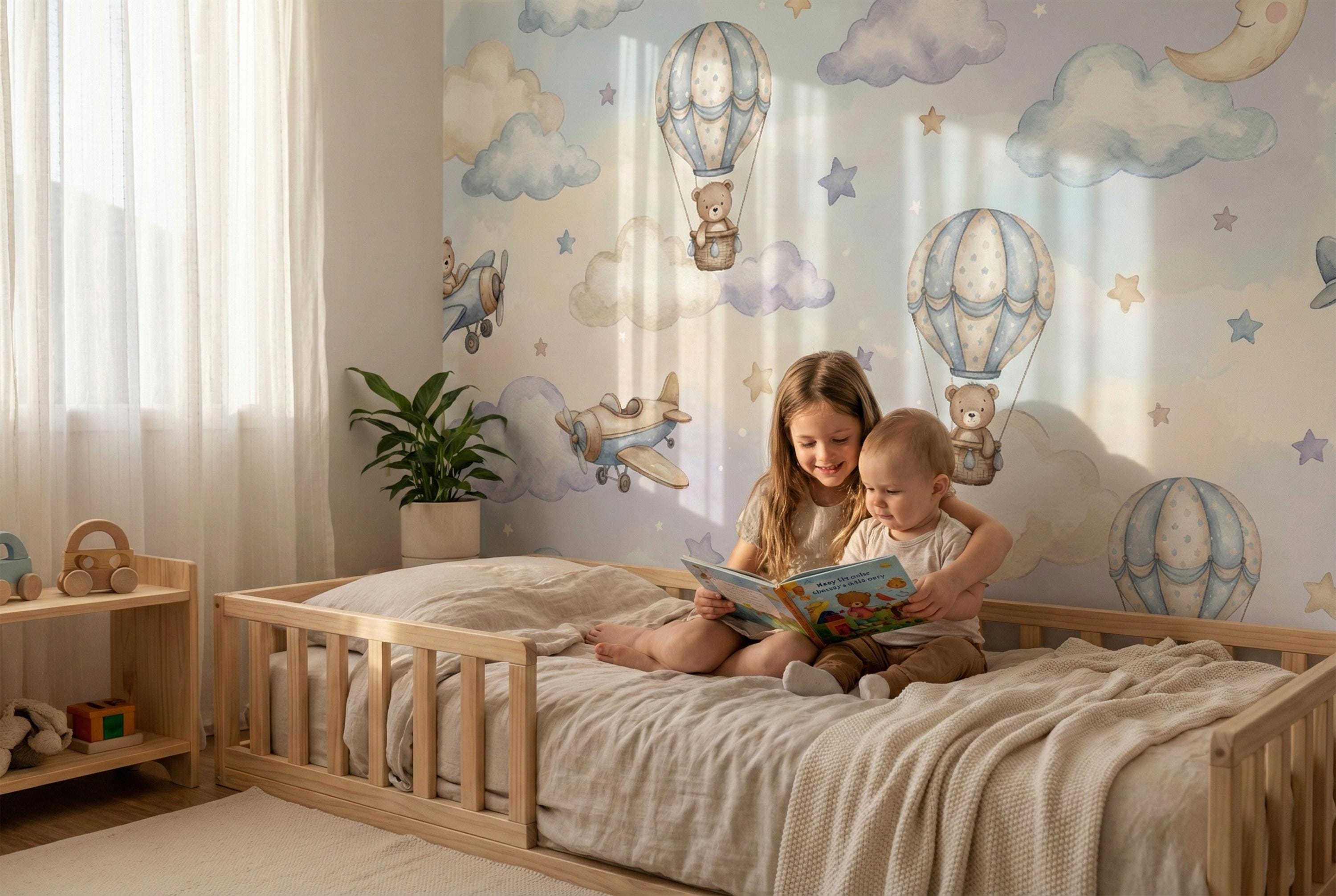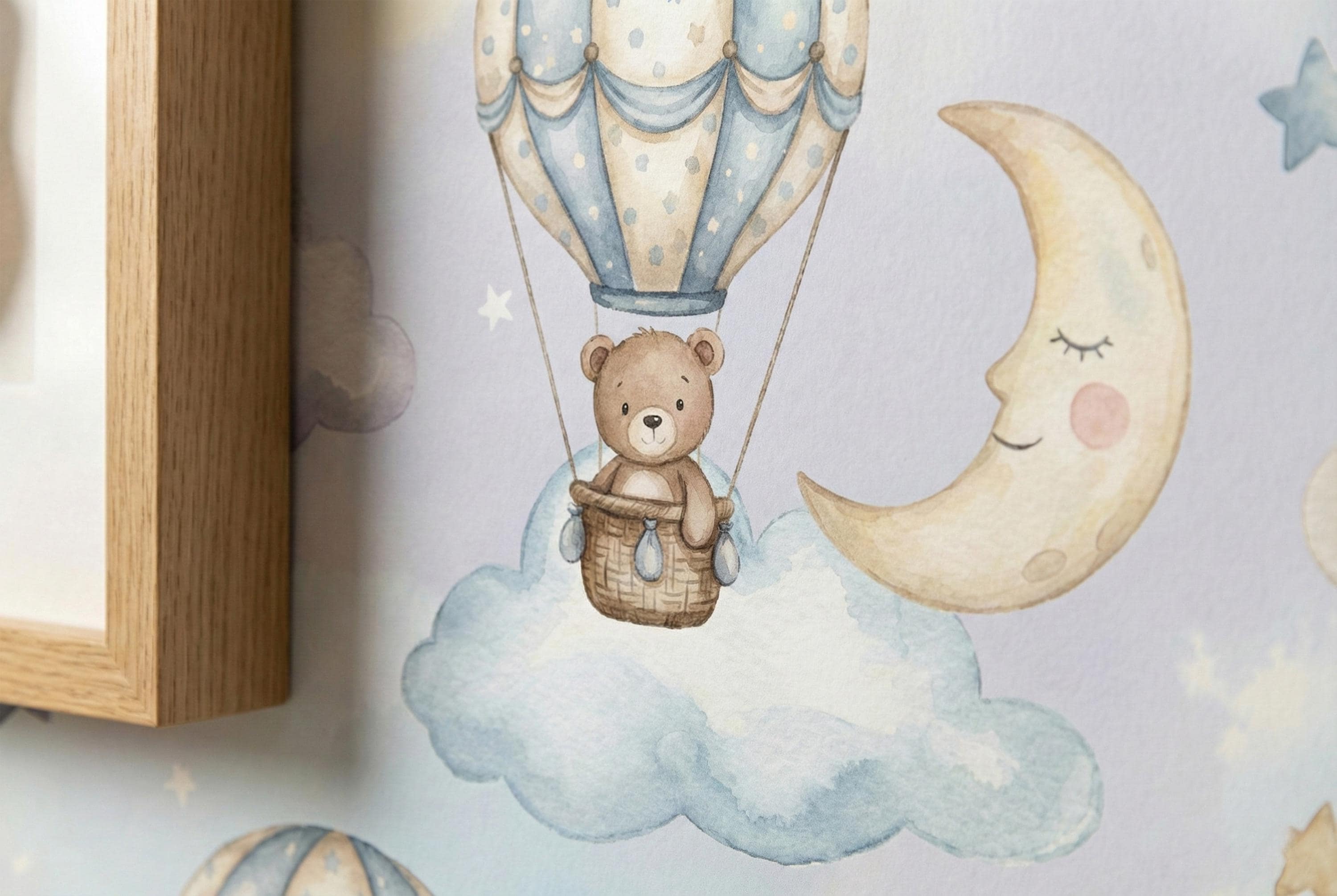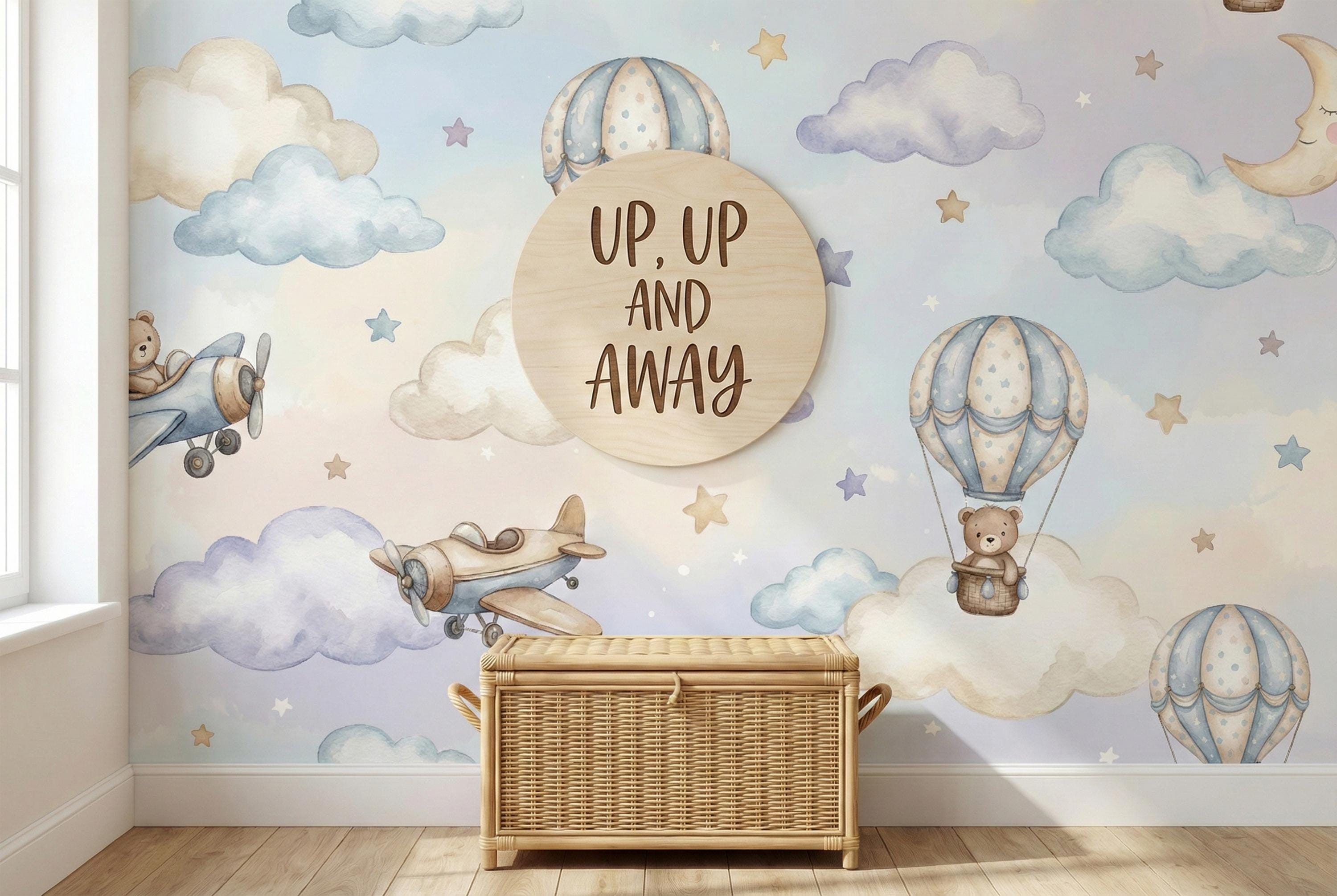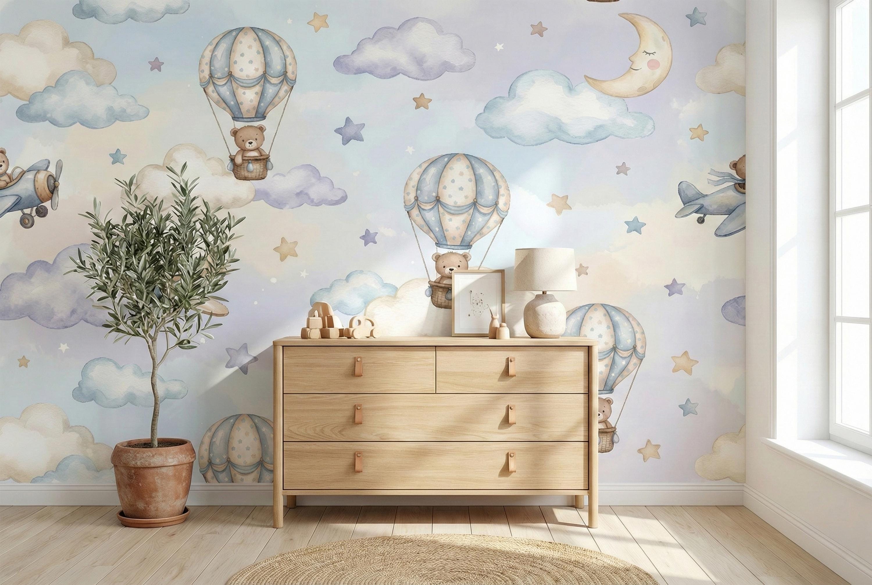 Transform your baby's room into a whimsical sky full of wonder with this enchanting watercolor nursery wallpaper. Imagine your little one drifting off to sleep beneath a gentle parade of brave teddy bear pilots, soaring in vintage airplanes and drifting in cozy hot air balloons.