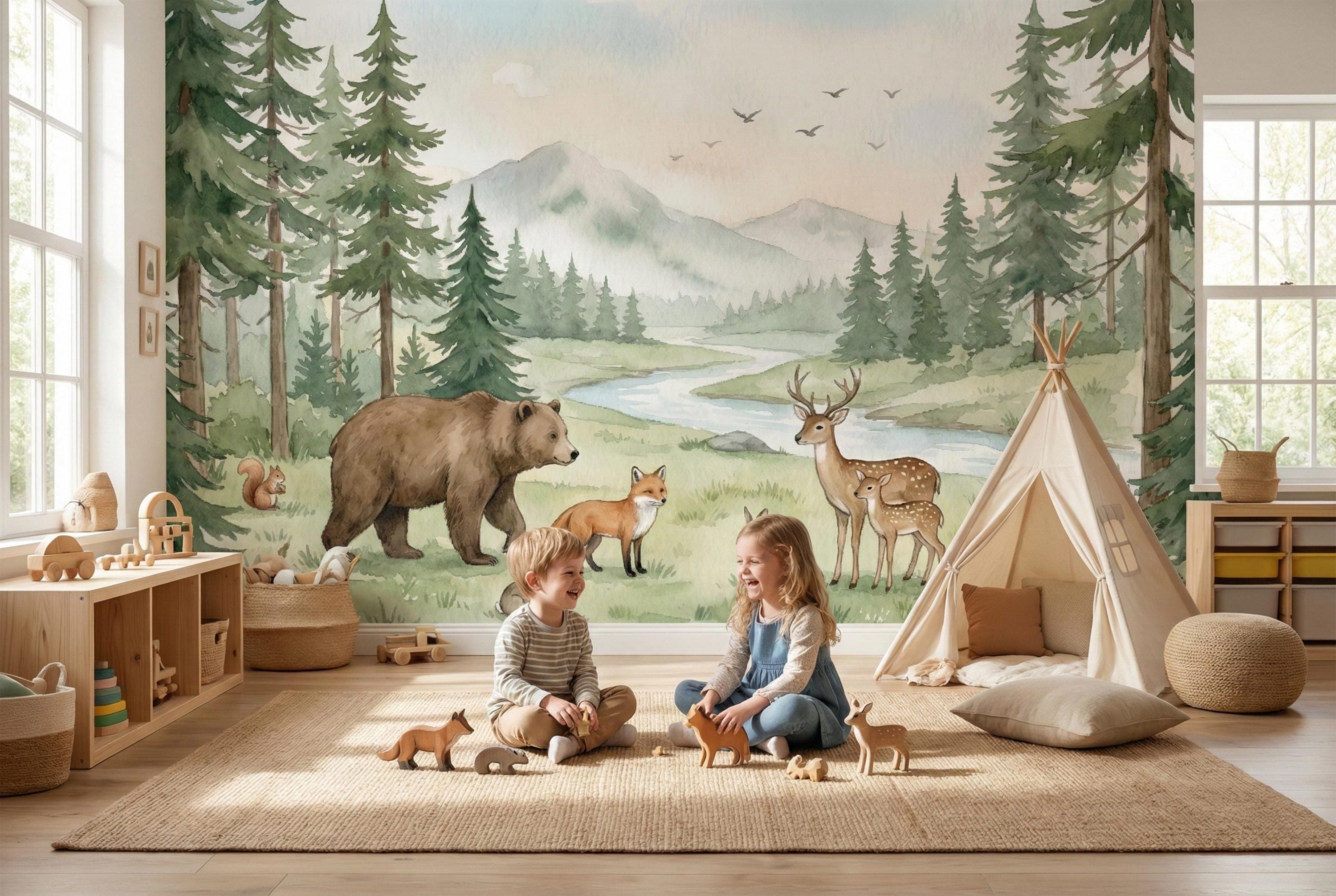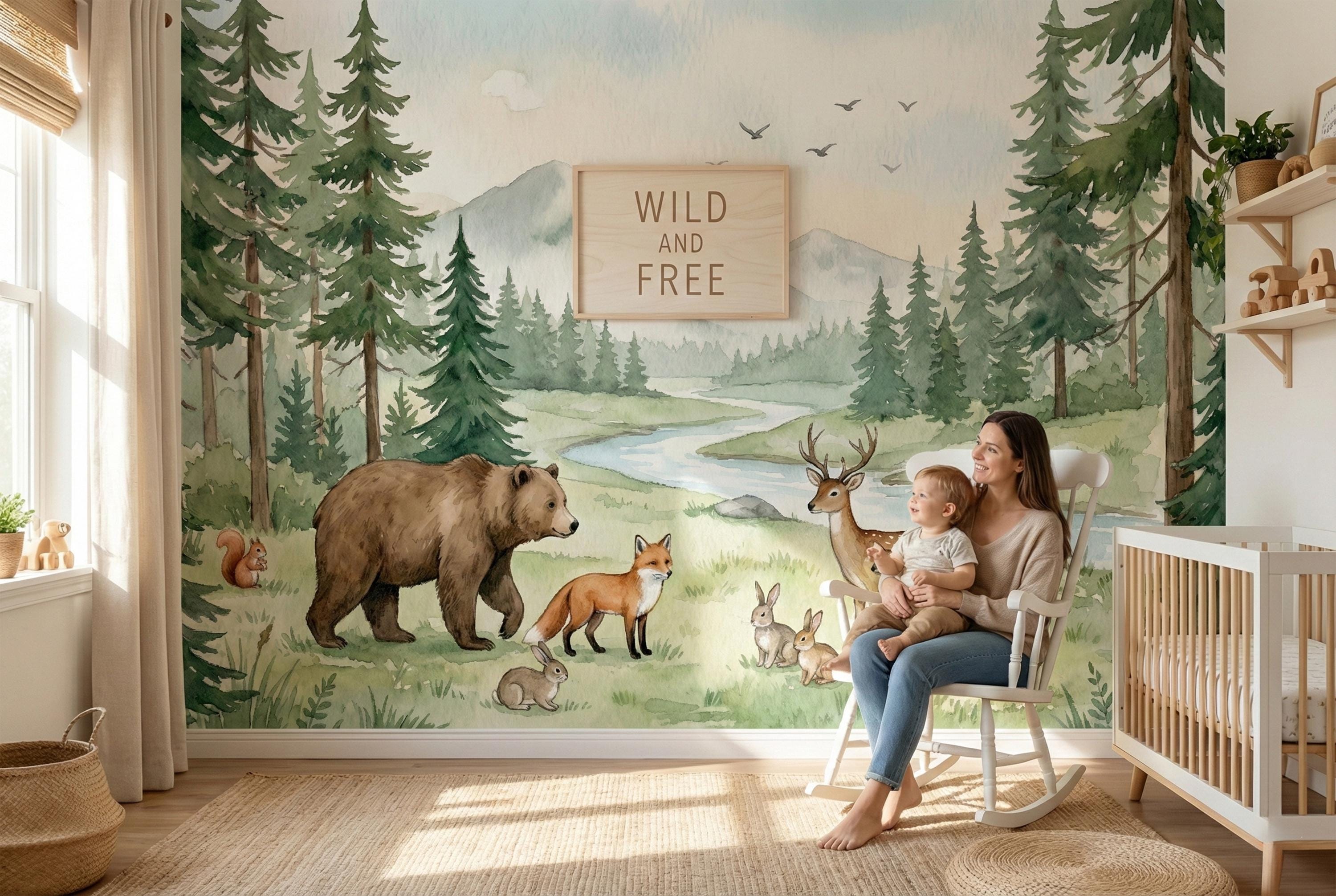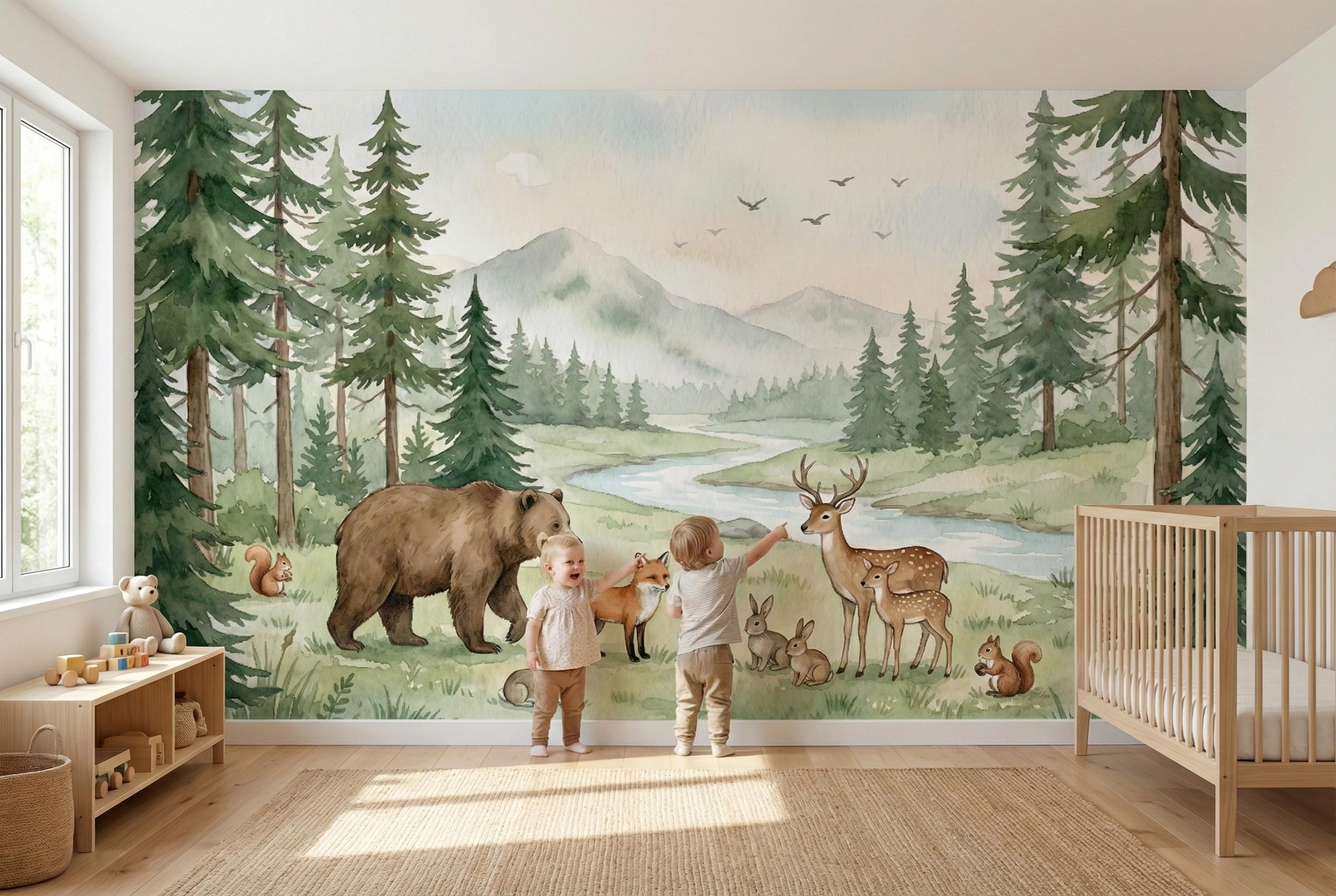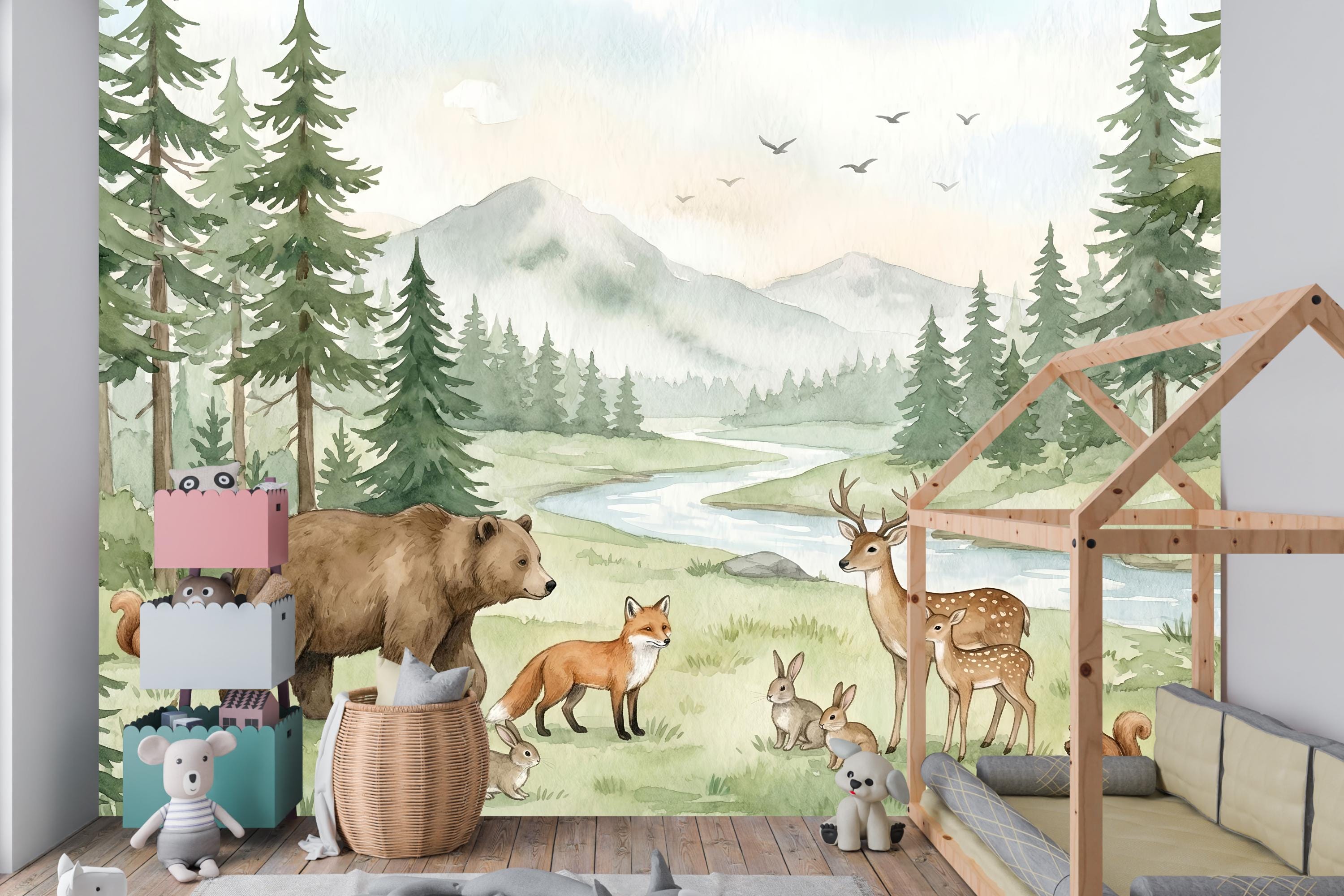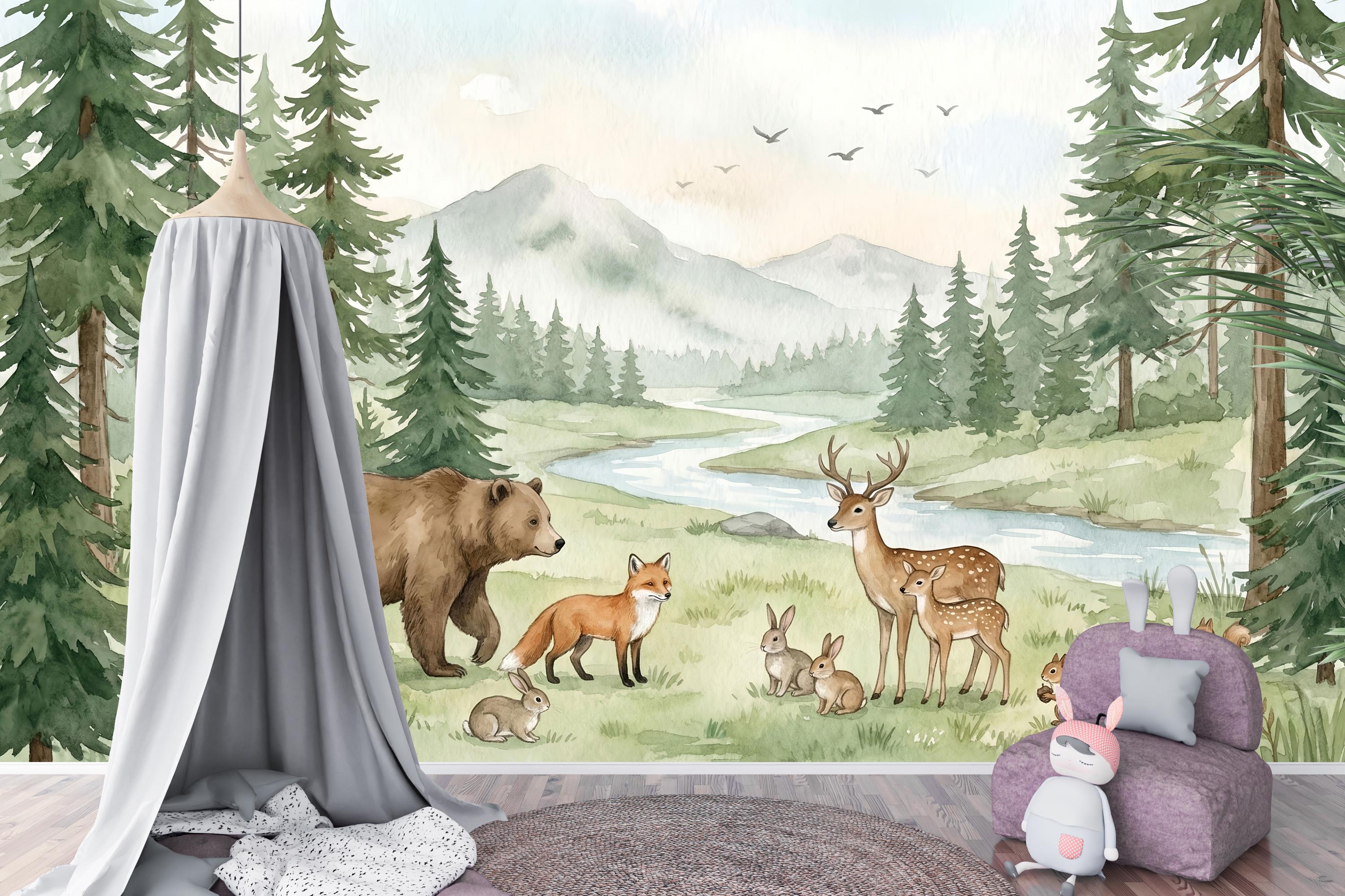 Hand-painted in a soft, dreamy watercolor style, this mural brings the calming beauty of nature right into your home. The gentle greens, browns, and blues create a serene sanctuary, perfect for a nursery, playroom, or bedroom. It's a timeless design that will grow with your child, from their first days to their imaginative toddler years and beyond.