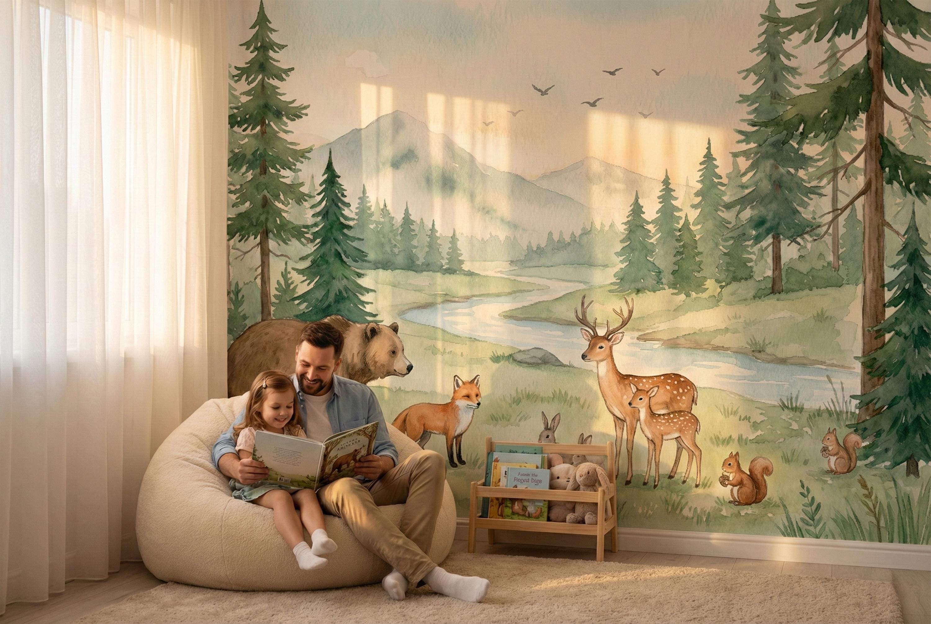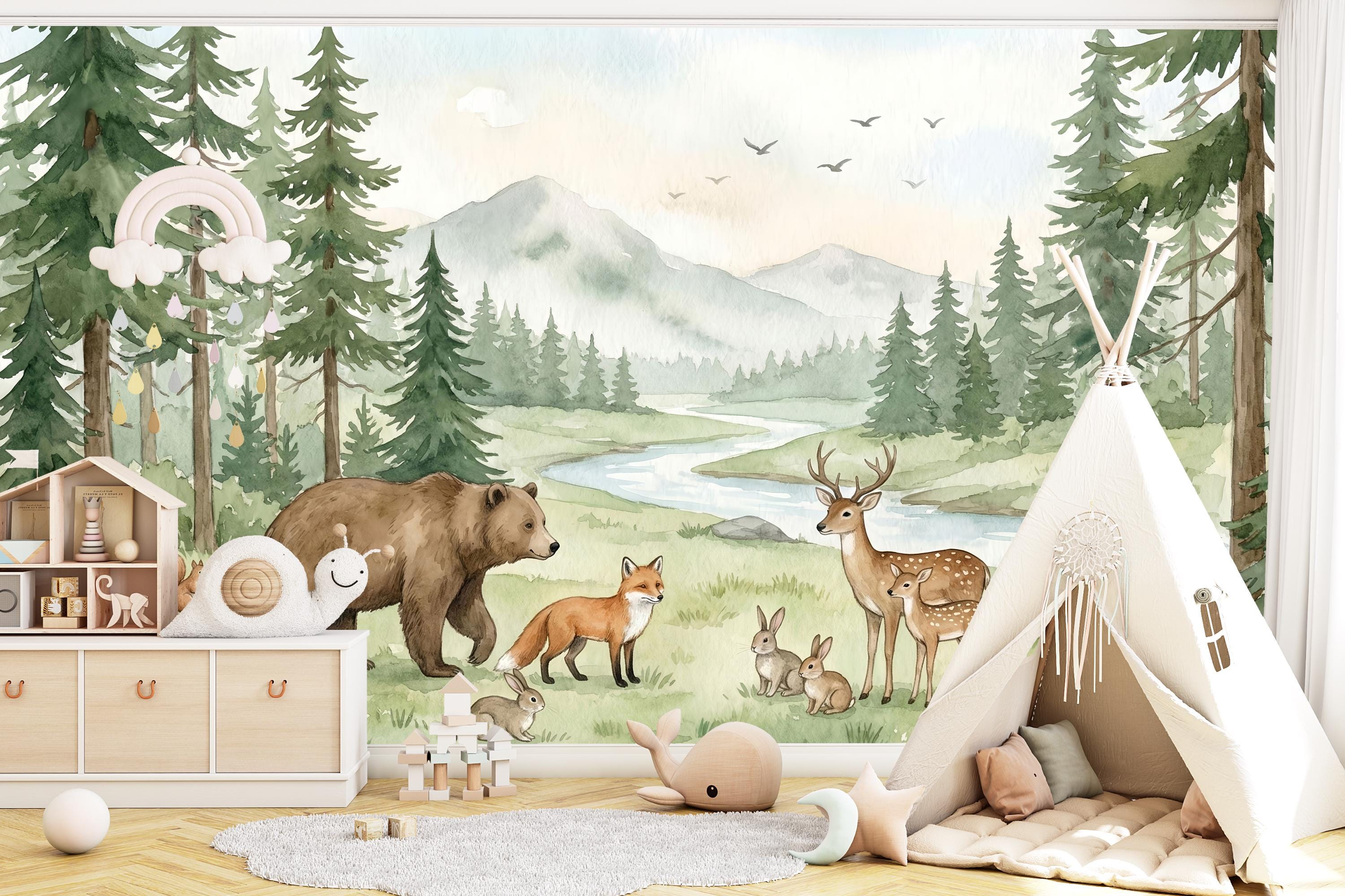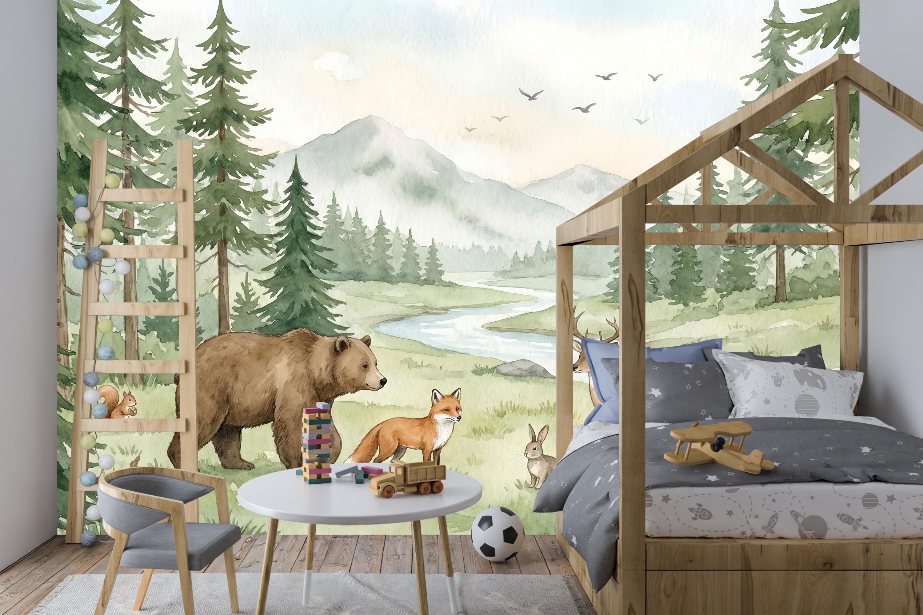 Transform your child's room into a magical forest where imagination runs free. Our "Whimsical Woodland" wallpaper isn't just decor; it's a daily invitation to adventure. Picture the bedtime stories you'll tell as you point out the friendly brown bear strolling by the river, the graceful deer and her fawn, the playful fox, and the busy squirrels and rabbits.