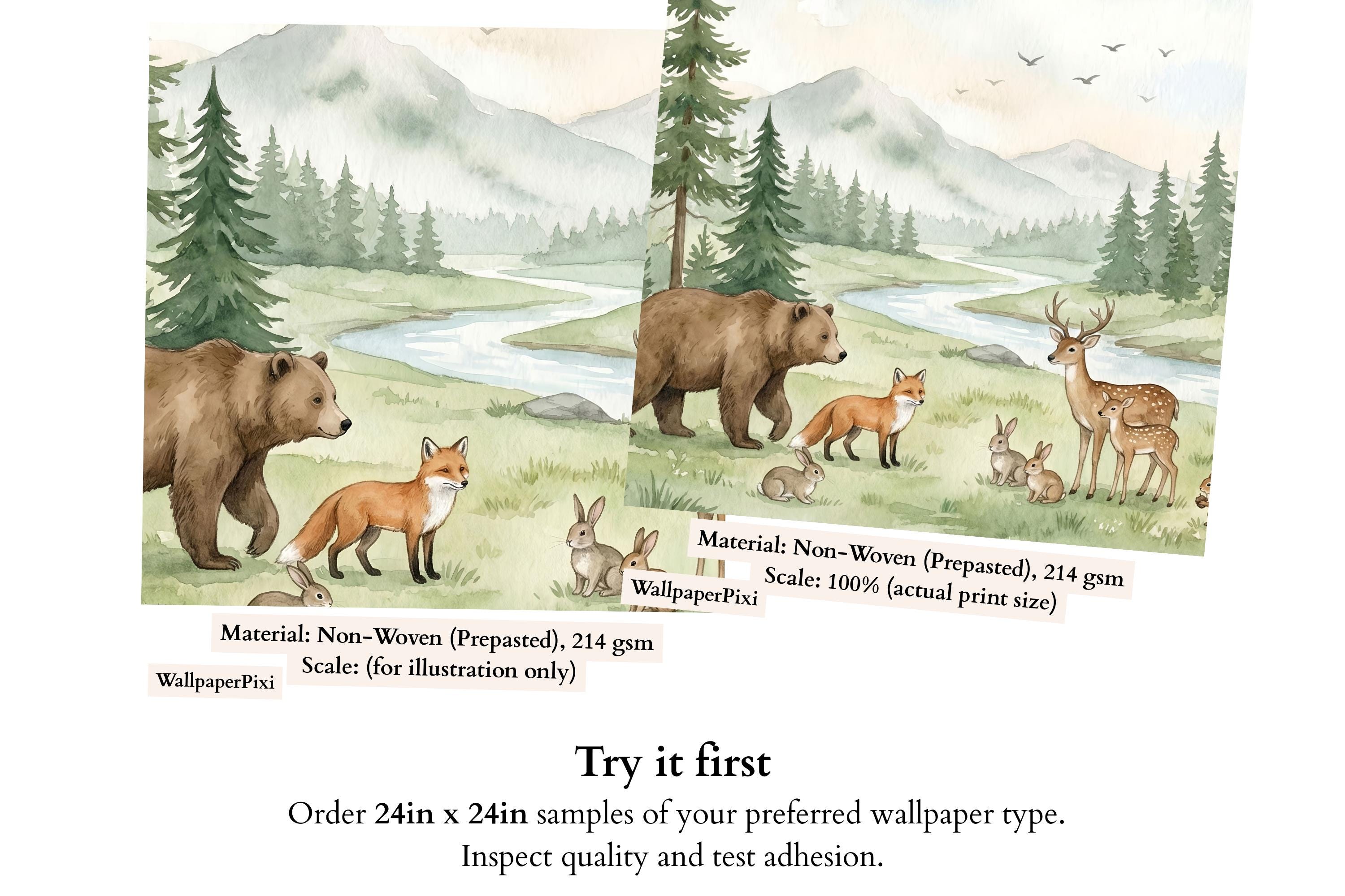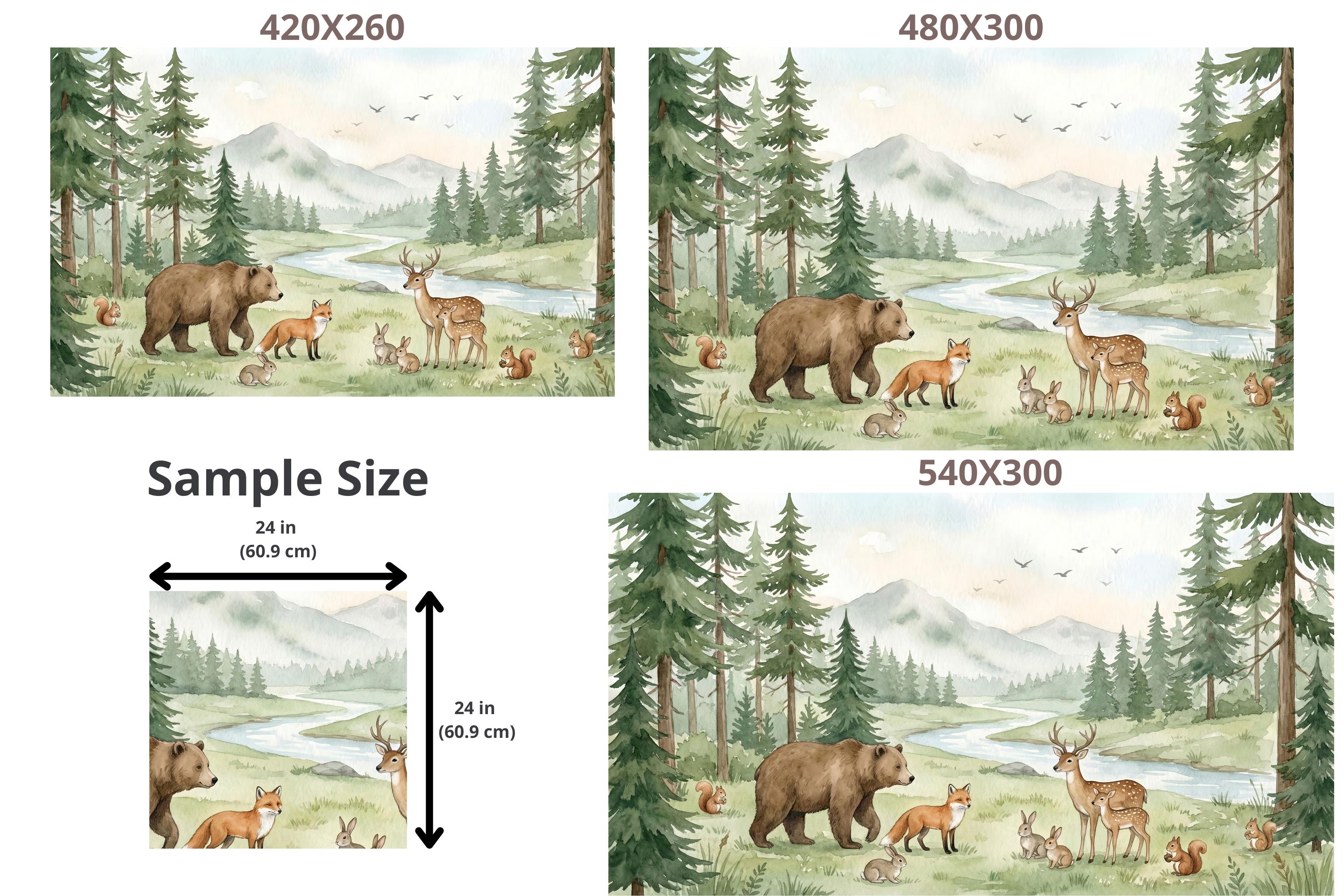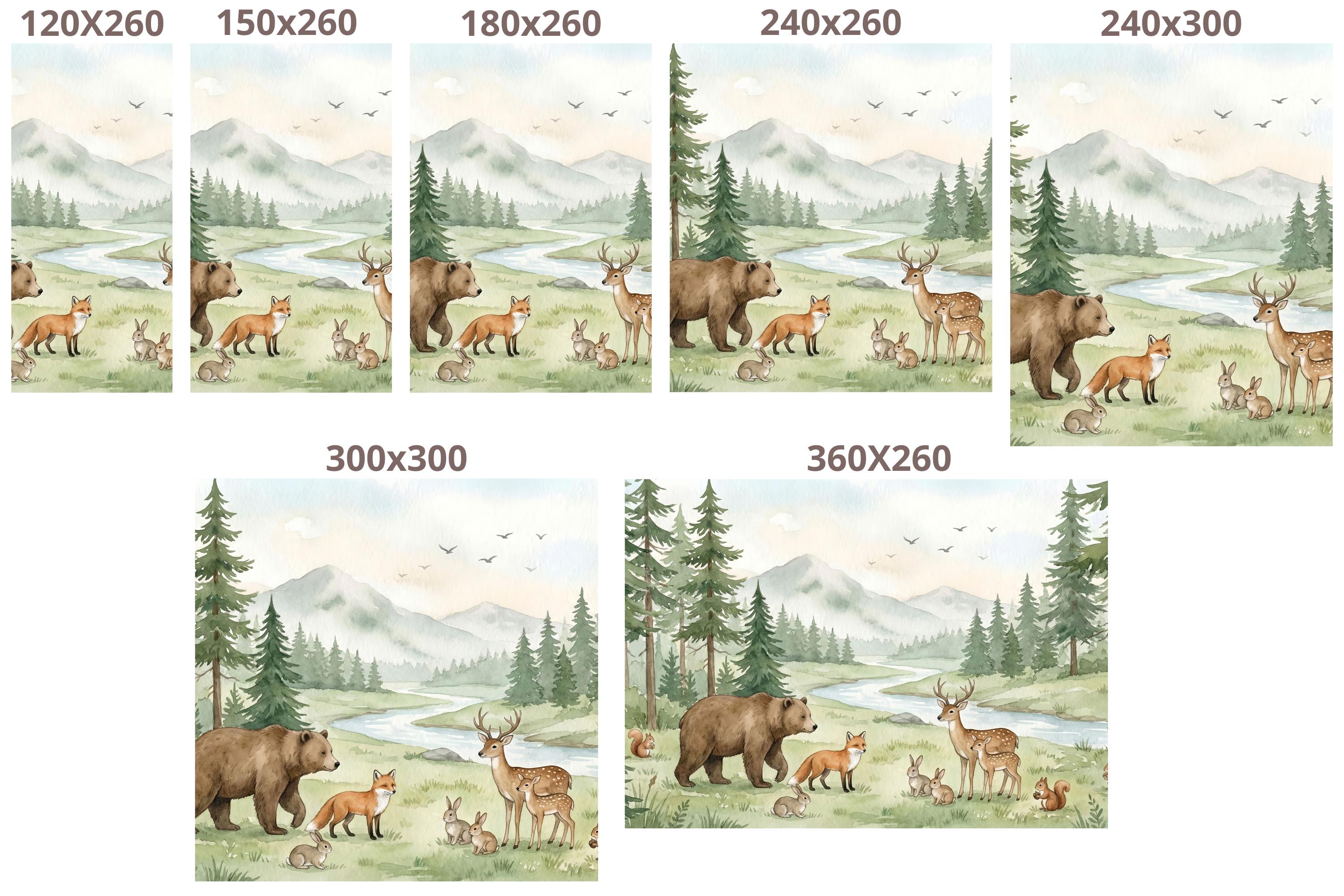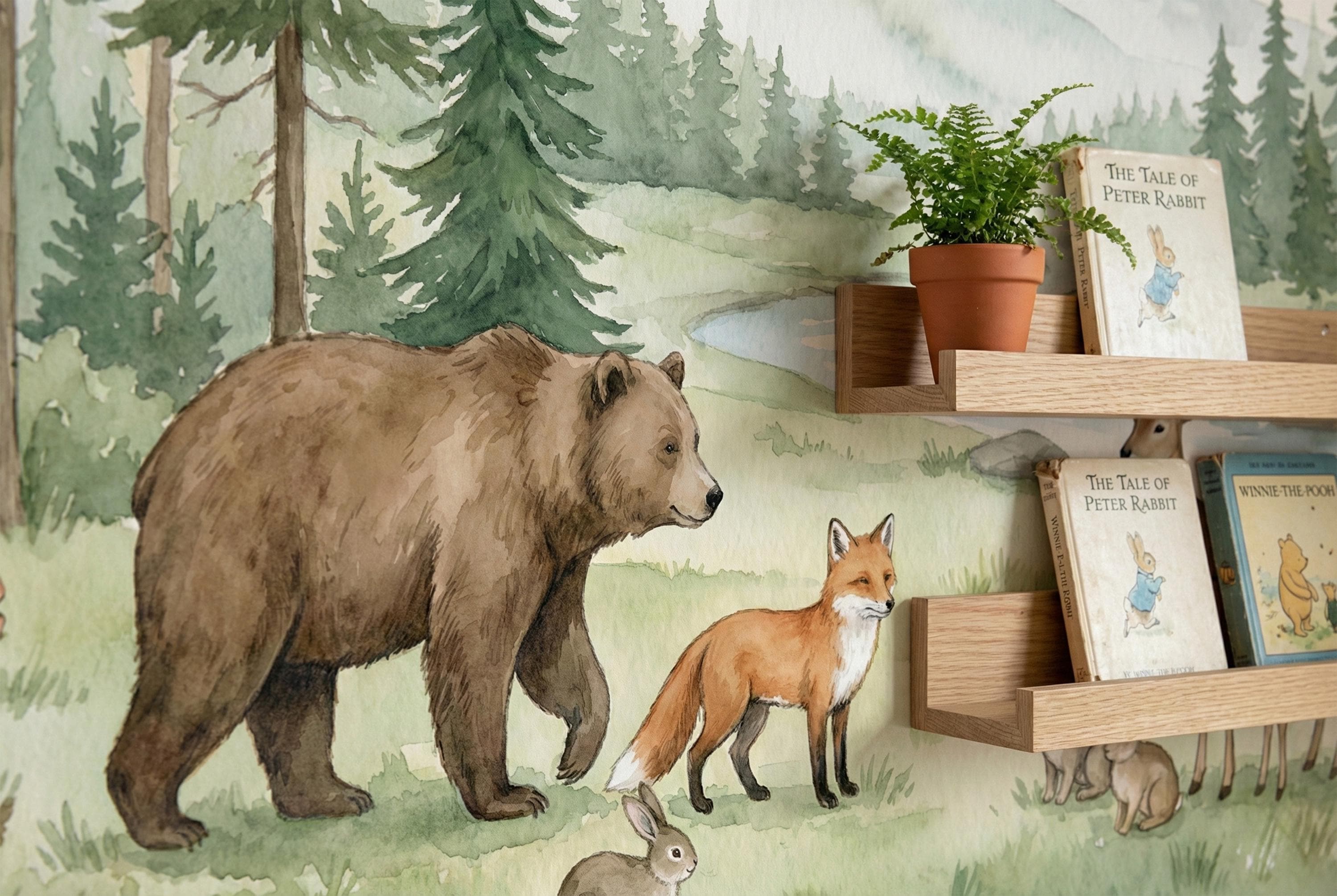 Transform your child's room into a magical forest where imagination runs free. Our "Whimsical Woodland" wallpaper isn't just decor; it's a daily invitation to adventure. Picture the bedtime stories you'll tell as you point out the friendly brown bear strolling by the river, the graceful deer and her fawn, the playful fox, and the busy squirrels and rabbits.