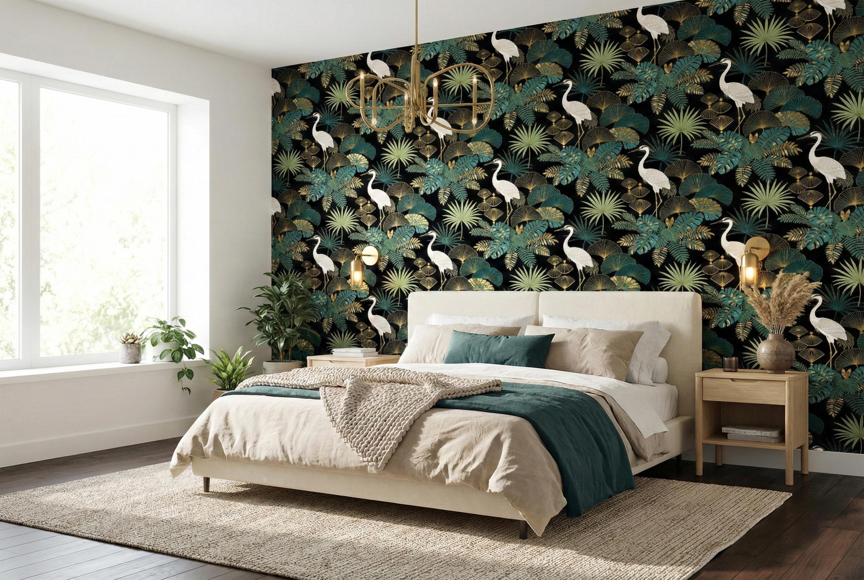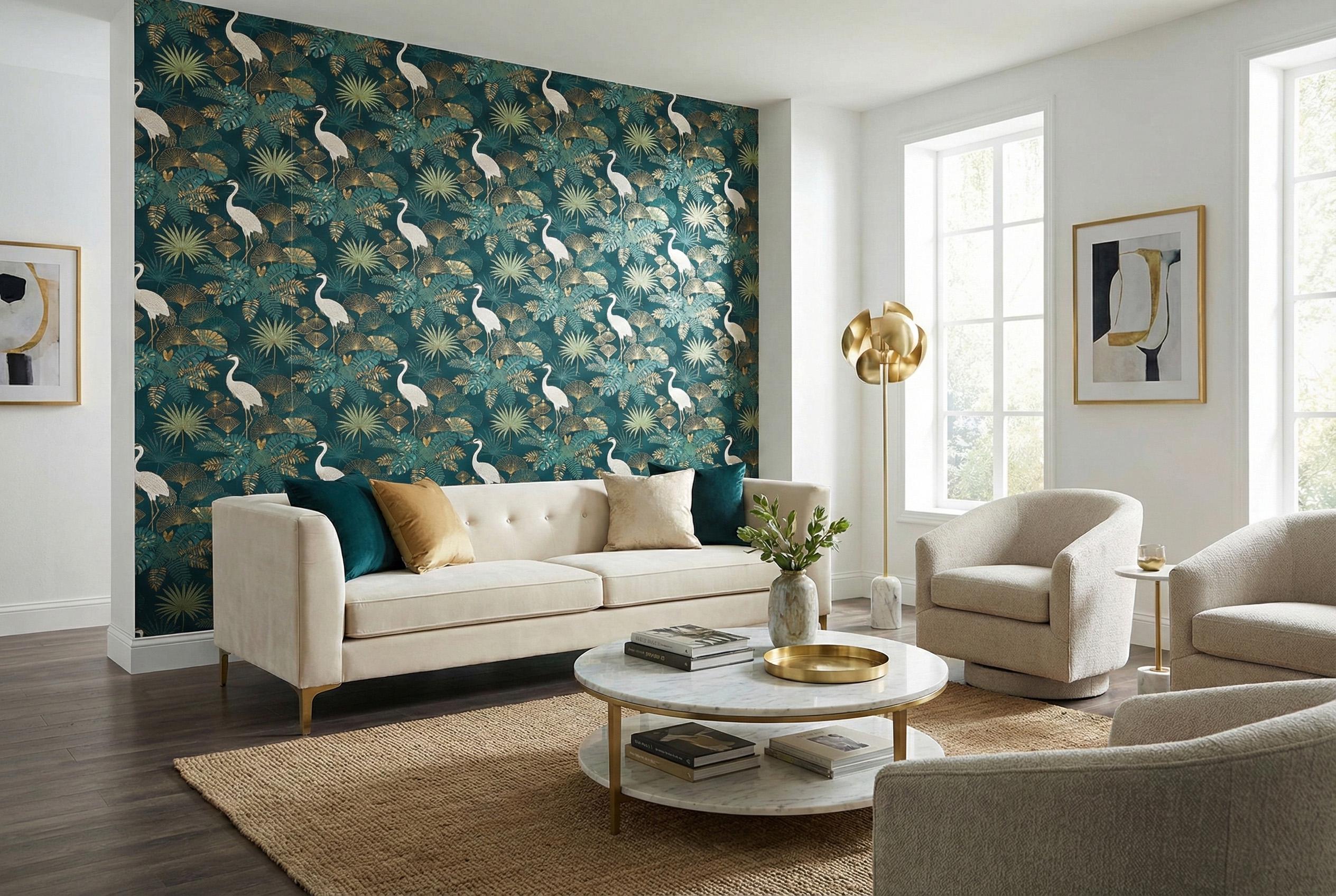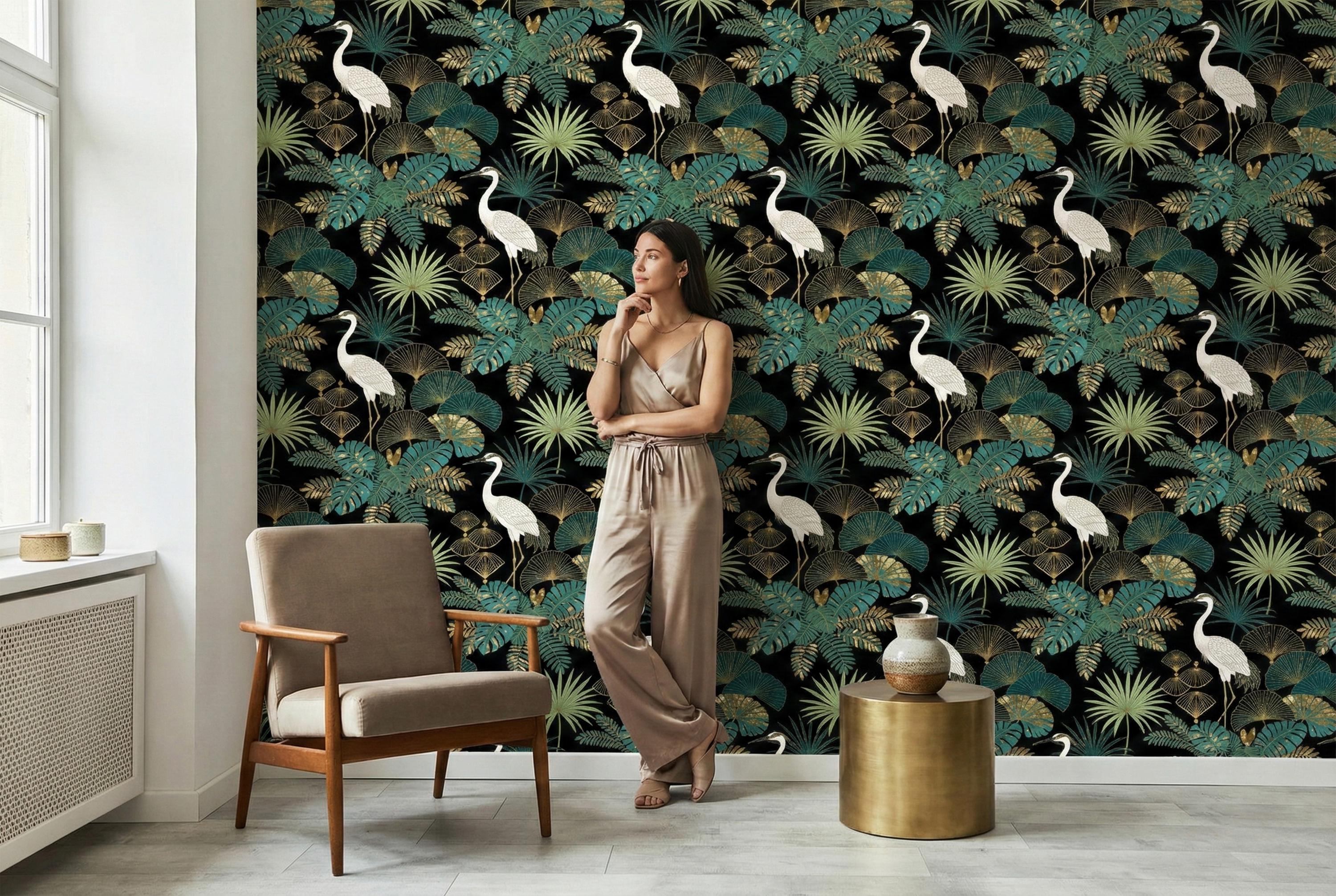 Transform your interior into an exotic sanctuary with our luxury heron wallpaper, featuring elegant white birds surrounded by lush tropical foliage in shades of teal, green, and shimmering gold.