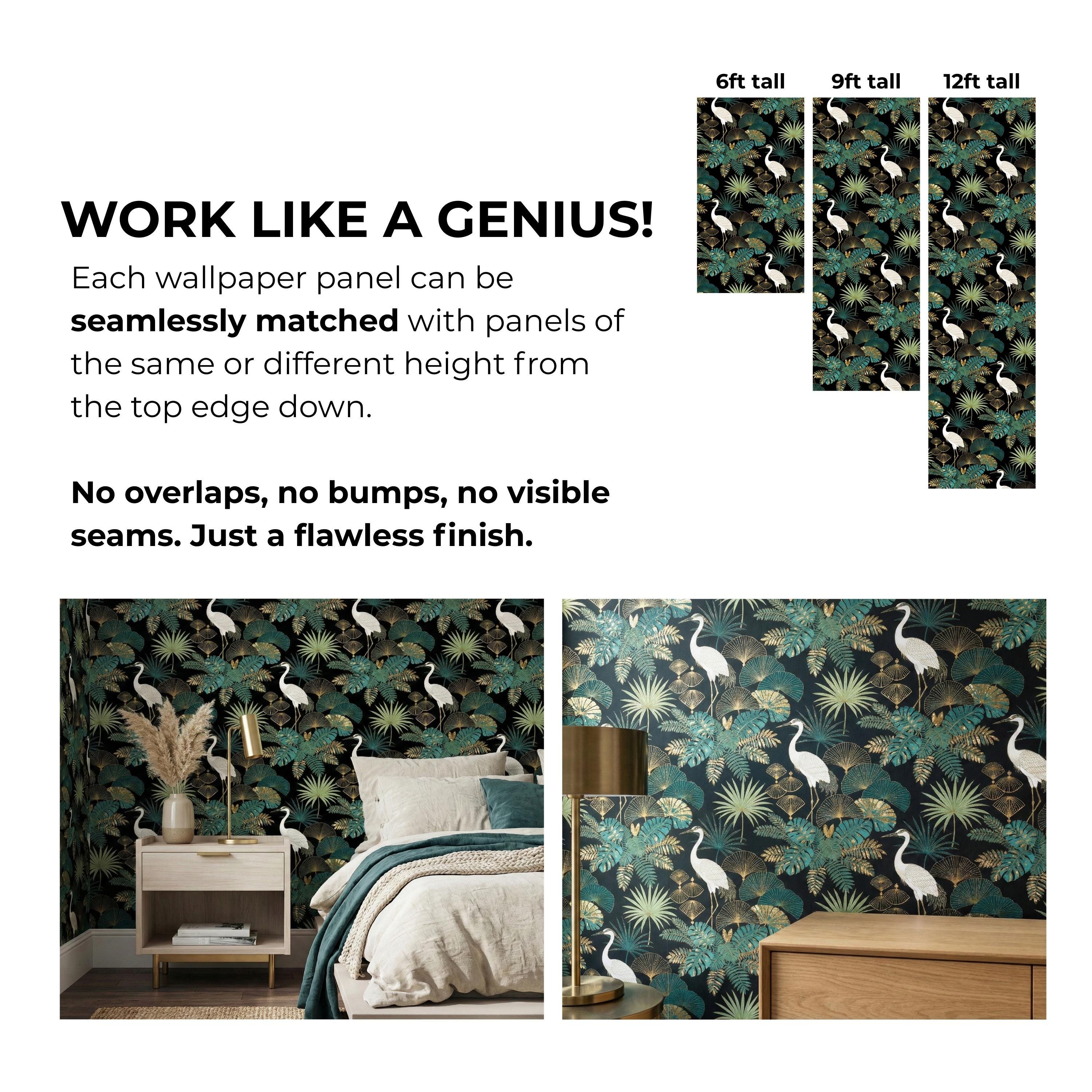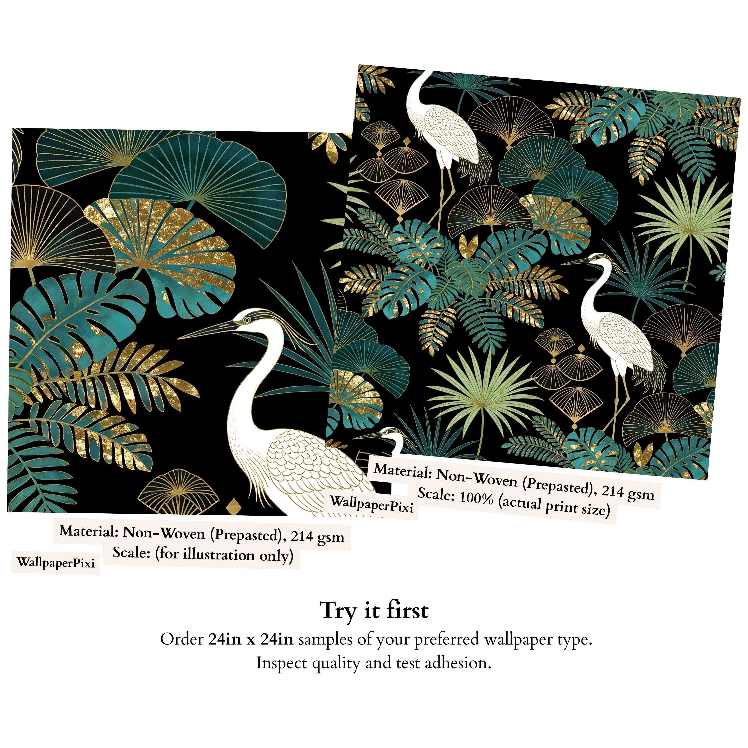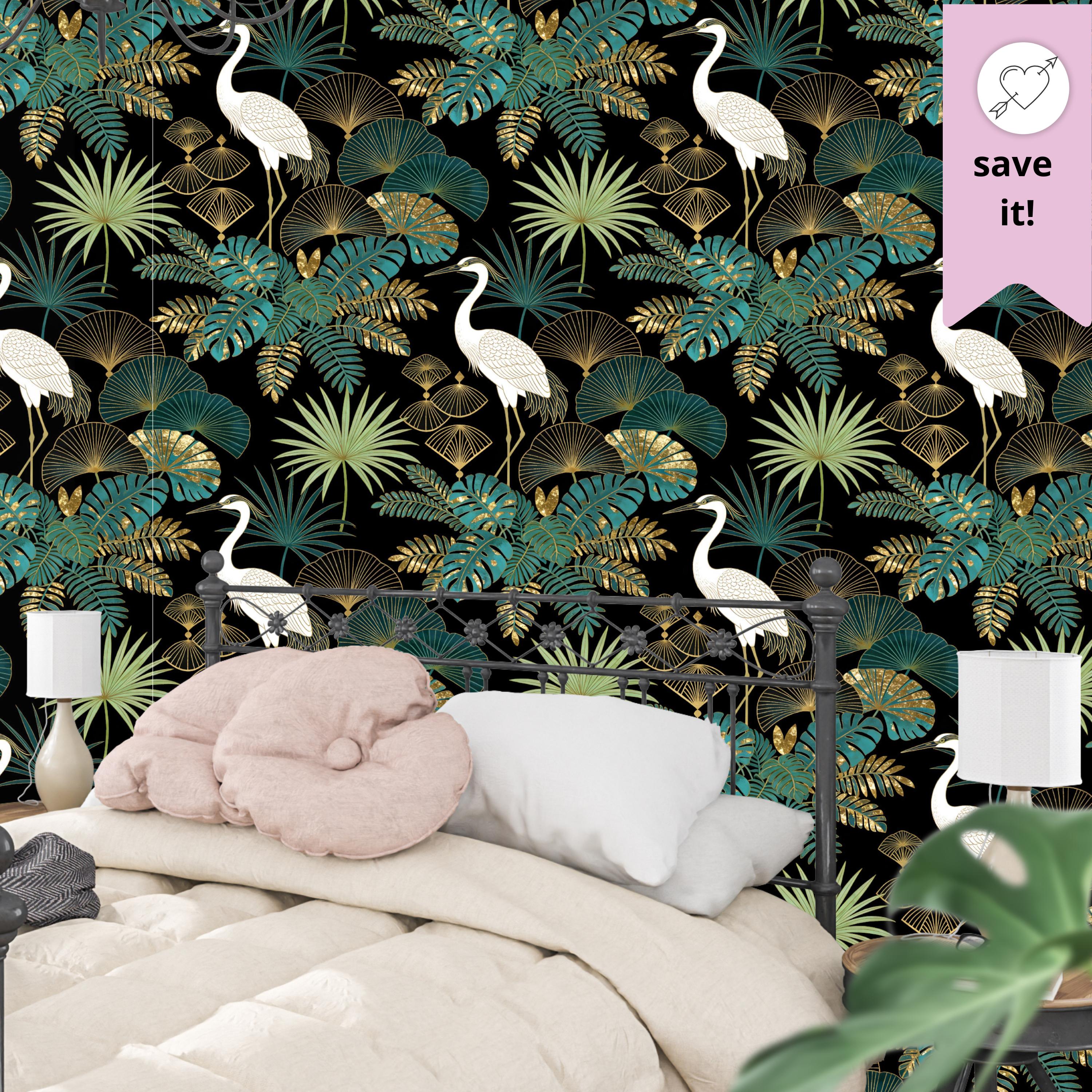 Transform your interior into an exotic sanctuary with our luxury heron wallpaper, featuring elegant white birds surrounded by lush tropical foliage in shades of teal, green, and shimmering gold.