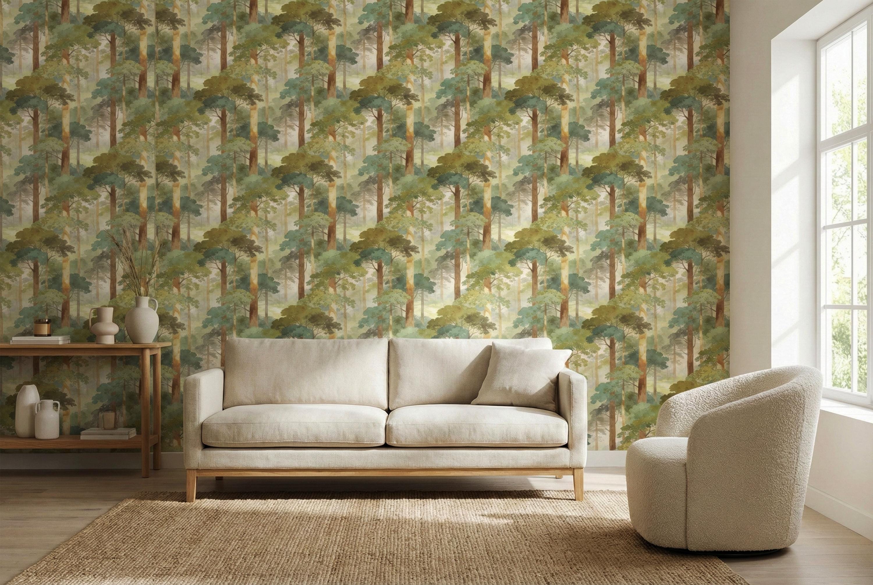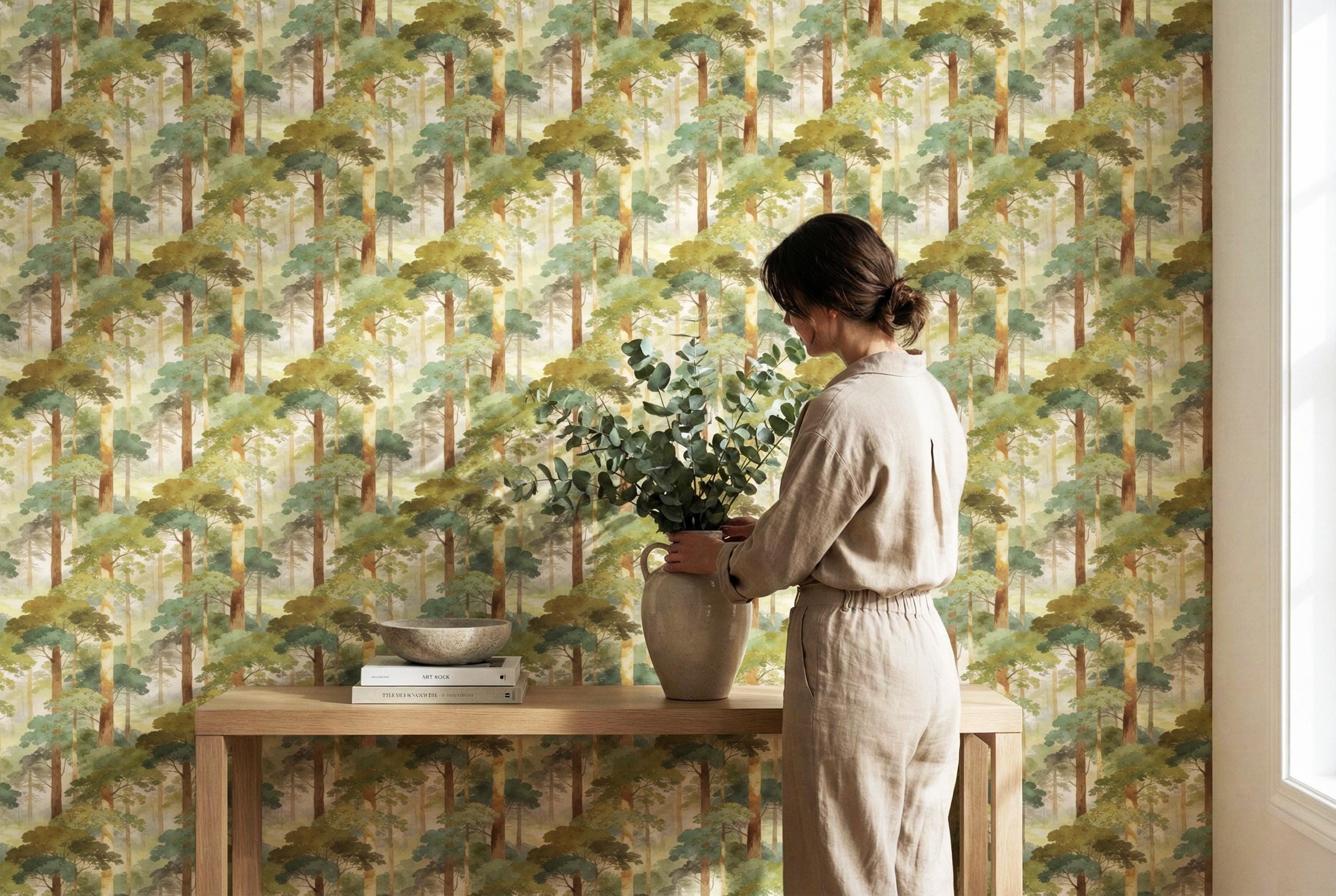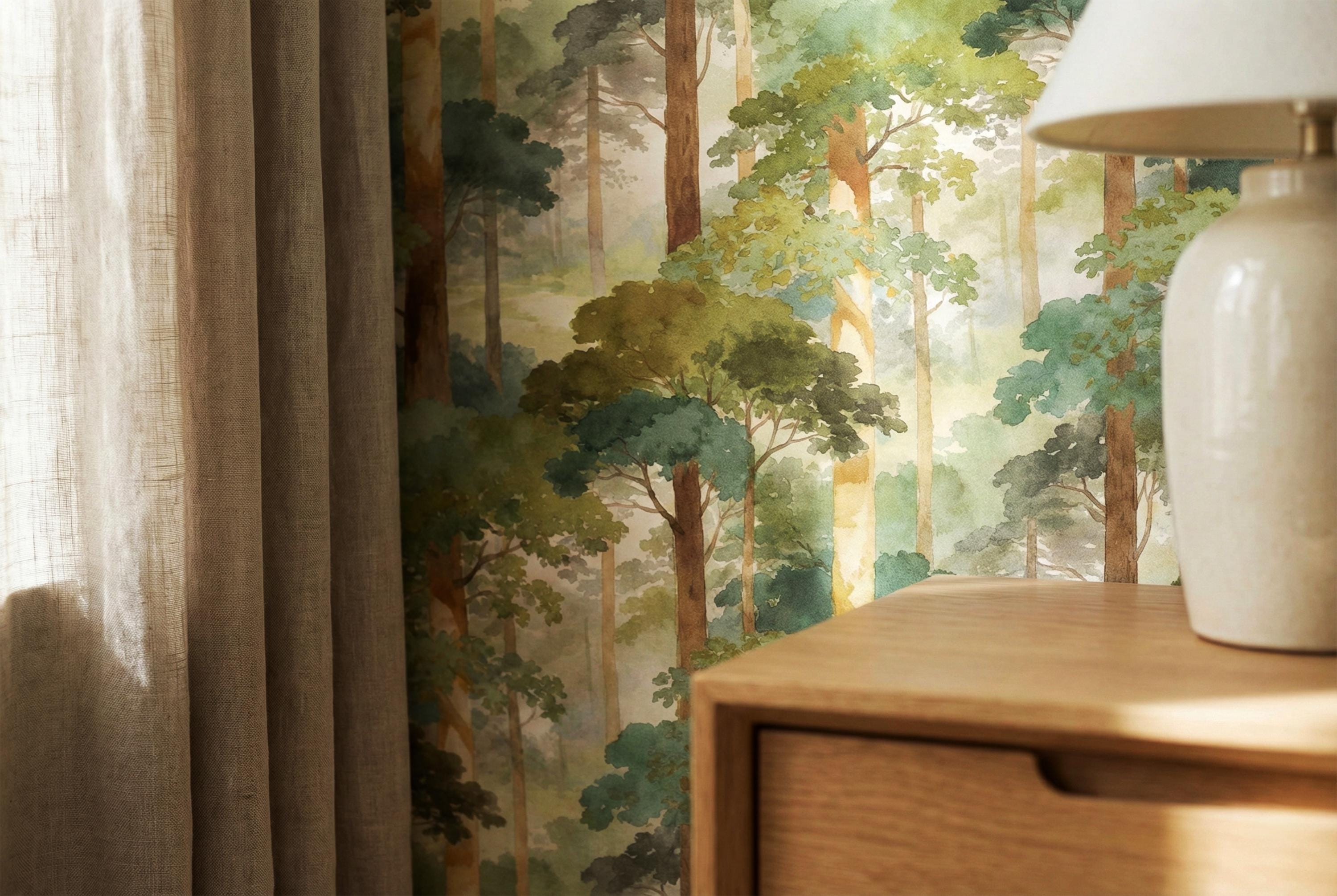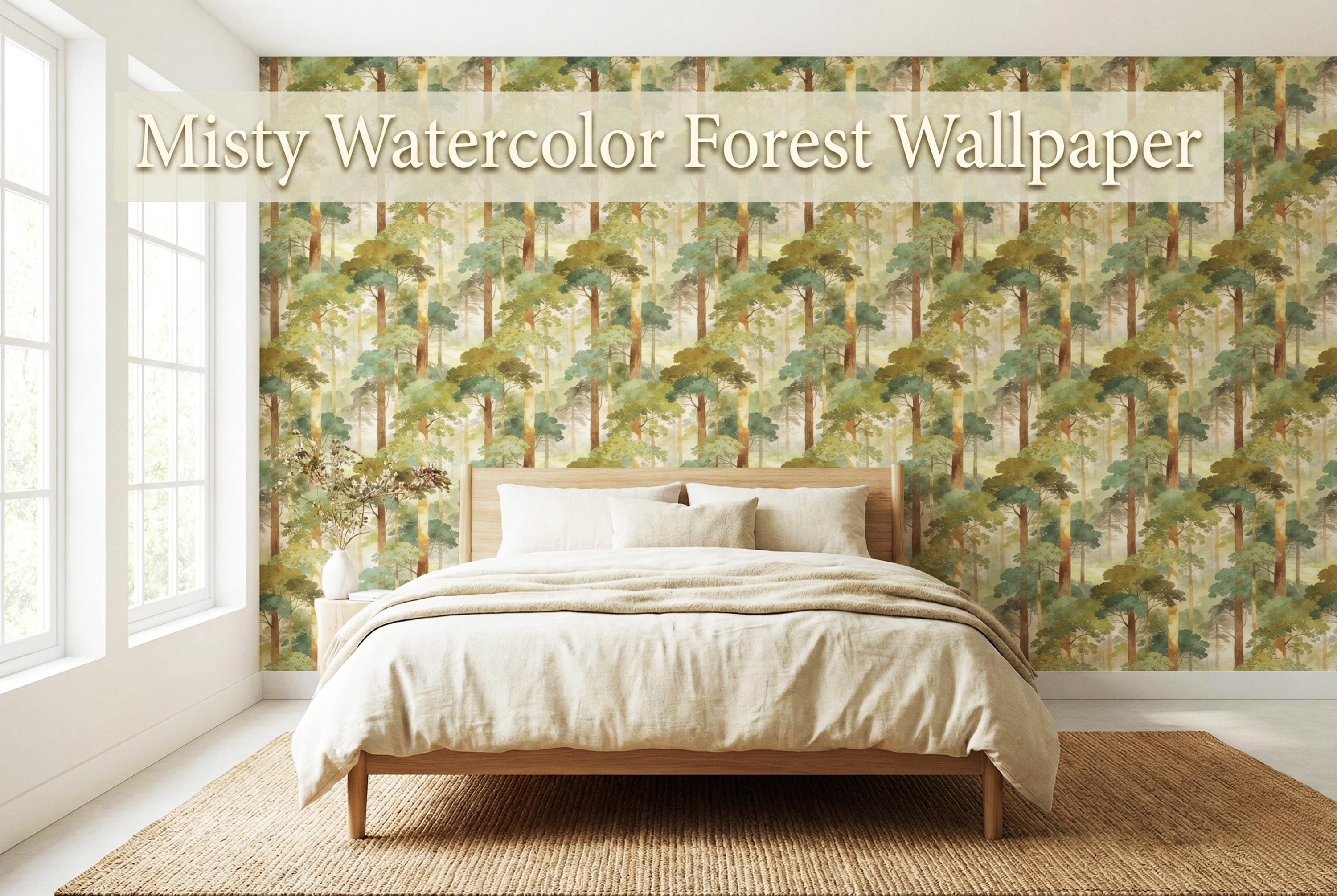 Step into a quiet, misty forest every time you walk into the room 🌿 This watercolor woodland wallpaper wraps your walls in soft sage greens, sun-warmed tree trunks, and dreamy morning haze—creating a soothing nature escape that feels like a deep breath. Perfect for a calming bedroom, cozy nursery, or an elevated living room accent wall with timeless, painterly charm.