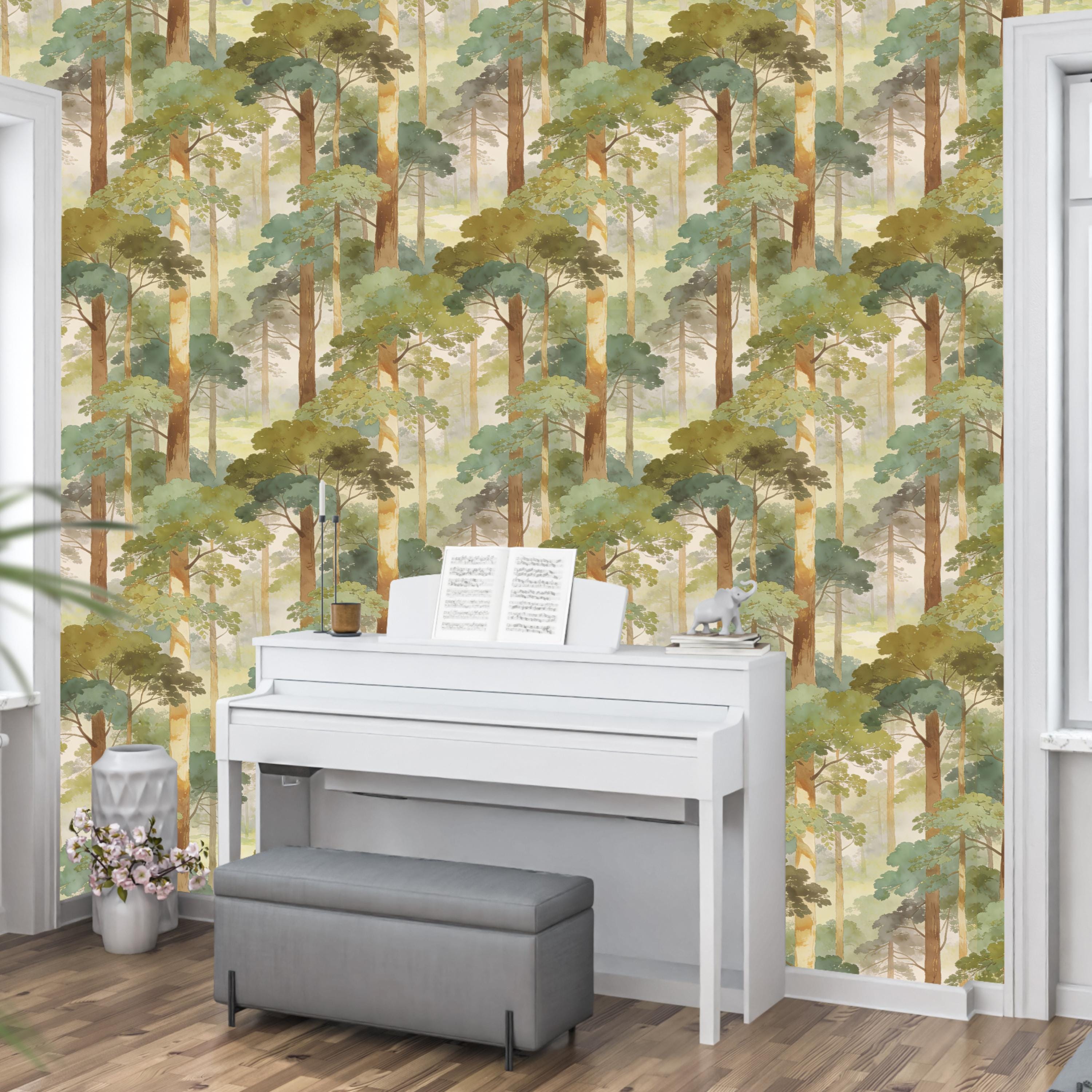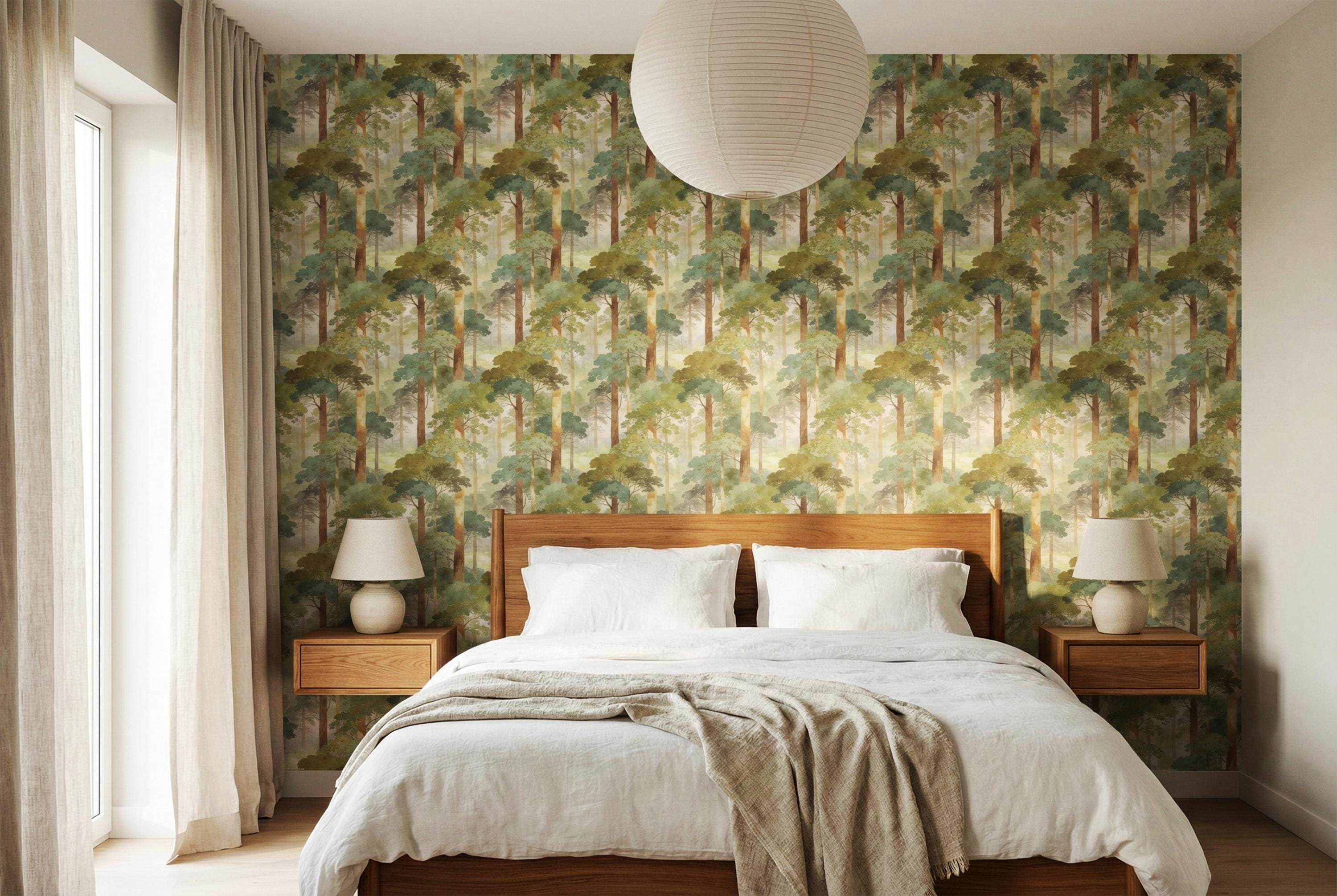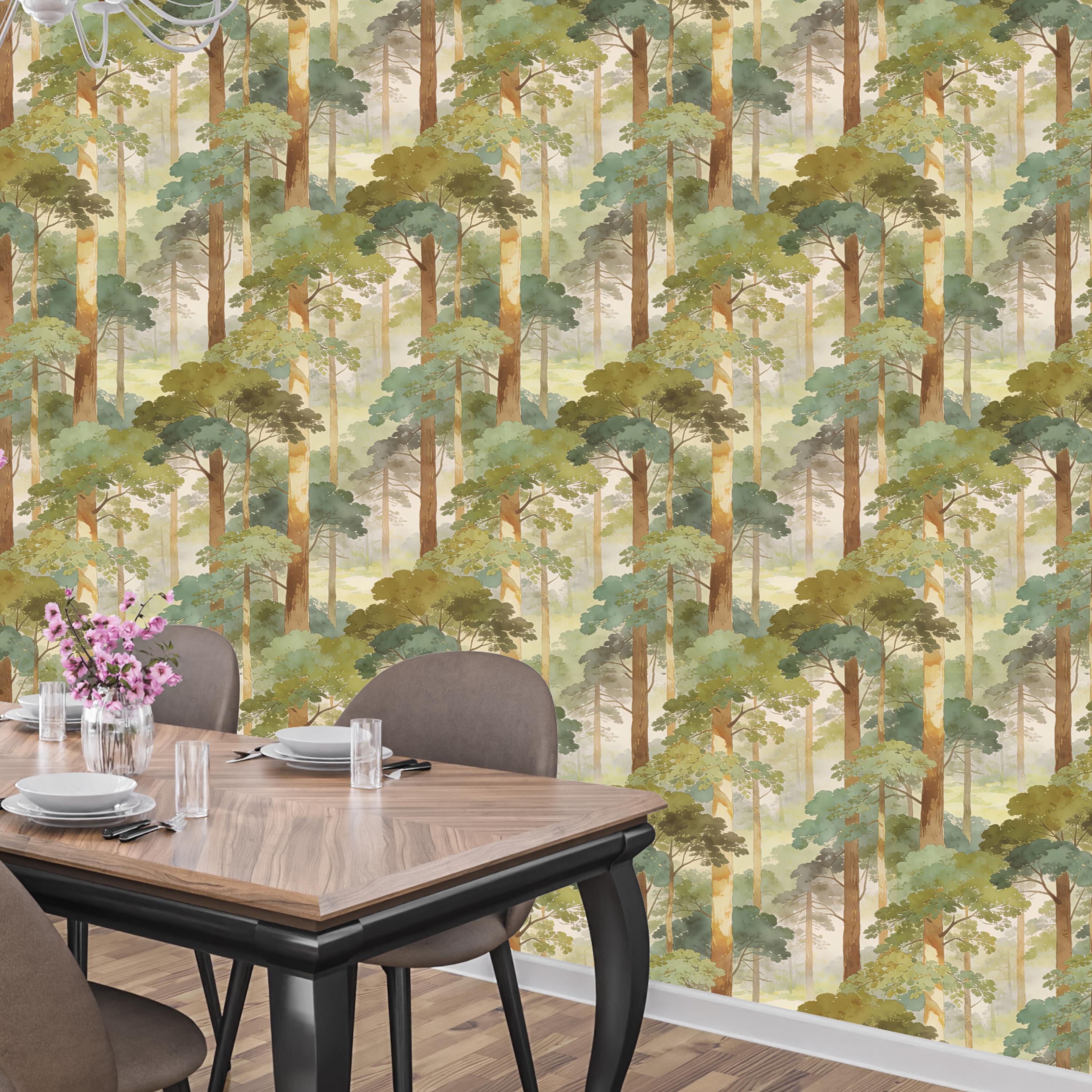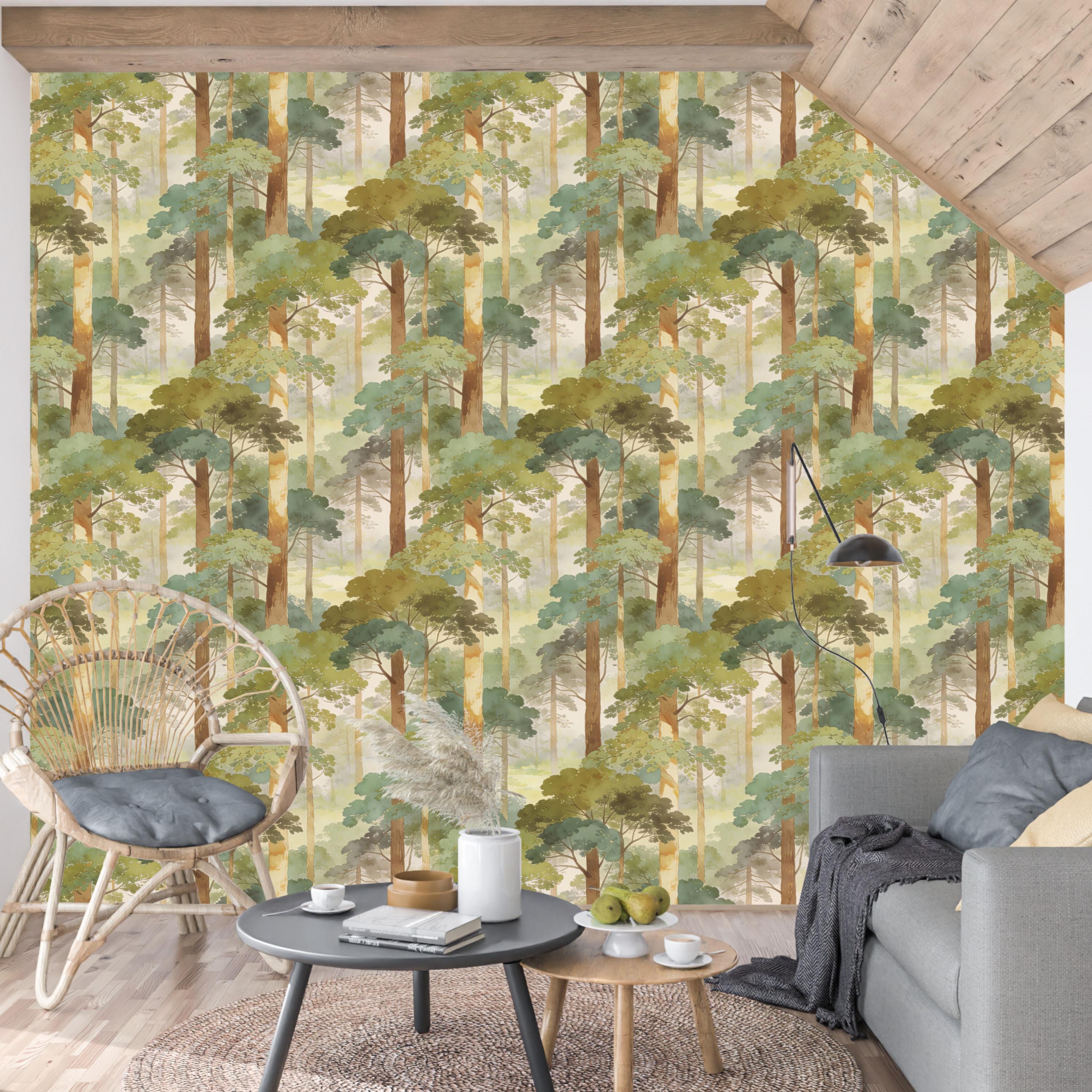 Step into a quiet, misty forest every time you walk into the room 🌿 This watercolor woodland wallpaper wraps your walls in soft sage greens, sun-warmed tree trunks, and dreamy morning haze—creating a soothing nature escape that feels like a deep breath. Perfect for a calming bedroom, cozy nursery, or an elevated living room accent wall with timeless, painterly charm.