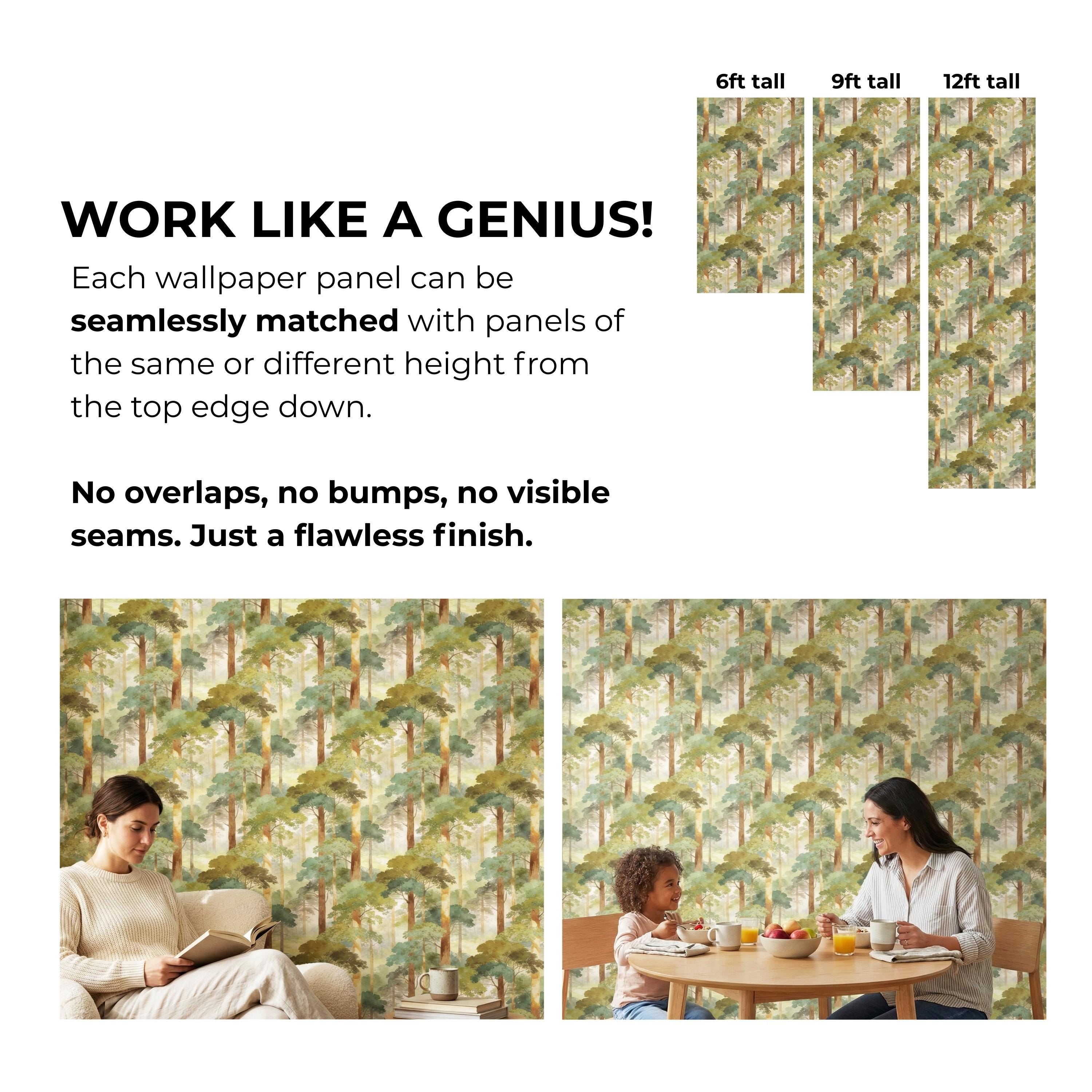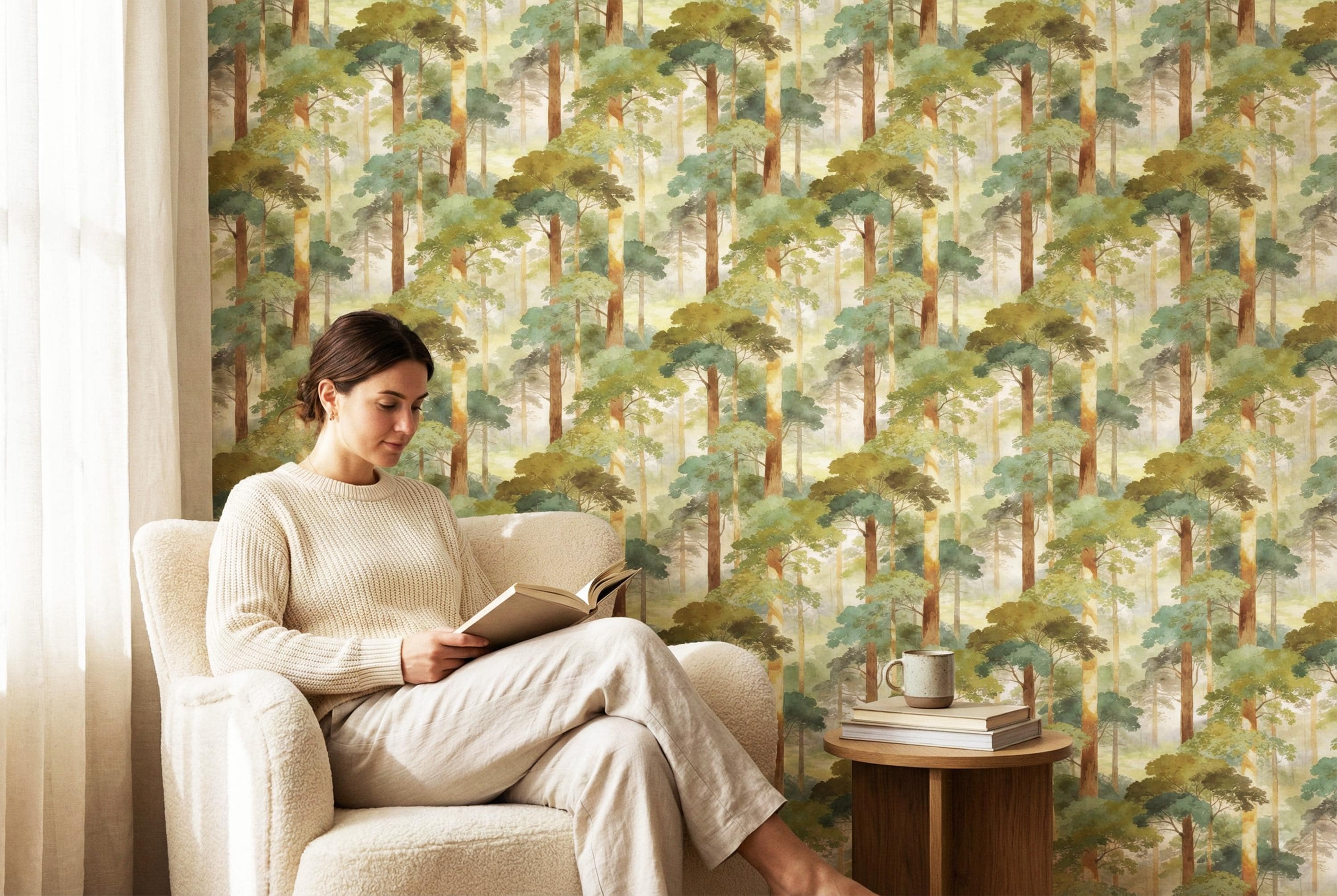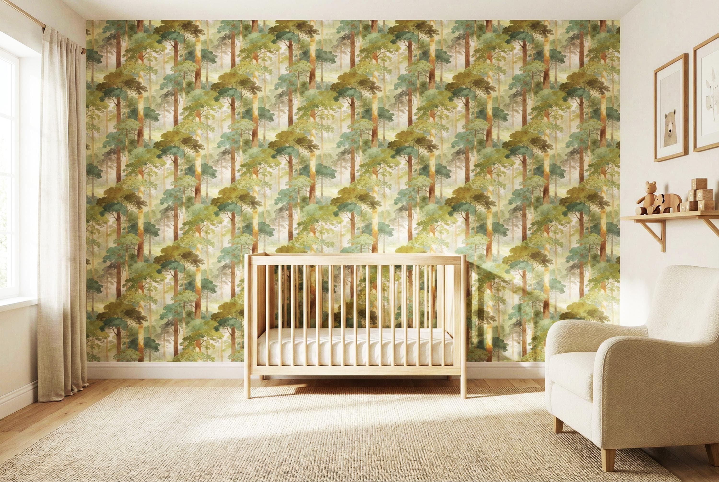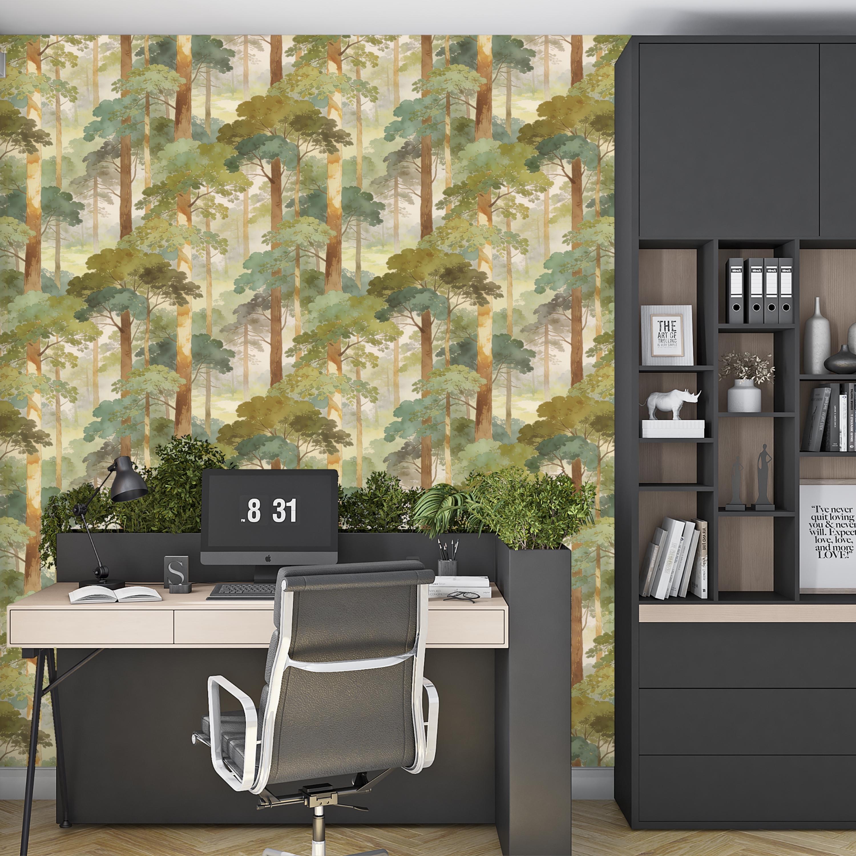 Step into a quiet, misty forest every time you walk into the room 🌿 This watercolor woodland wallpaper wraps your walls in soft sage greens, sun-warmed tree trunks, and dreamy morning haze—creating a soothing nature escape that feels like a deep breath. Perfect for a calming bedroom, cozy nursery, or an elevated living room accent wall with timeless, painterly charm.