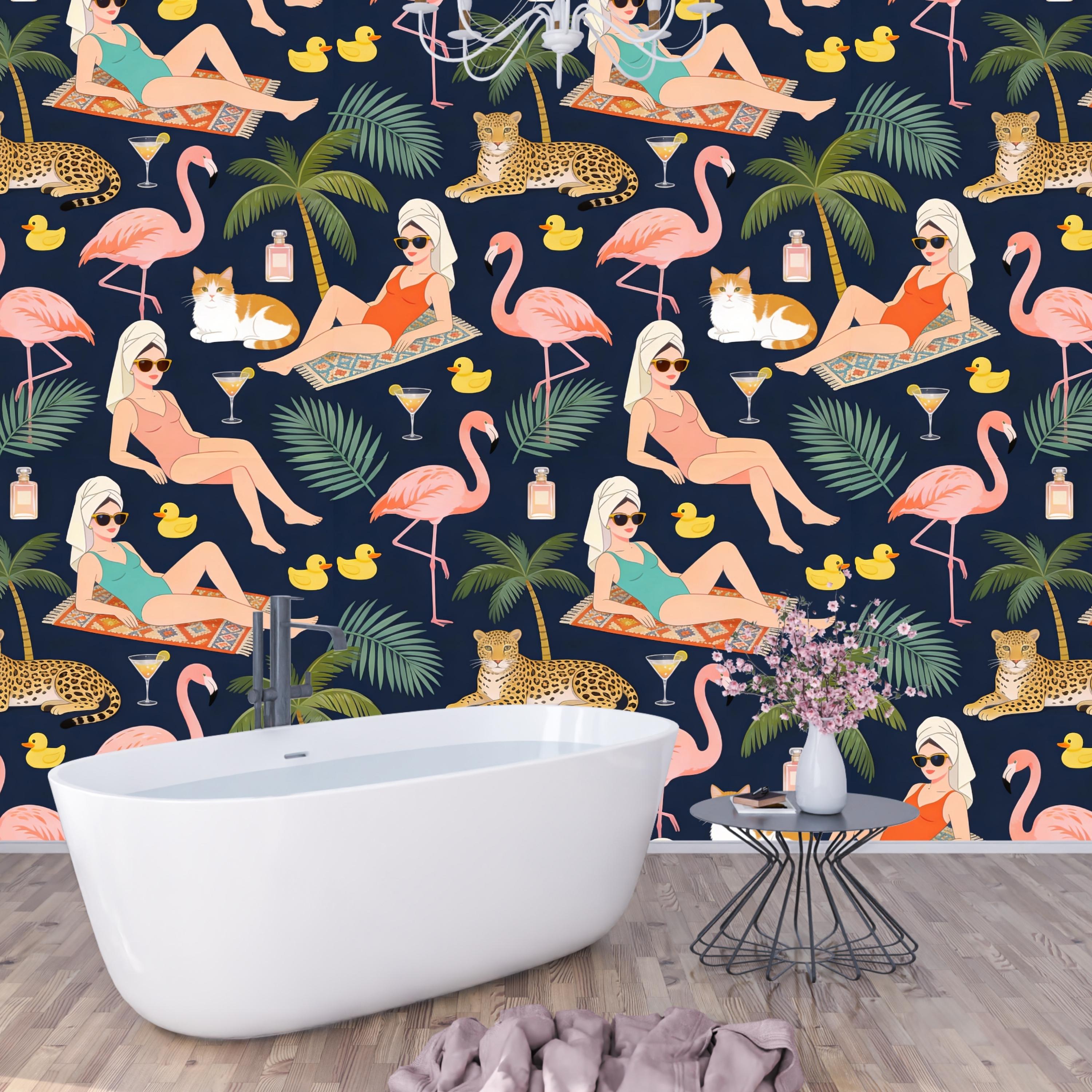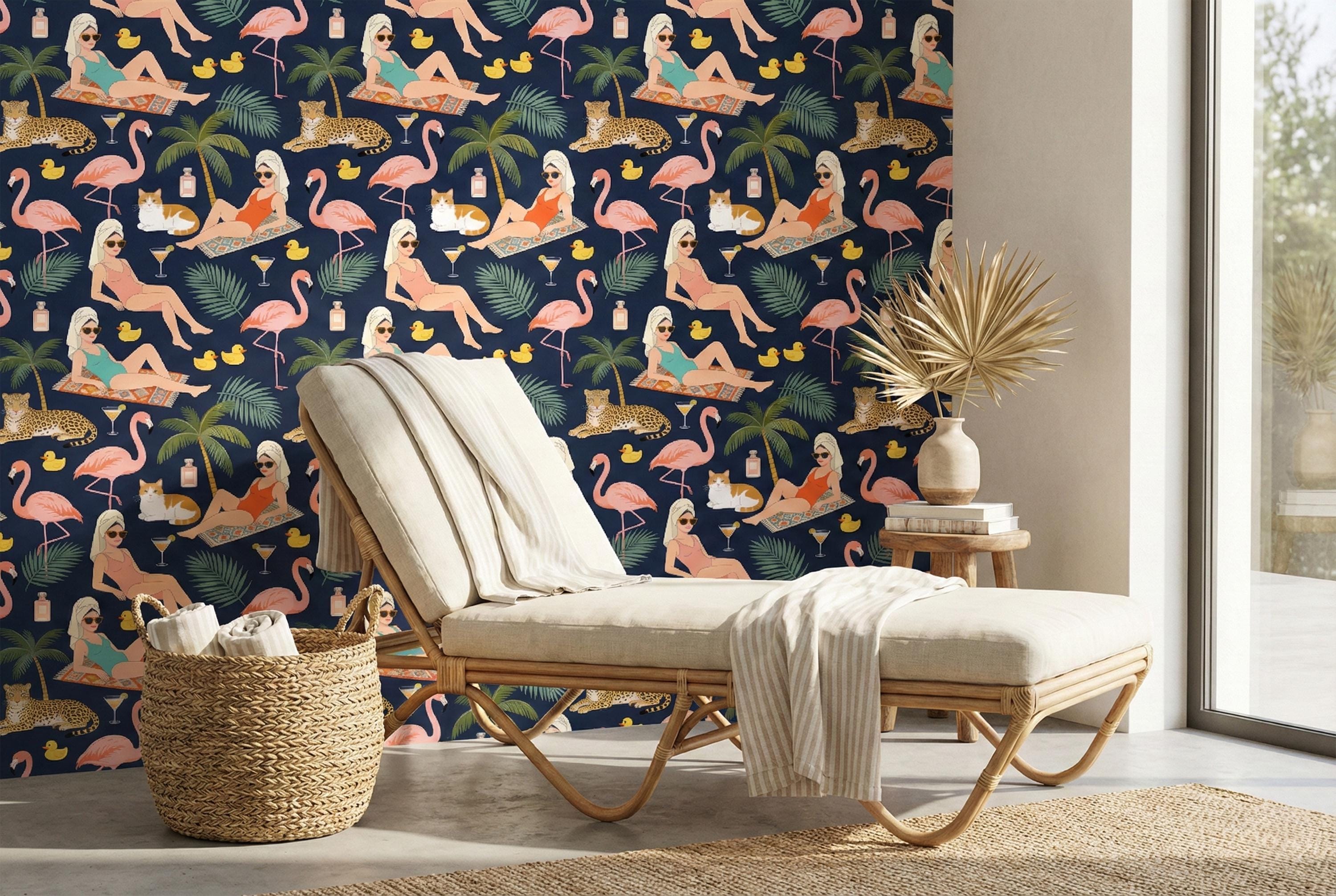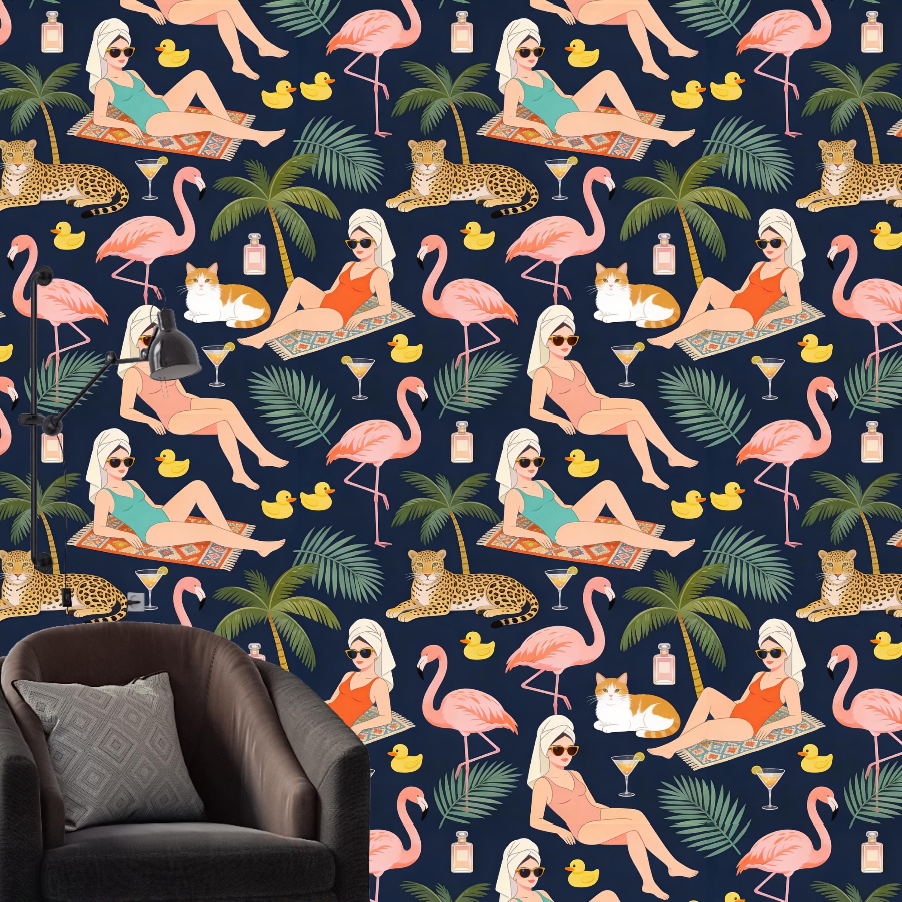 Transform your walls instantly with this eye-catching peel and stick wallpaper inspired by glamorous summer pool parties and tropical vacations. Featuring stylish women in swimsuits, pink flamingos, leopards, cats, cocktails, palm trees, and playful details, this bold wallpaper creates a luxurious and fun atmosphere in any room. 🌴🦩🍸
