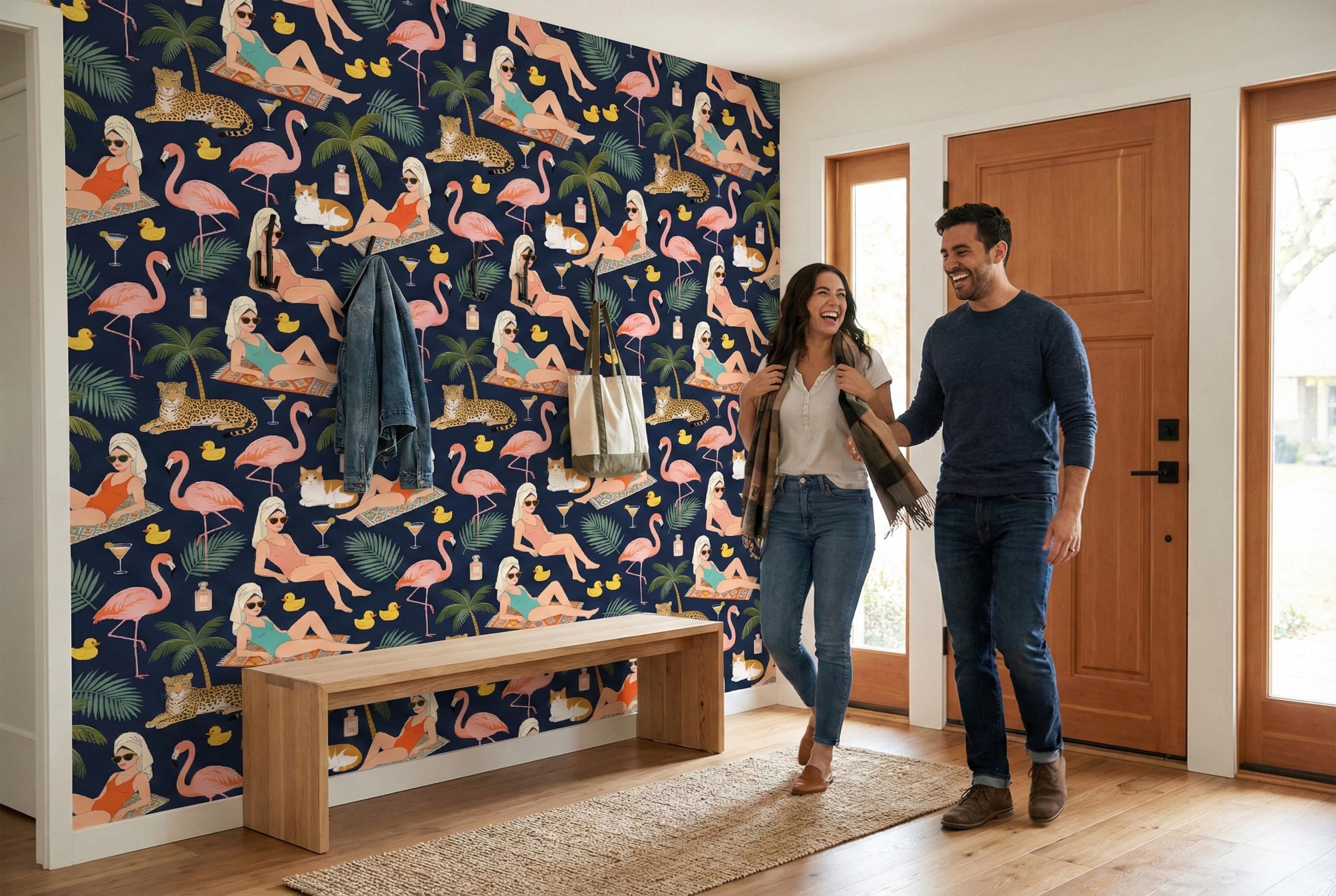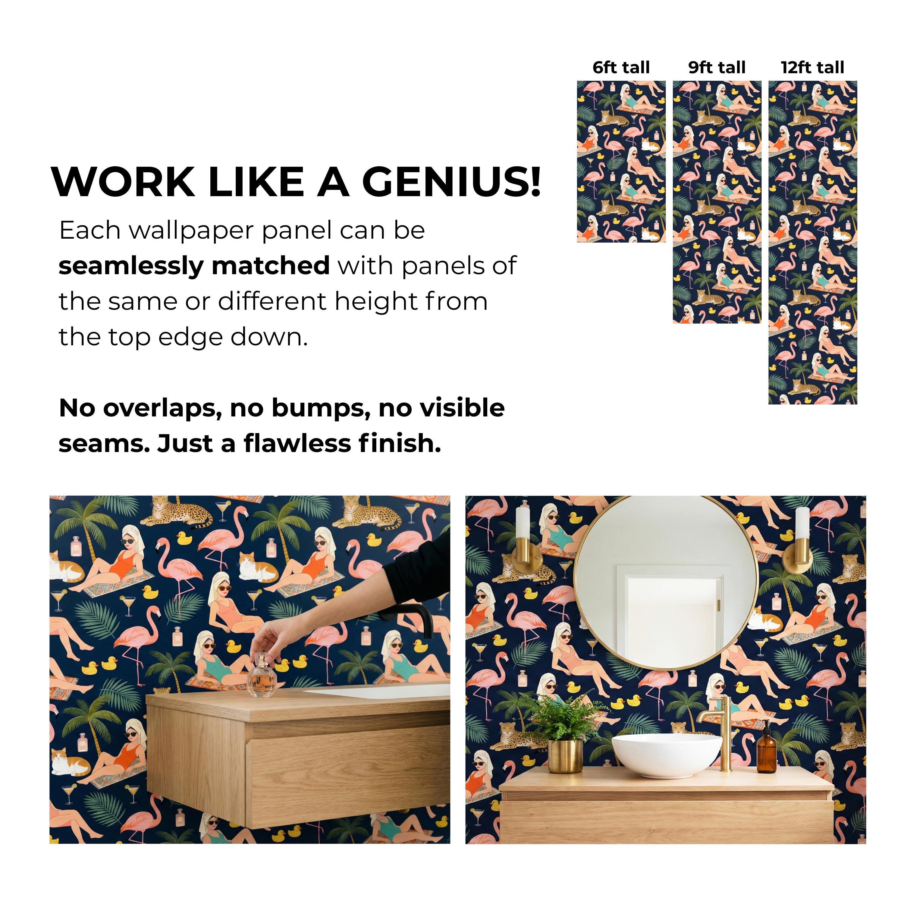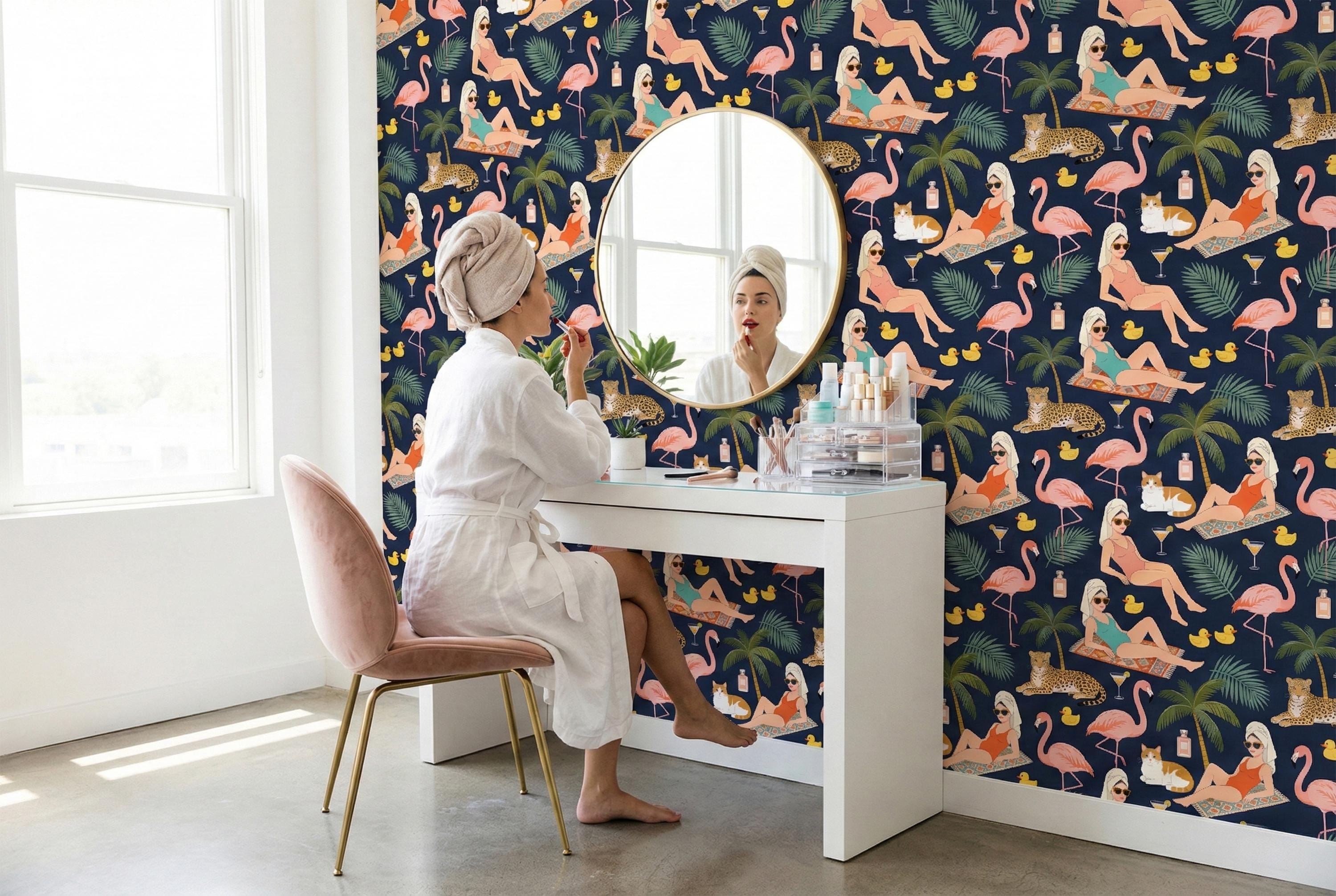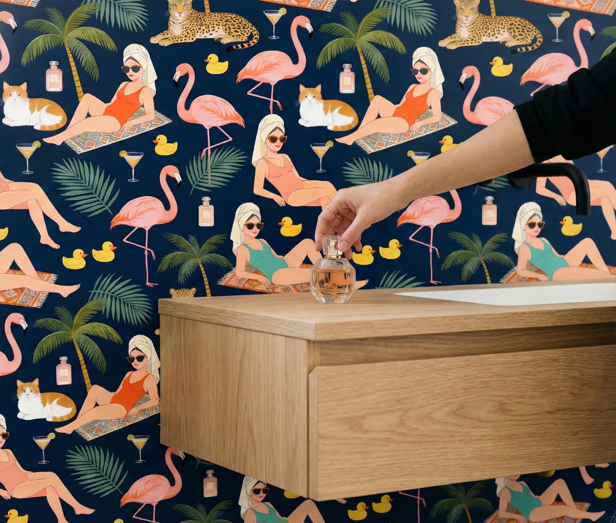Transform your walls instantly with this eye-catching peel and stick wallpaper inspired by glamorous summer pool parties and tropical vacations. Featuring stylish women in swimsuits, pink flamingos, leopards, cats, cocktails, palm trees, and playful details, this bold wallpaper creates a luxurious and fun atmosphere in any room. 🌴🦩🍸
