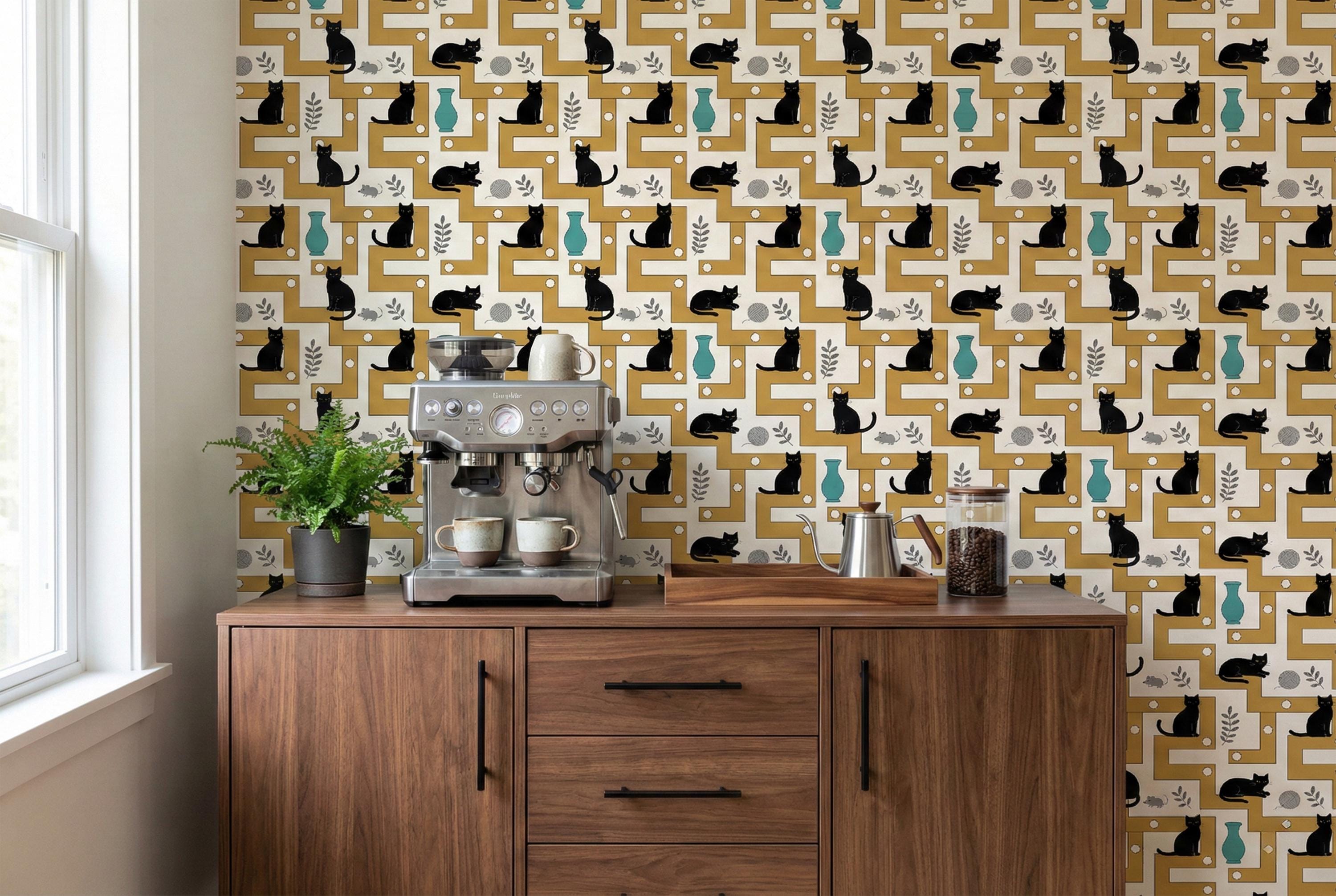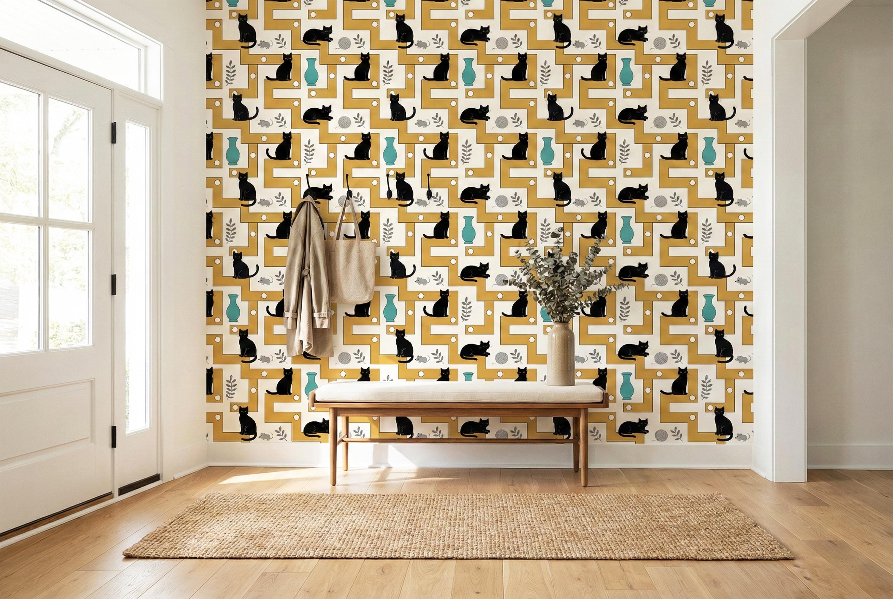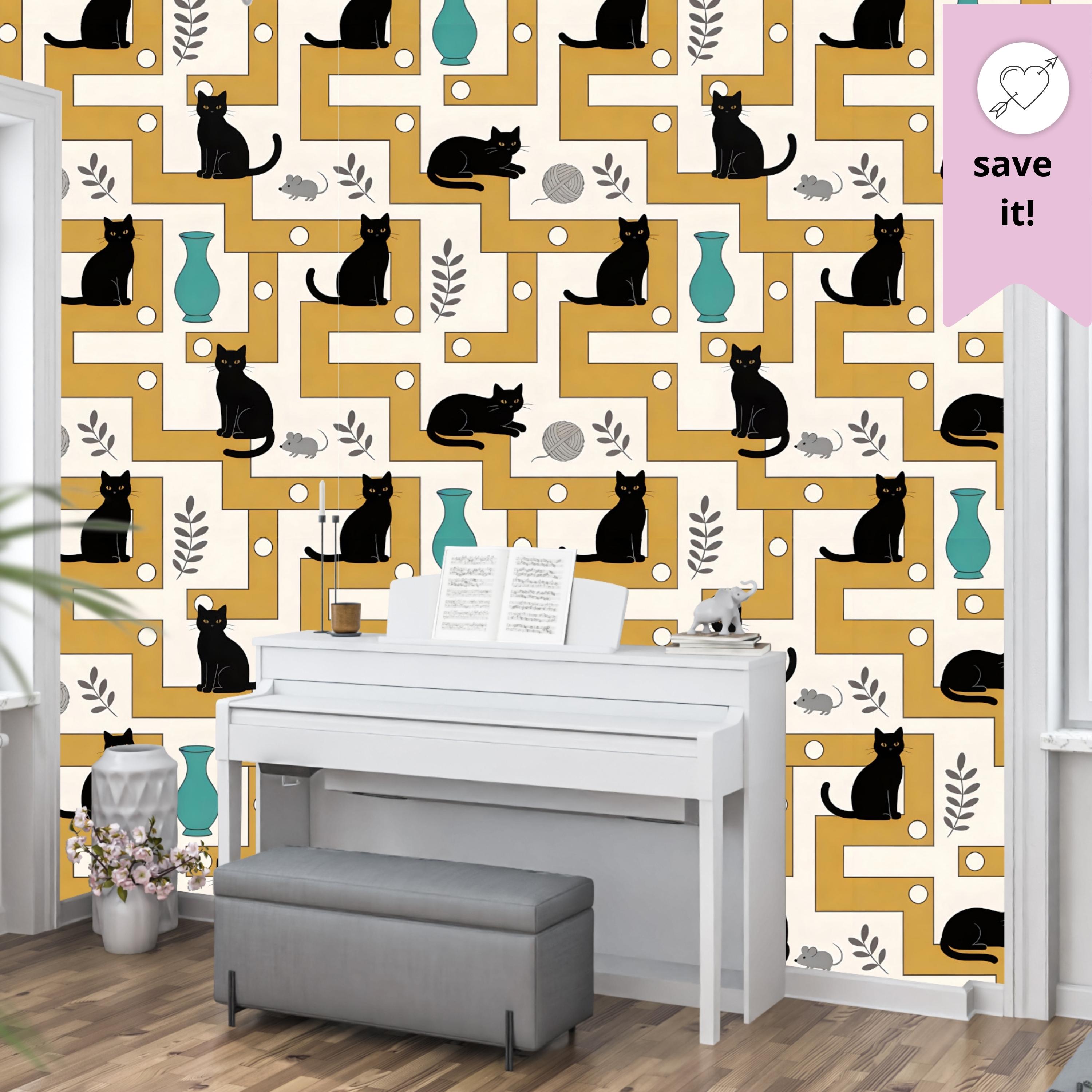Redefine your interior with a sophisticated blend of mid-century geometry and playful charm. This premium wall mural features a labyrinth of warm mustard gold paths where sleek black cats lounge in effortless style. Complemented by deep teal accents and whimsical motifs, it’s the perfect balance of professional polish and artistic personality.